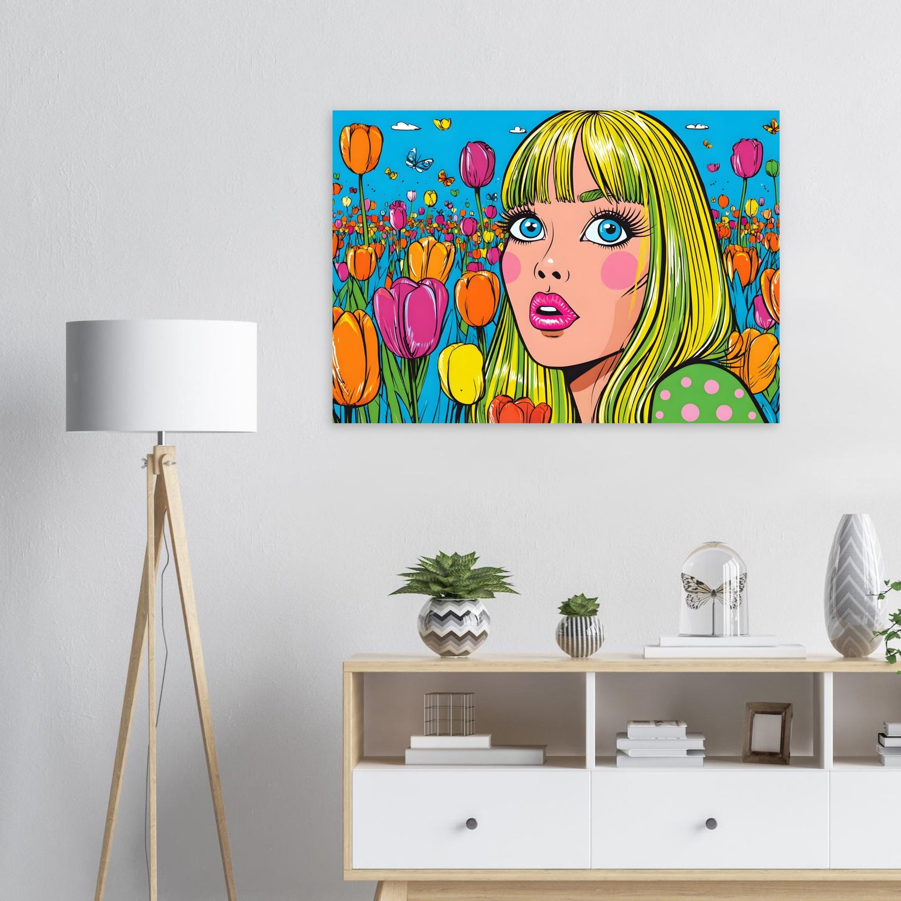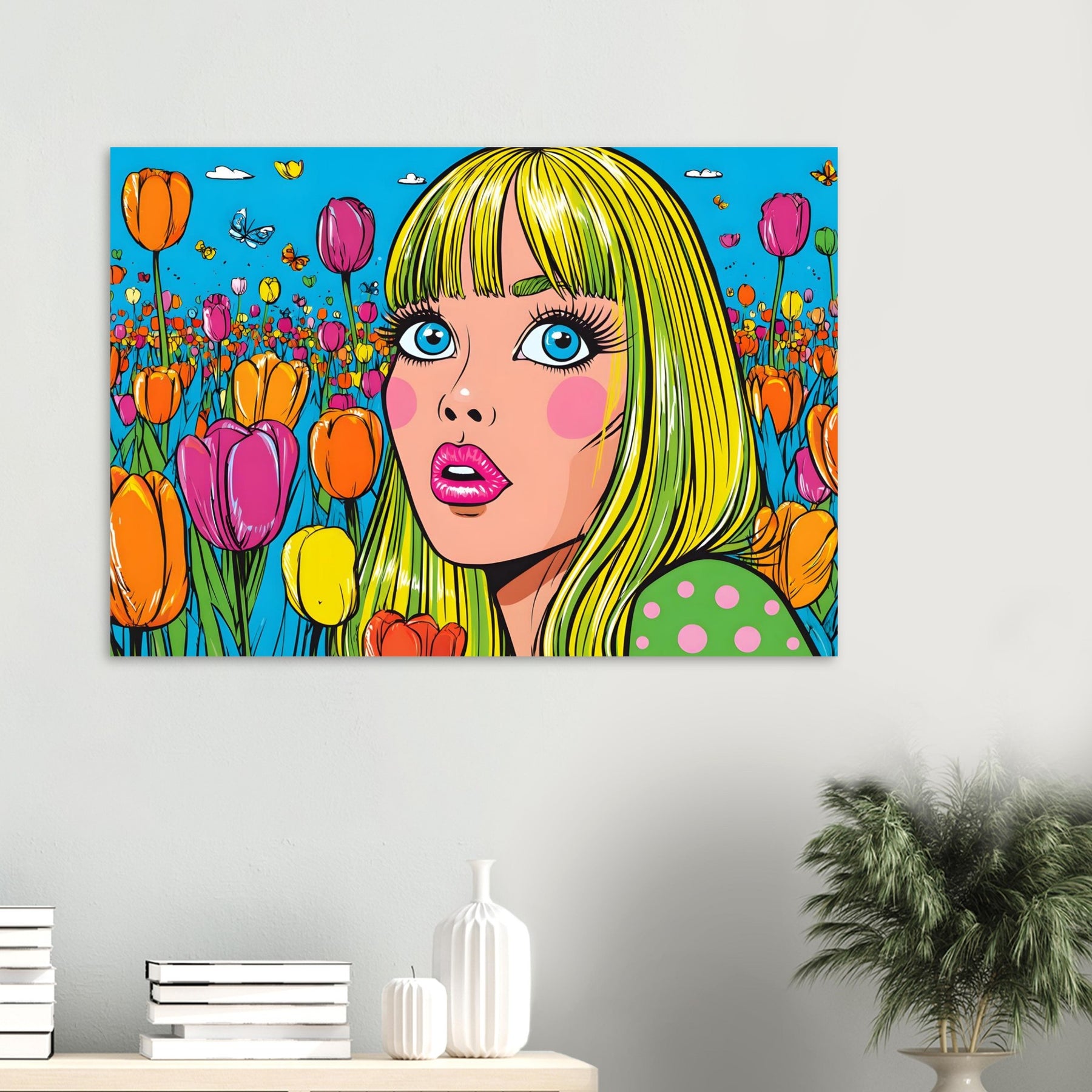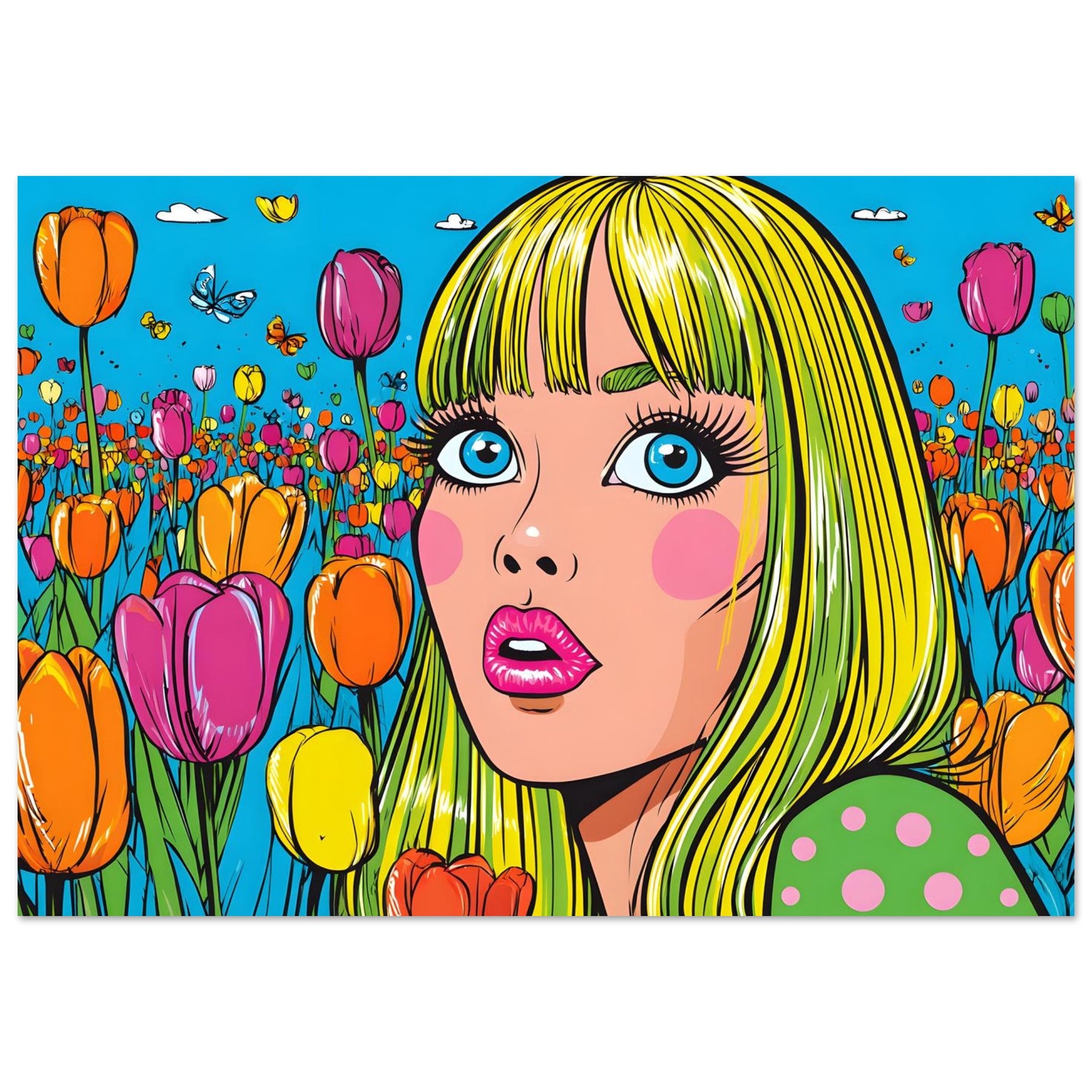 Infuse your space with color and playful energy with Tulip Pop Muse, a striking pop art aluminum wall art featuring a vibrant woman surrounded by a field of colorful tulips. Set within a bright, stylized composition, the artwork radiates liveliness, joy, and modern artistic flair.
