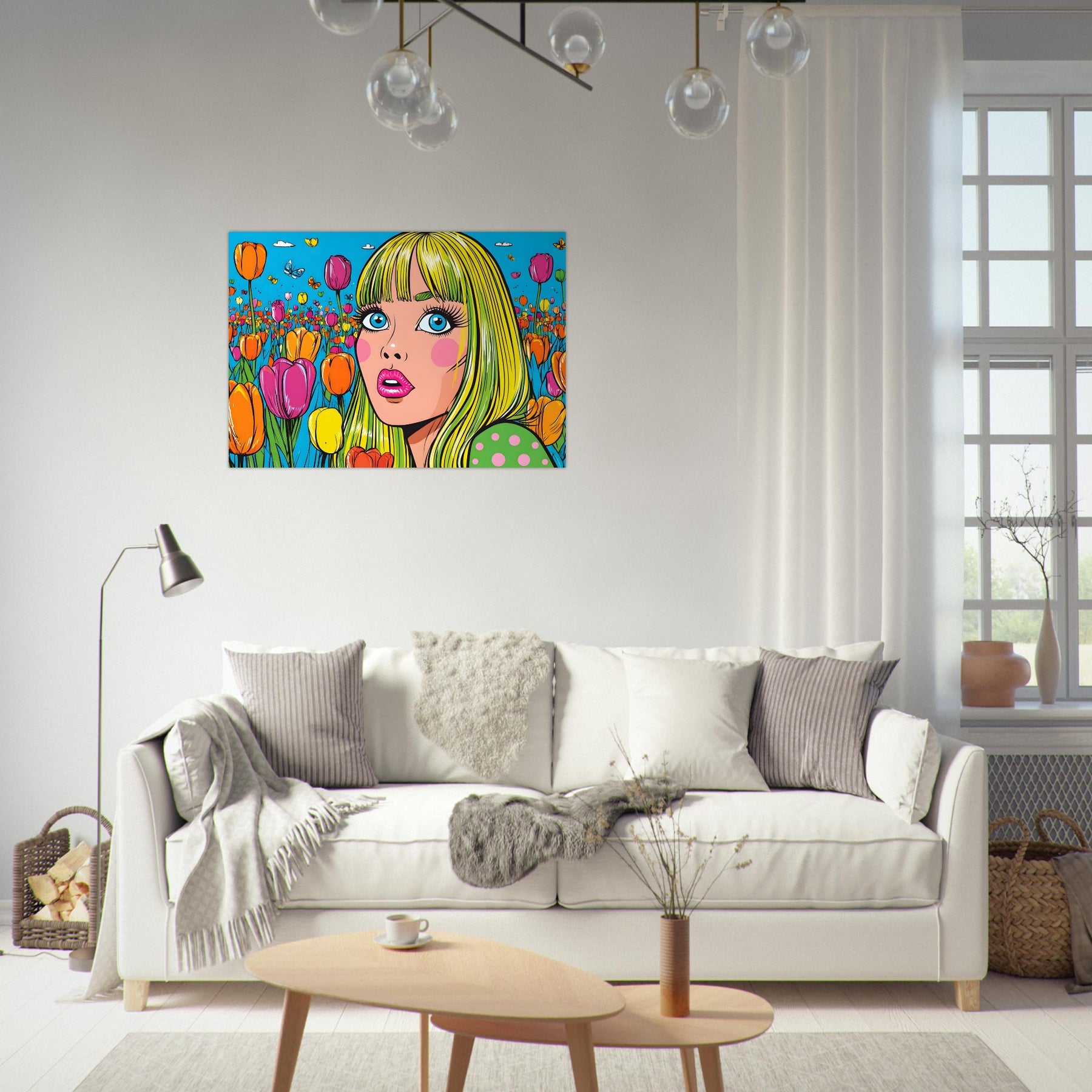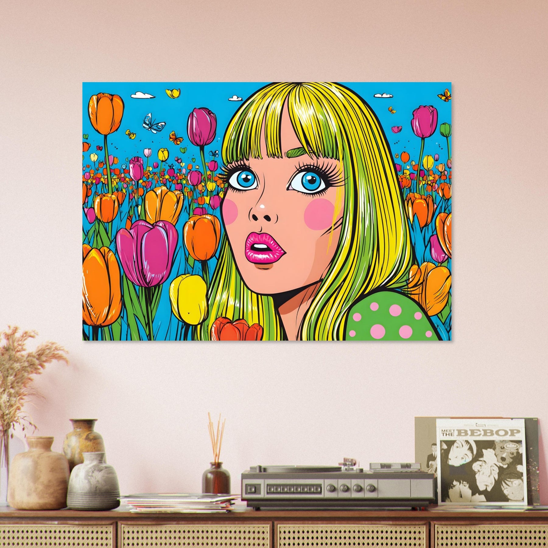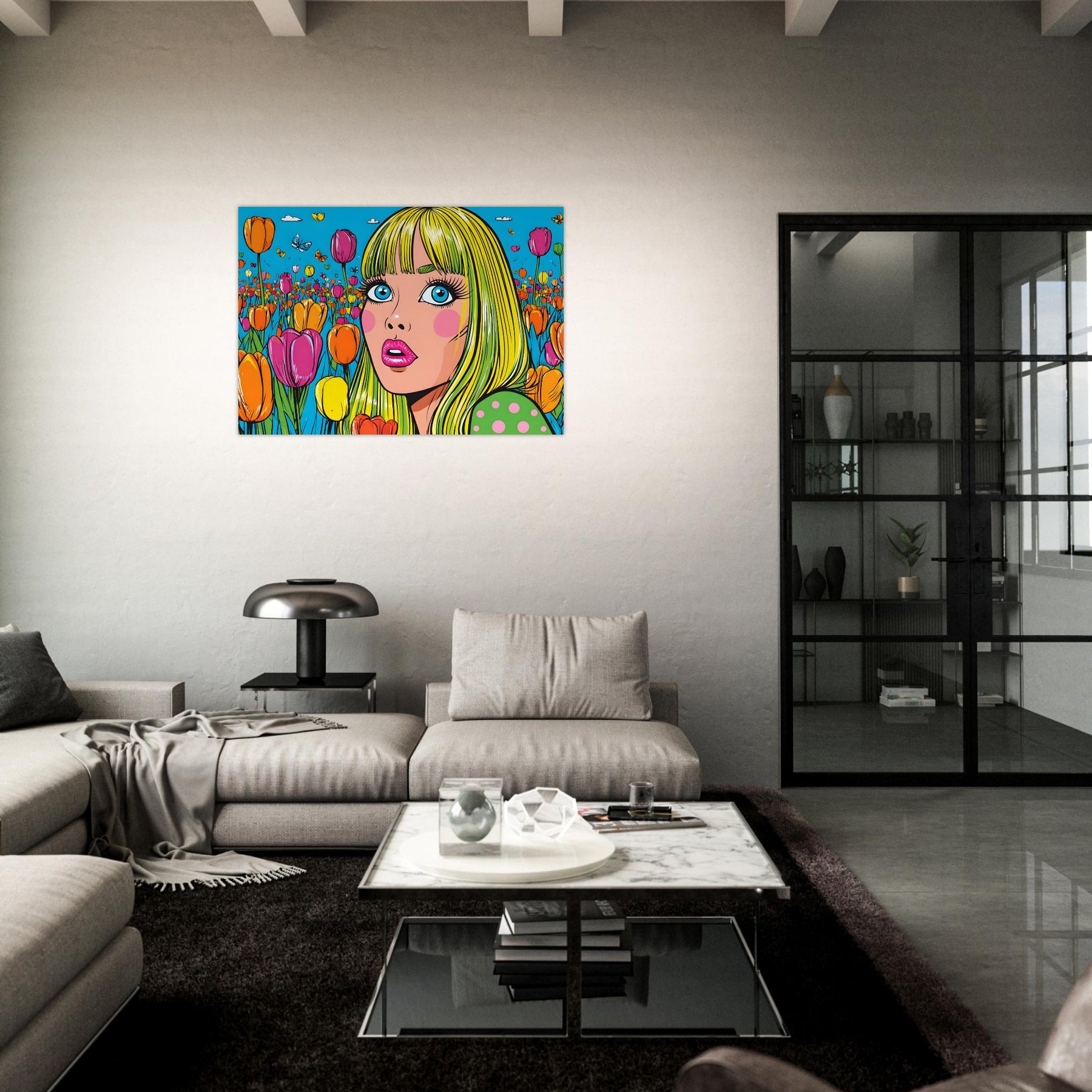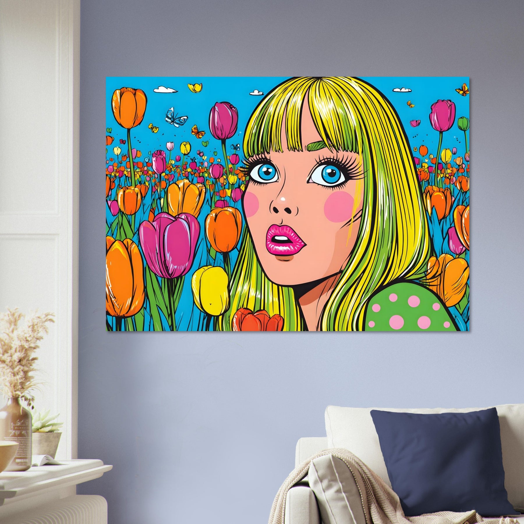 Infuse your space with color and playful energy with Tulip Pop Muse, a striking pop art aluminum wall art featuring a vibrant woman surrounded by a field of colorful tulips. Set within a bright, stylized composition, the artwork radiates liveliness, joy, and modern artistic flair.
