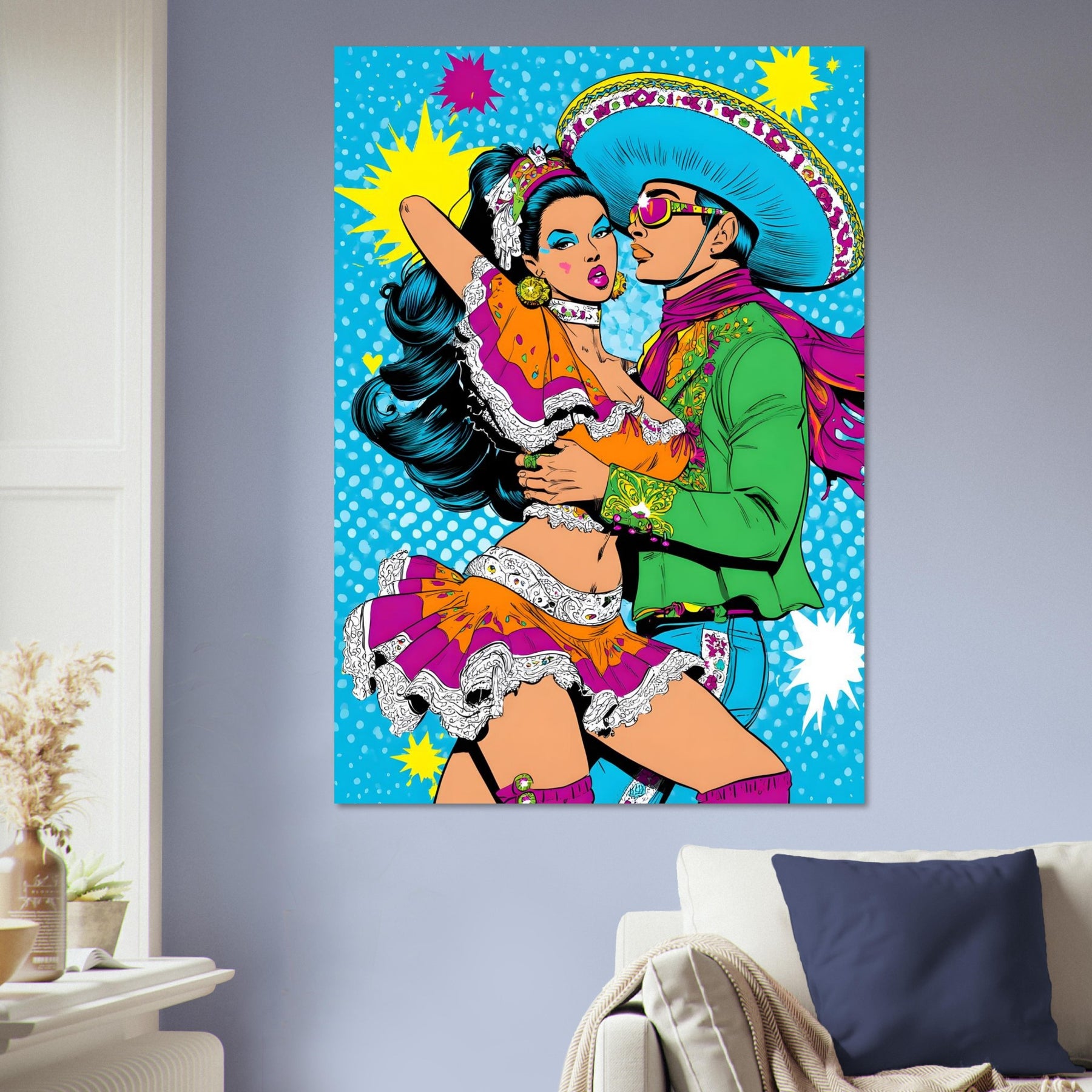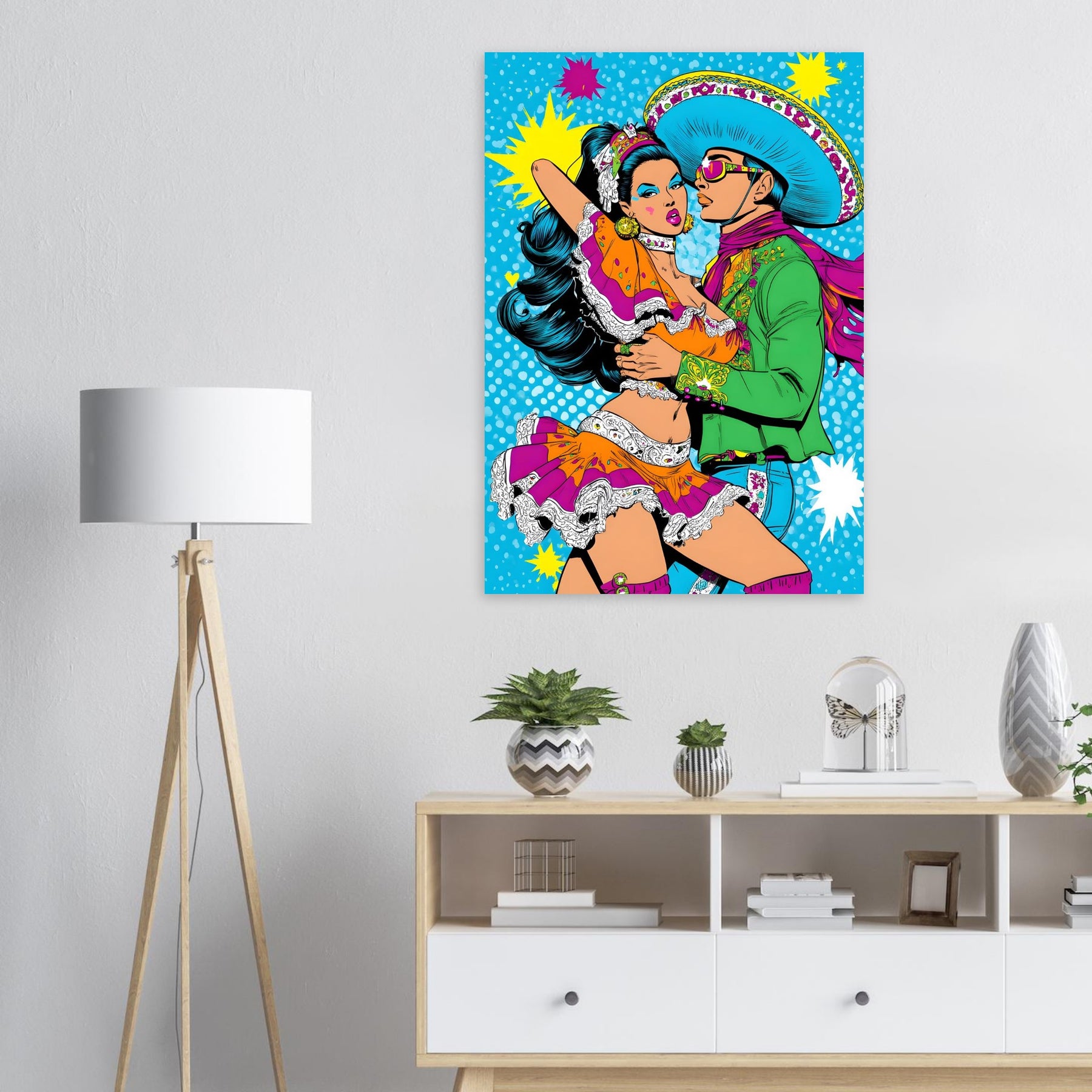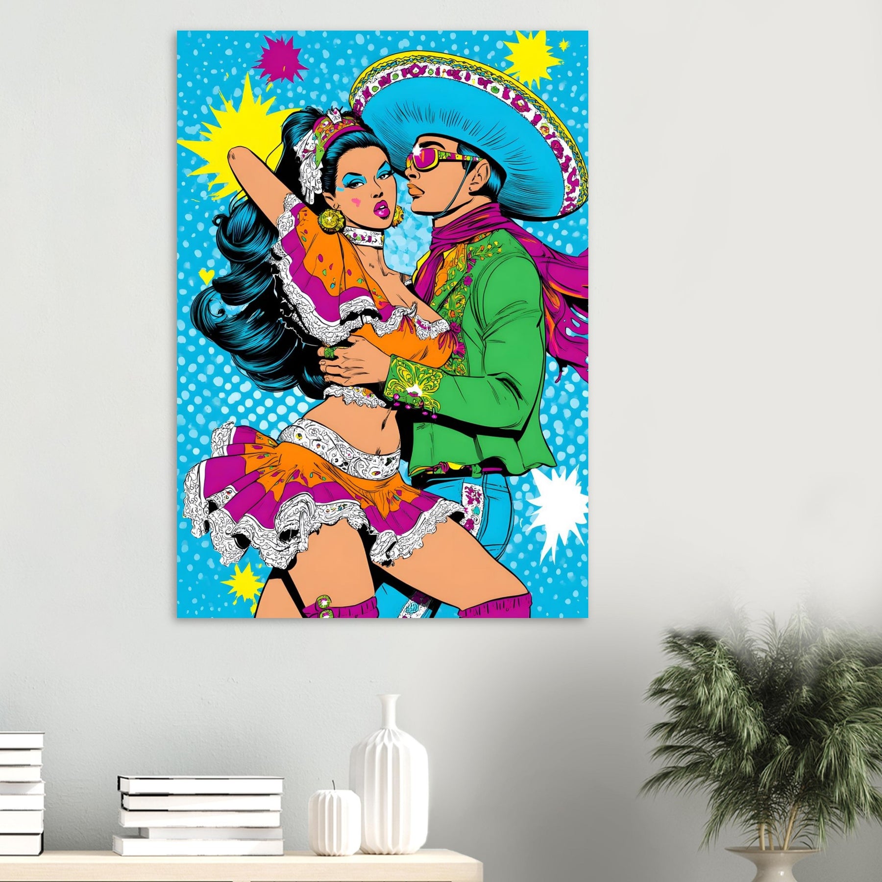 Bring movement, culture, and vibrant energy into your space with Rhythm of Tradition, a colorful pop art aluminum wall art featuring a lively couple dancing in traditional Mexican attire. The dynamic composition, flowing garments, and bold patterns create a festive, expressive scene full of rhythm and life.