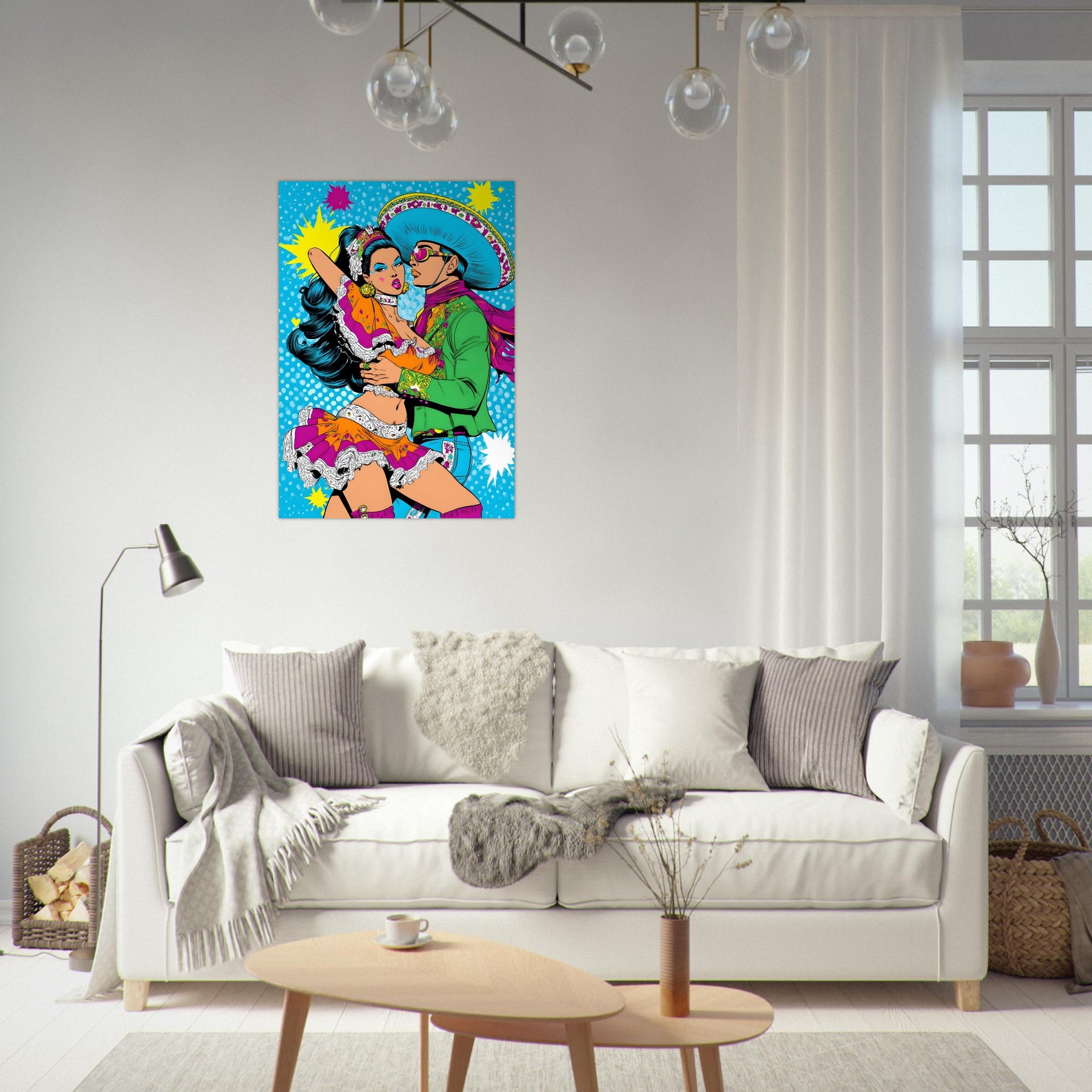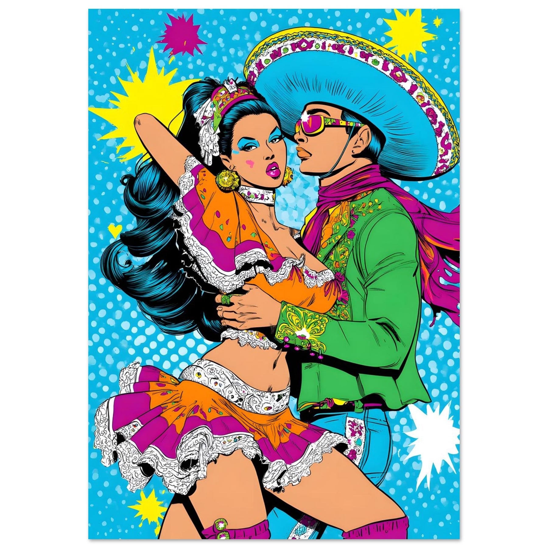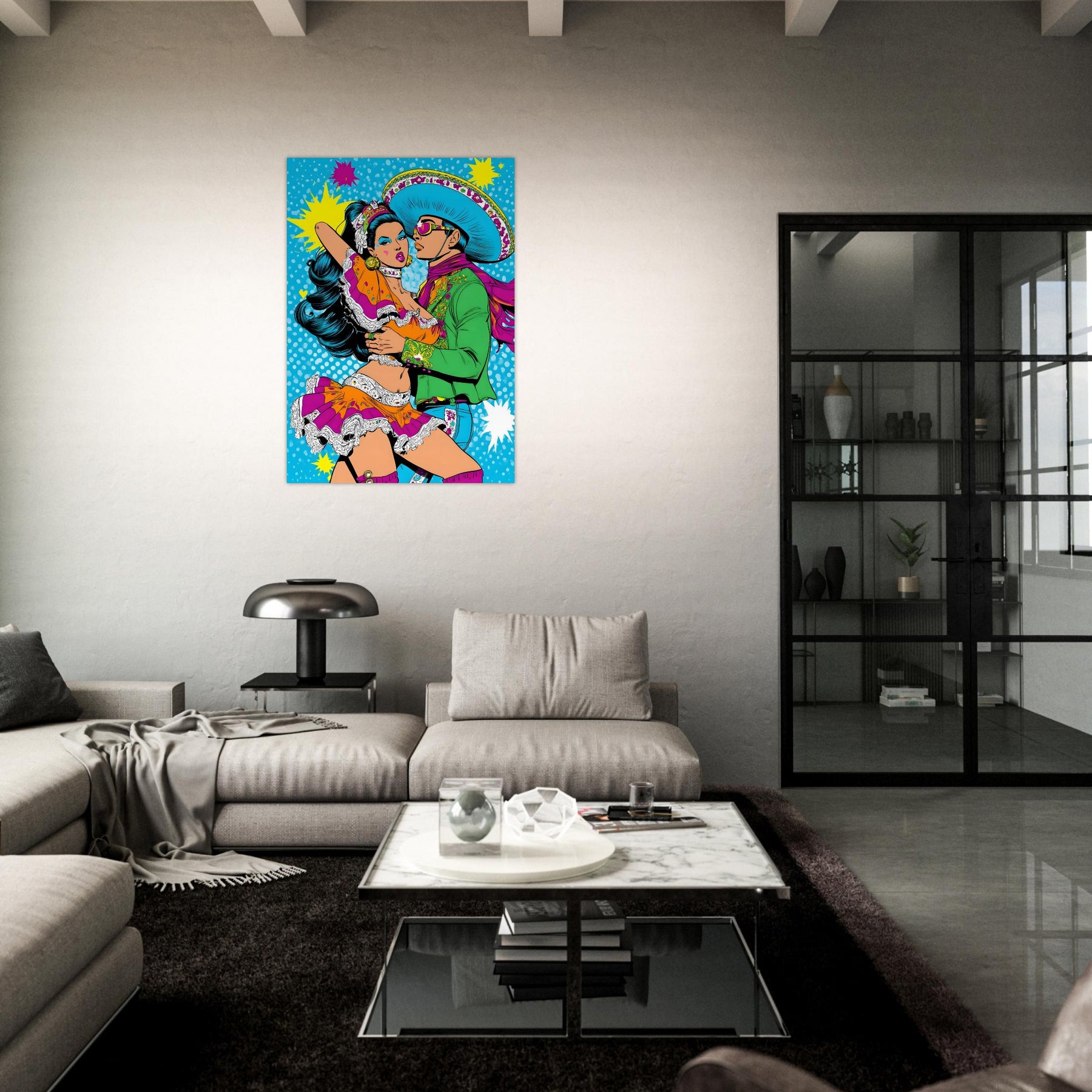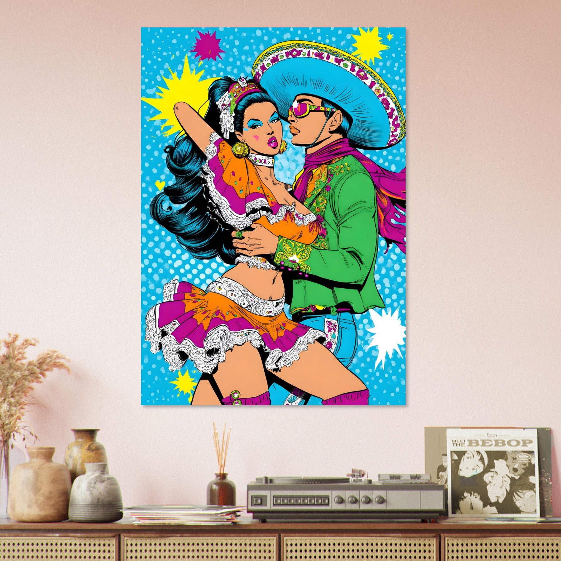 Bring movement, culture, and vibrant energy into your space with Rhythm of Tradition, a colorful pop art aluminum wall art featuring a lively couple dancing in traditional Mexican attire. The dynamic composition, flowing garments, and bold patterns create a festive, expressive scene full of rhythm and life.