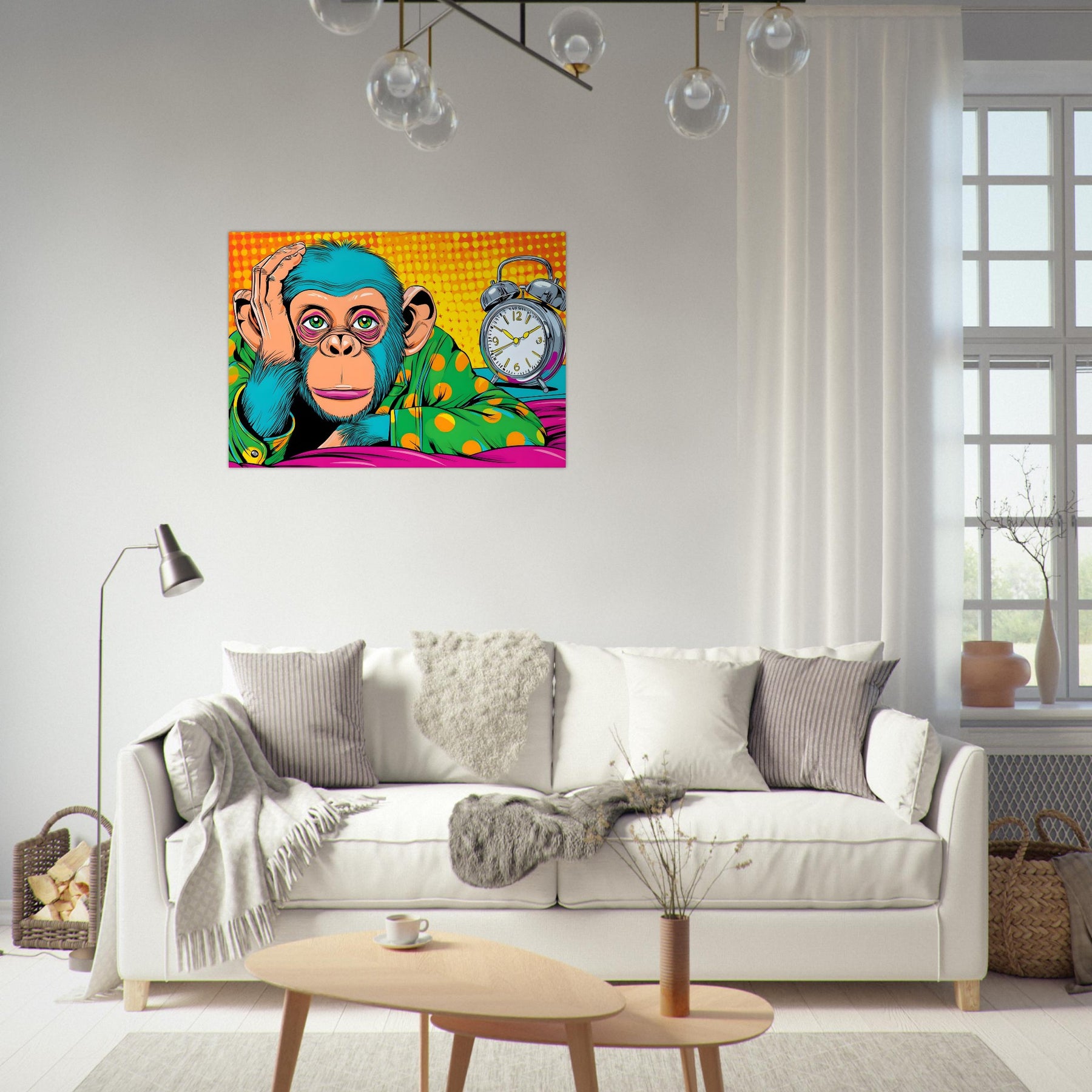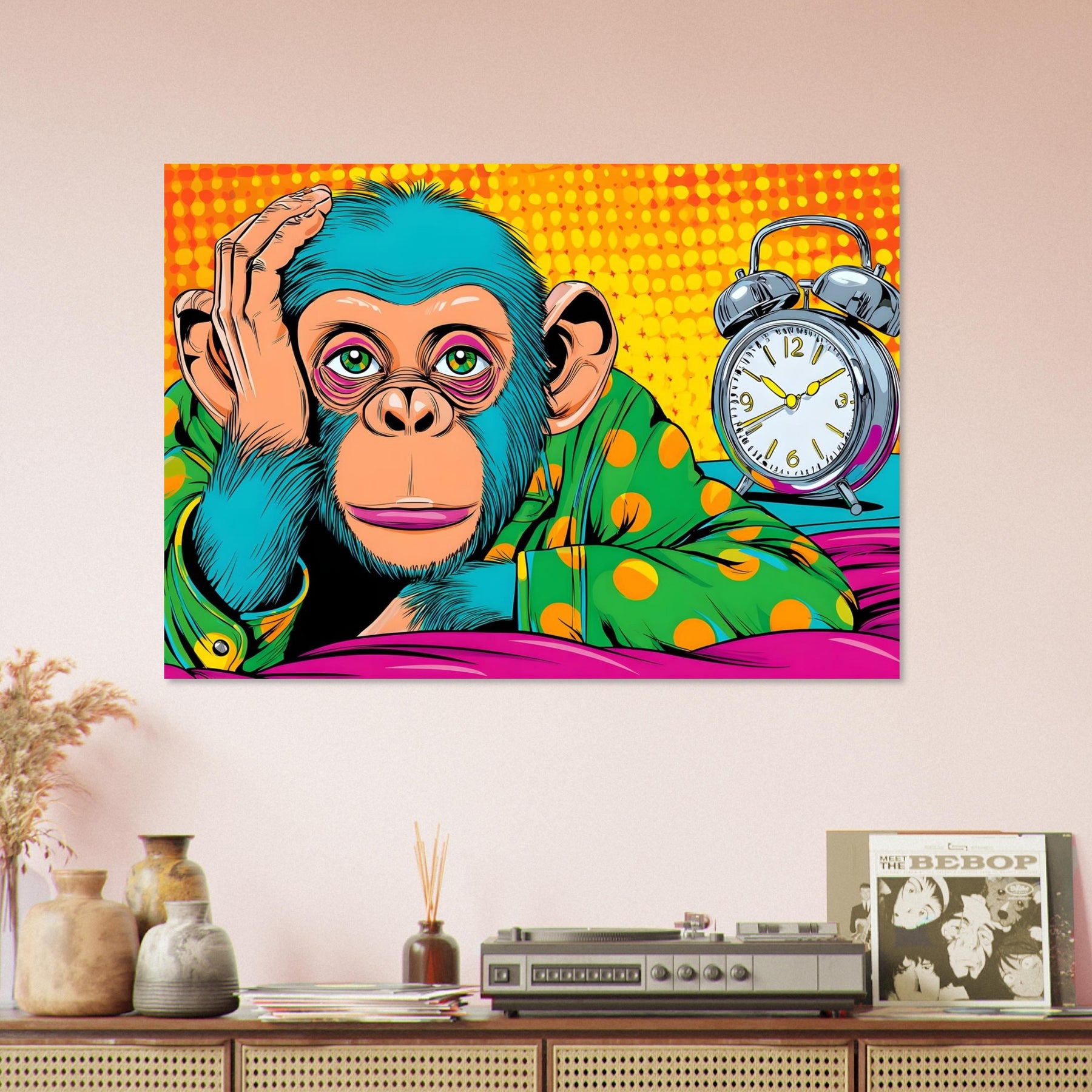 Add thoughtful charm and bold color to your space with Timeless Monkey Mood, a vibrant pop art aluminum wall art featuring an expressive monkey resting its head on its hand beside a classic alarm clock. The playful yet reflective composition creates a unique blend of humor and introspection.