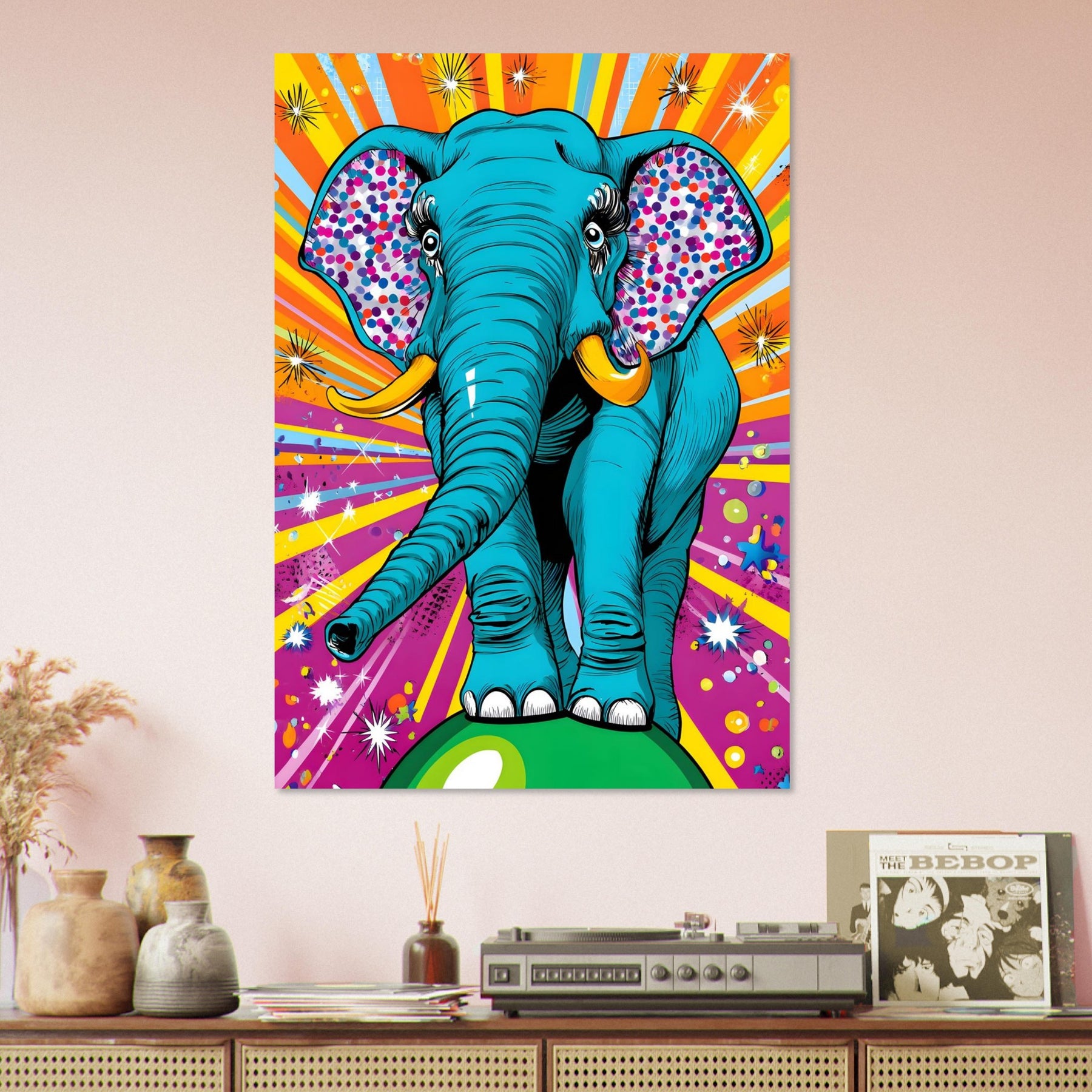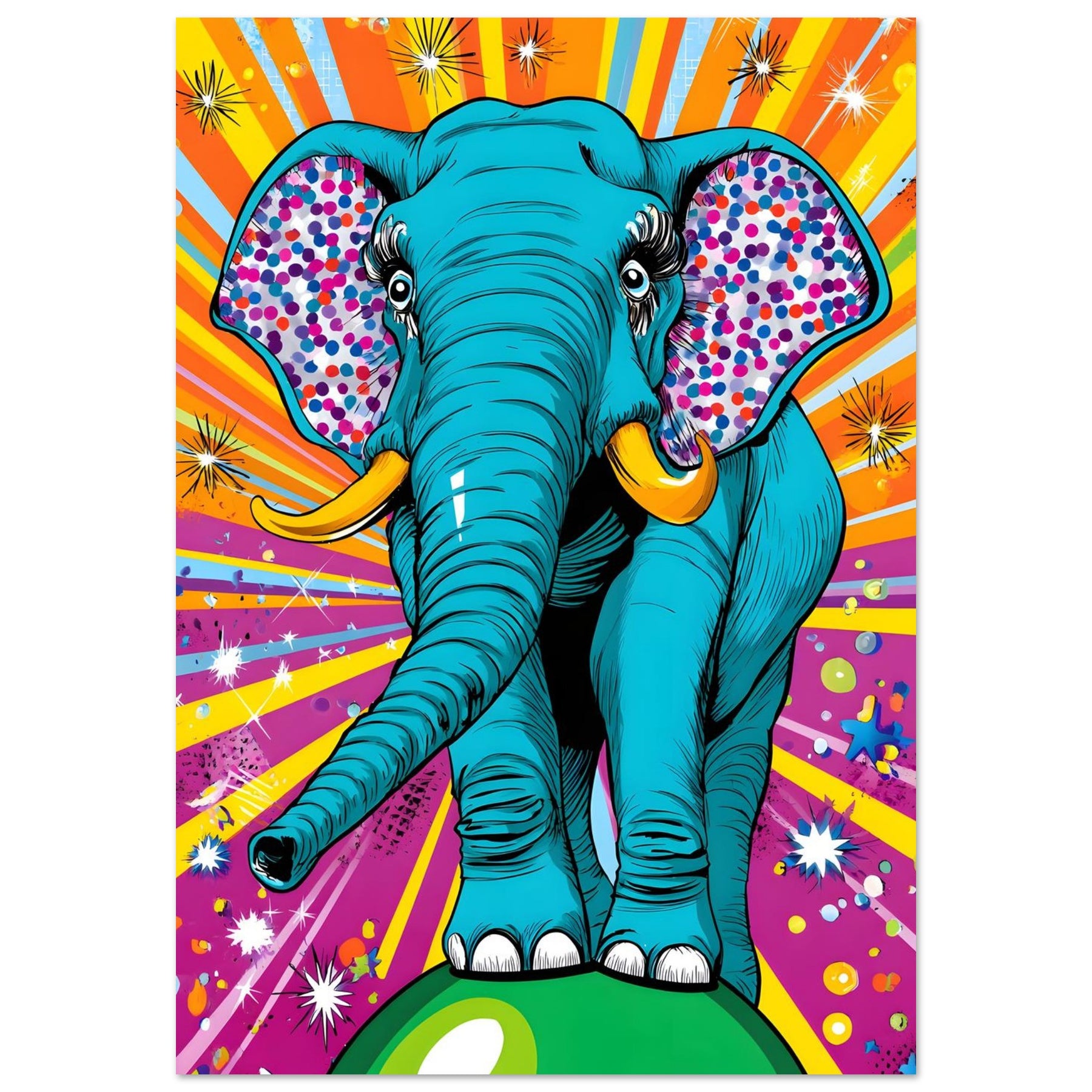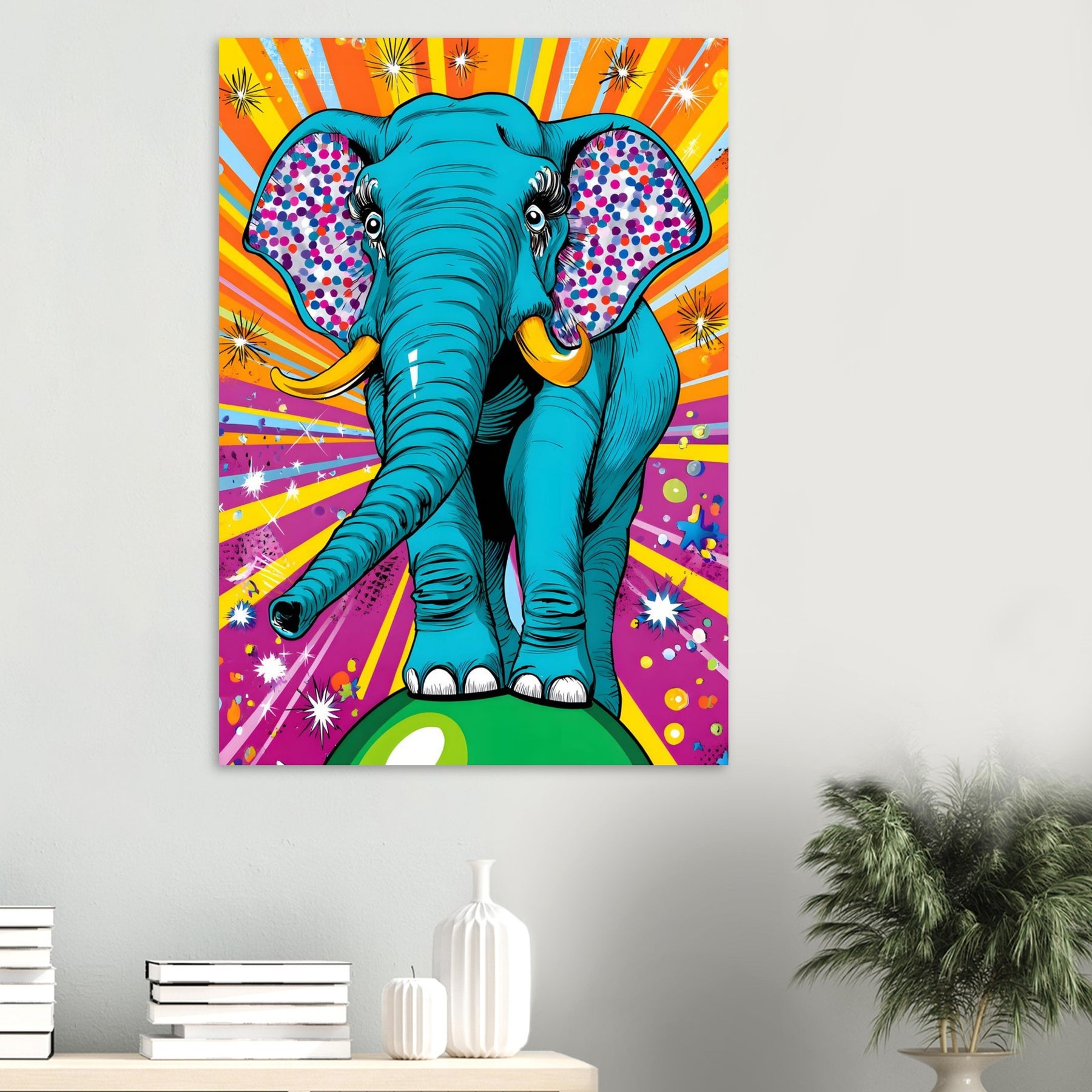 Add playful energy and bold color to your space with Blue Elephant Burst, a lively pop art aluminum wall art featuring a proud blue elephant standing atop a green sphere. Surrounded by a dynamic explosion of colorful polka dots and radiant beams, the composition delivers joy, movement, and eye-catching modern flair.