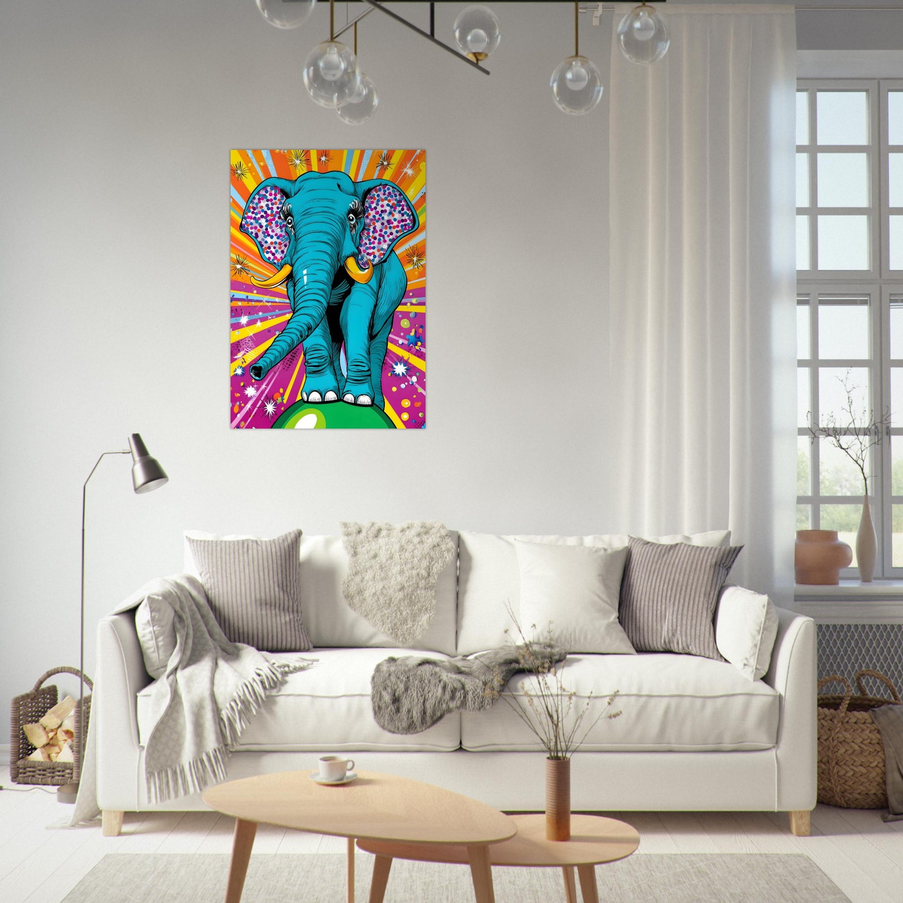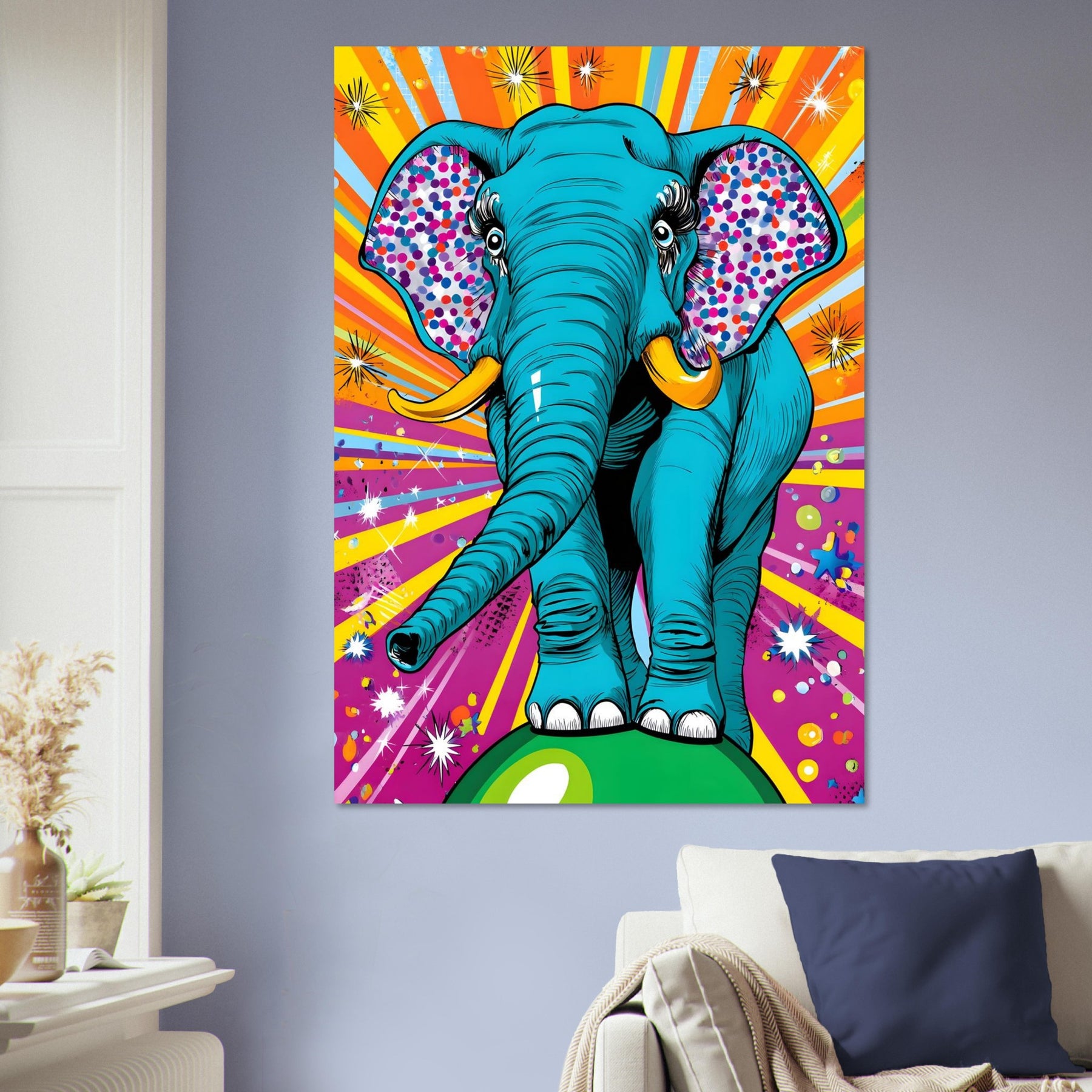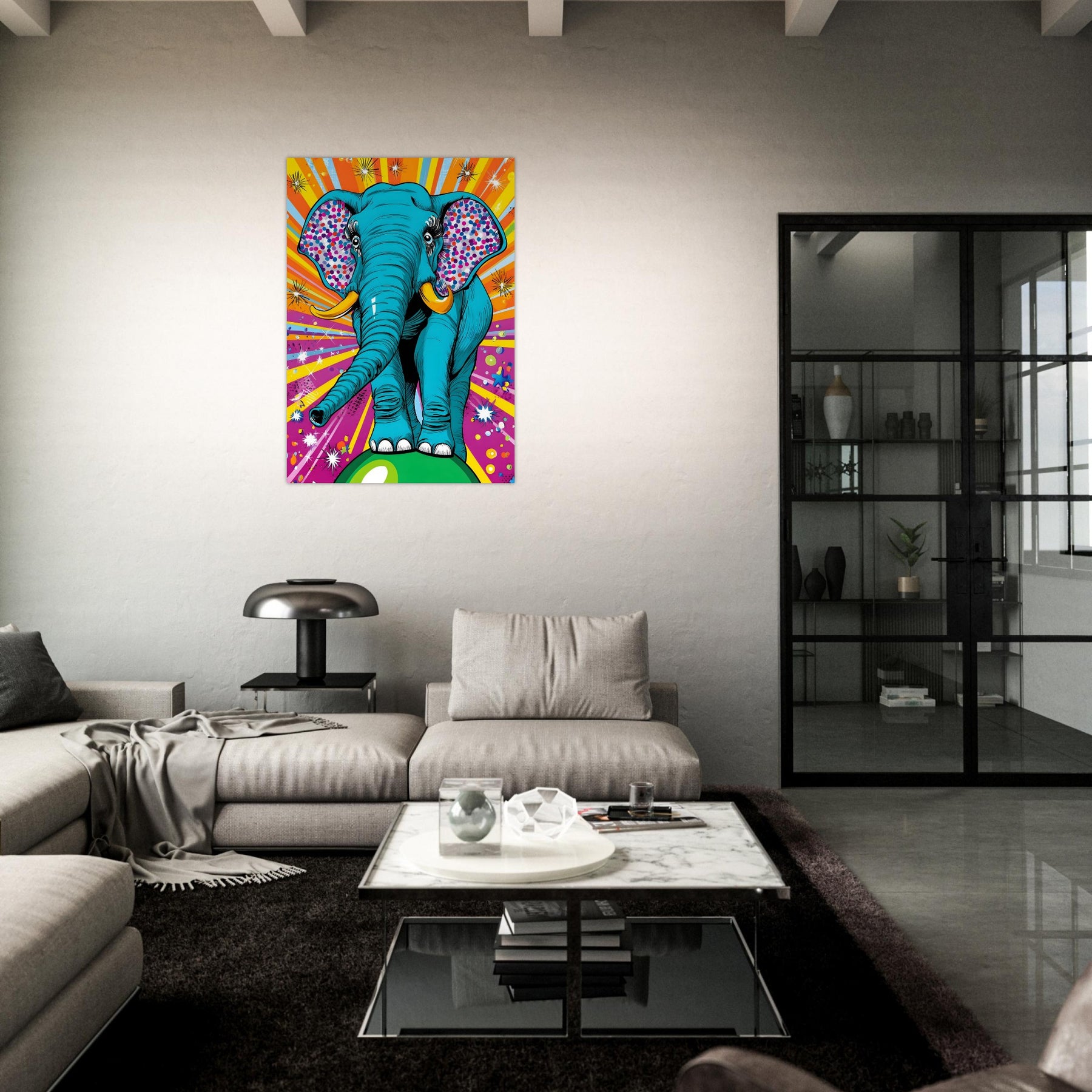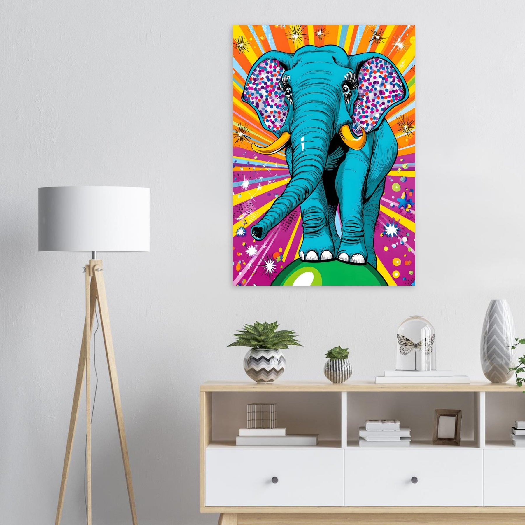 Add playful energy and bold color to your space with Blue Elephant Burst, a lively pop art aluminum wall art featuring a proud blue elephant standing atop a green sphere. Surrounded by a dynamic explosion of colorful polka dots and radiant beams, the composition delivers joy, movement, and eye-catching modern flair.