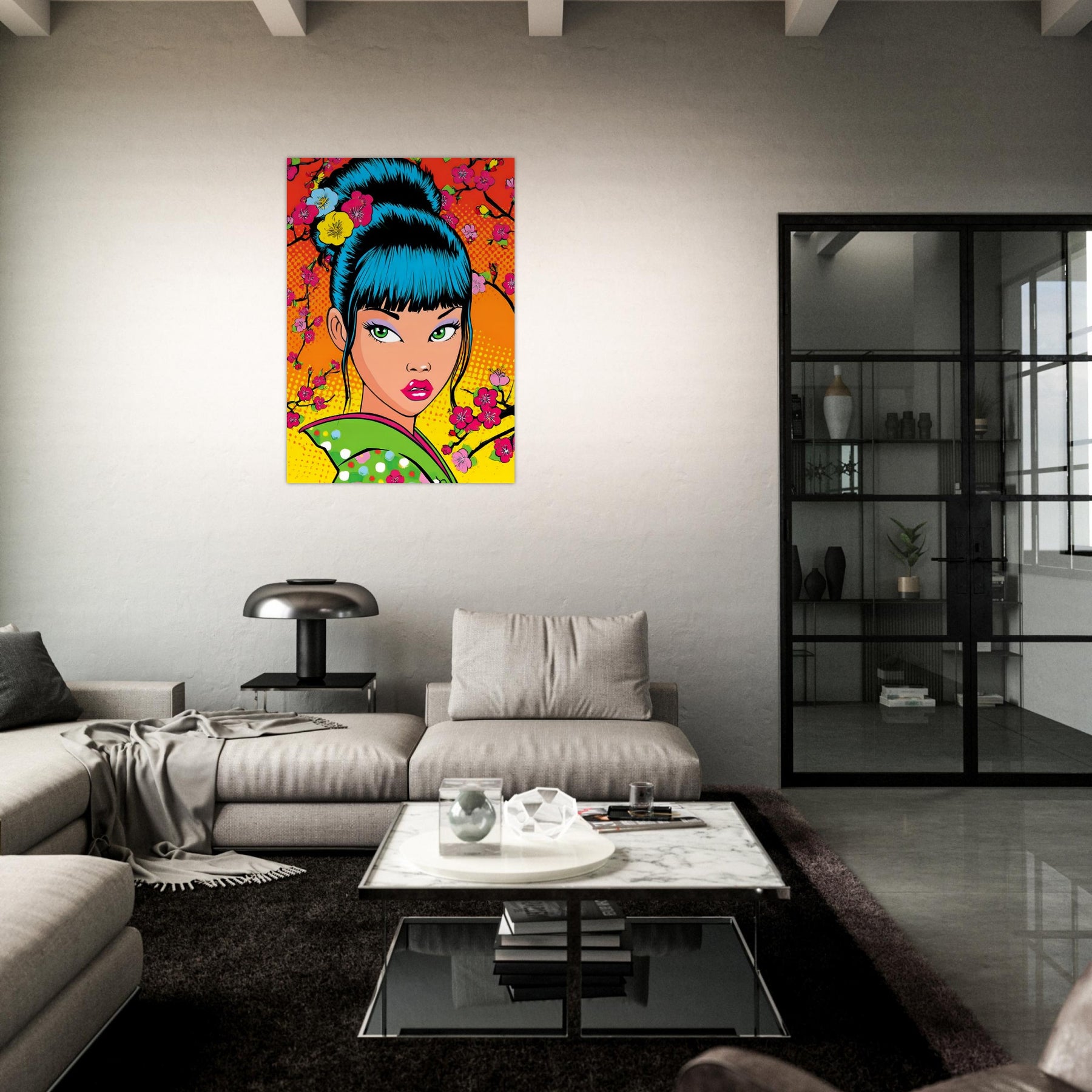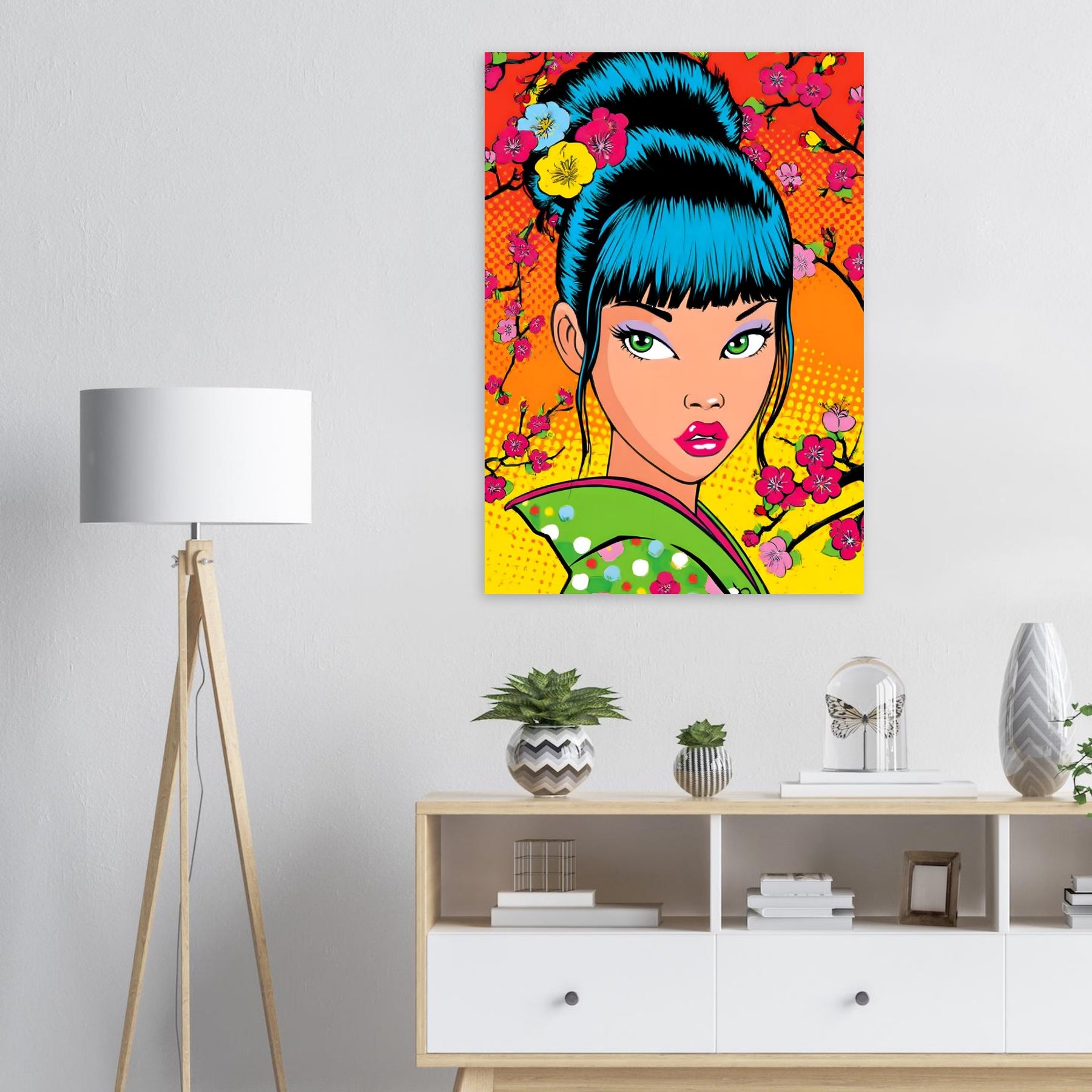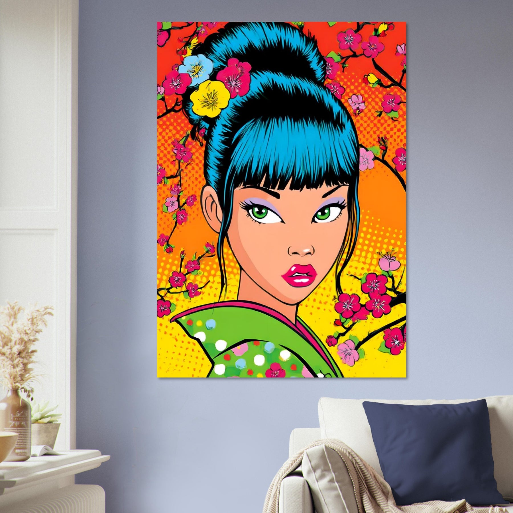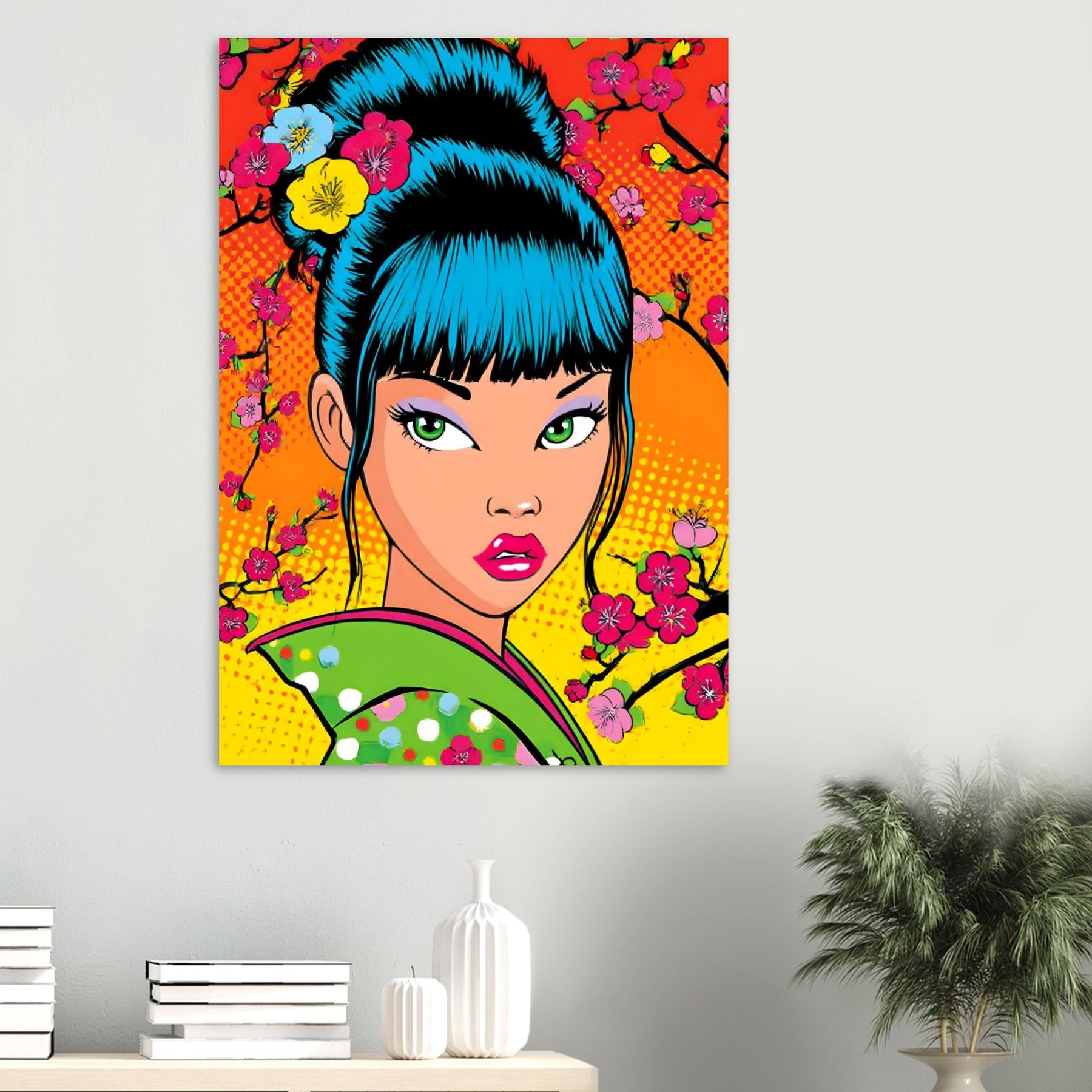 Add elegance and modern flair to your space with Cherry Bloom Blue, a captivating pop art aluminum wall art featuring a striking woman with bright blue hair set against a backdrop of blooming cherry blossoms. The refined color palette and graceful floral elements create a harmonious blend of bold pop art energy and delicate beauty.