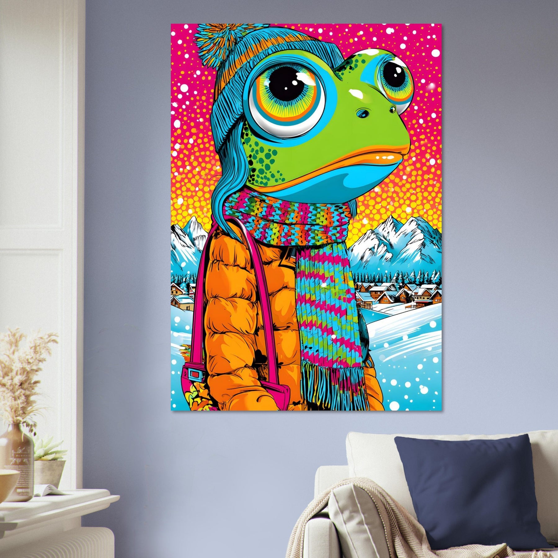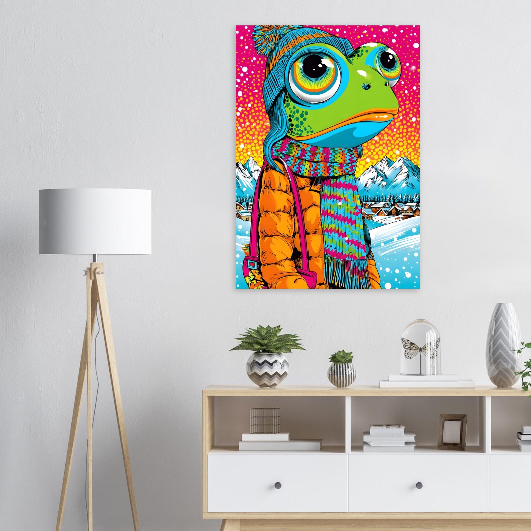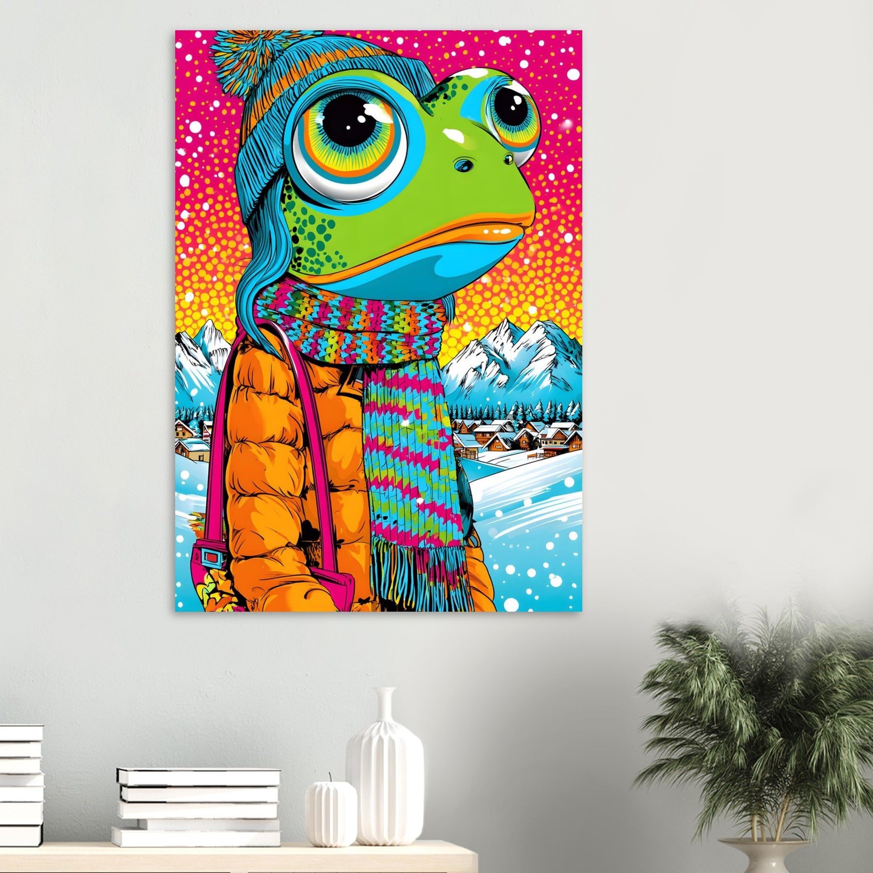 Add playful winter charm and bold color to your space with Frosty Frog Pop, a whimsical pop art aluminum wall art featuring an imaginative frog character dressed in cozy winter clothes. Set against a colorful snowy background, the artwork blends cheerful humor with striking pop art vibrancy for a truly unique visual experience.