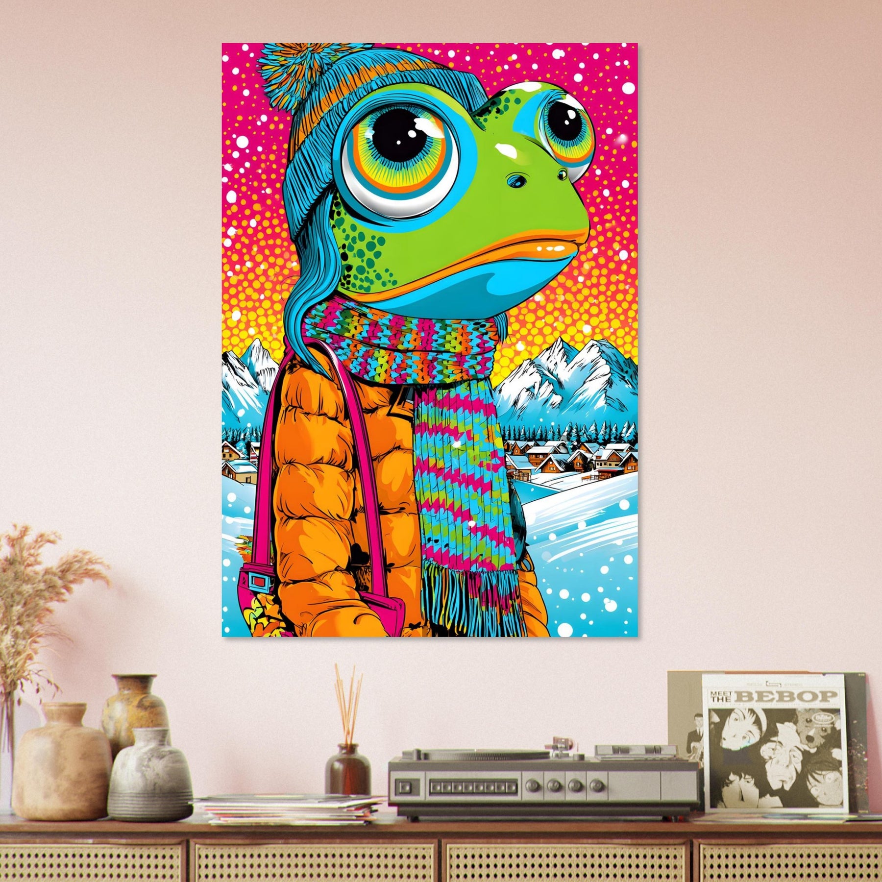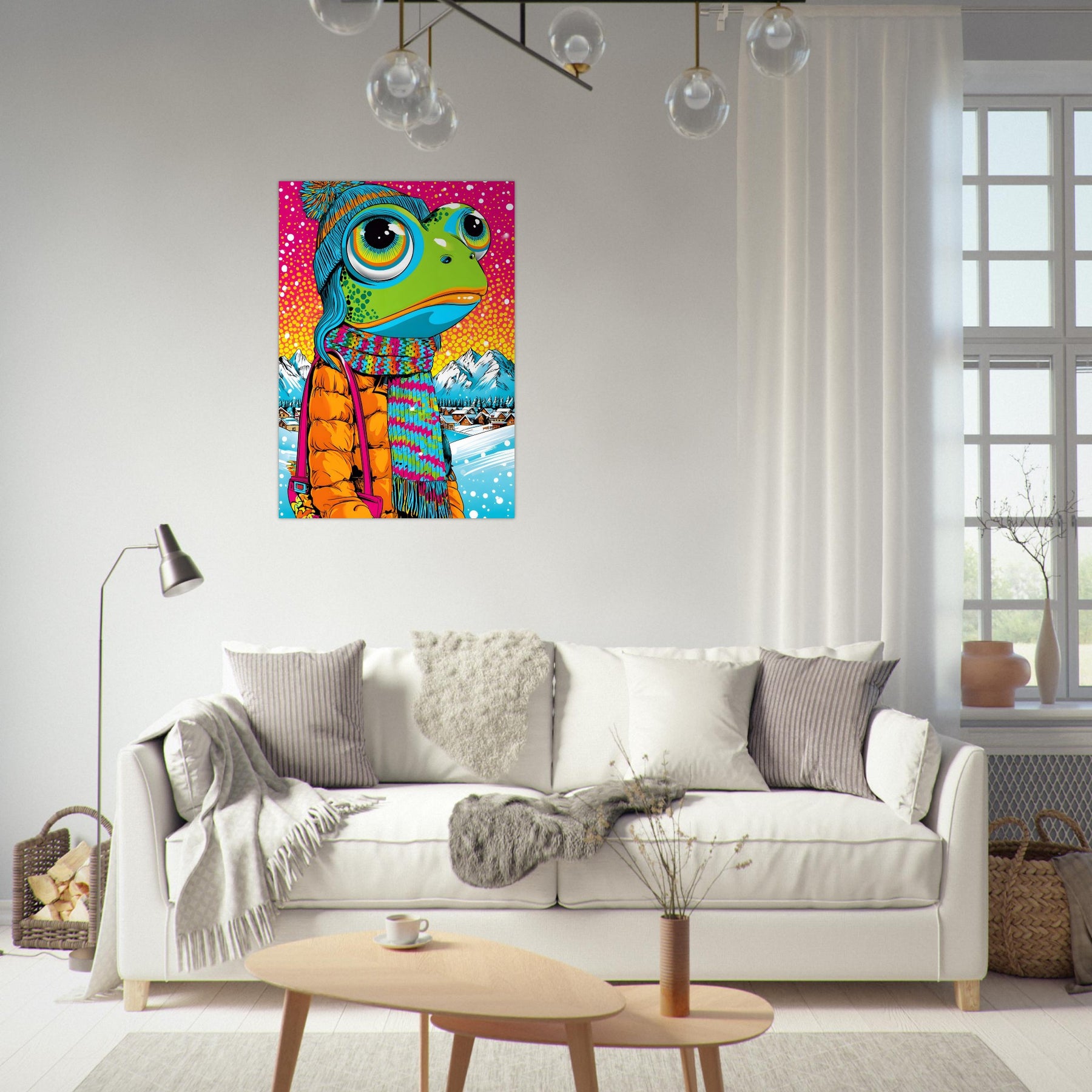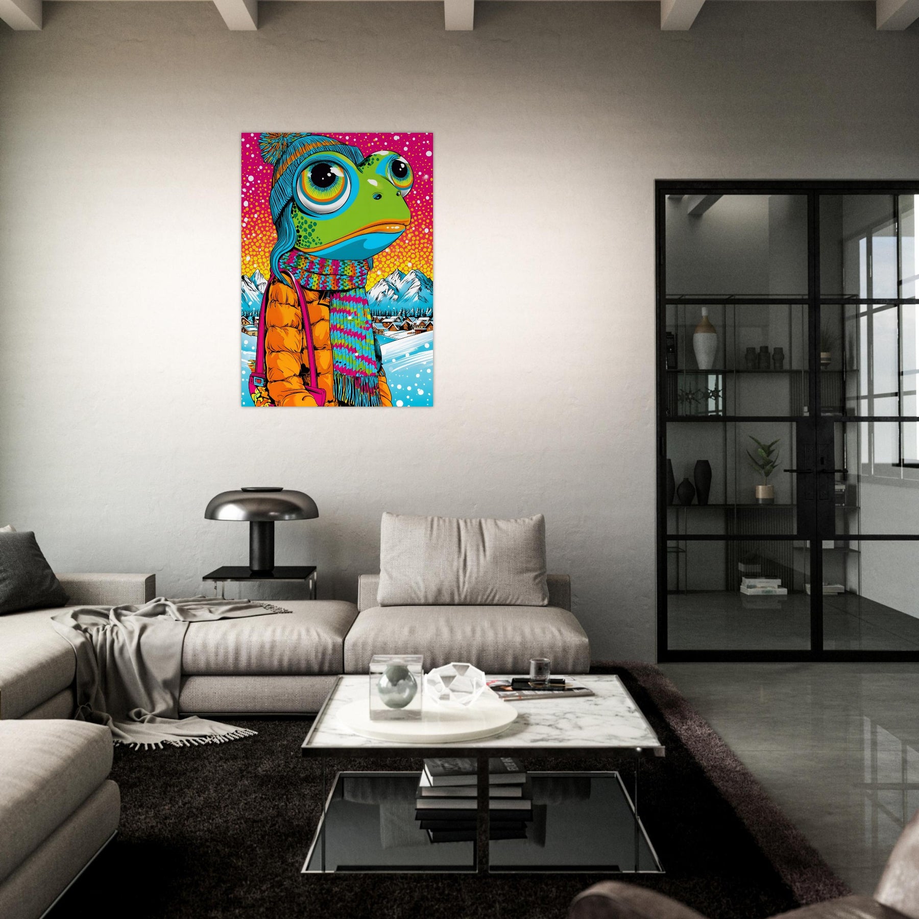 Add playful winter charm and bold color to your space with Frosty Frog Pop, a whimsical pop art aluminum wall art featuring an imaginative frog character dressed in cozy winter clothes. Set against a colorful snowy background, the artwork blends cheerful humor with striking pop art vibrancy for a truly unique visual experience.