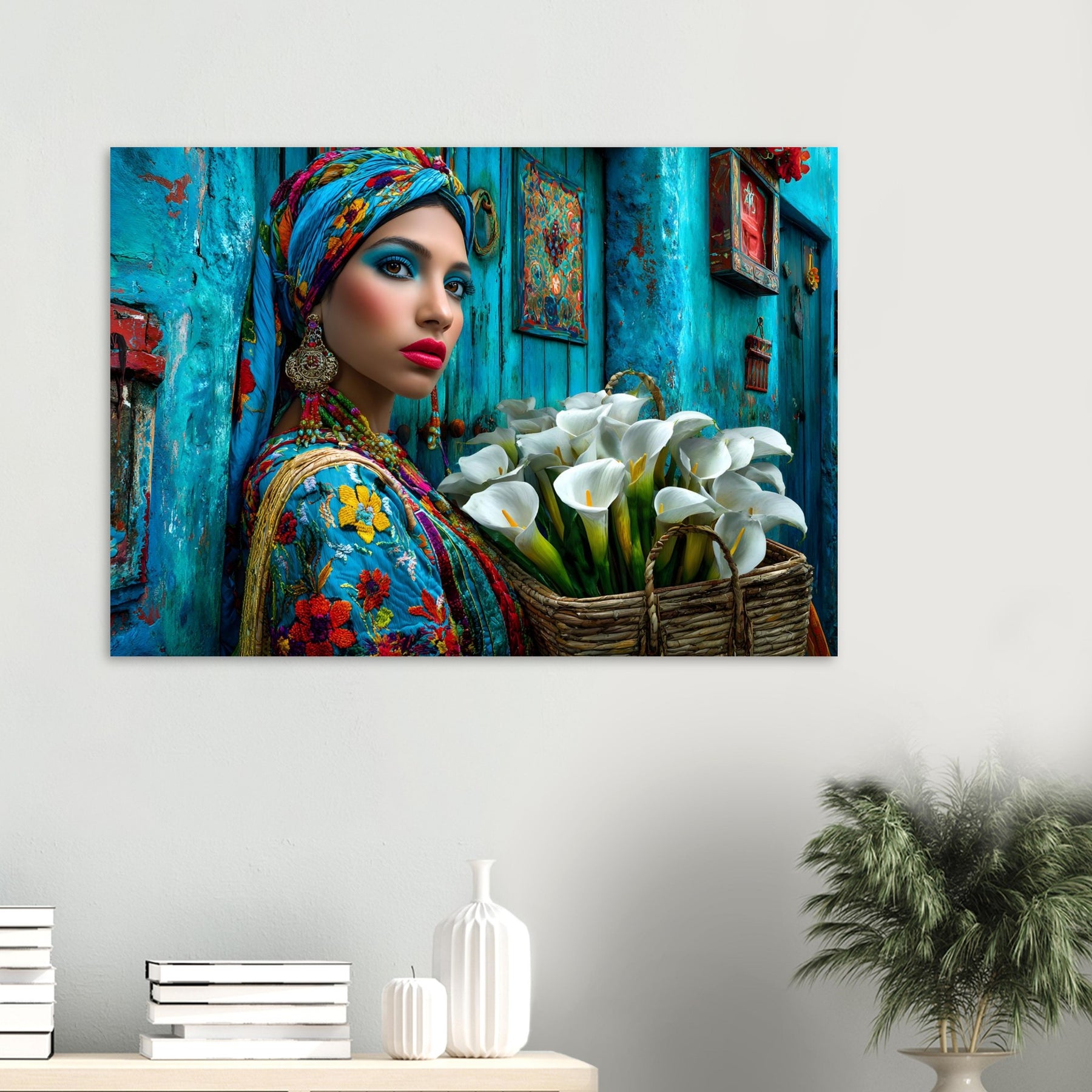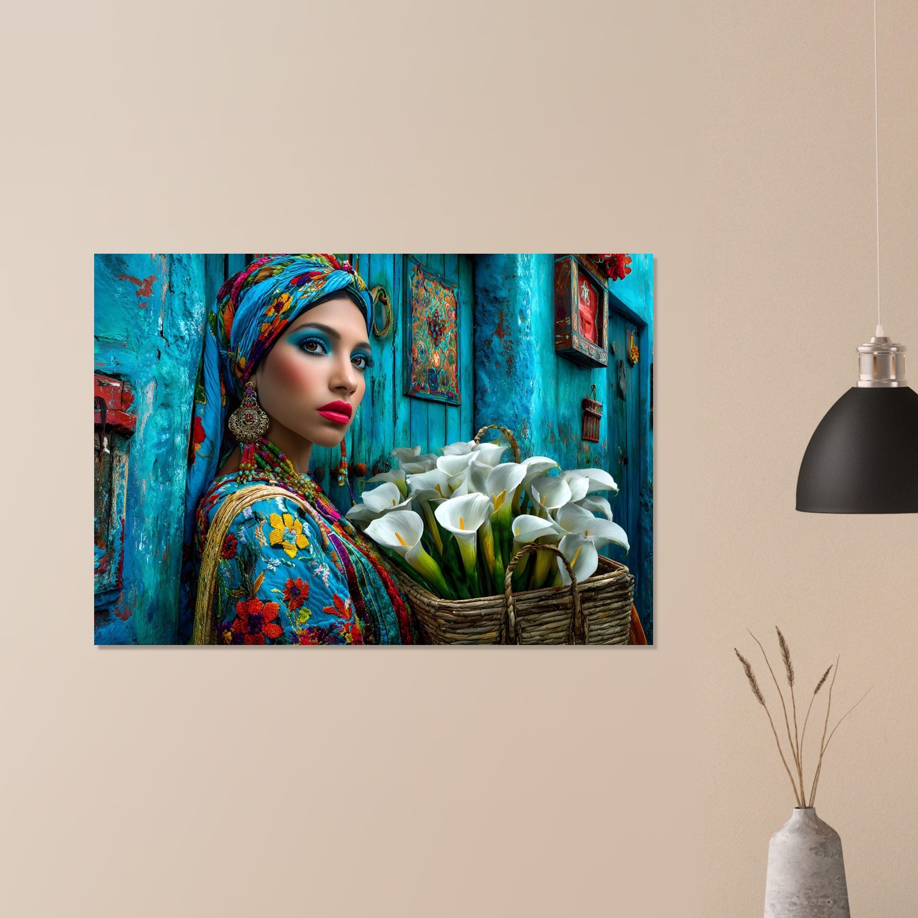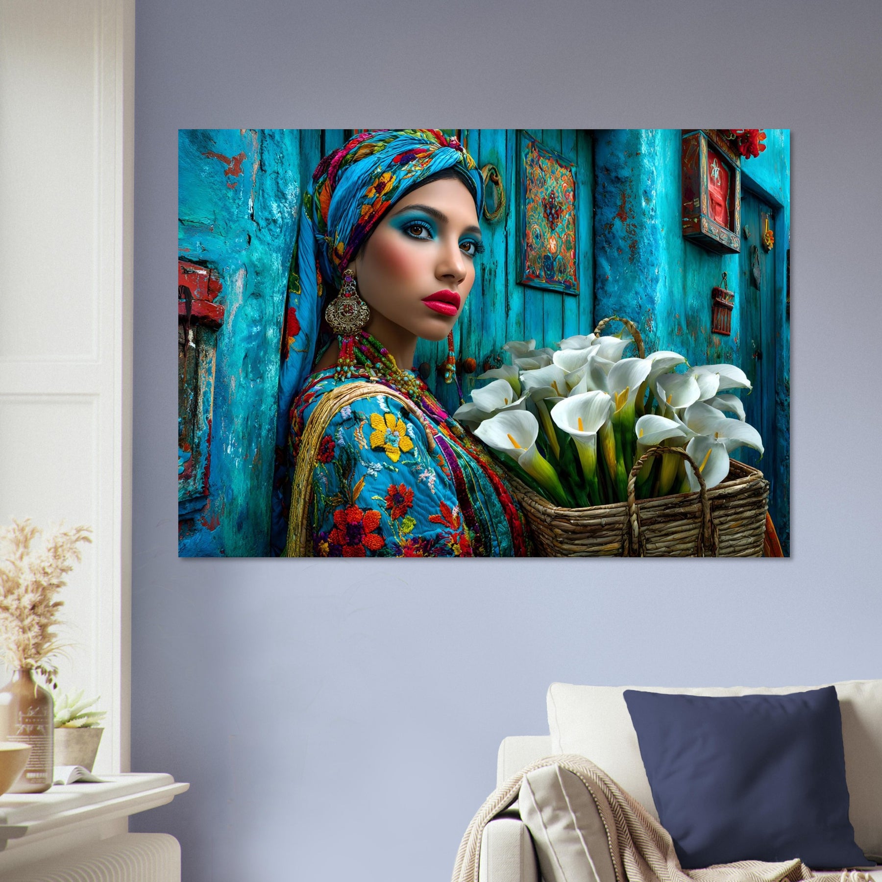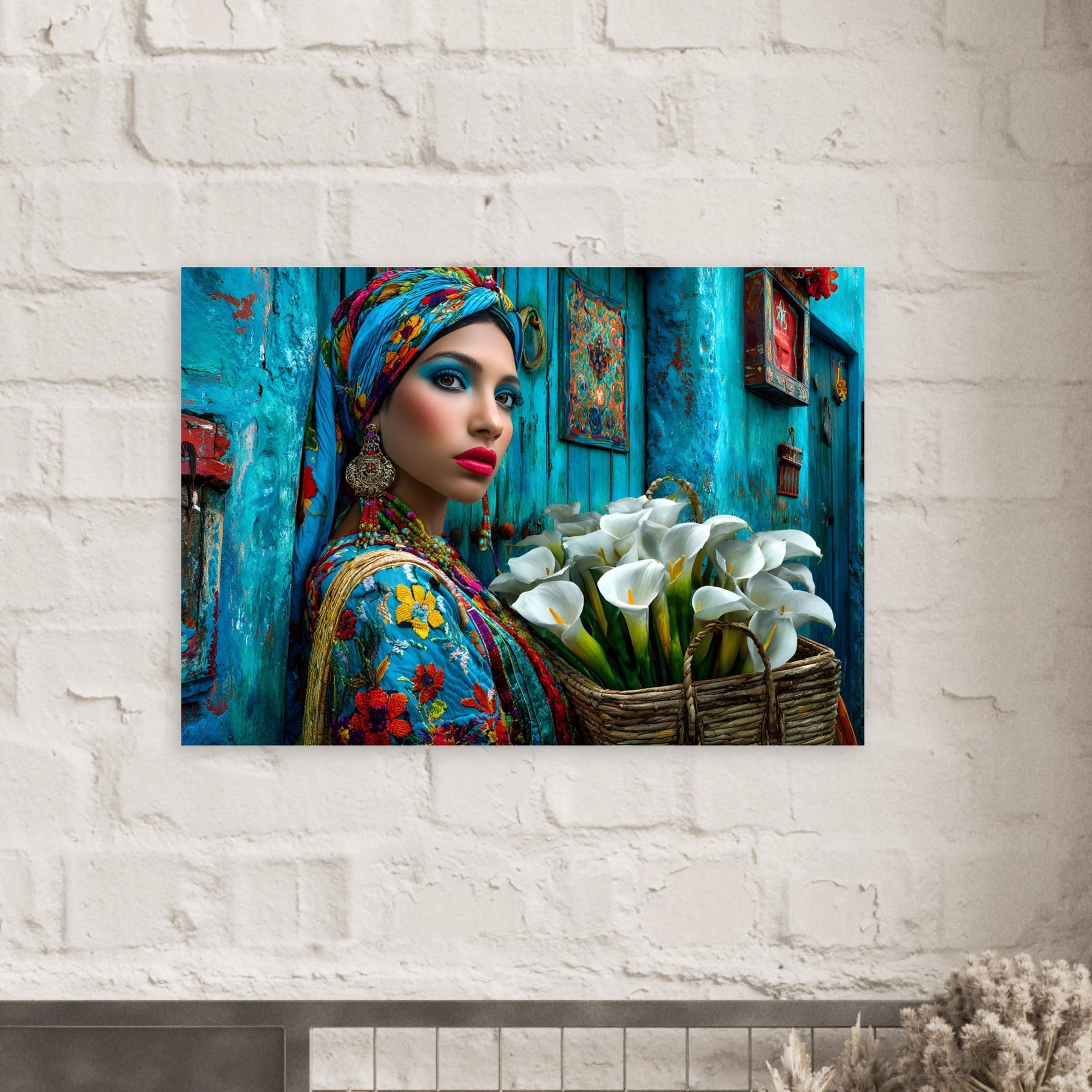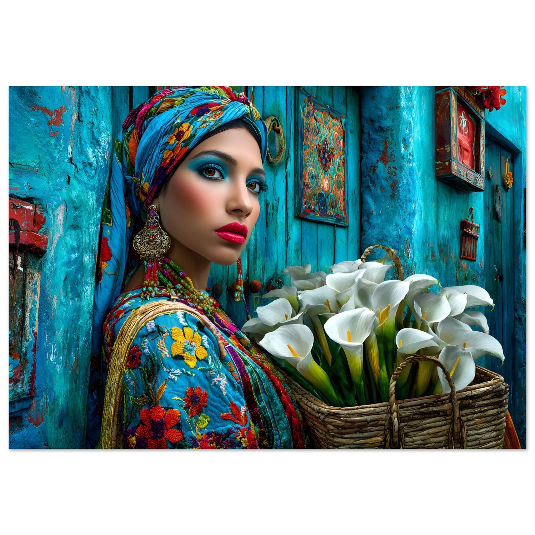 Transform your space with Azure Grace, a captivating aluminum wall art piece that celebrates elegance, culture, and artistic expression. This stunning portrait features a beautiful woman dressed in vibrant traditional attire, posed gracefully against a rich blue backdrop while holding a basket of delicate white flowers—creating a powerful contrast that radiates beauty, balance, and cultural pride.