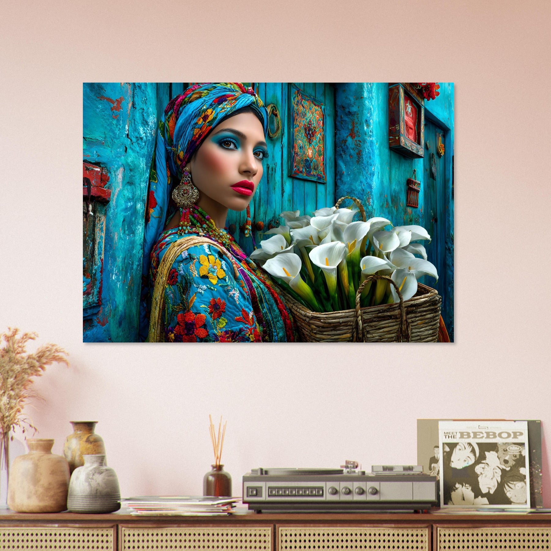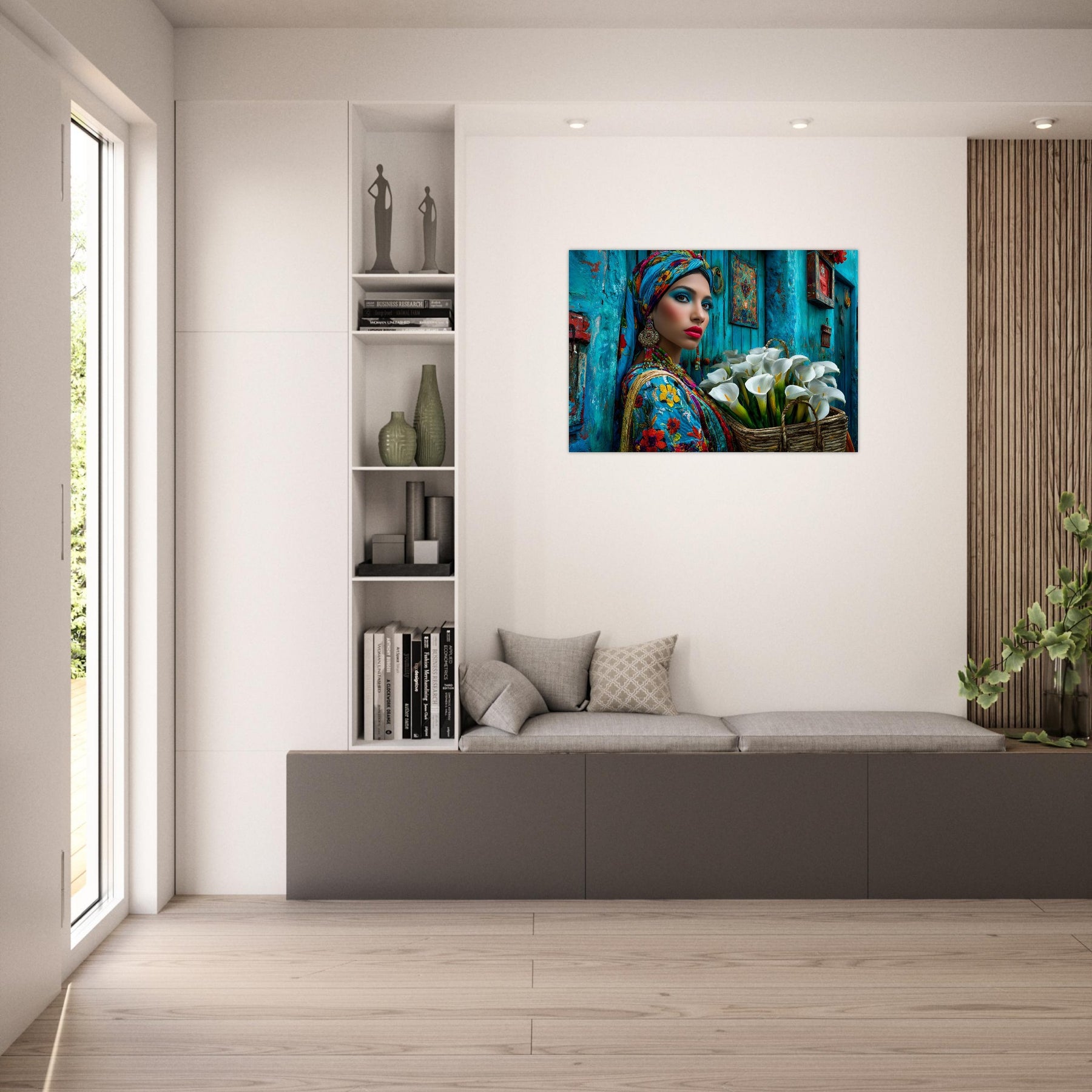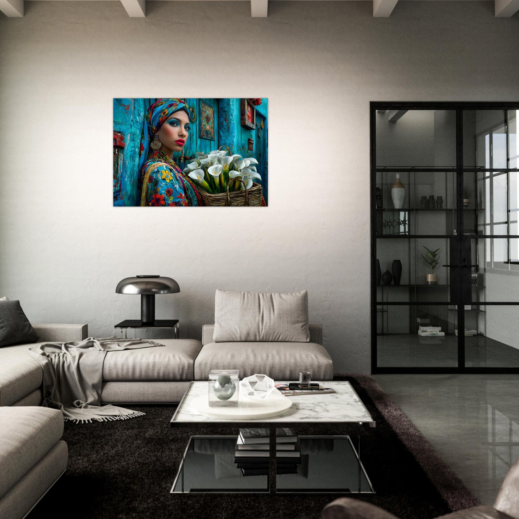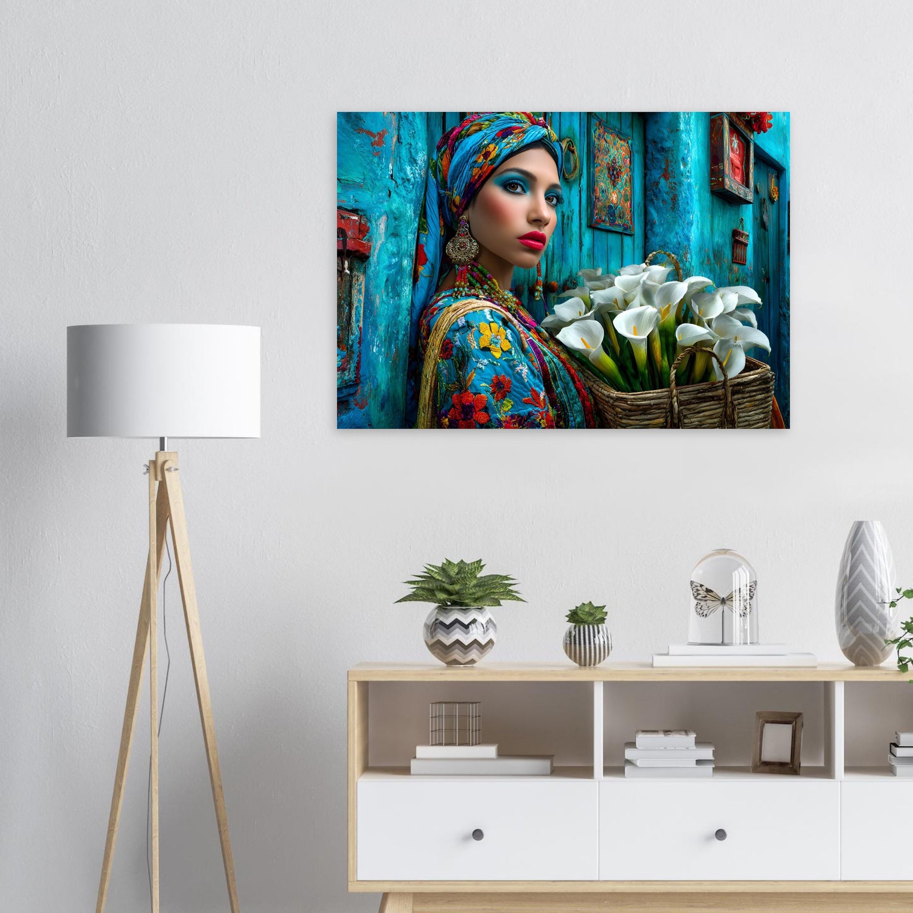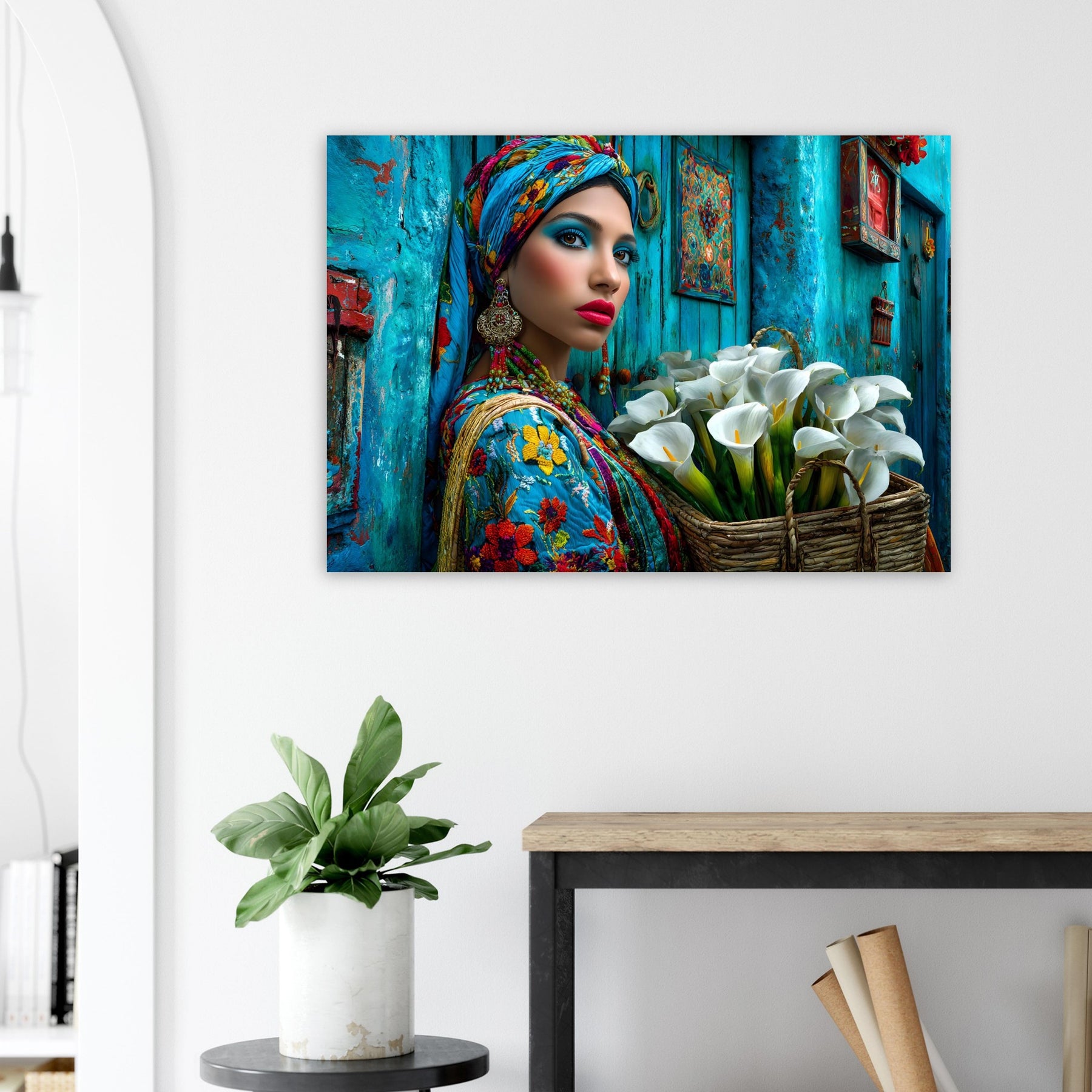 Transform your space with Azure Grace, a captivating aluminum wall art piece that celebrates elegance, culture, and artistic expression. This stunning portrait features a beautiful woman dressed in vibrant traditional attire, posed gracefully against a rich blue backdrop while holding a basket of delicate white flowers—creating a powerful contrast that radiates beauty, balance, and cultural pride.