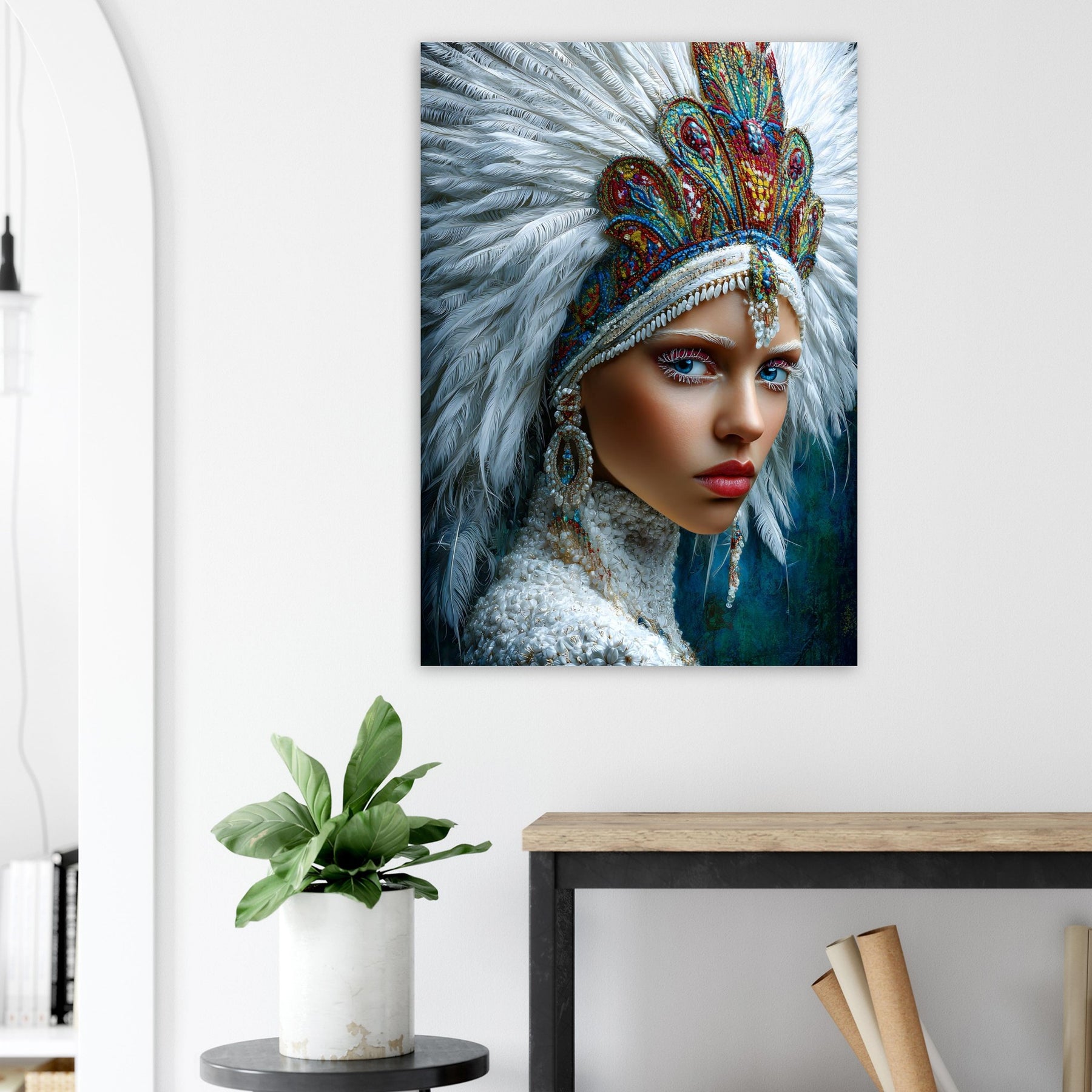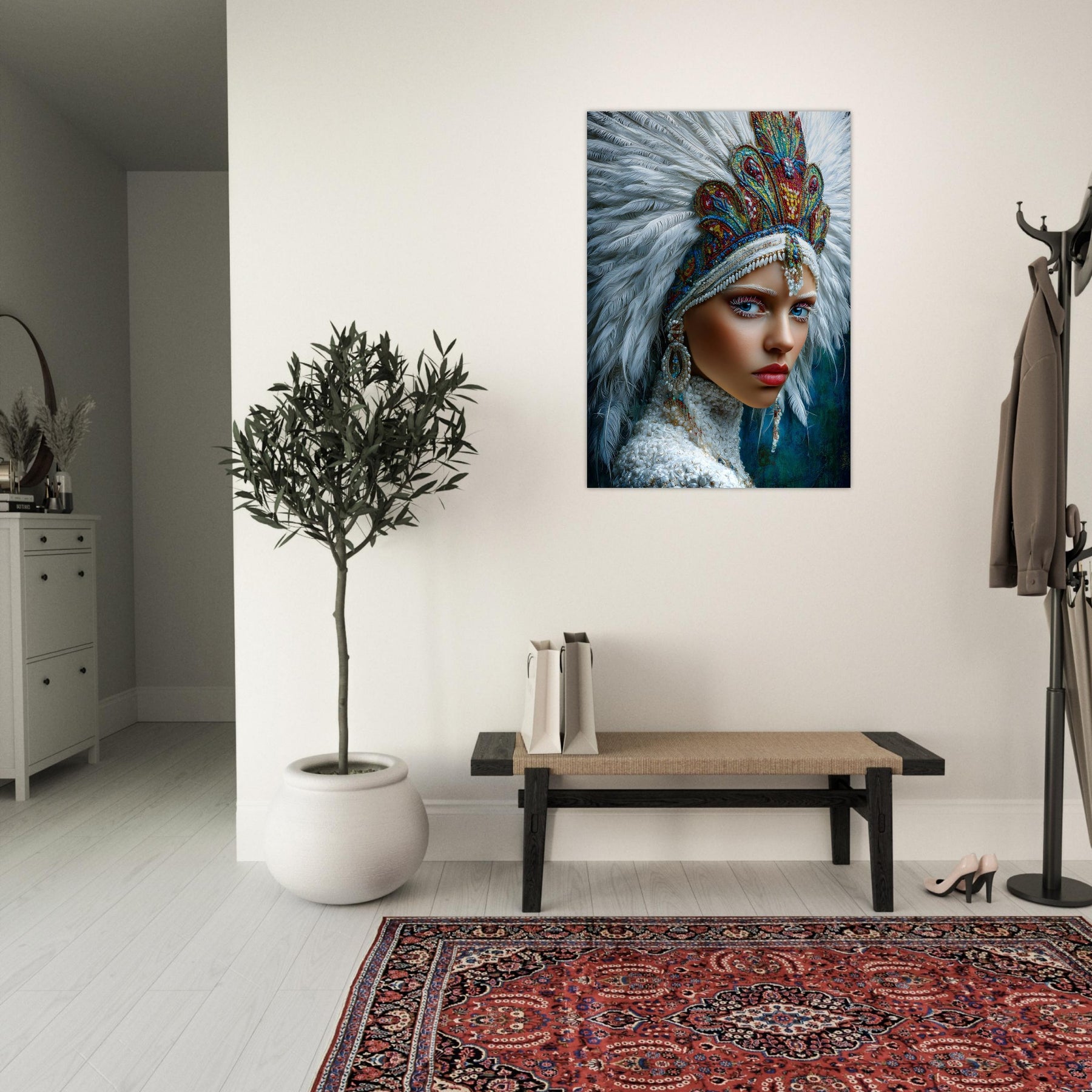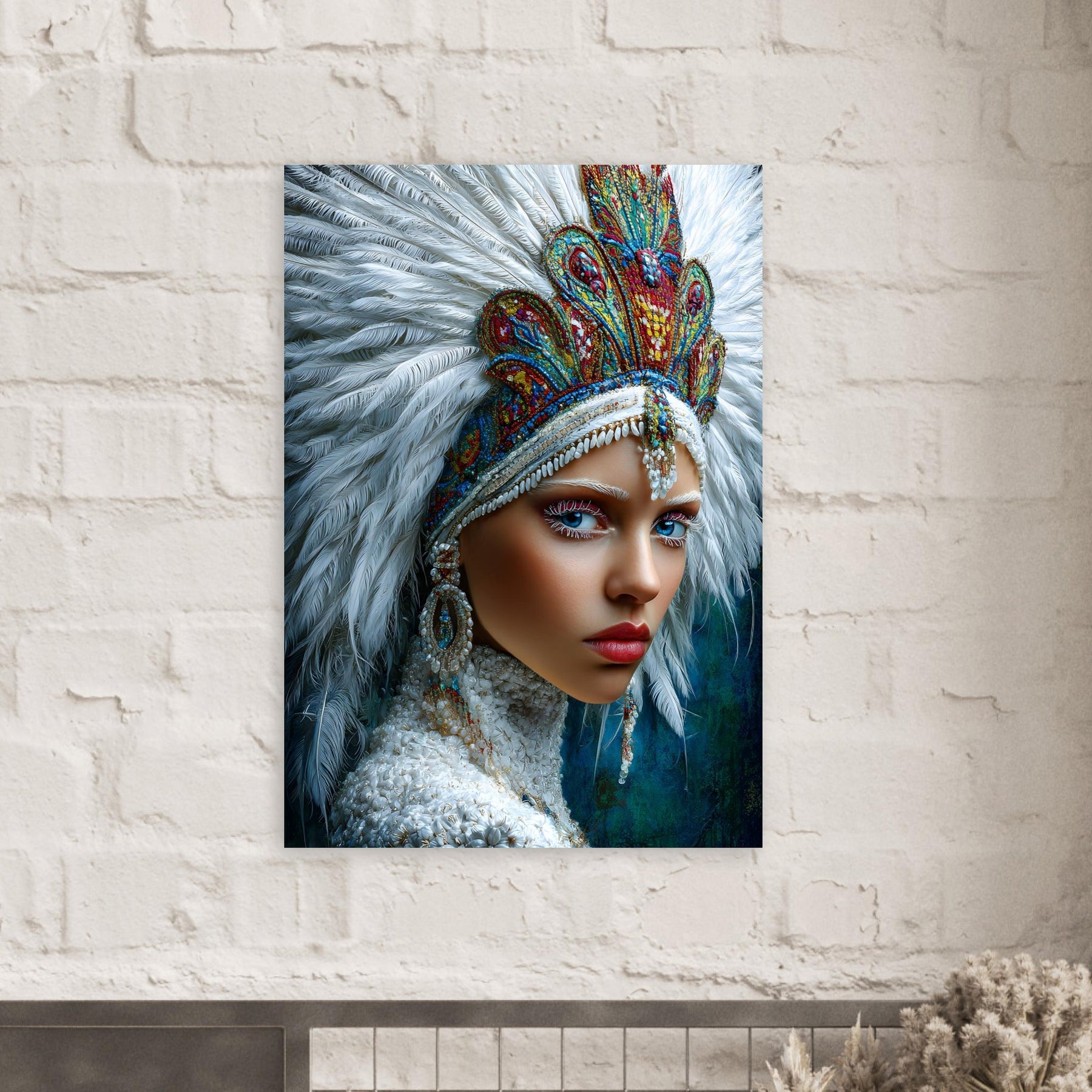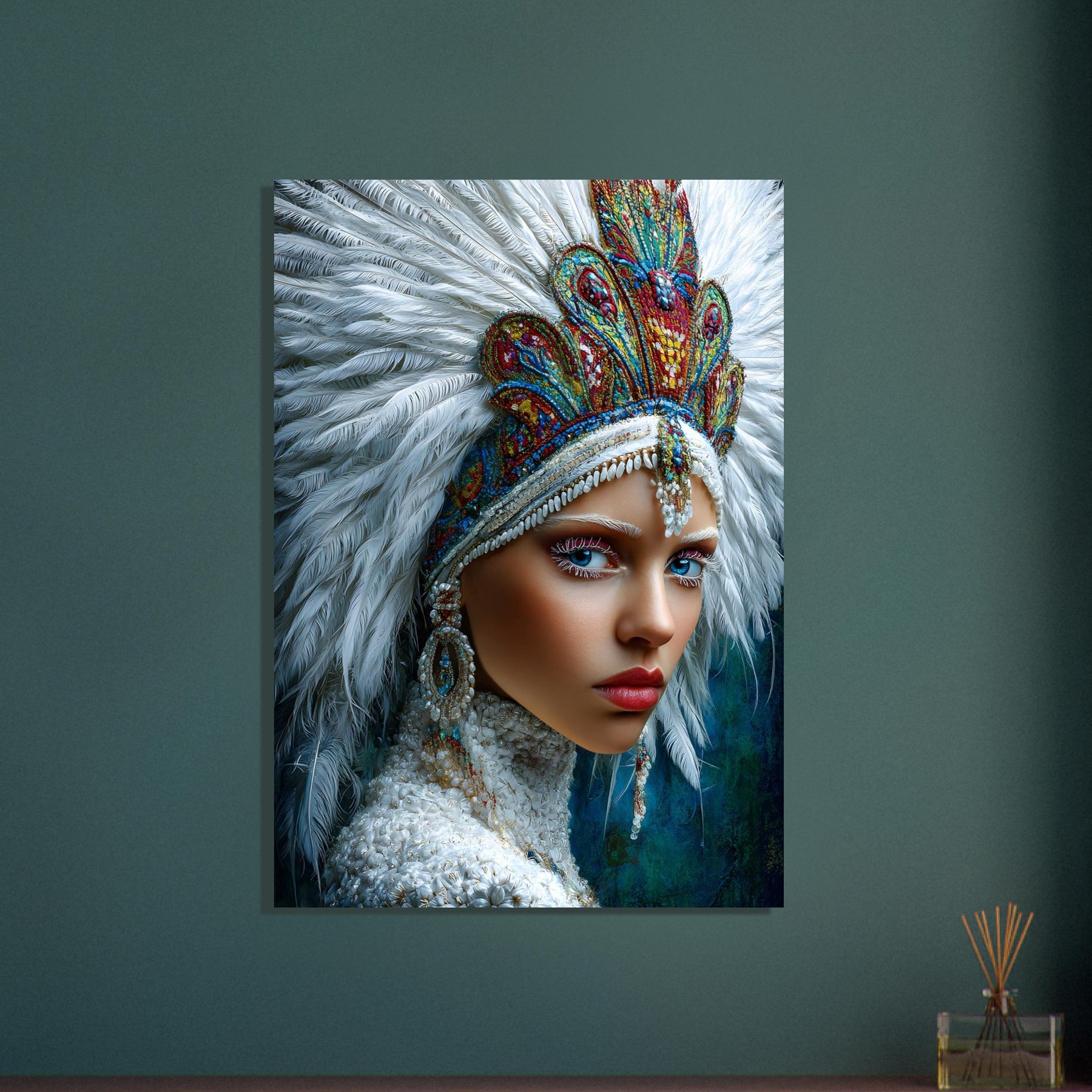 Transform your space with Feathered Majesty, a striking aluminum wall art piece that celebrates beauty, culture, and artistic expression. This captivating portrait features a model adorned with an elaborate feather headdress, intricately designed with rich textures and vibrant colors that command attention and spark inspiration.