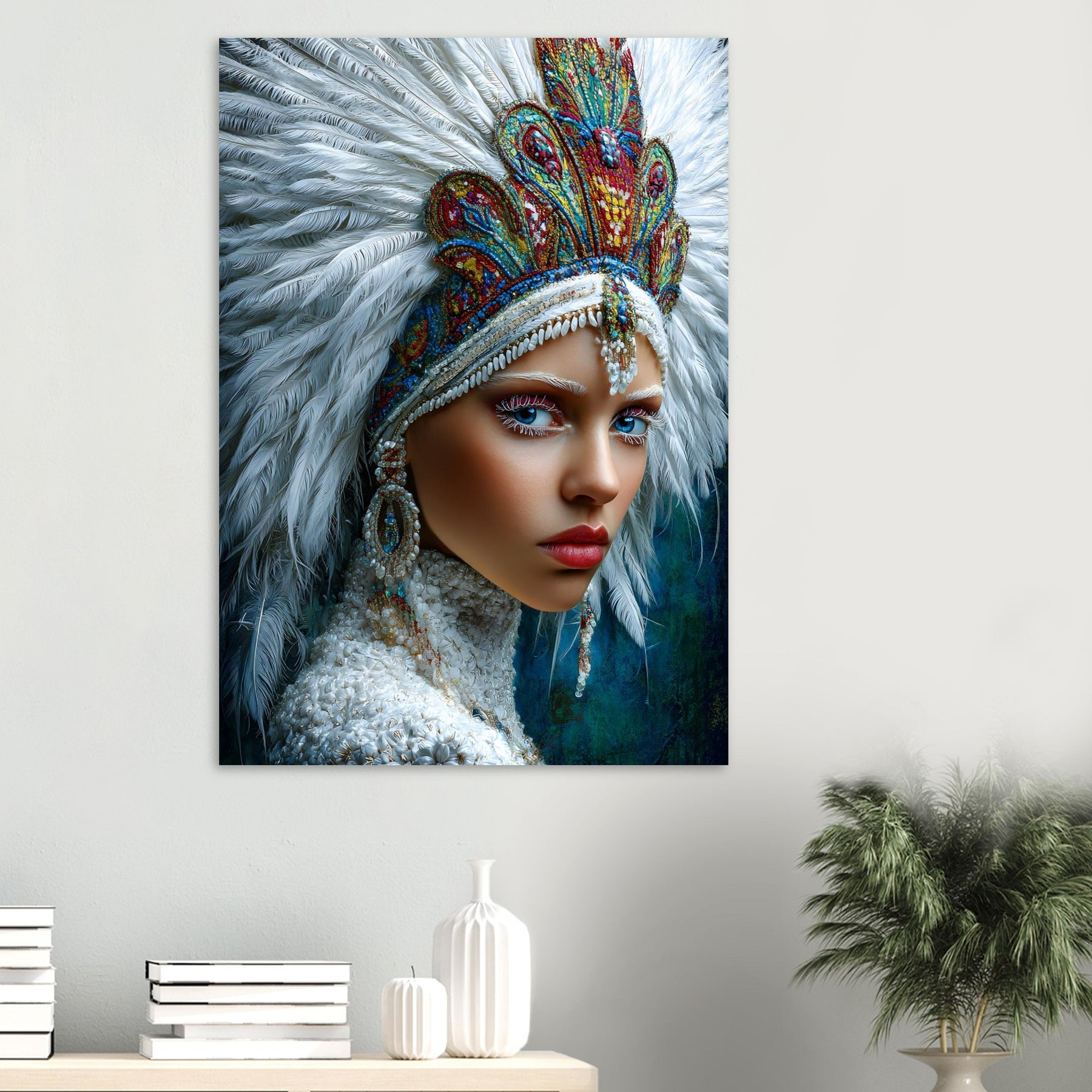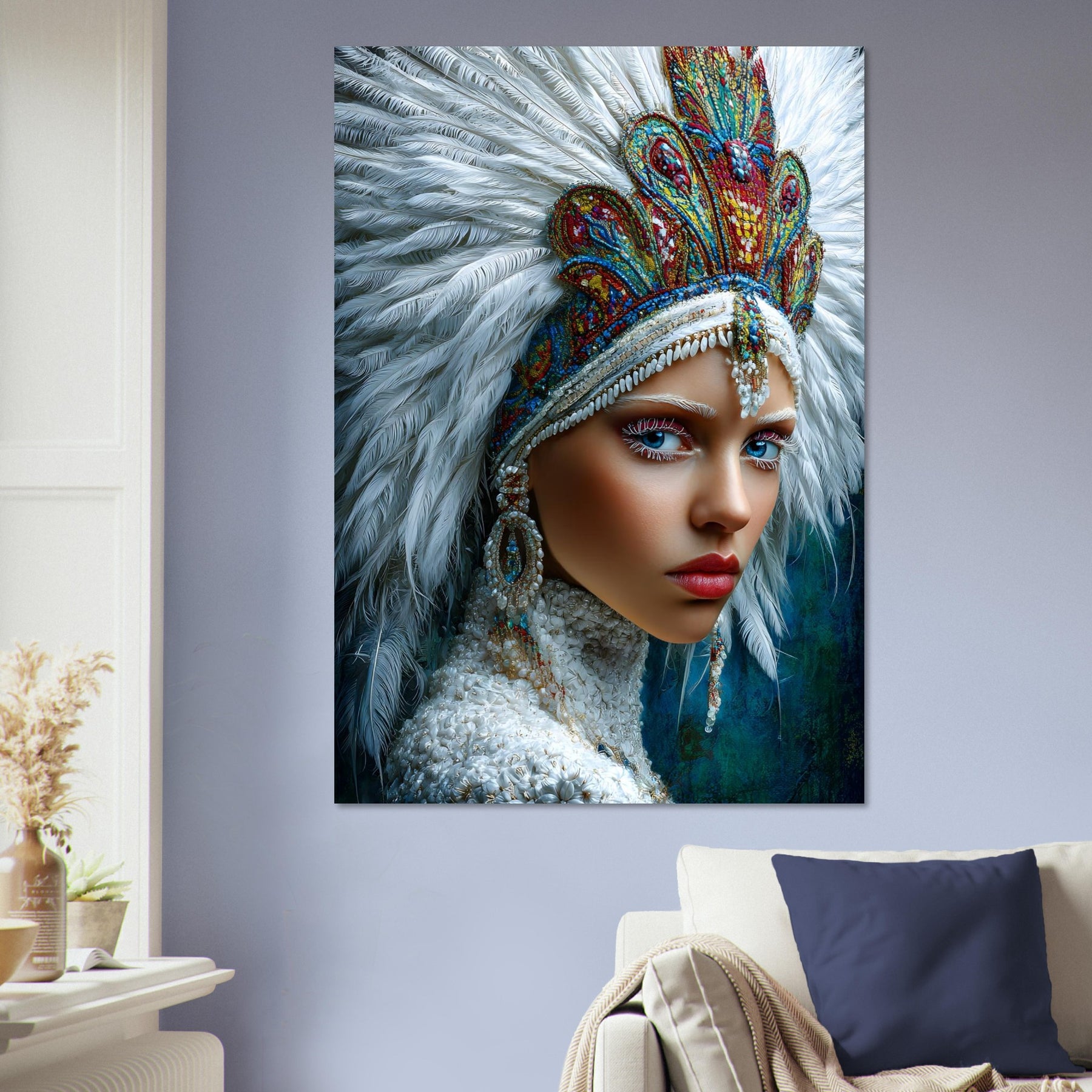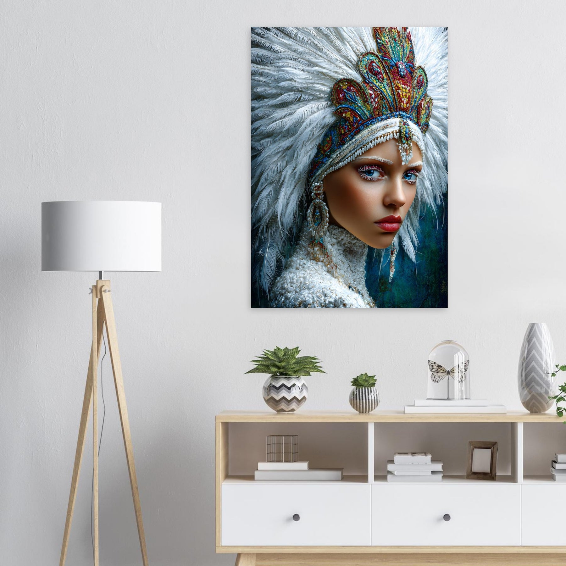 Transform your space with Feathered Majesty, a striking aluminum wall art piece that celebrates beauty, culture, and artistic expression. This captivating portrait features a model adorned with an elaborate feather headdress, intricately designed with rich textures and vibrant colors that command attention and spark inspiration.
