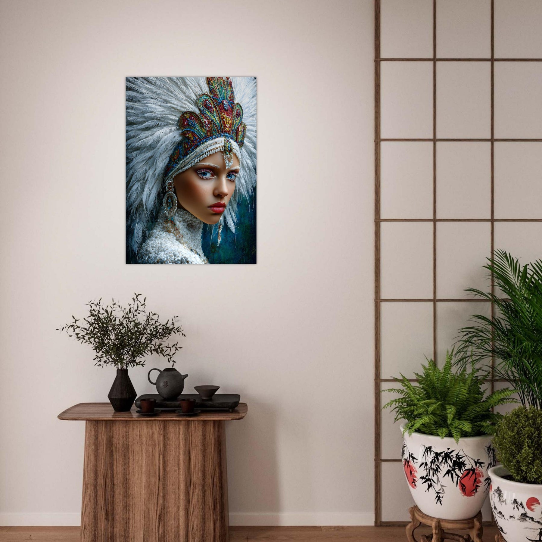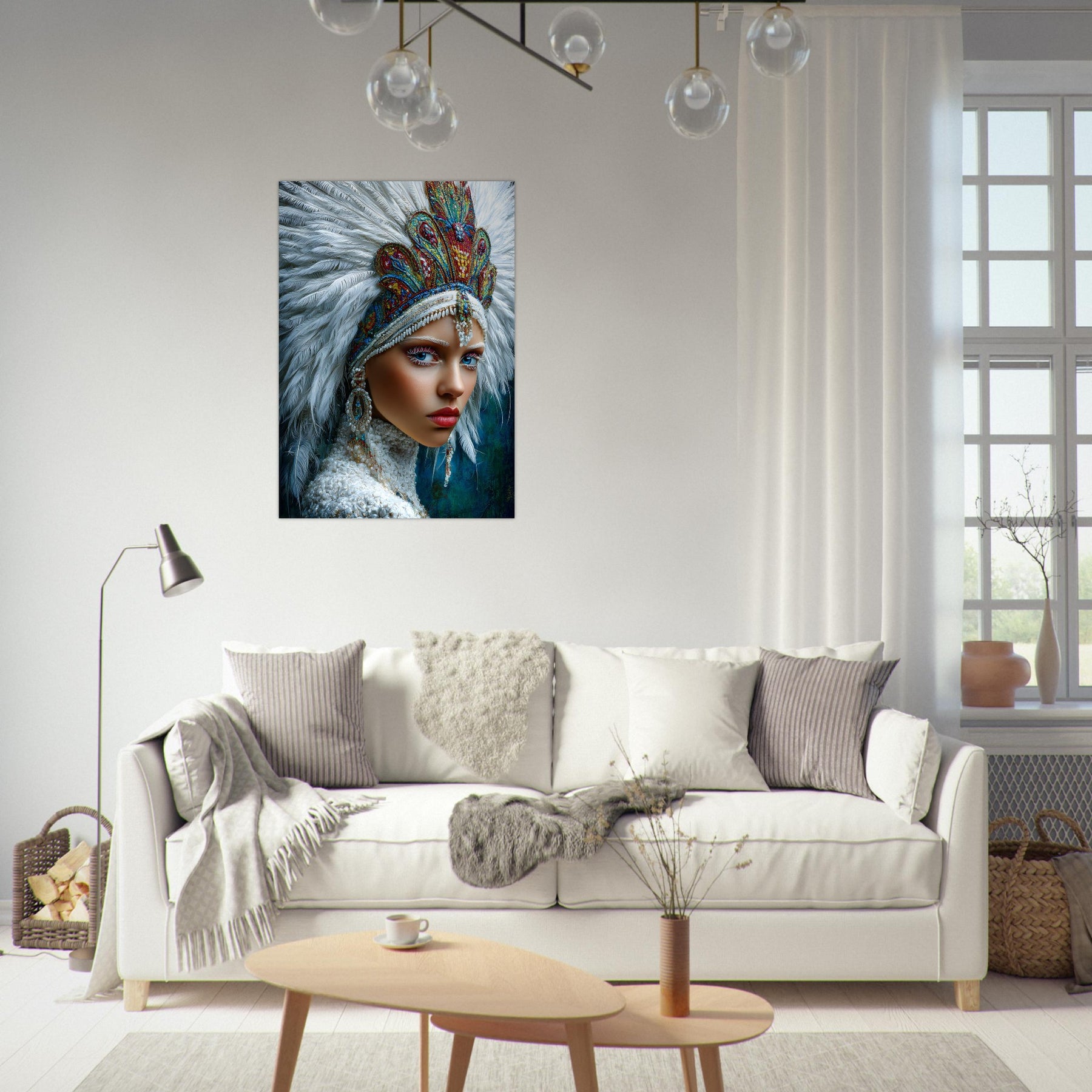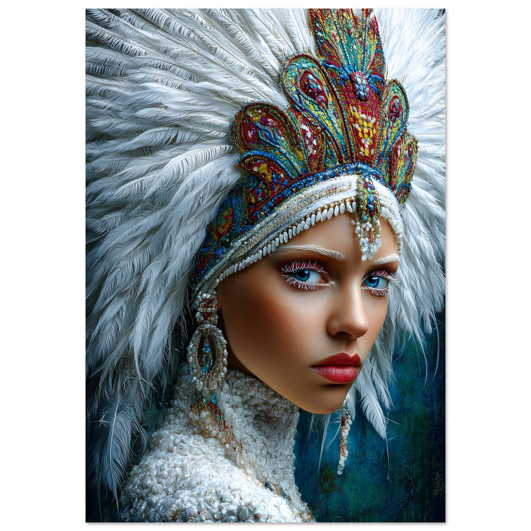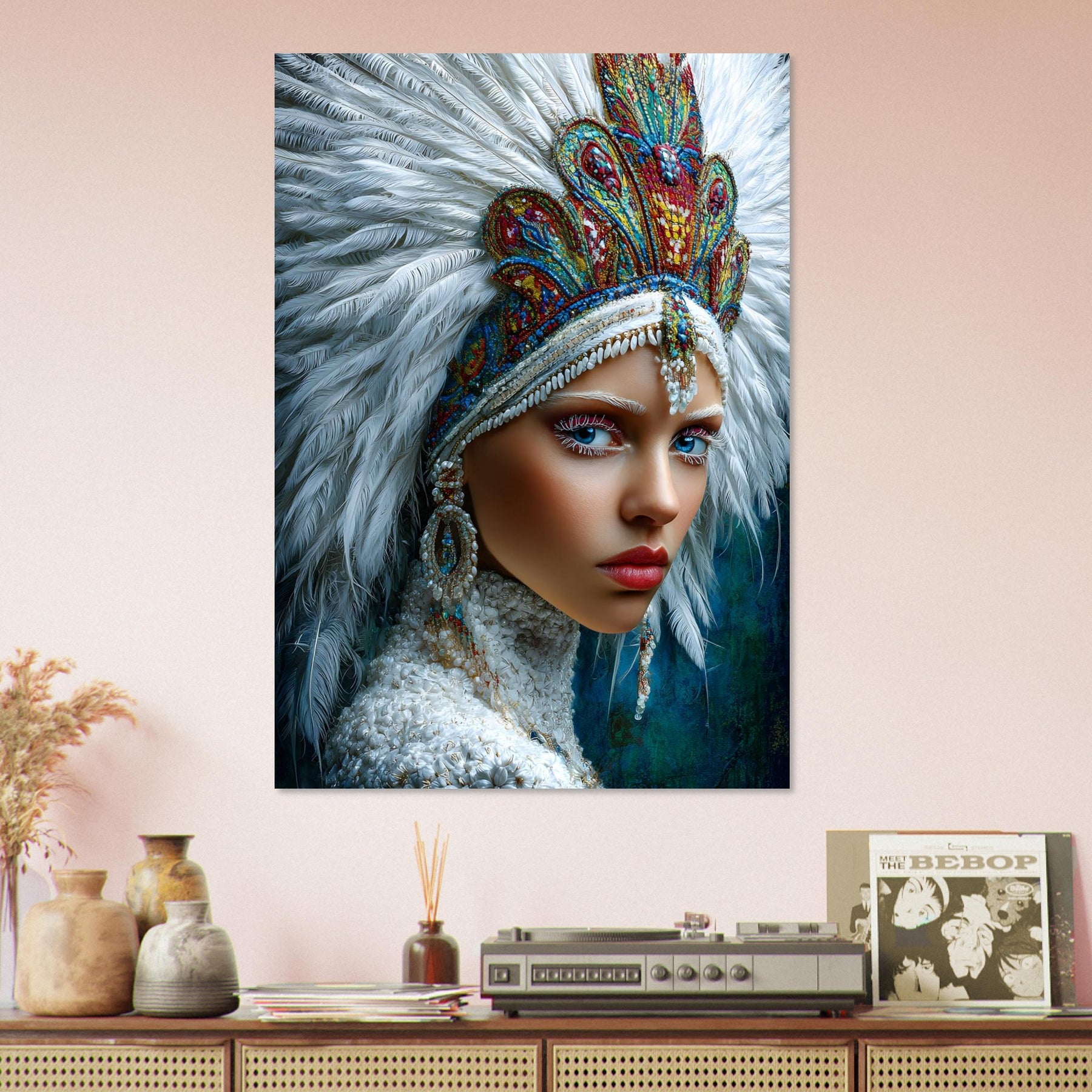 Transform your space with Feathered Majesty, a striking aluminum wall art piece that celebrates beauty, culture, and artistic expression. This captivating portrait features a model adorned with an elaborate feather headdress, intricately designed with rich textures and vibrant colors that command attention and spark inspiration.