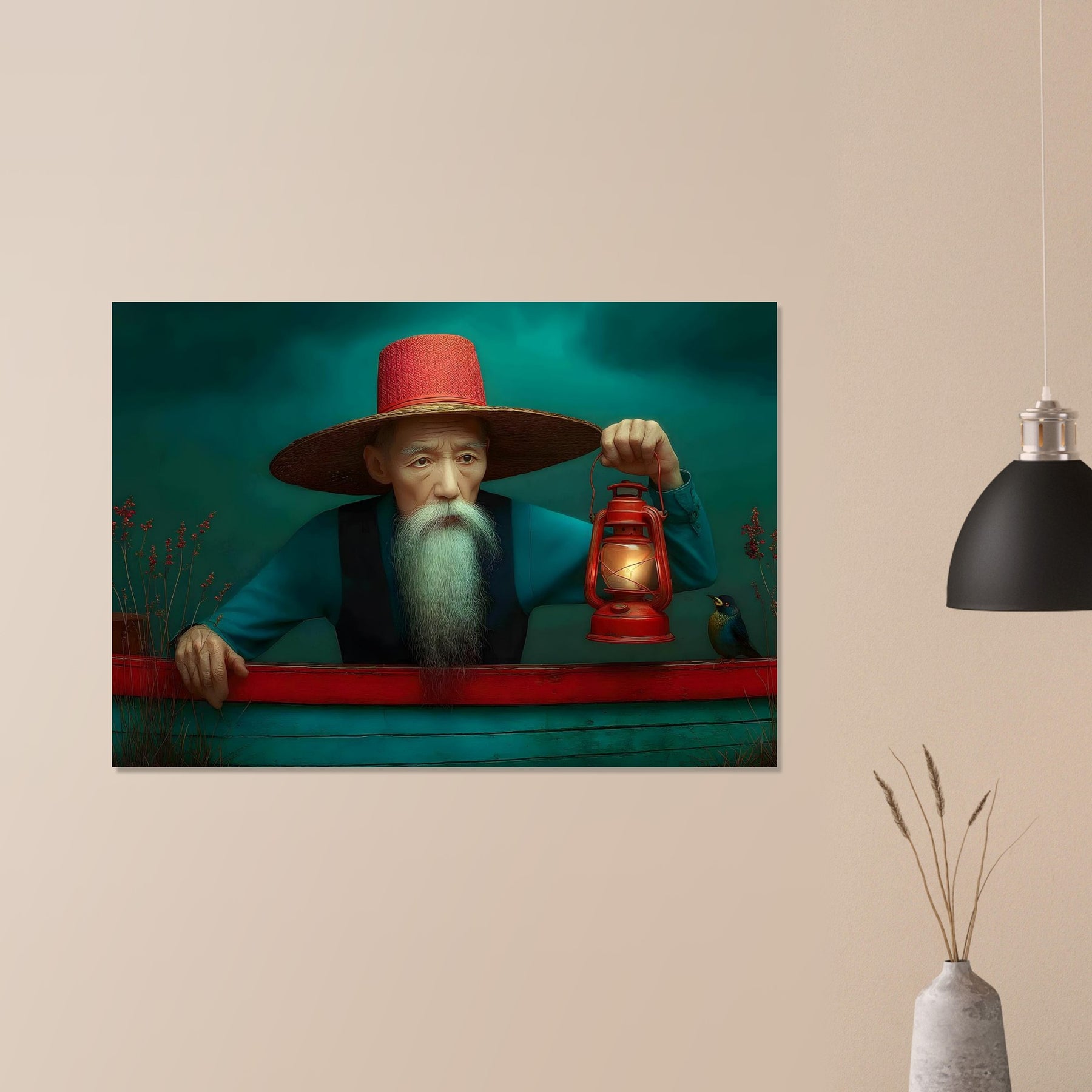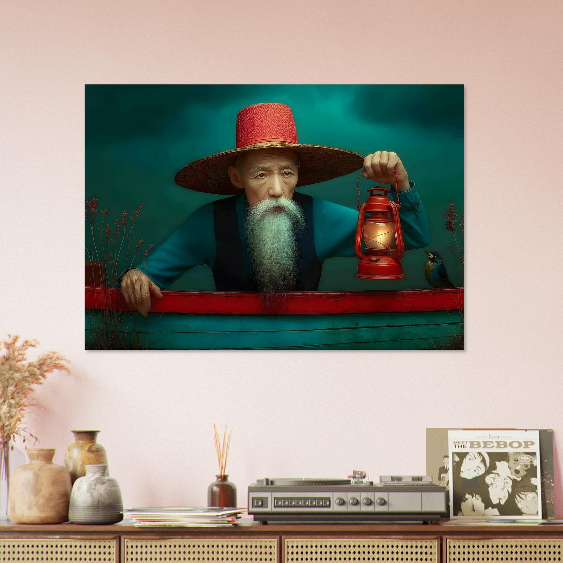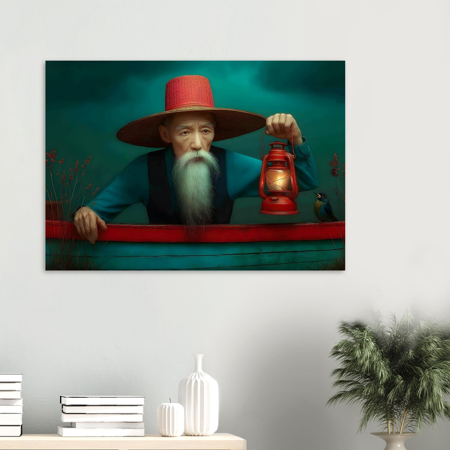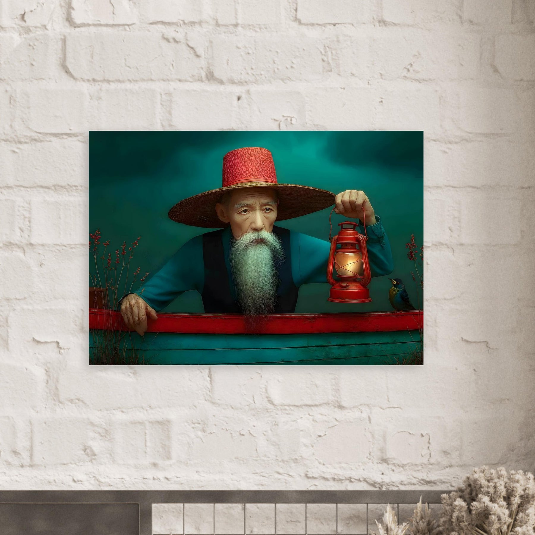 Transform your space with the Mystic Light Aluminum Wall Art, a striking piece that captures both drama and mystery. The artwork depicts an elderly man with a long beard holding a lantern, peering from the edge of a colorful boat. Set against a dark backdrop, the glowing lantern and vibrant details create an enchanting contrast that evokes wisdom, storytelling, and a mystical atmosphere.