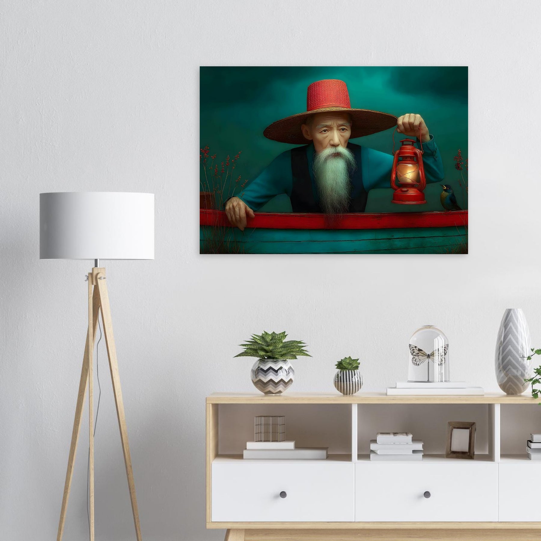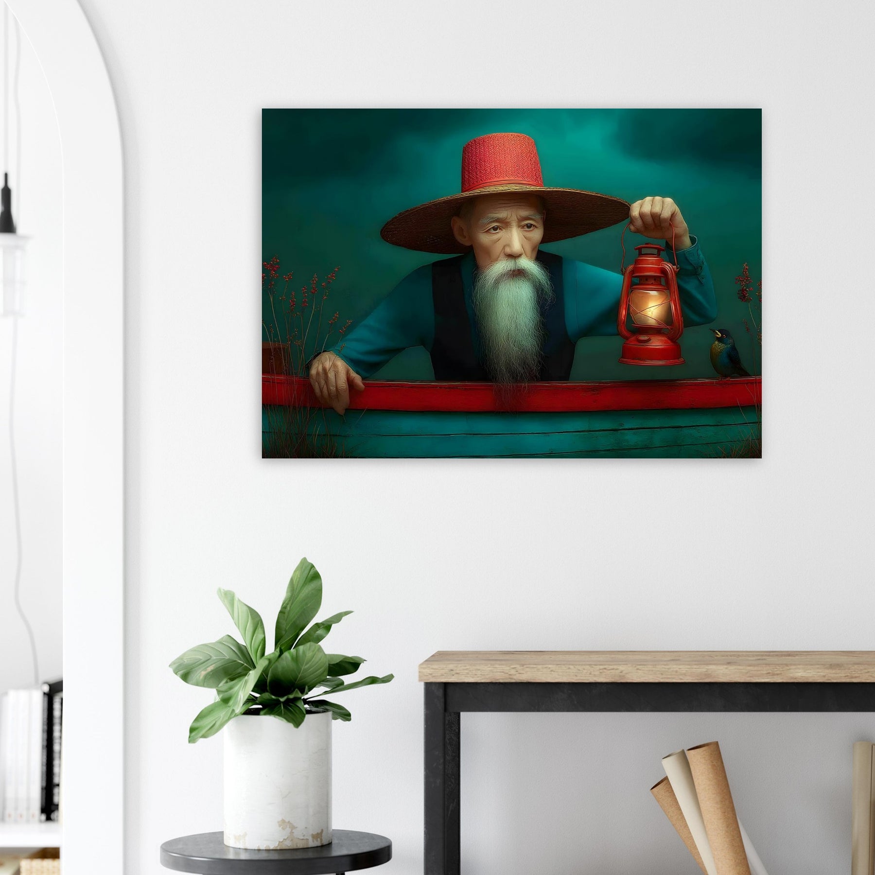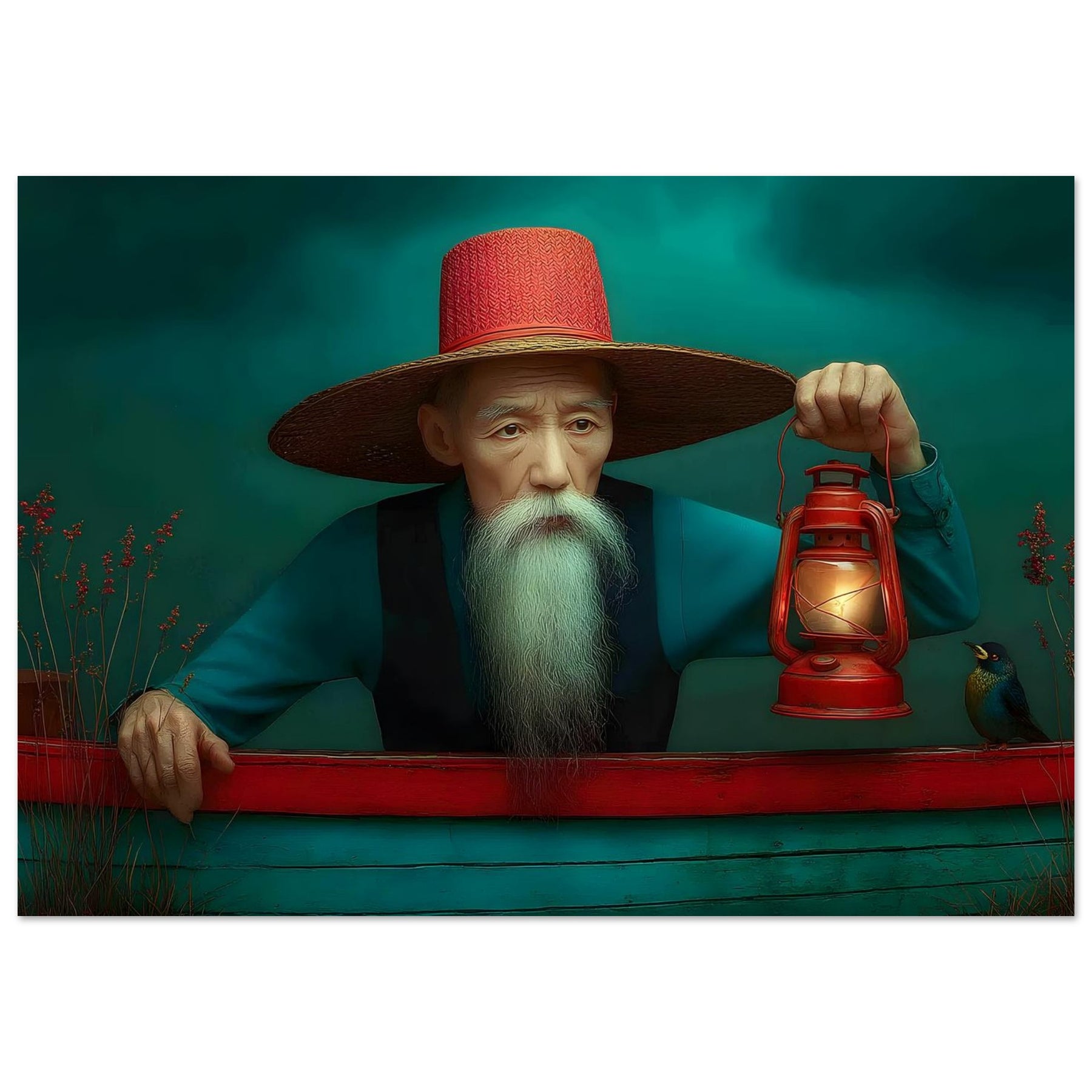 Transform your space with the Mystic Light Aluminum Wall Art, a striking piece that captures both drama and mystery. The artwork depicts an elderly man with a long beard holding a lantern, peering from the edge of a colorful boat. Set against a dark backdrop, the glowing lantern and vibrant details create an enchanting contrast that evokes wisdom, storytelling, and a mystical atmosphere.