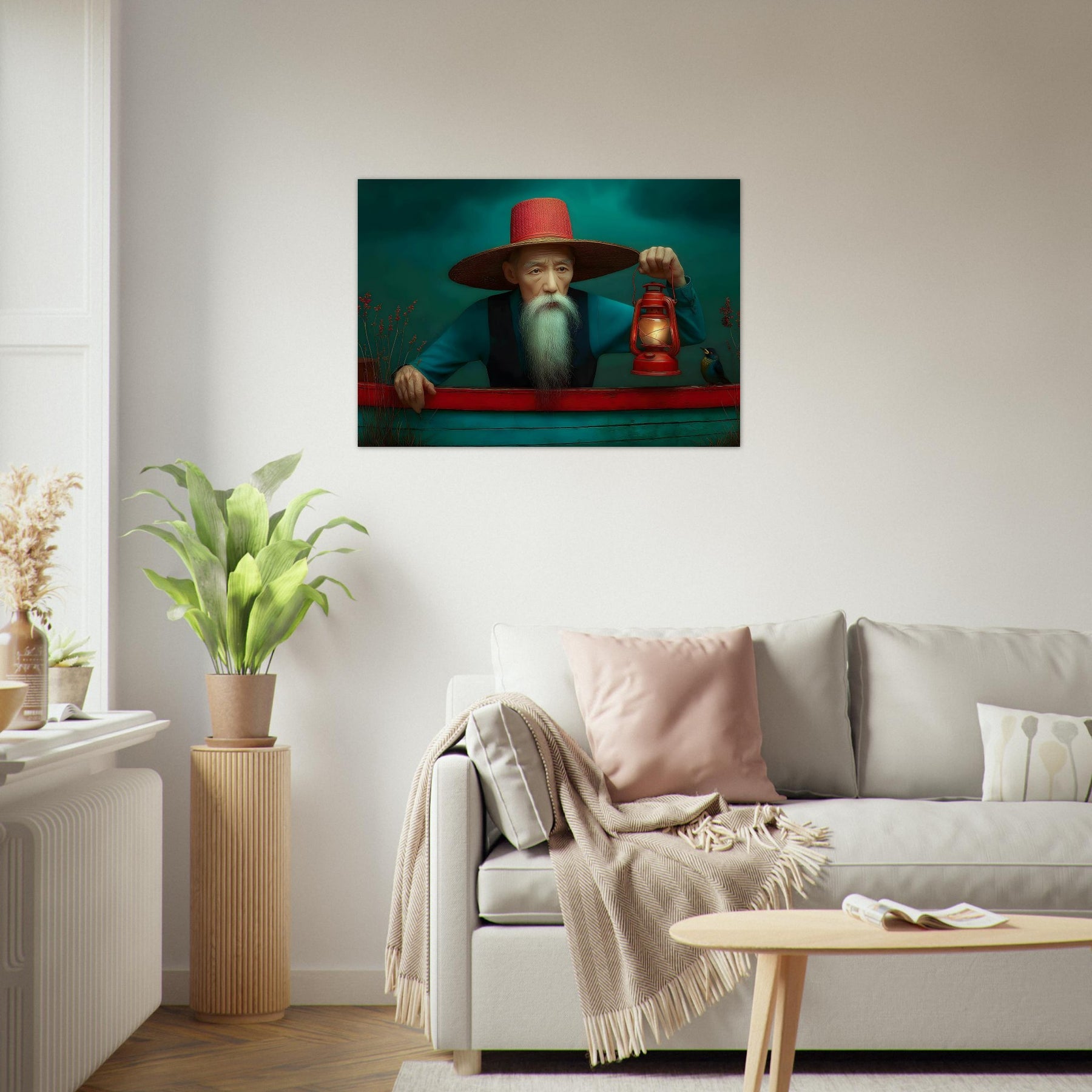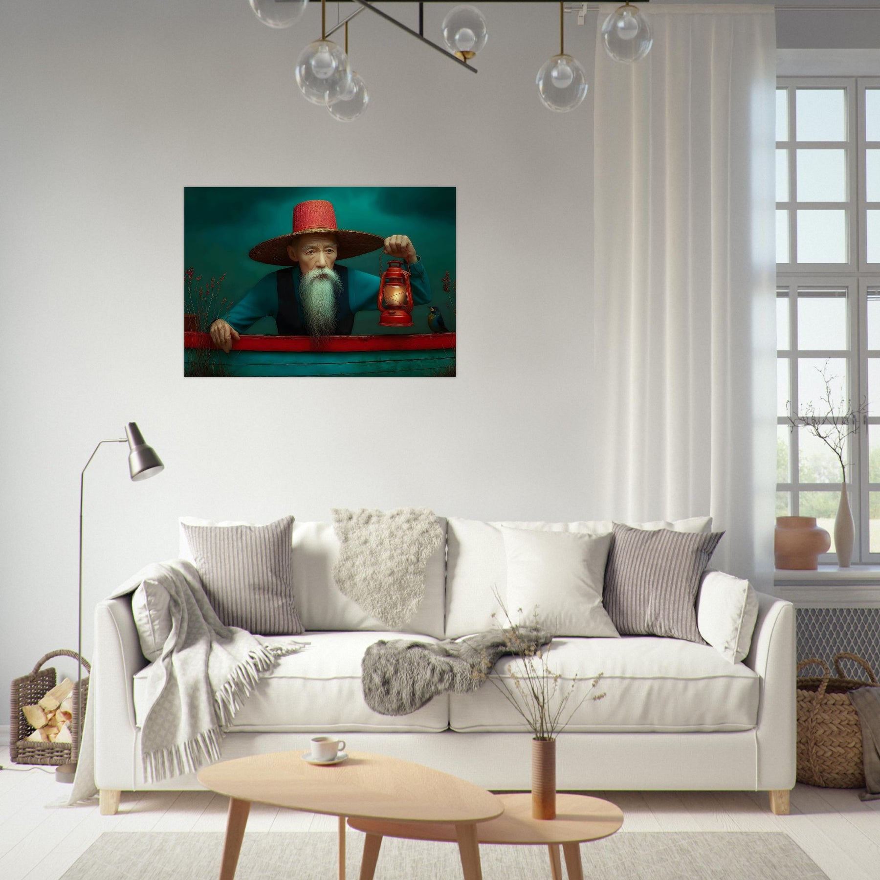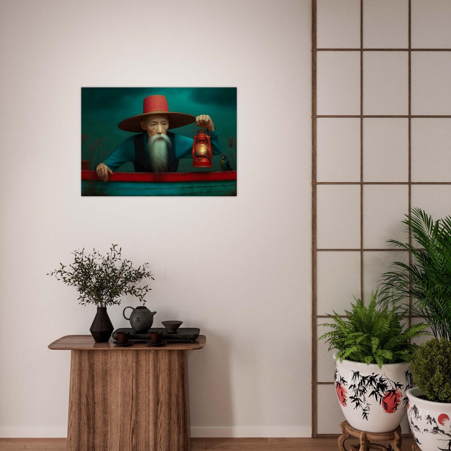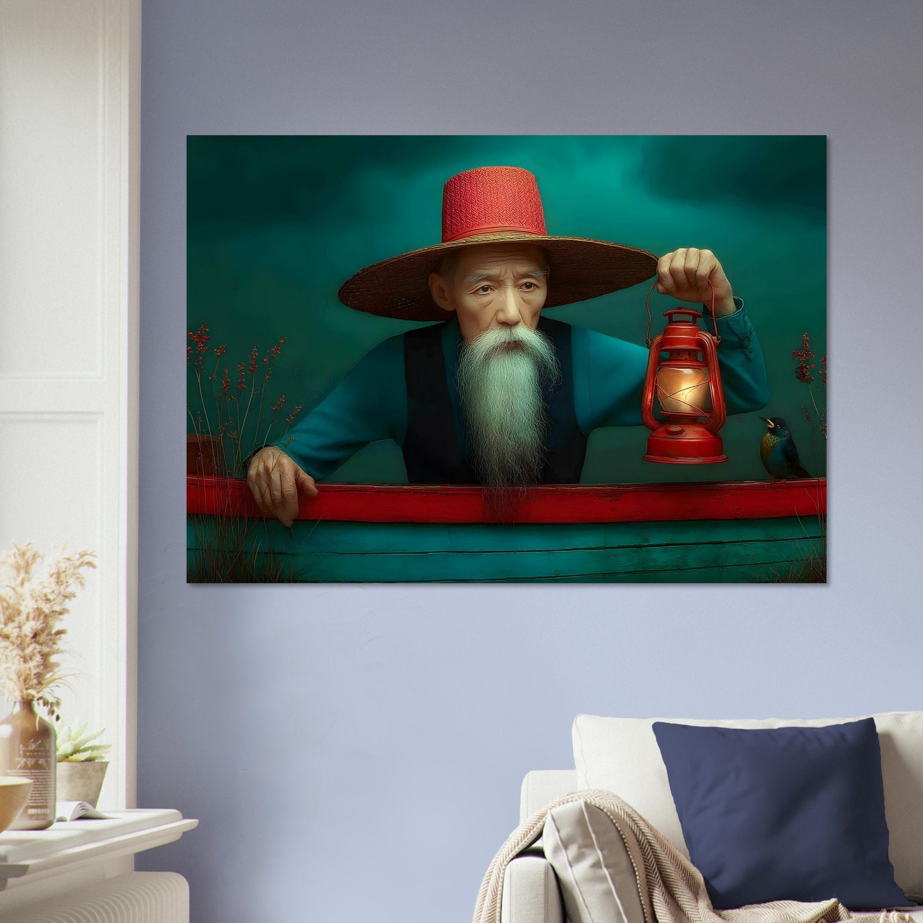 Transform your space with the Mystic Light Aluminum Wall Art, a striking piece that captures both drama and mystery. The artwork depicts an elderly man with a long beard holding a lantern, peering from the edge of a colorful boat. Set against a dark backdrop, the glowing lantern and vibrant details create an enchanting contrast that evokes wisdom, storytelling, and a mystical atmosphere.