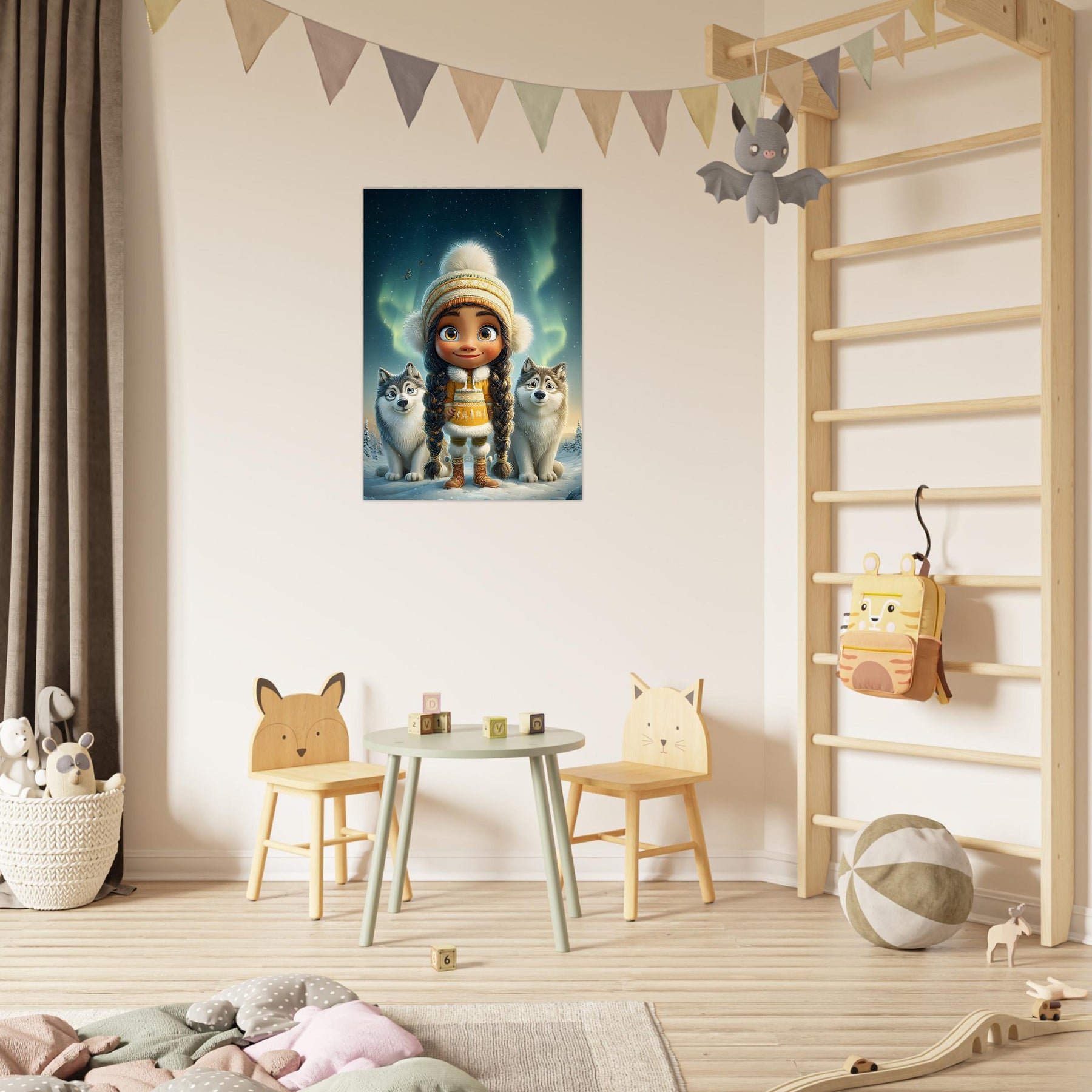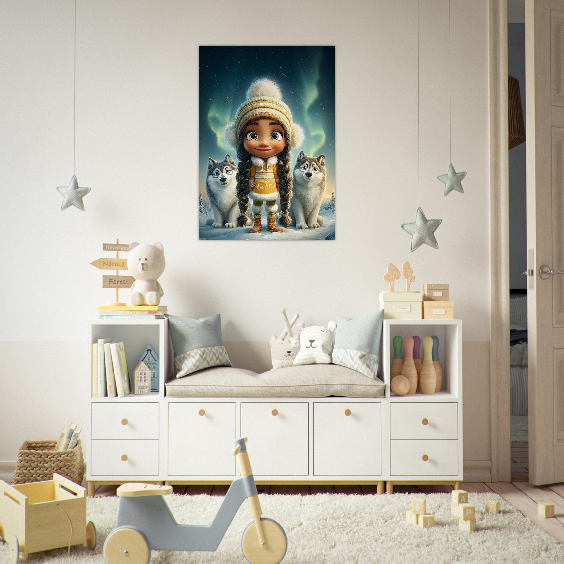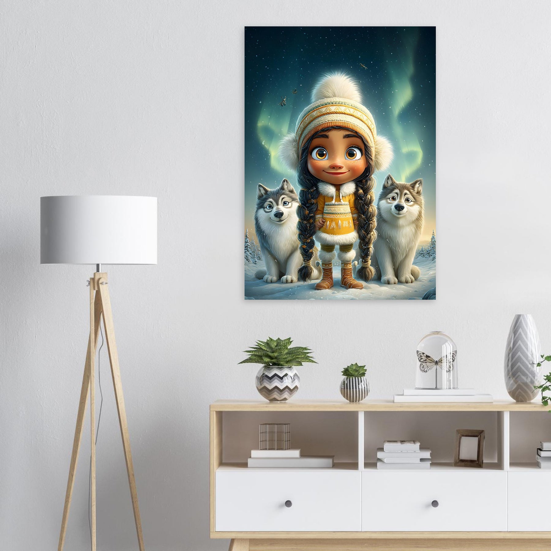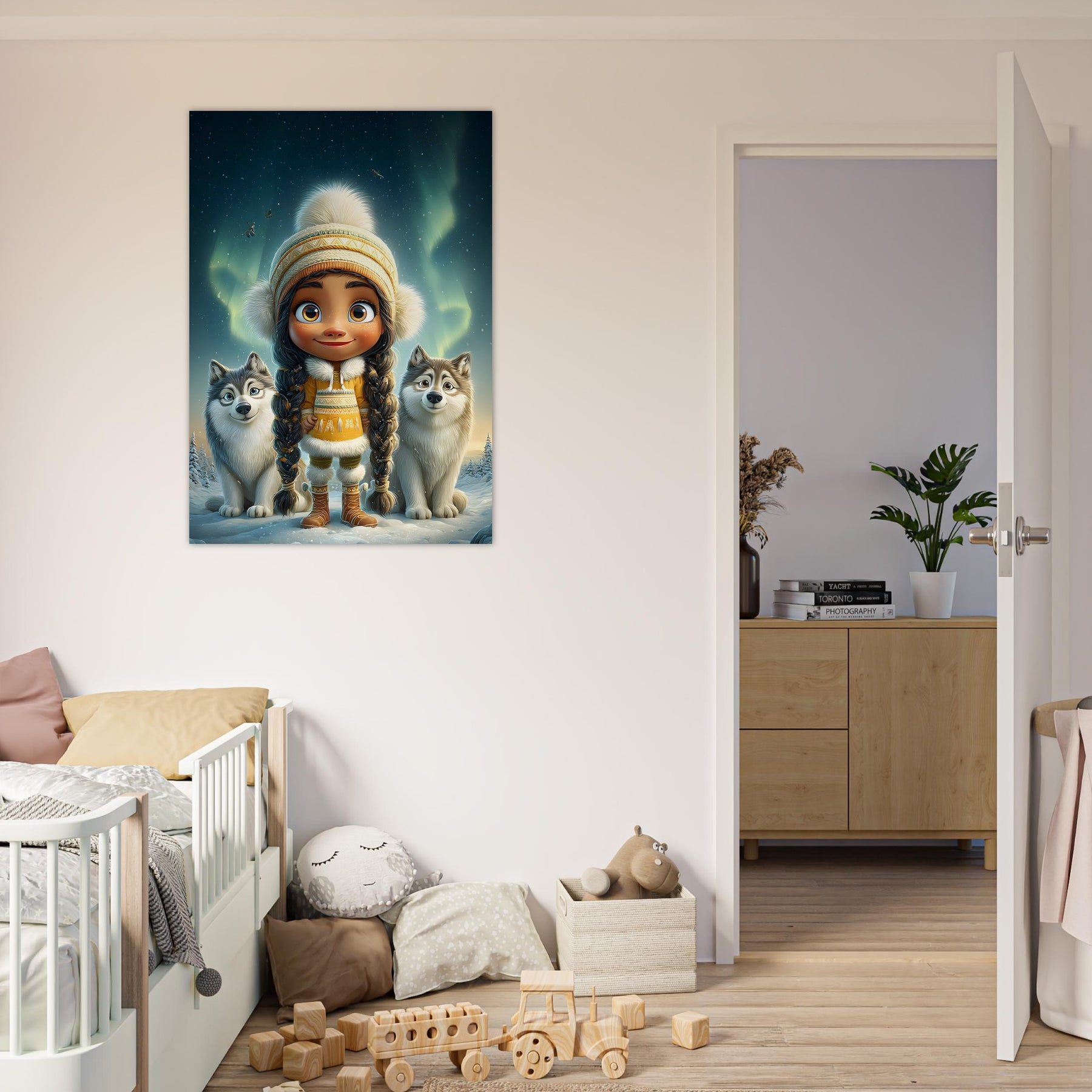 Transform your child’s space with Aurora Guardians, a mesmerizing aluminum wall art piece that blends magic, nature, and wonder. This enchanting illustration features a whimsical young girl standing confidently beside two gentle wolves, all illuminated by the breathtaking glow of the Northern Lights dancing across a snowy landscape.