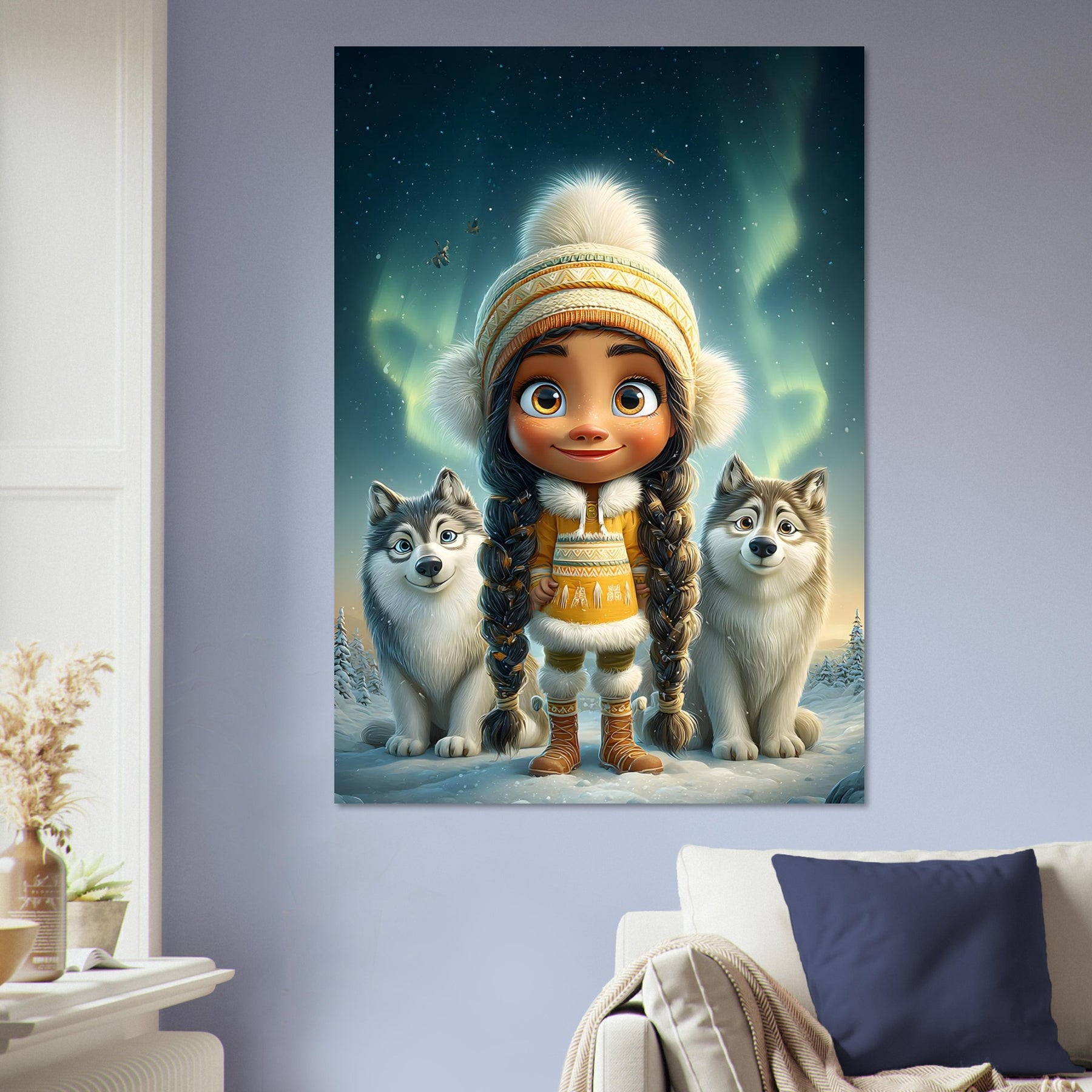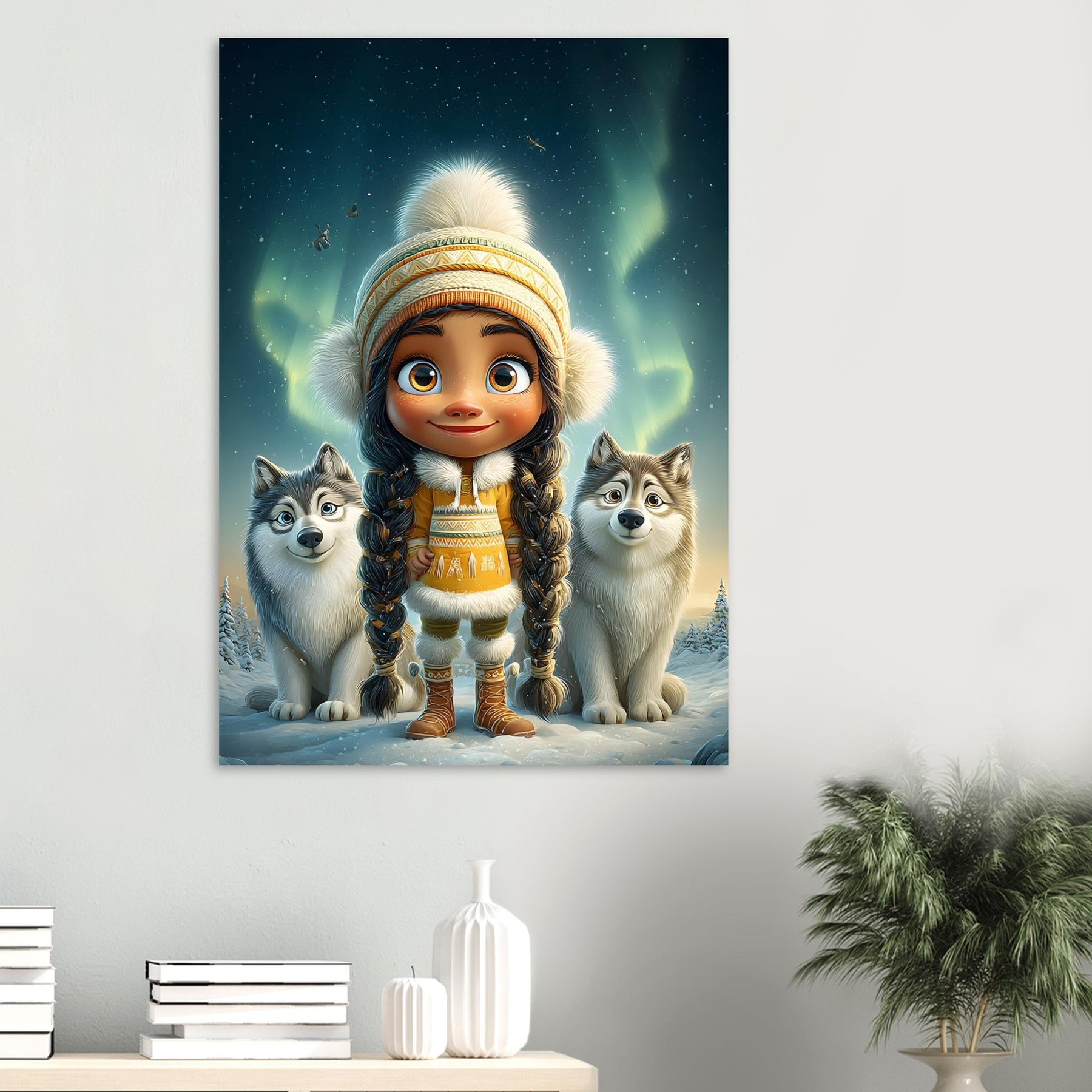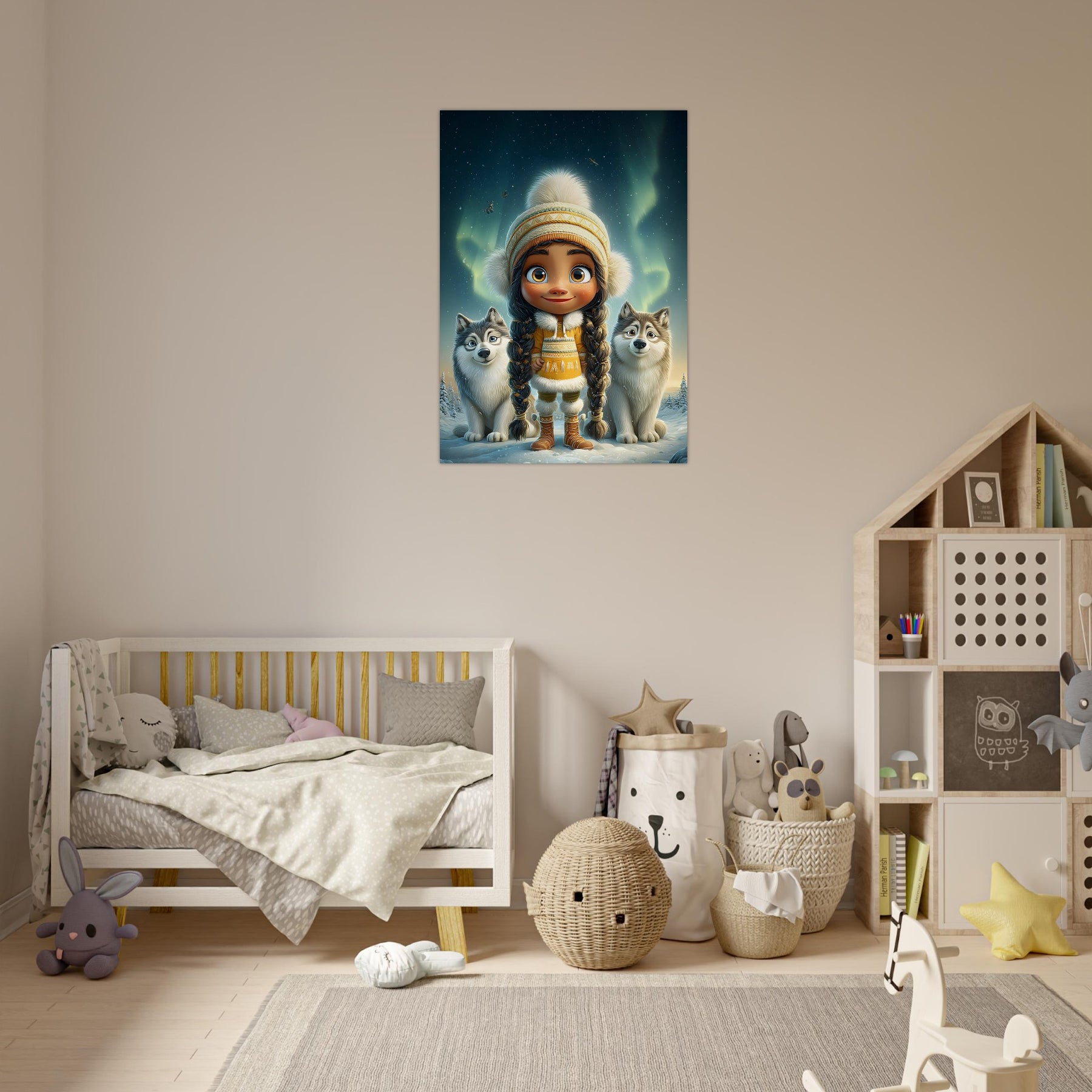 Transform your child’s space with Aurora Guardians, a mesmerizing aluminum wall art piece that blends magic, nature, and wonder. This enchanting illustration features a whimsical young girl standing confidently beside two gentle wolves, all illuminated by the breathtaking glow of the Northern Lights dancing across a snowy landscape.