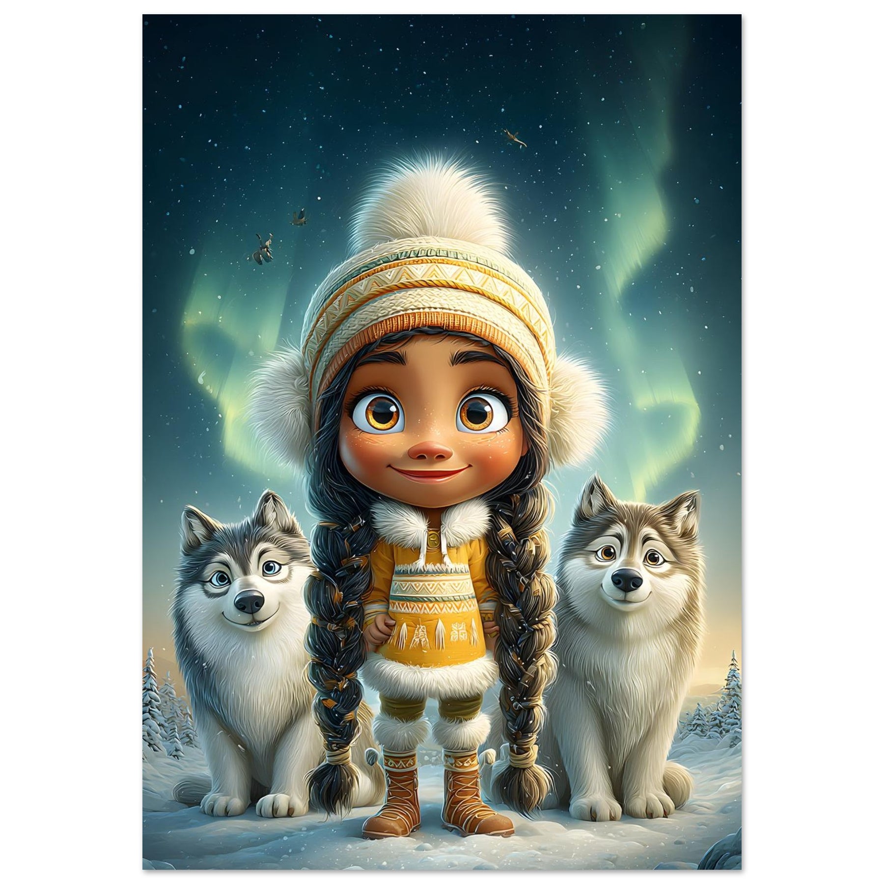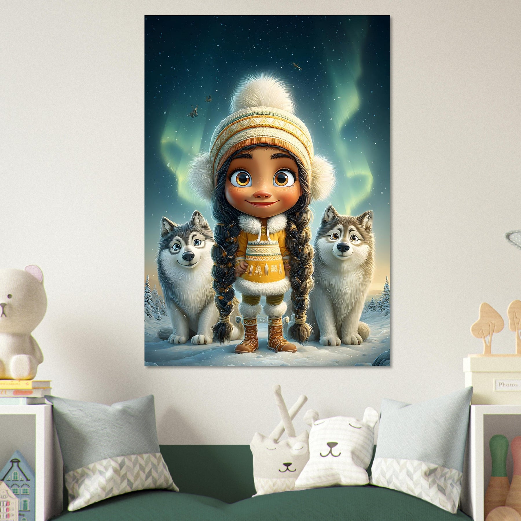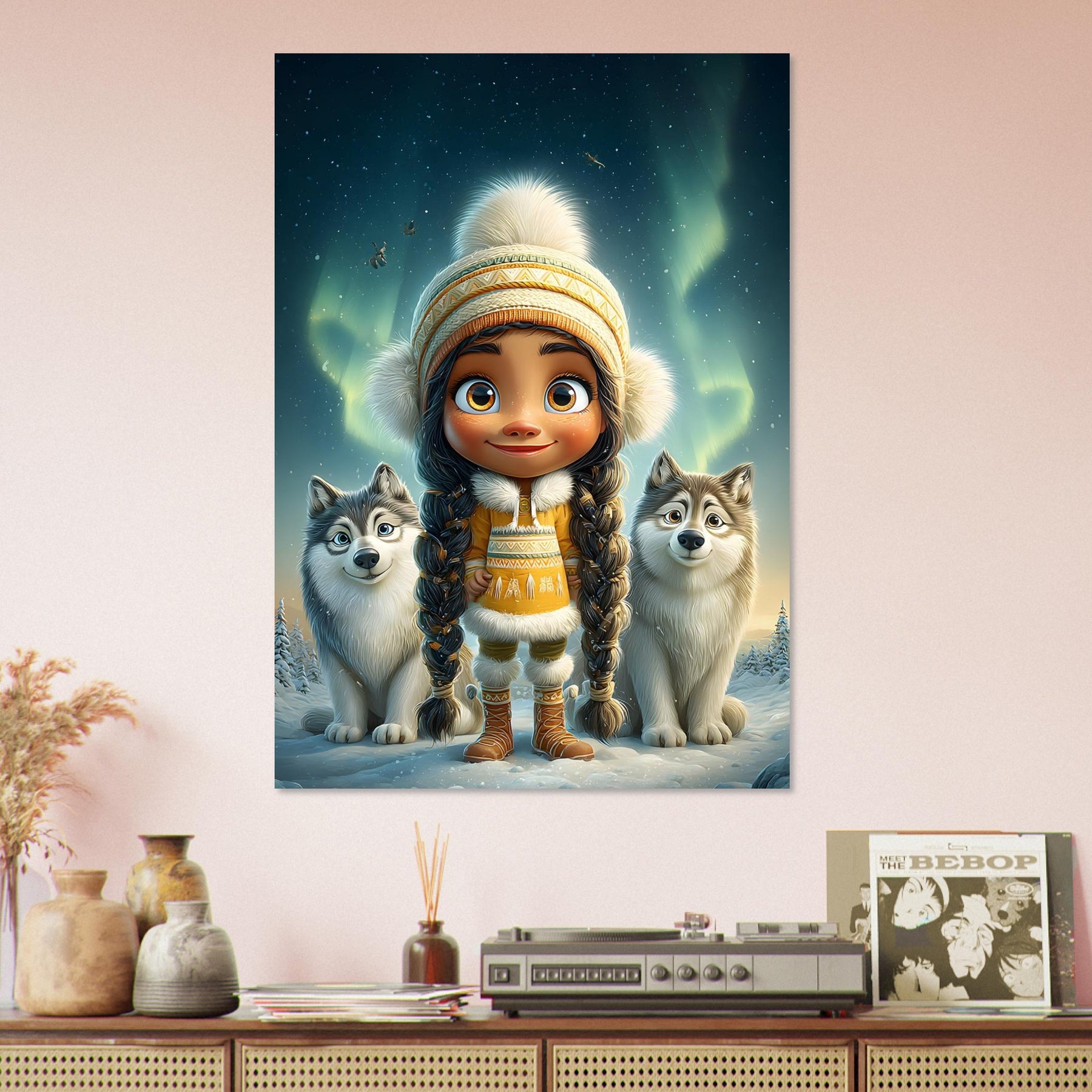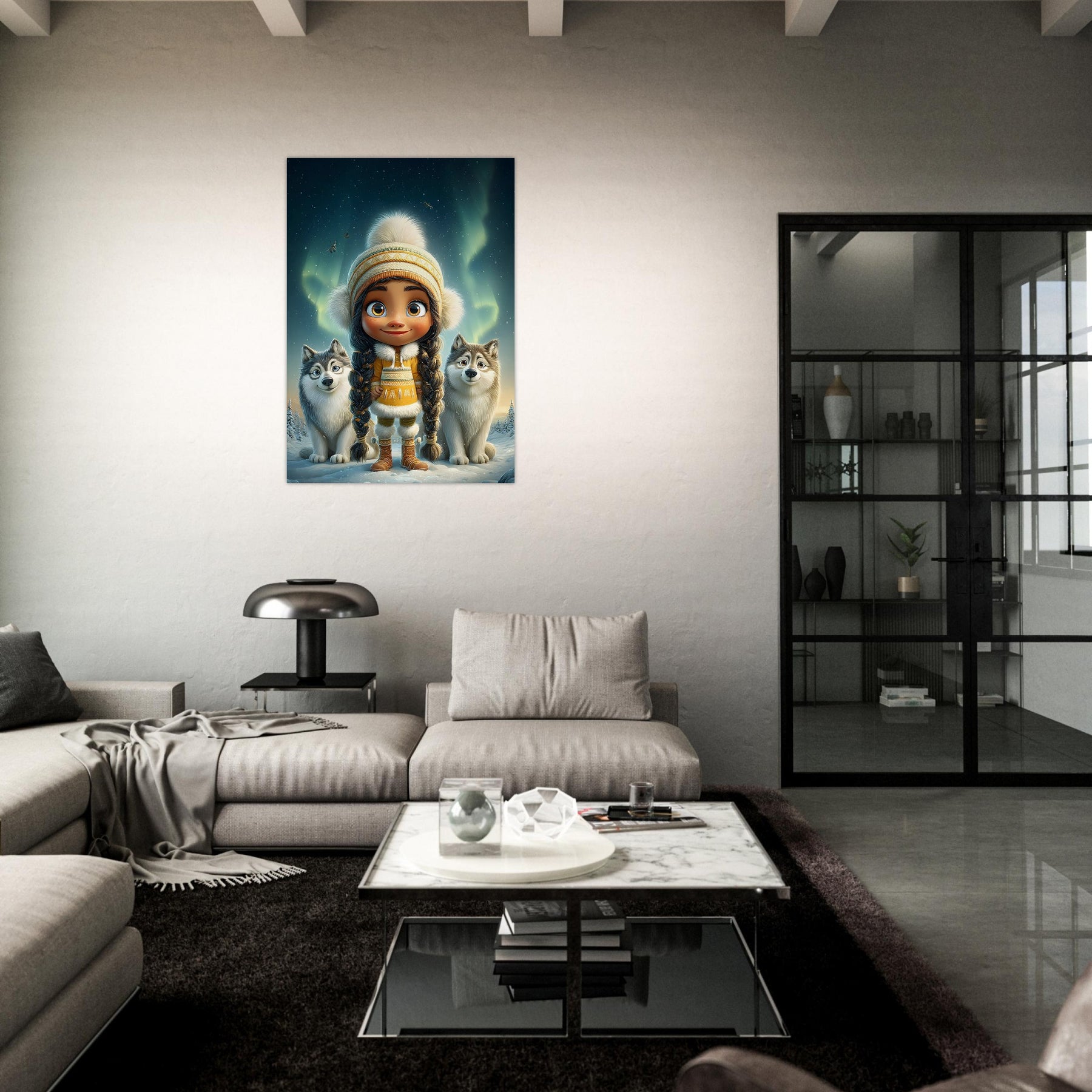 Transform your child’s space with Aurora Guardians, a mesmerizing aluminum wall art piece that blends magic, nature, and wonder. This enchanting illustration features a whimsical young girl standing confidently beside two gentle wolves, all illuminated by the breathtaking glow of the Northern Lights dancing across a snowy landscape.