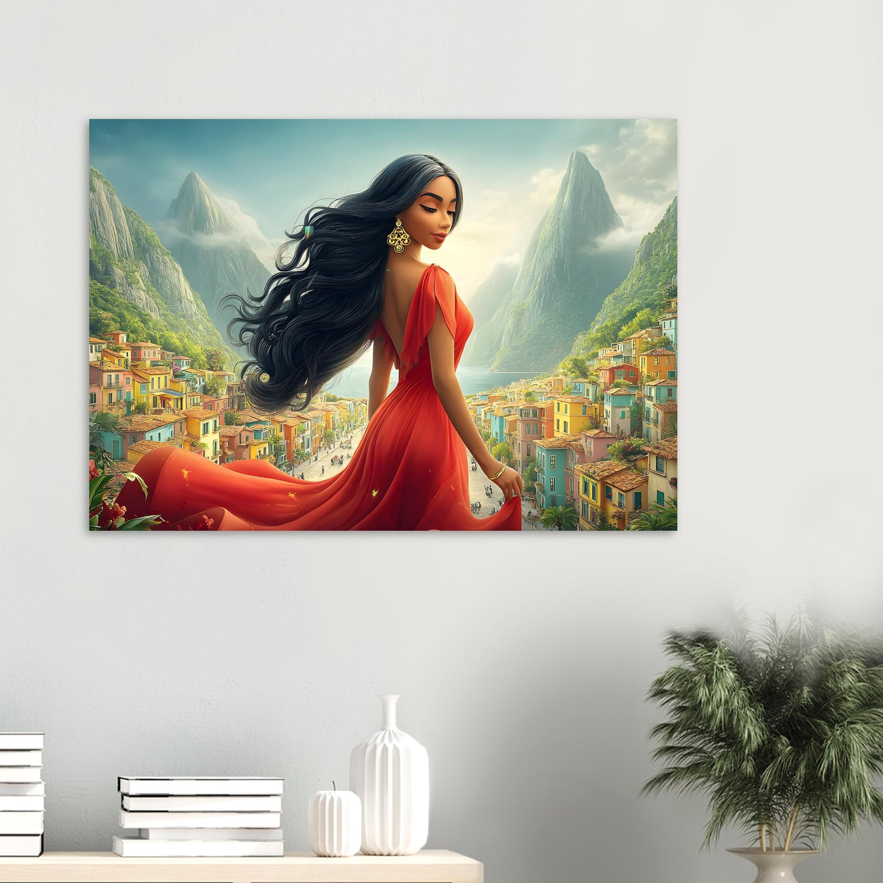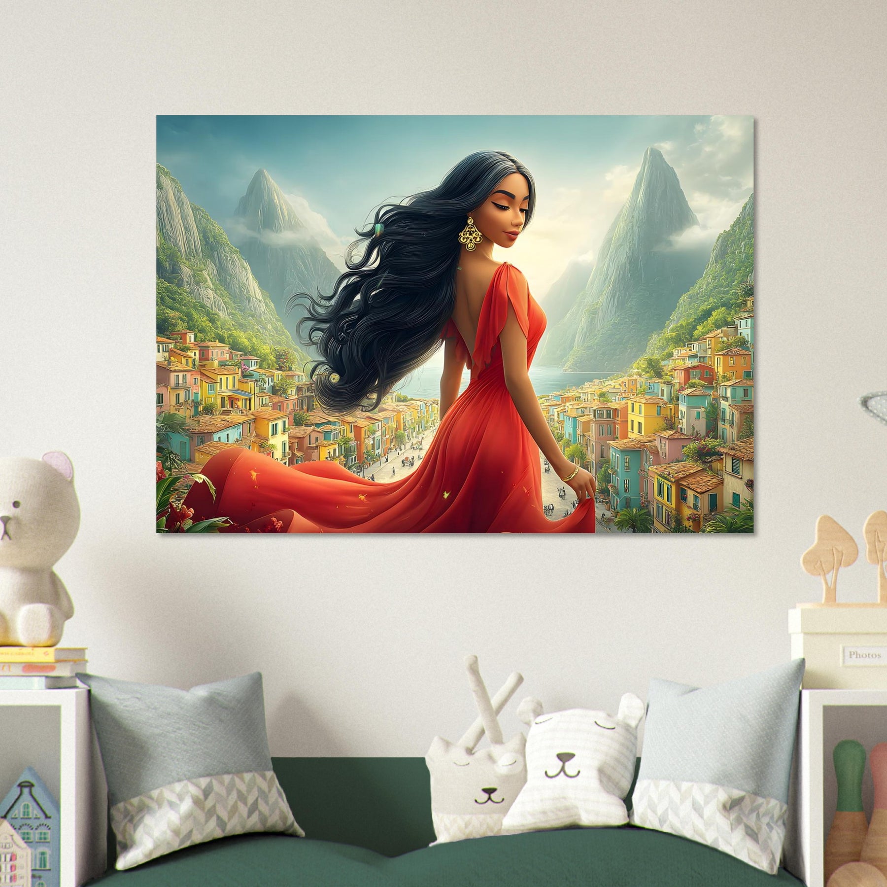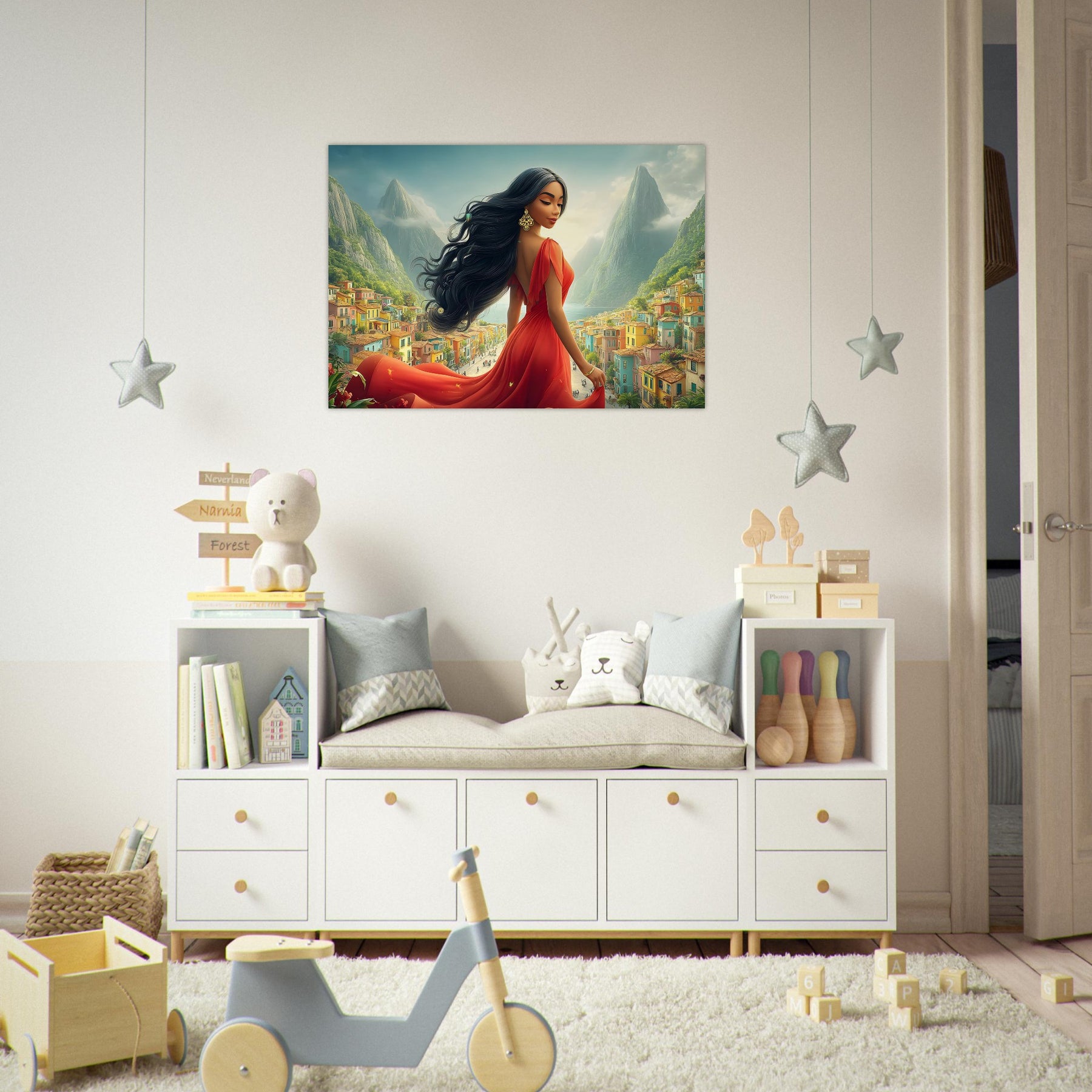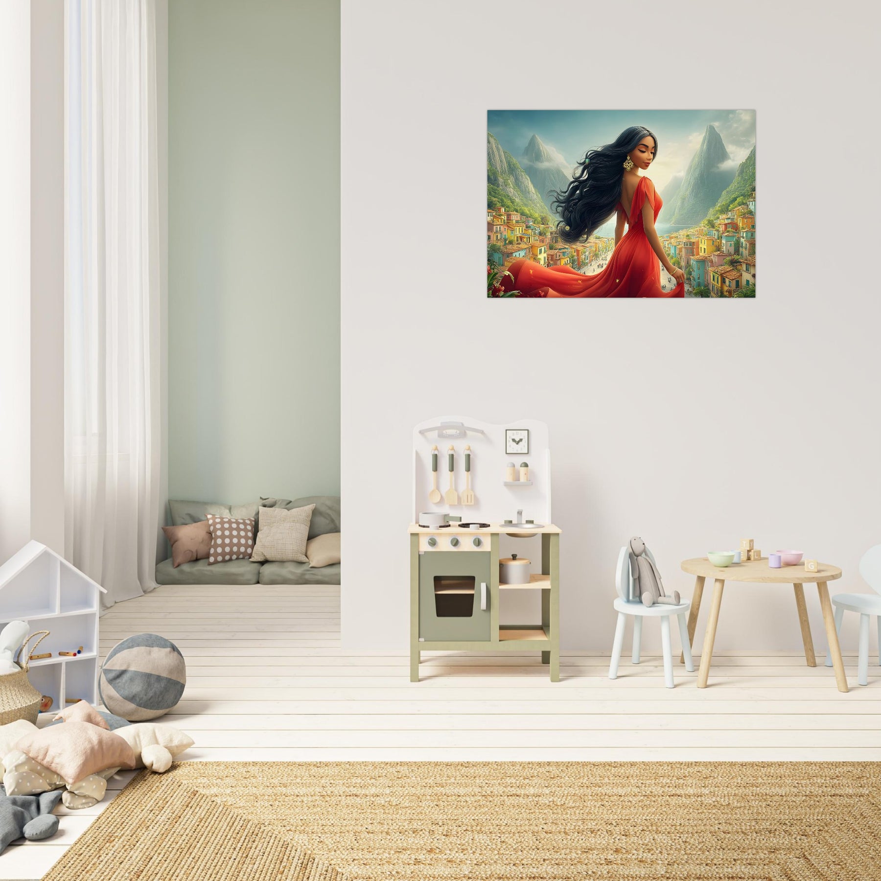 Bring color, elegance, and calm to your child’s room with the Coastal Serenity Aluminum Wall Art. This captivating piece portrays a graceful woman in a flowing red dress standing in a vibrant coastal village, surrounded by majestic mountains and serene blue waters. The composition radiates peace, beauty, and harmony — capturing the soothing essence of seaside life.