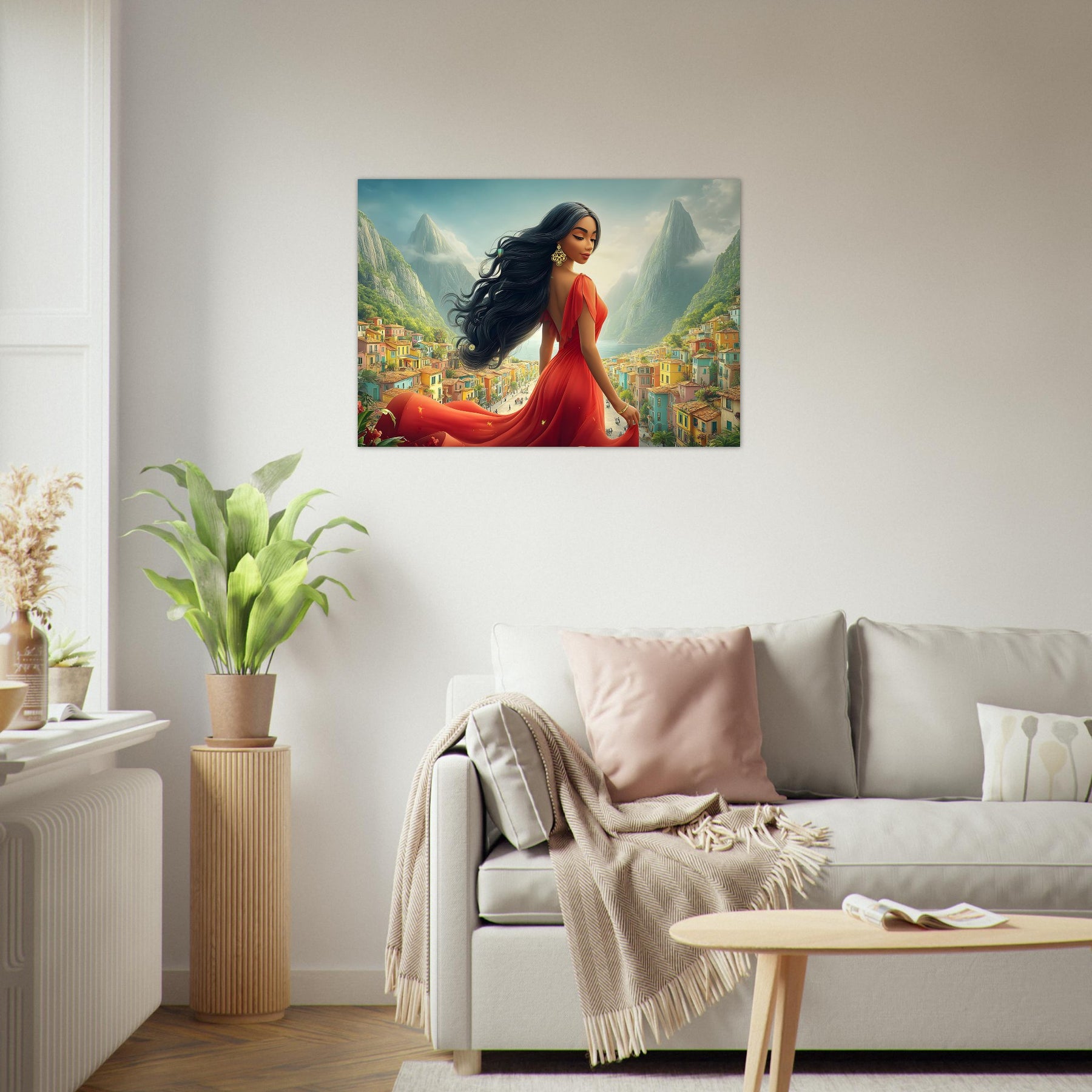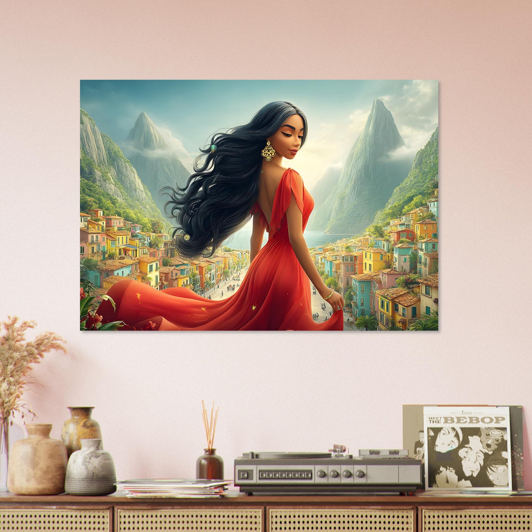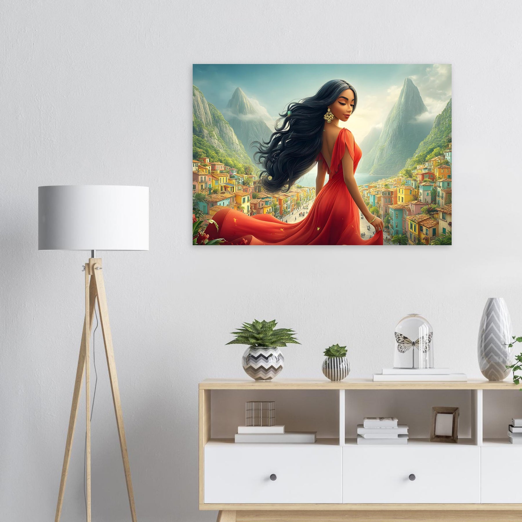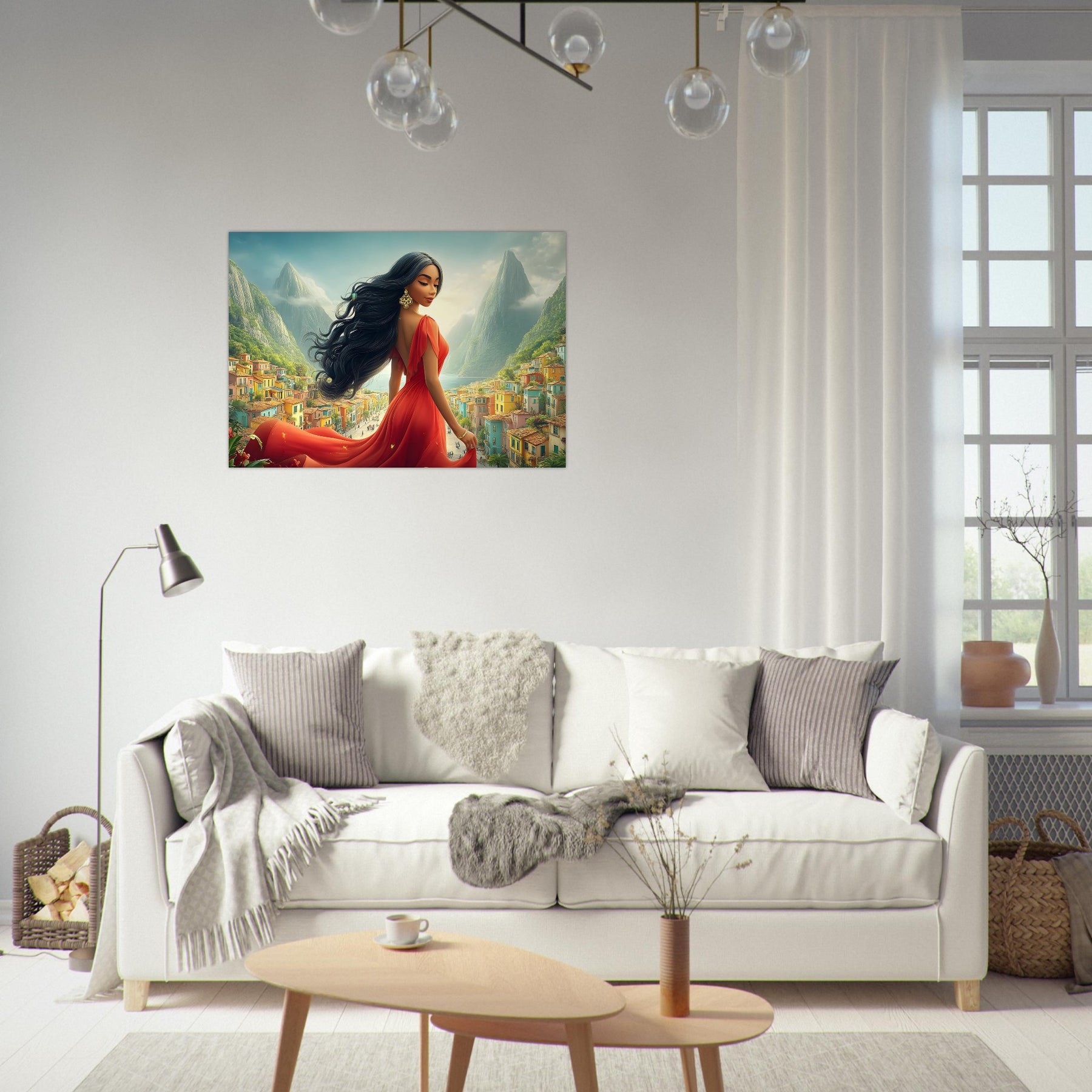 Bring color, elegance, and calm to your child’s room with the Coastal Serenity Aluminum Wall Art. This captivating piece portrays a graceful woman in a flowing red dress standing in a vibrant coastal village, surrounded by majestic mountains and serene blue waters. The composition radiates peace, beauty, and harmony — capturing the soothing essence of seaside life.