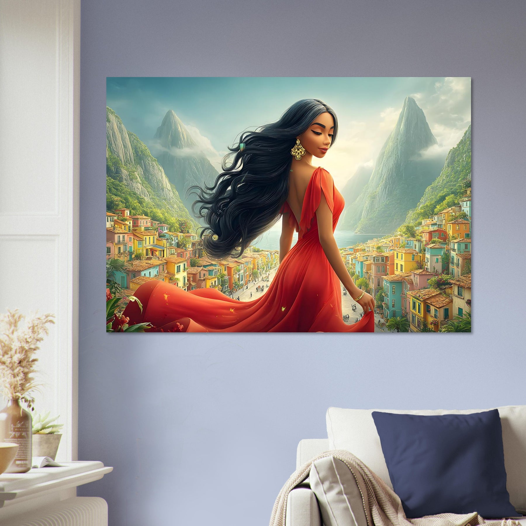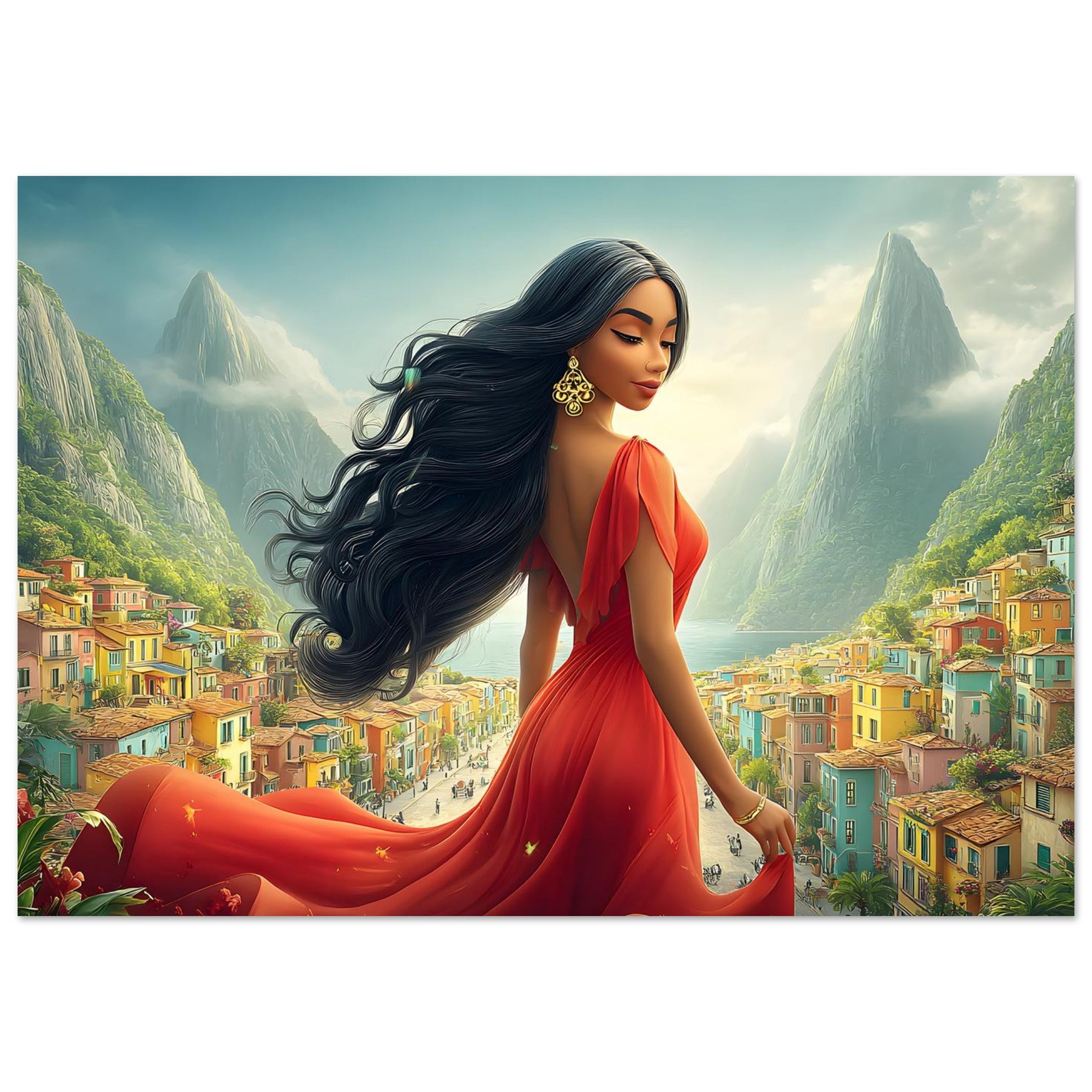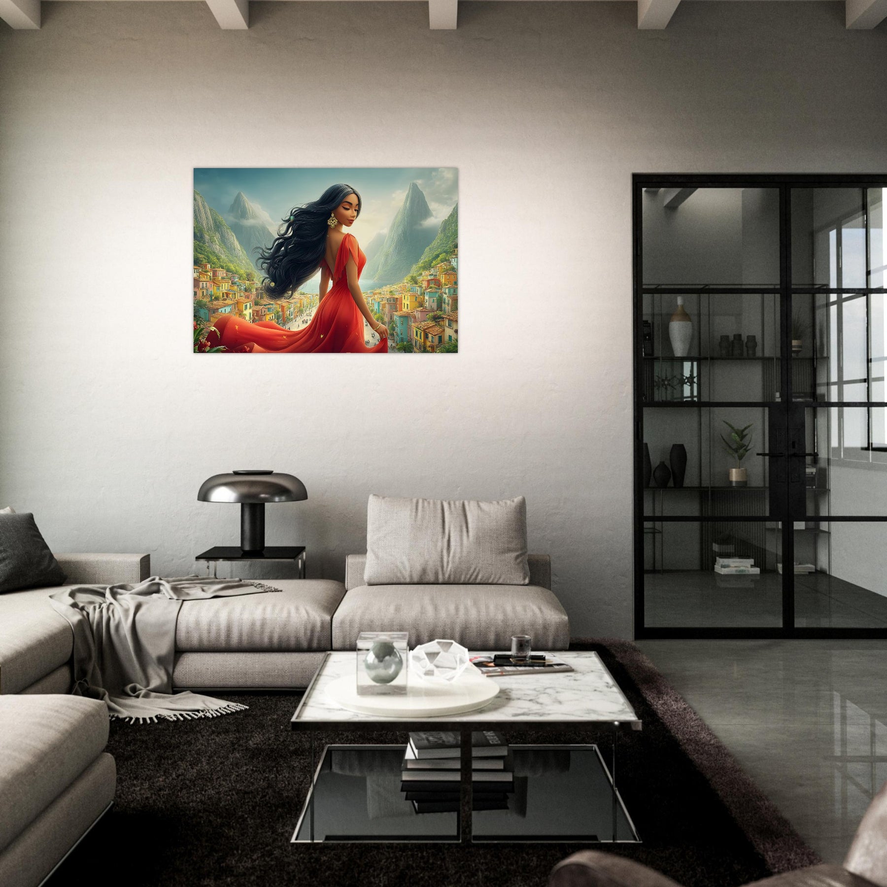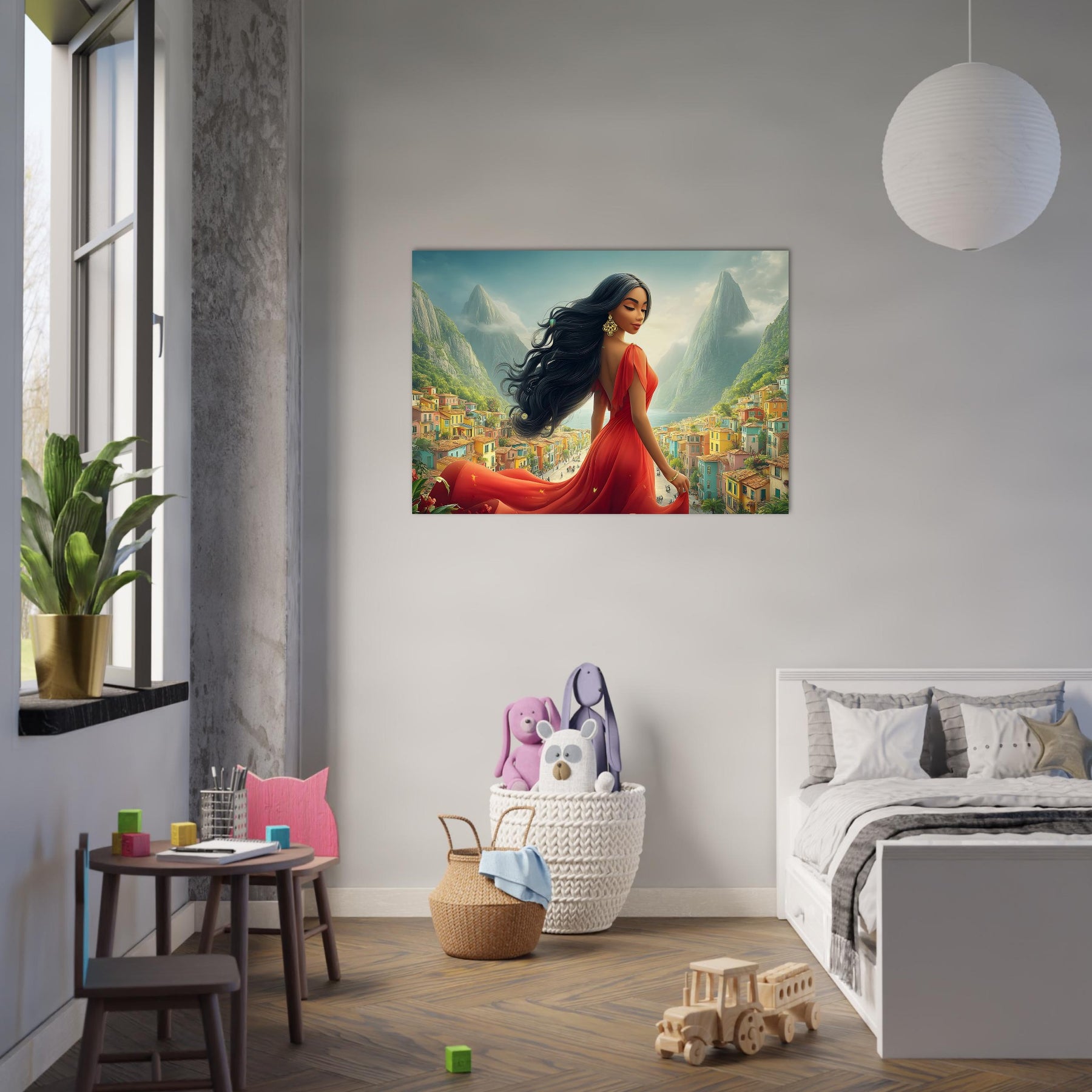 Bring color, elegance, and calm to your child’s room with the Coastal Serenity Aluminum Wall Art. This captivating piece portrays a graceful woman in a flowing red dress standing in a vibrant coastal village, surrounded by majestic mountains and serene blue waters. The composition radiates peace, beauty, and harmony — capturing the soothing essence of seaside life.