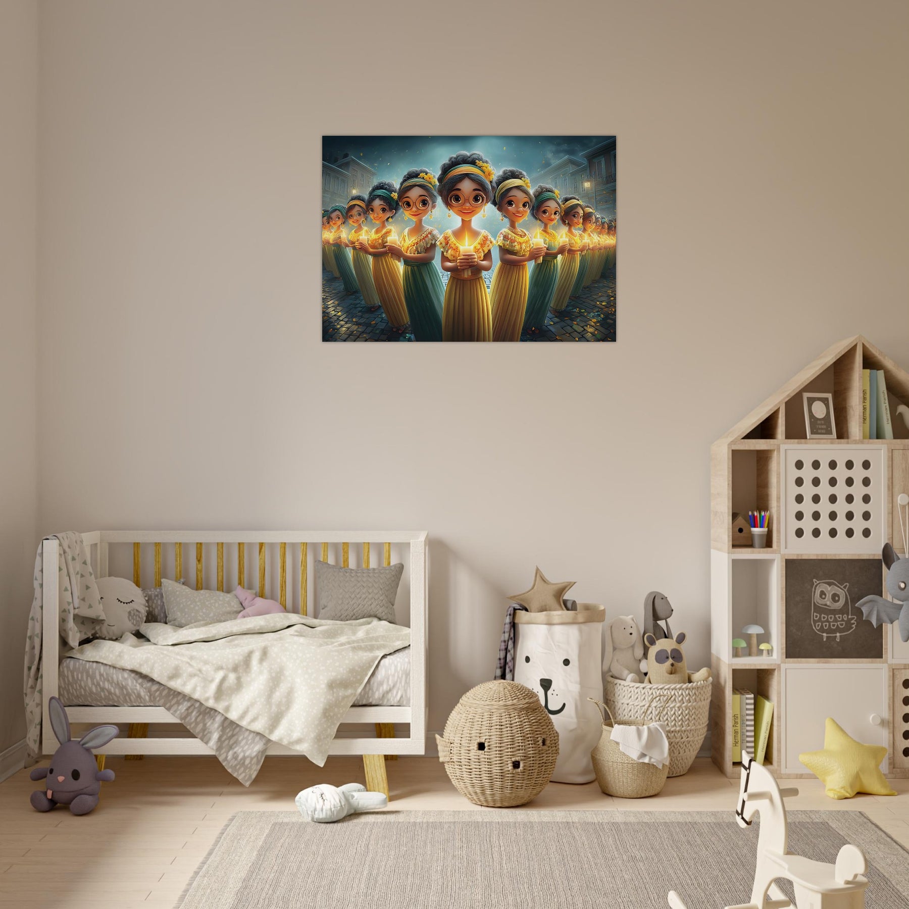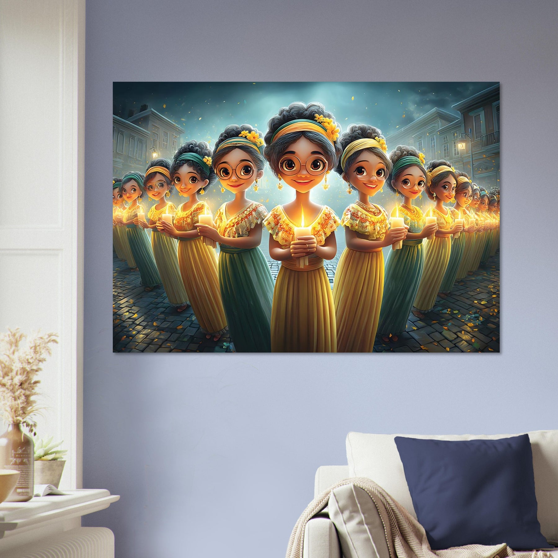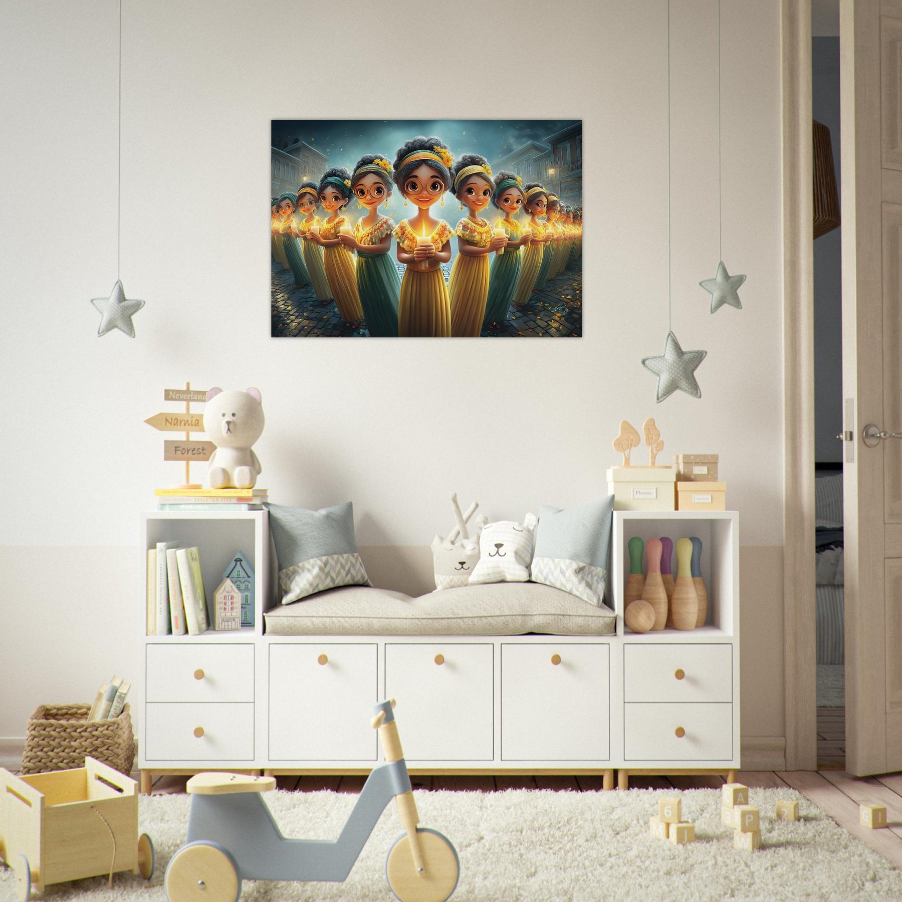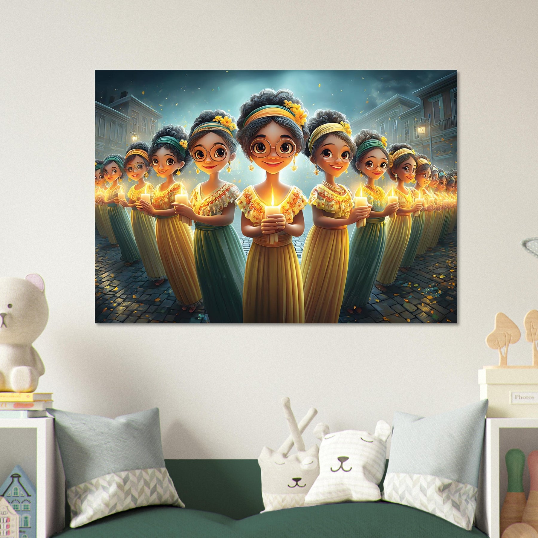 Brighten your child’s room with Festival of Lights, a heartwarming aluminum wall art illustration that captures the magic of celebration and togetherness. This enchanting artwork features charming characters holding glowing candles, surrounded by a dreamy, festive atmosphere that radiates warmth, joy, and community spirit.