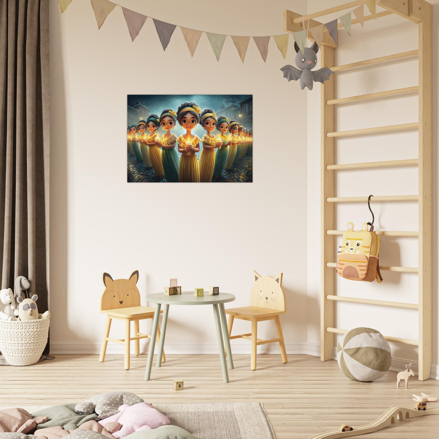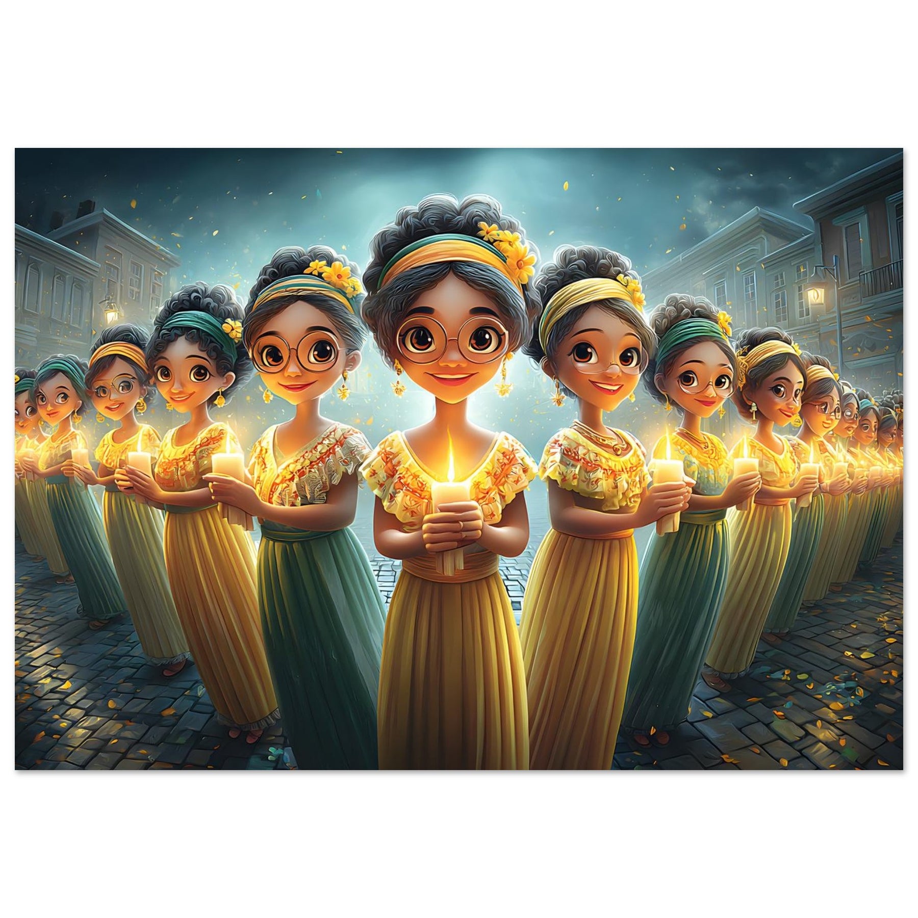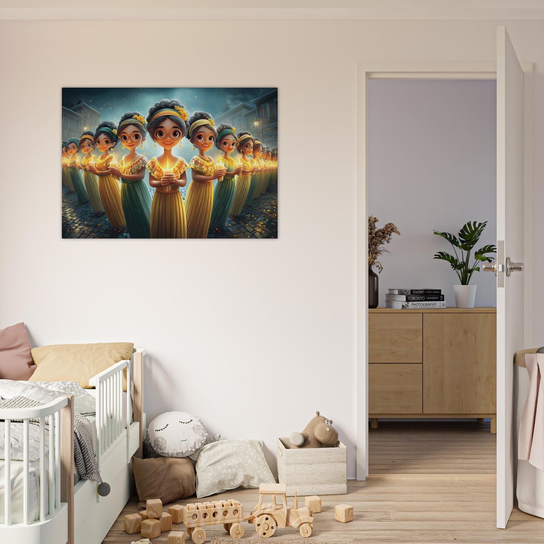 Brighten your child’s room with Festival of Lights, a heartwarming aluminum wall art illustration that captures the magic of celebration and togetherness. This enchanting artwork features charming characters holding glowing candles, surrounded by a dreamy, festive atmosphere that radiates warmth, joy, and community spirit.