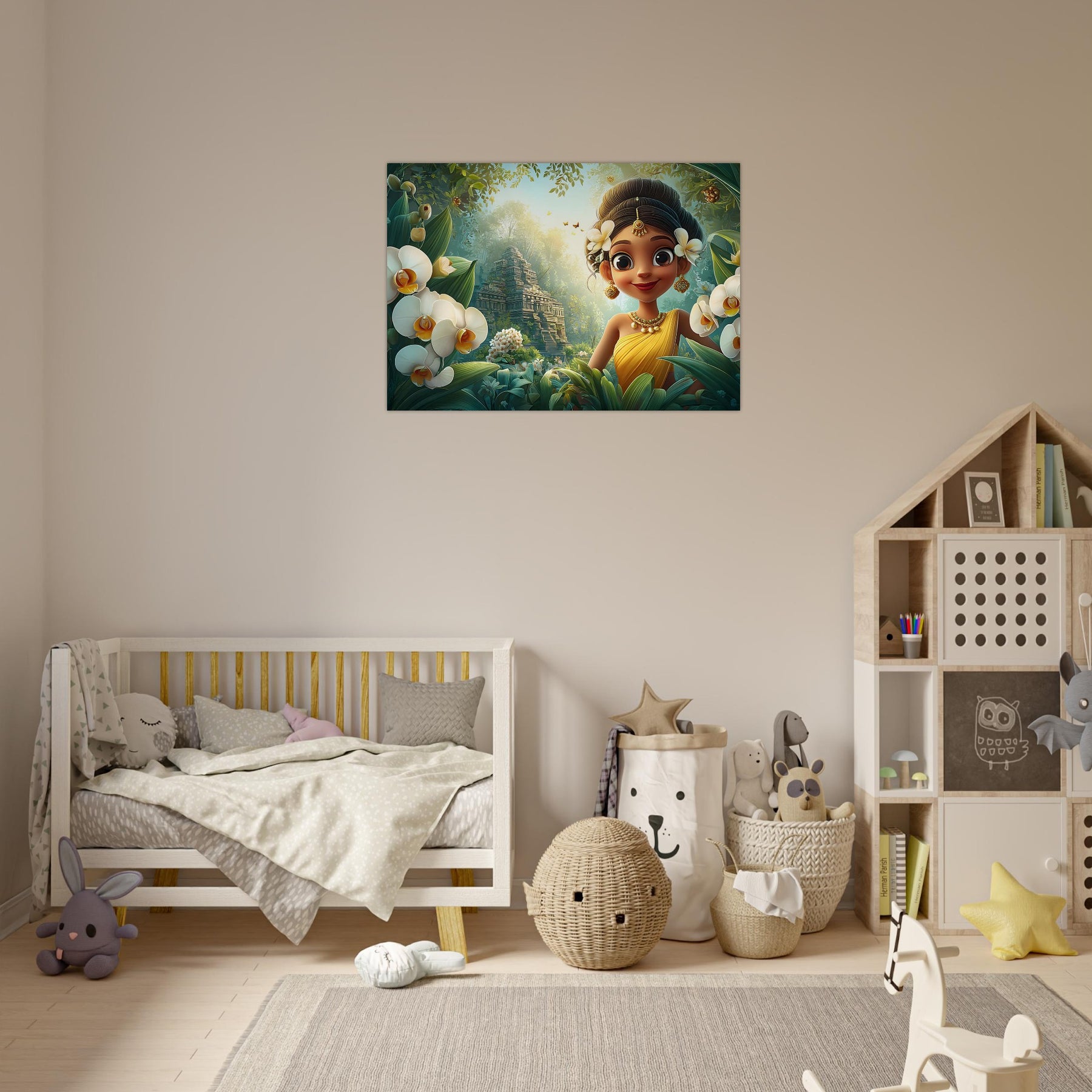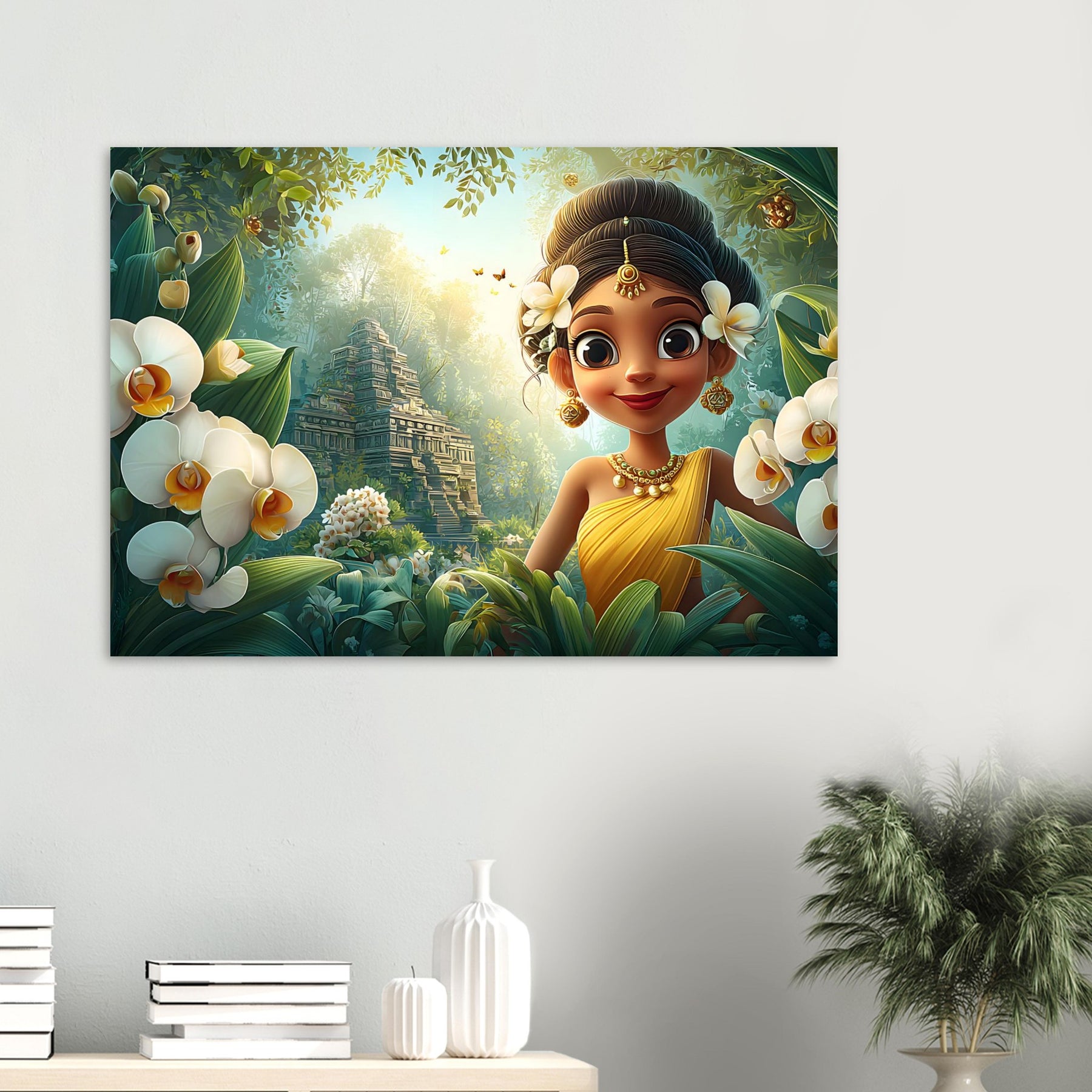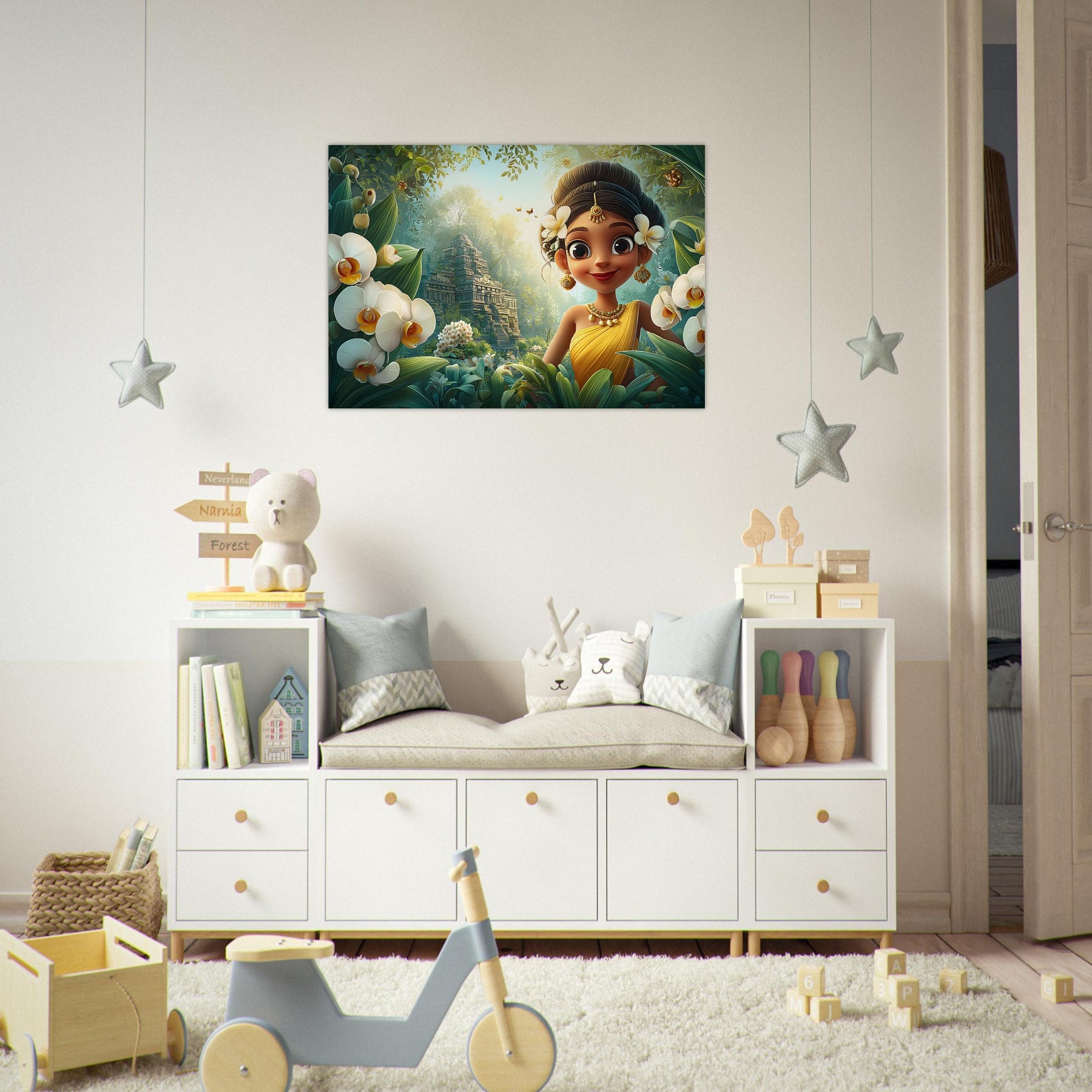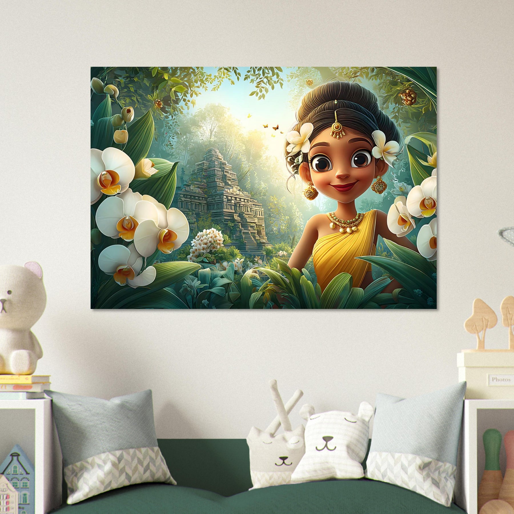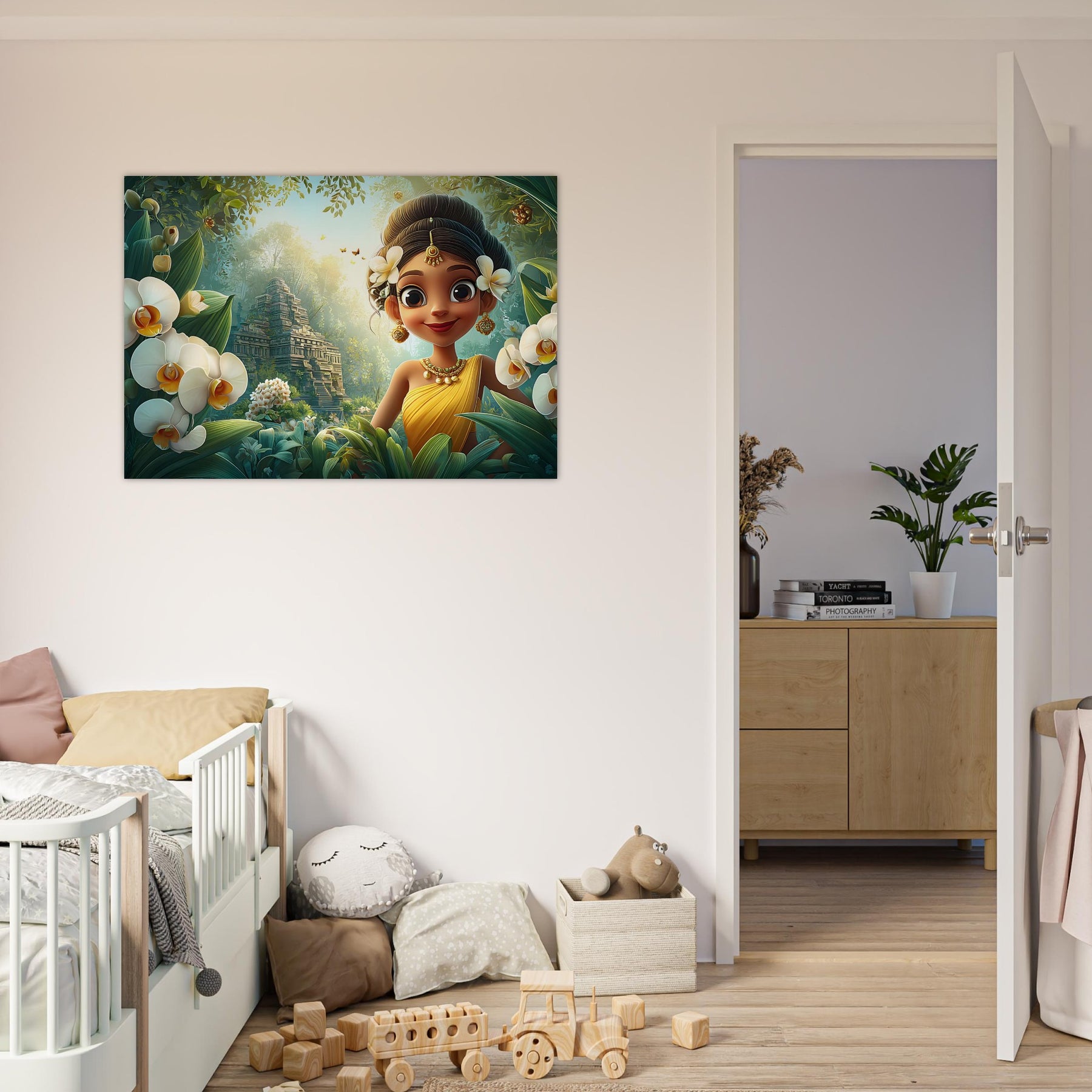 Bring magic, color, and imagination into your child’s space with Jungle Flower Dreamer, a captivating whimsical aluminum illustration that celebrates joy, nature, and discovery. This enchanting artwork features a joyful young girl adorned with vibrant flowers, radiating happiness and curiosity as she stands before a lush jungle backdrop filled with ancient ruins. The scene beautifully blends adventure with tranquility, inspiring endless stories and wonder.