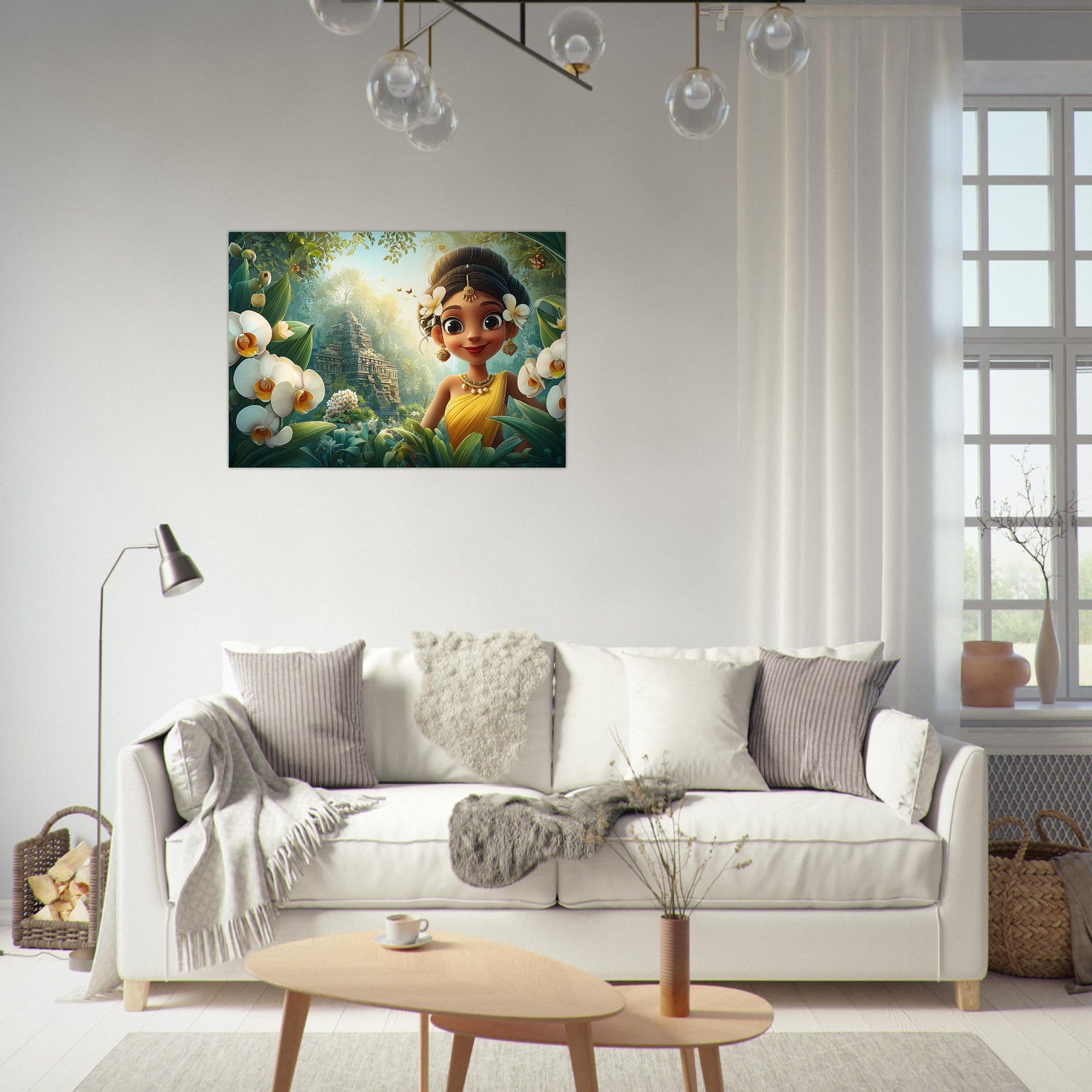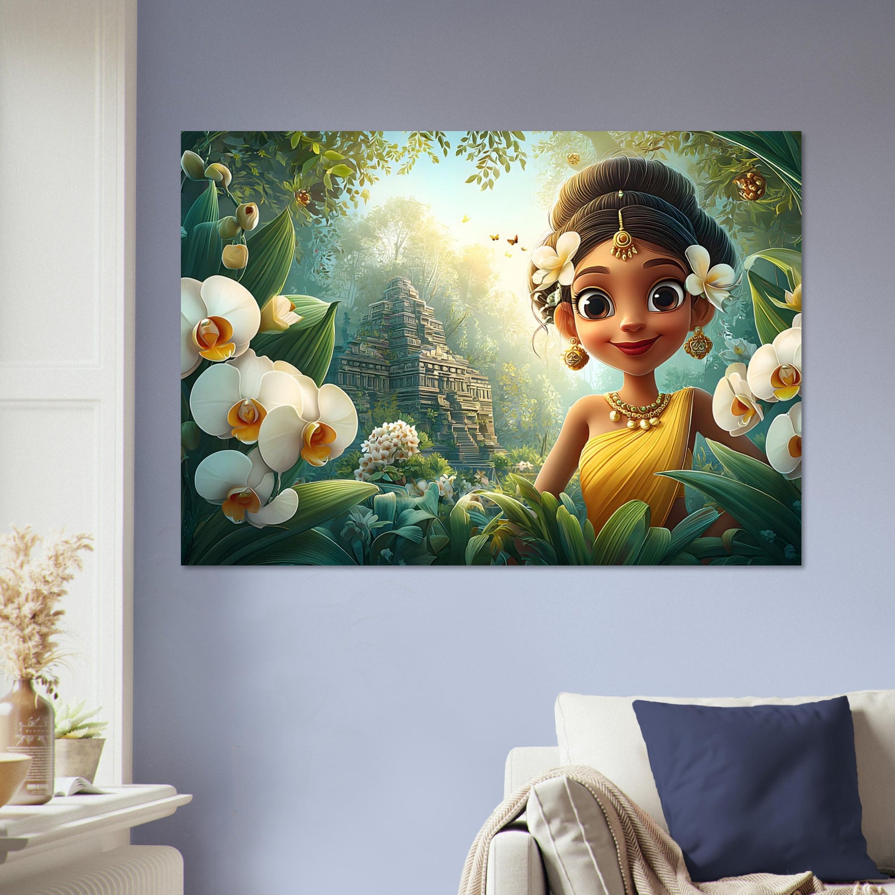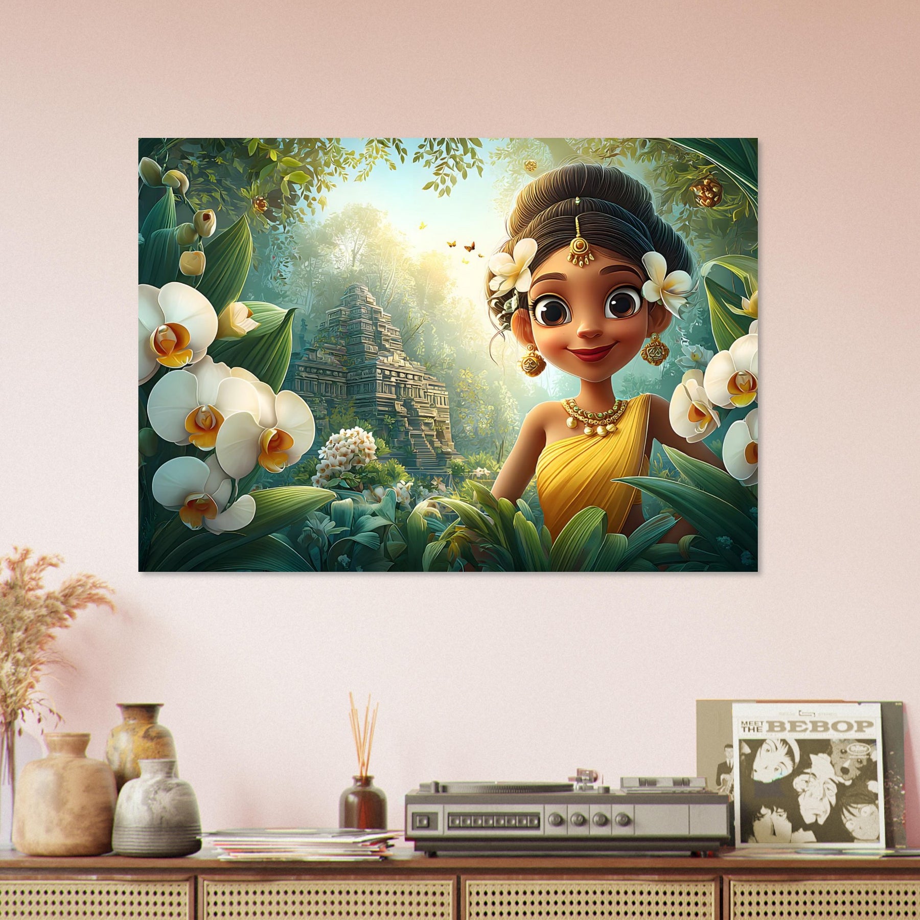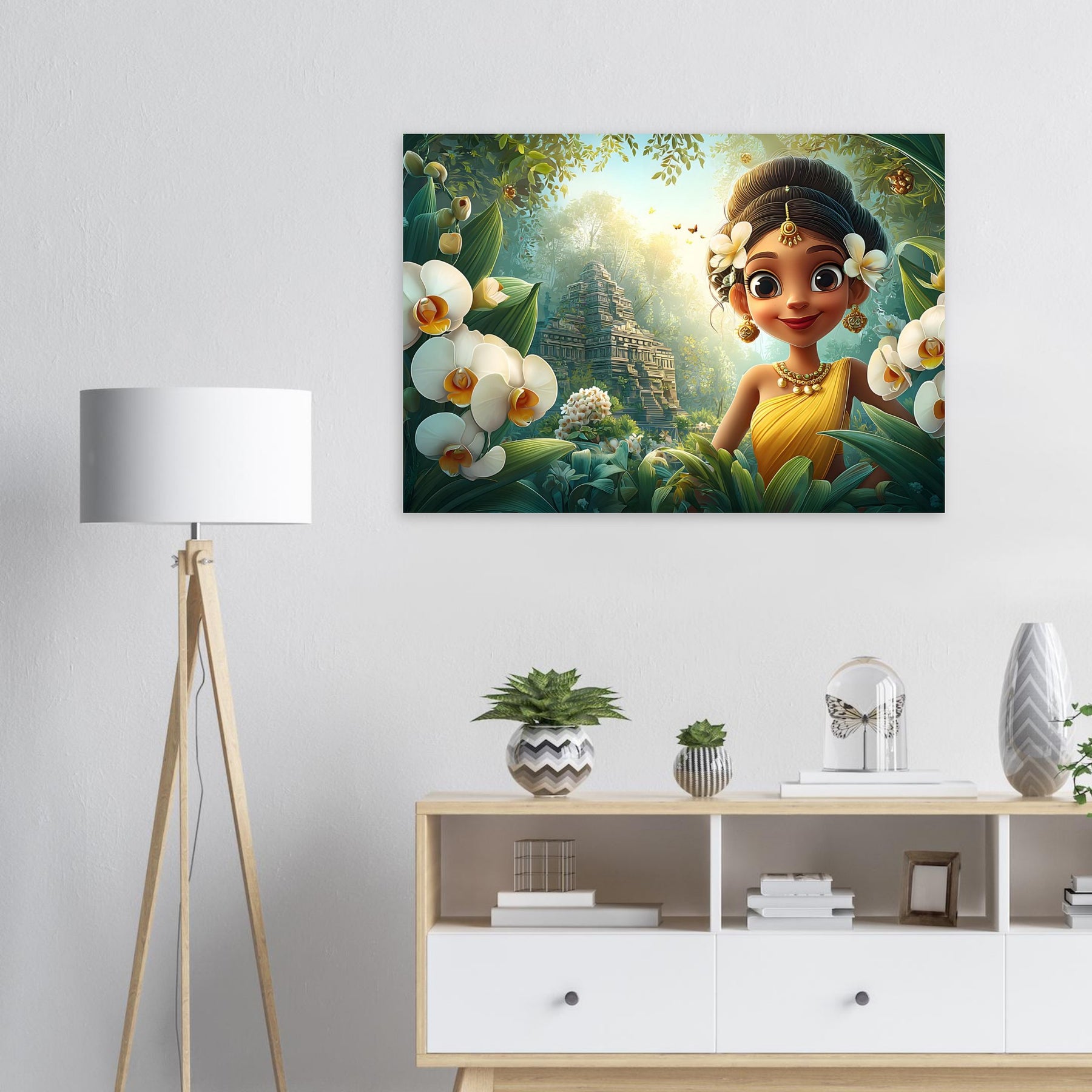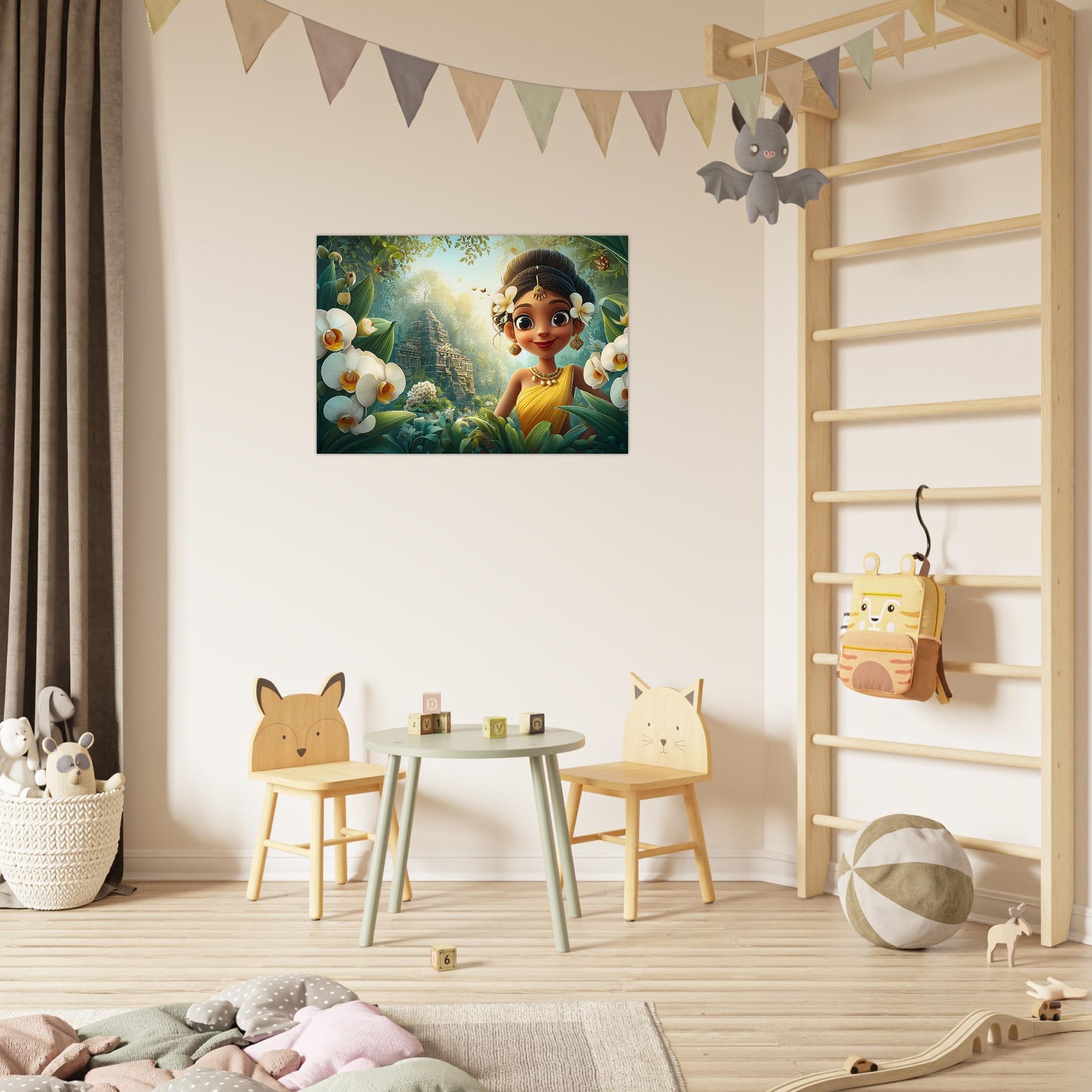 Bring magic, color, and imagination into your child’s space with Jungle Flower Dreamer, a captivating whimsical aluminum illustration that celebrates joy, nature, and discovery. This enchanting artwork features a joyful young girl adorned with vibrant flowers, radiating happiness and curiosity as she stands before a lush jungle backdrop filled with ancient ruins. The scene beautifully blends adventure with tranquility, inspiring endless stories and wonder.