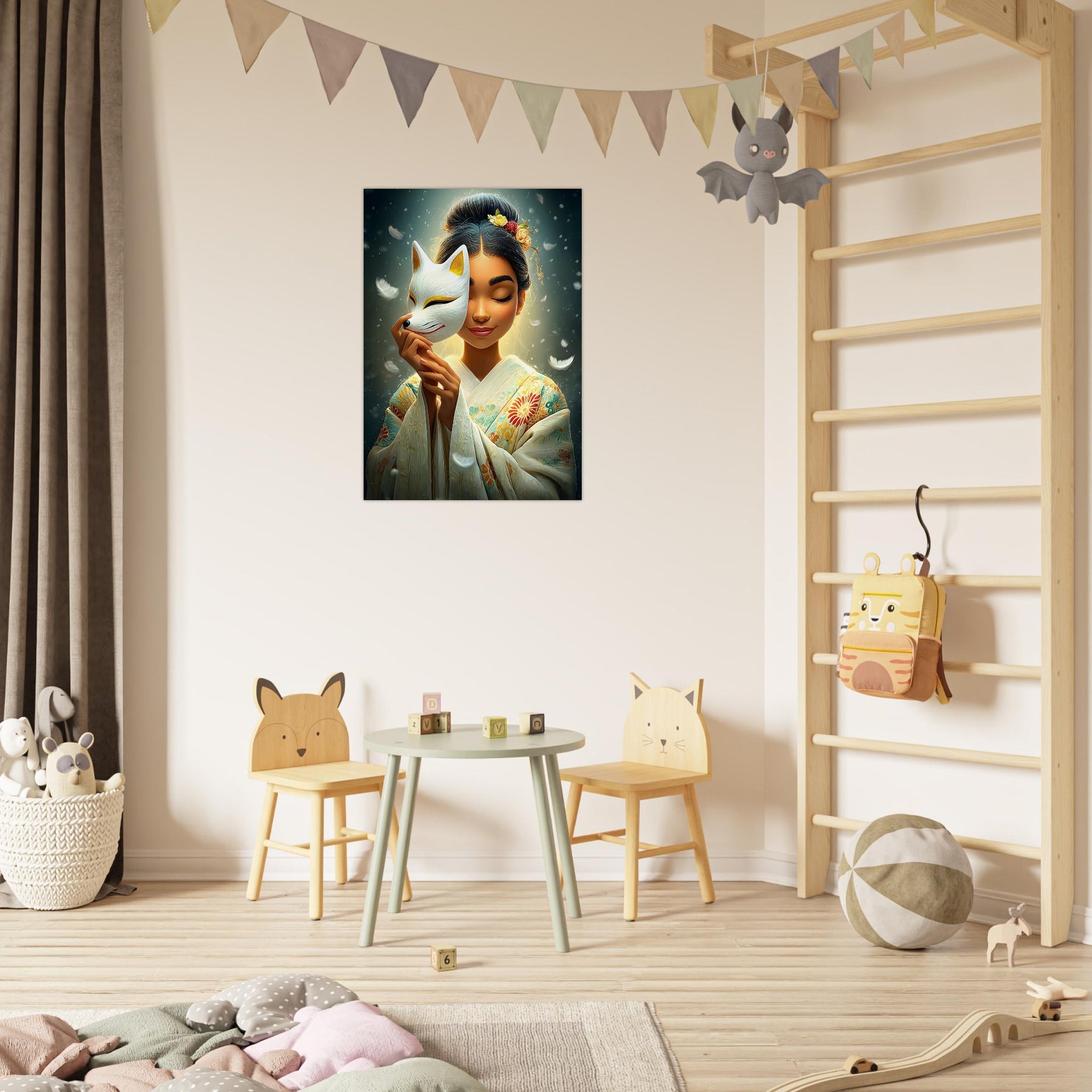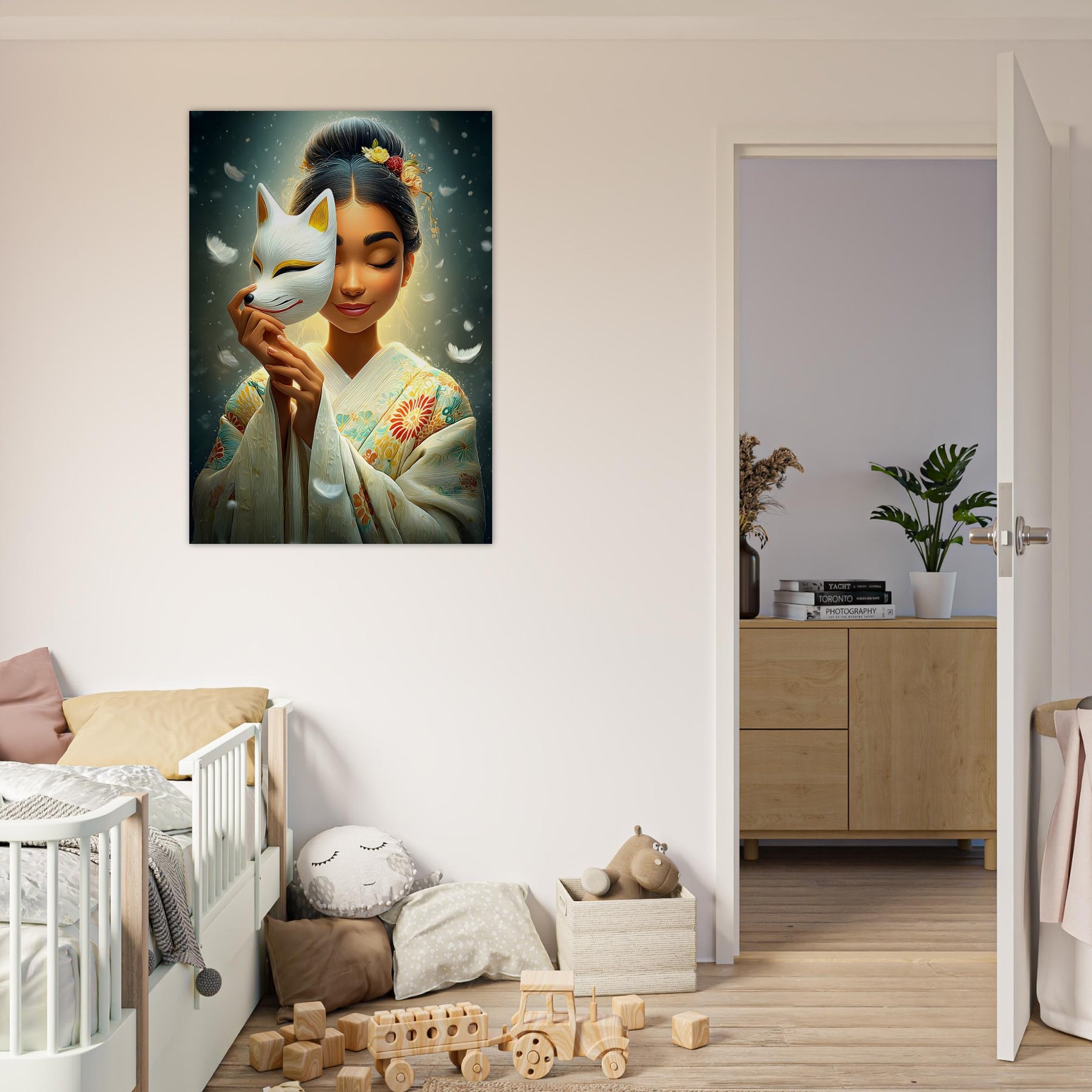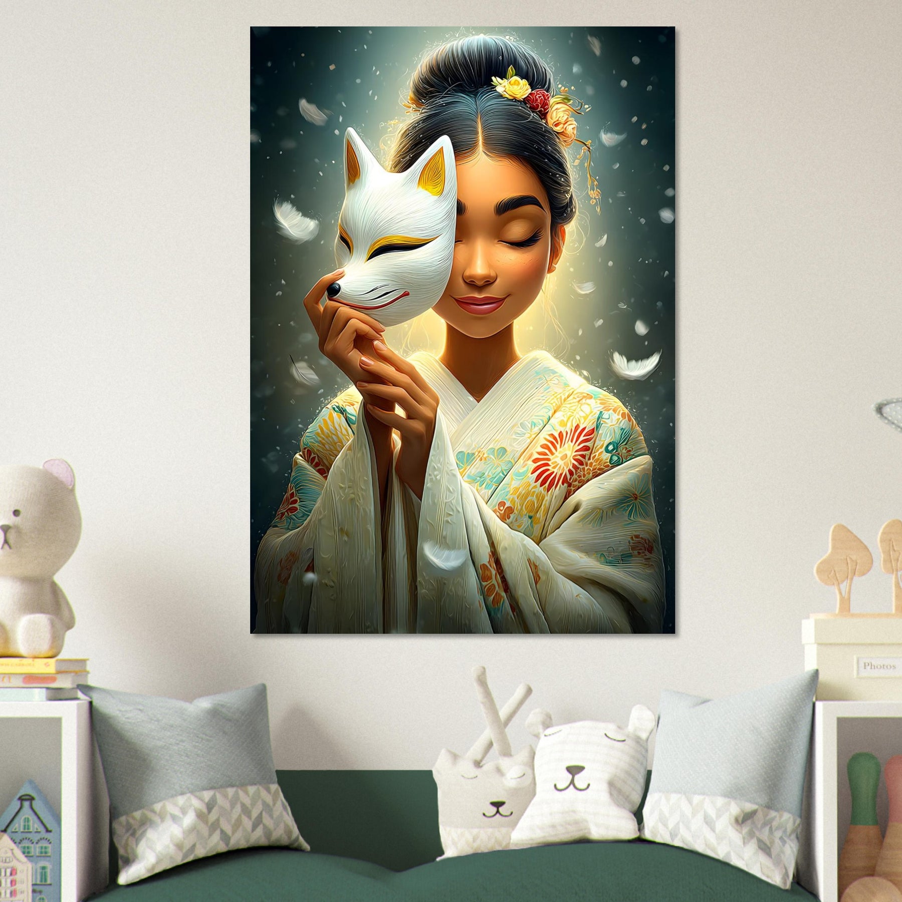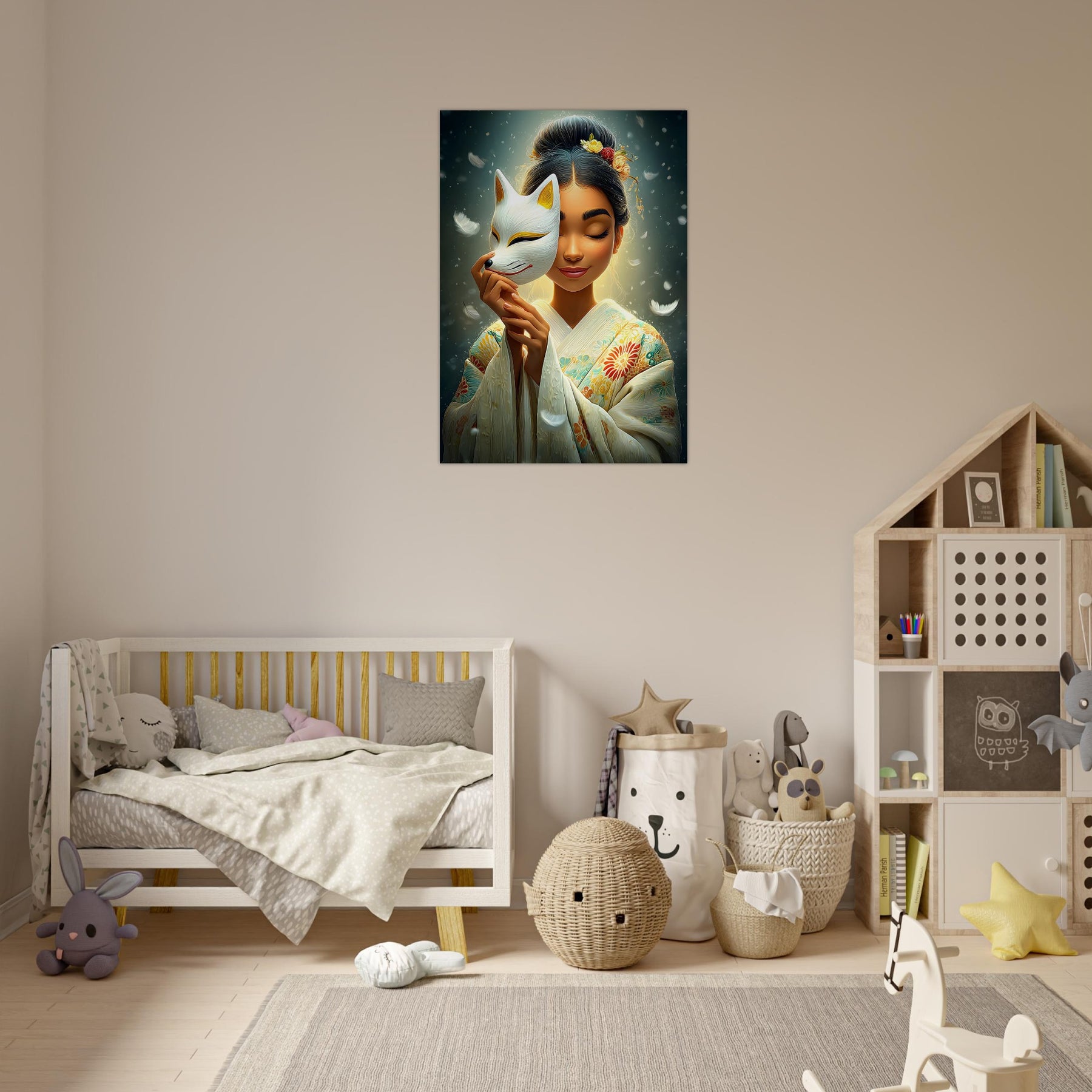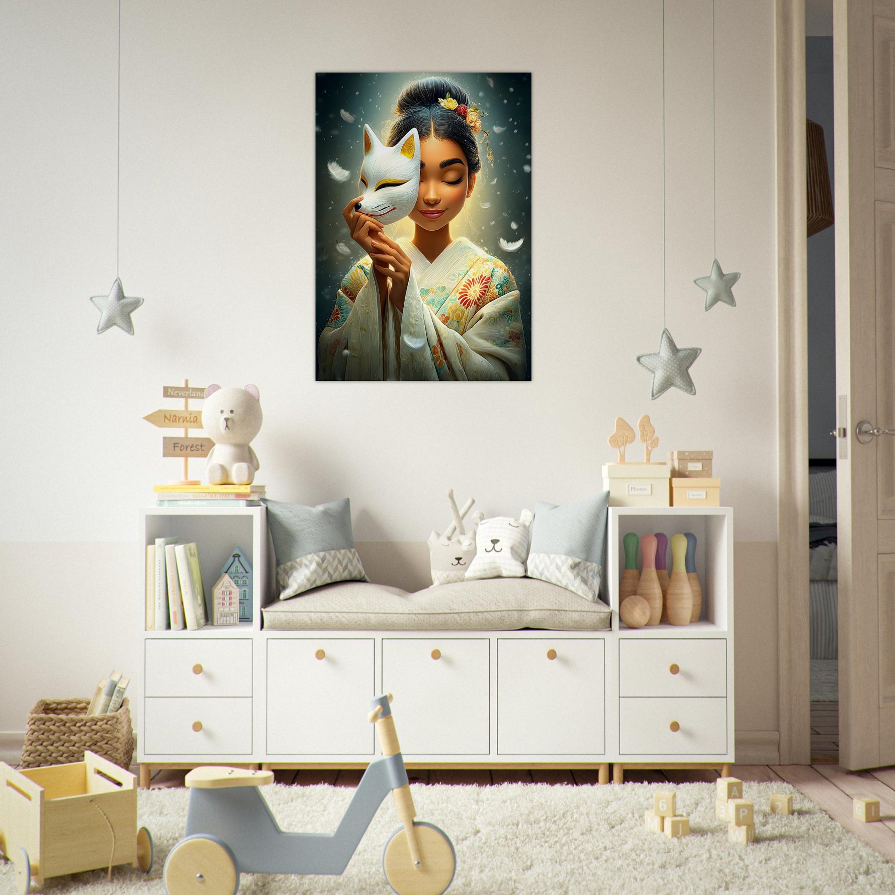 Transform your child’s room into a world of beauty and imagination with Mystic Fox Maiden, a captivating whimsical aluminum illustration that blends elegance, tradition, and storytelling. This enchanting artwork features a young woman wearing a graceful fox mask, symbolizing mystery, culture, and timeless folklore. Surrounded by delicate petals and soft, glowing light, the scene radiates serenity, depth, and artistic charm.