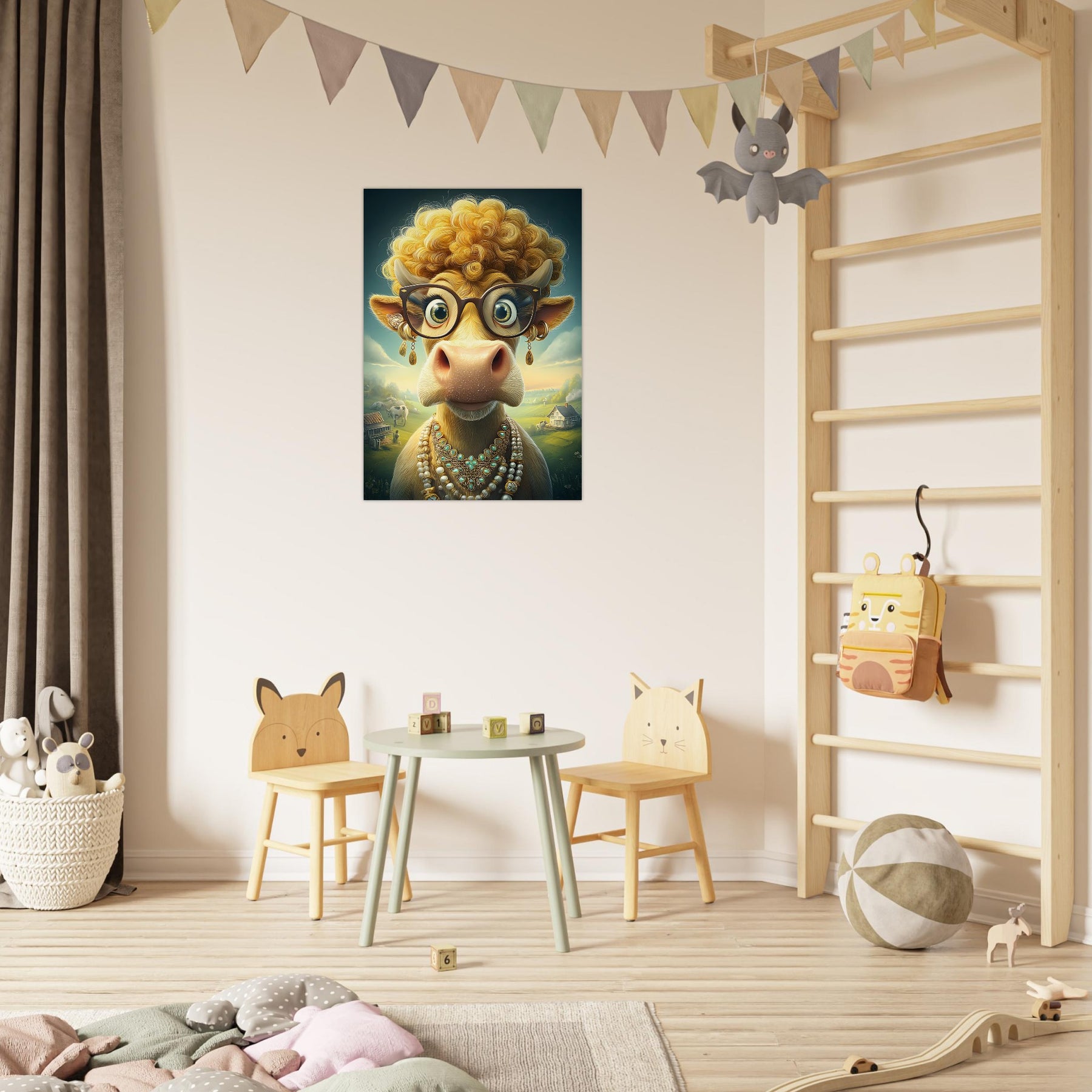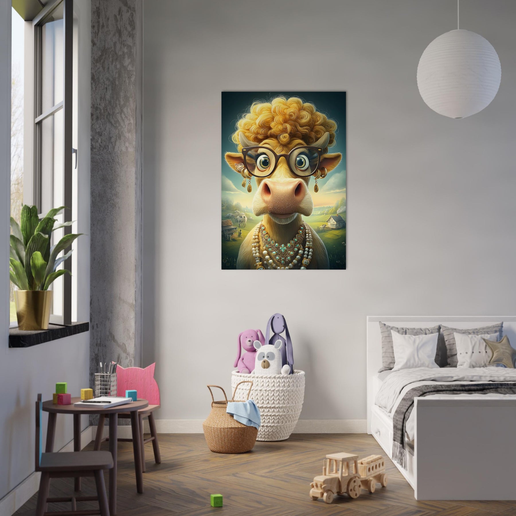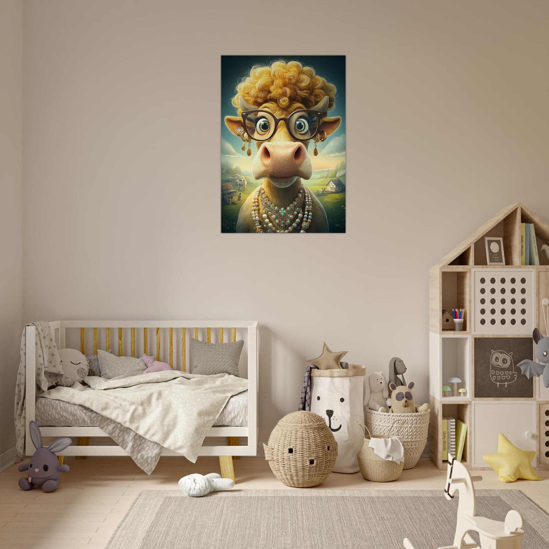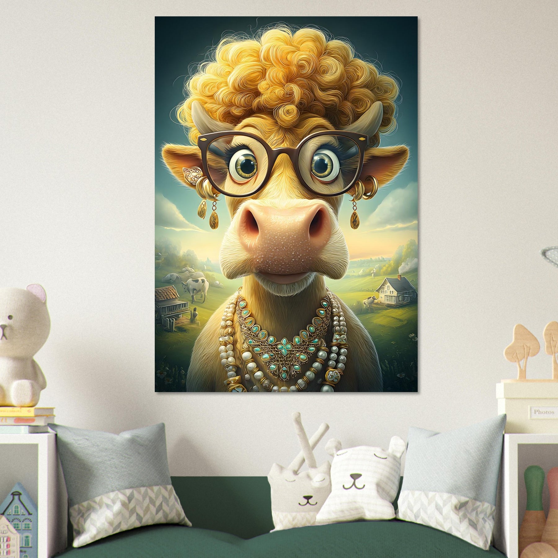 Add a dash of humor and high style to your child’s room with the Pasture Chic Aluminum Wall Art. This delightful and whimsical illustration features a fashionable cow with a curly golden hairstyle, oversized glasses, and sparkling jewelry, all set against a serene pastoral backdrop. Bursting with personality and playful sophistication, this artwork blends countryside charm with modern flair — a true conversation piece for young art lovers.