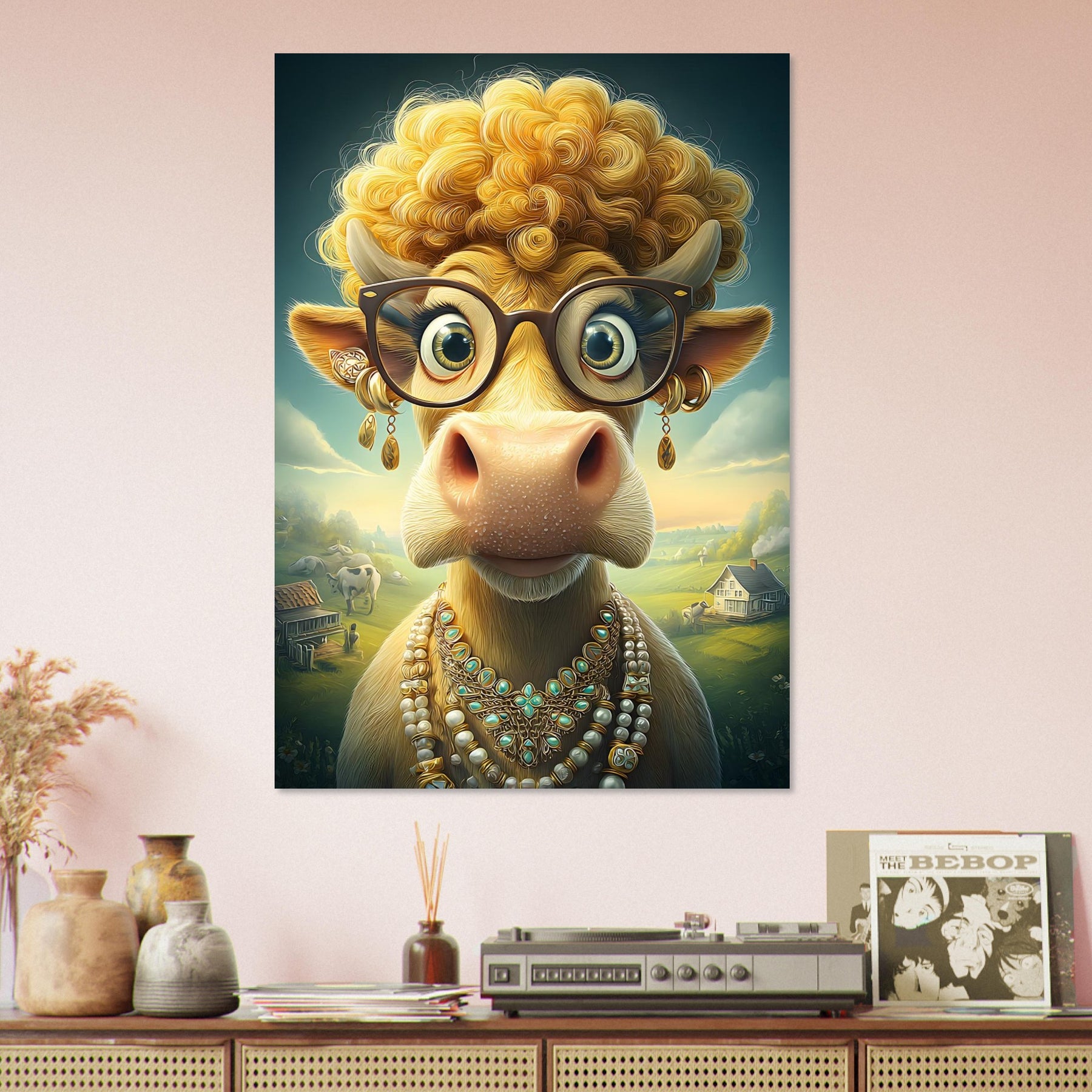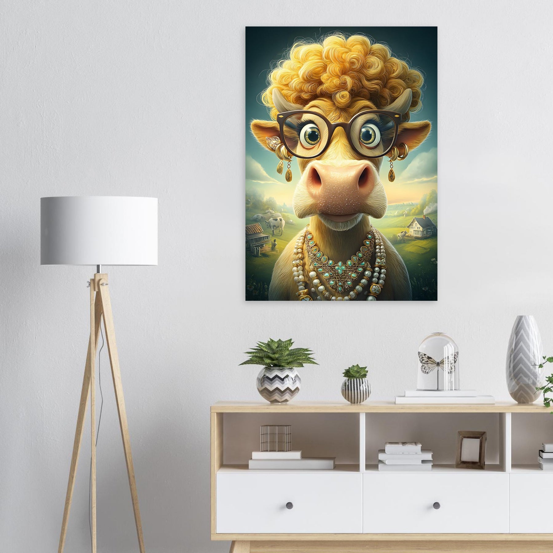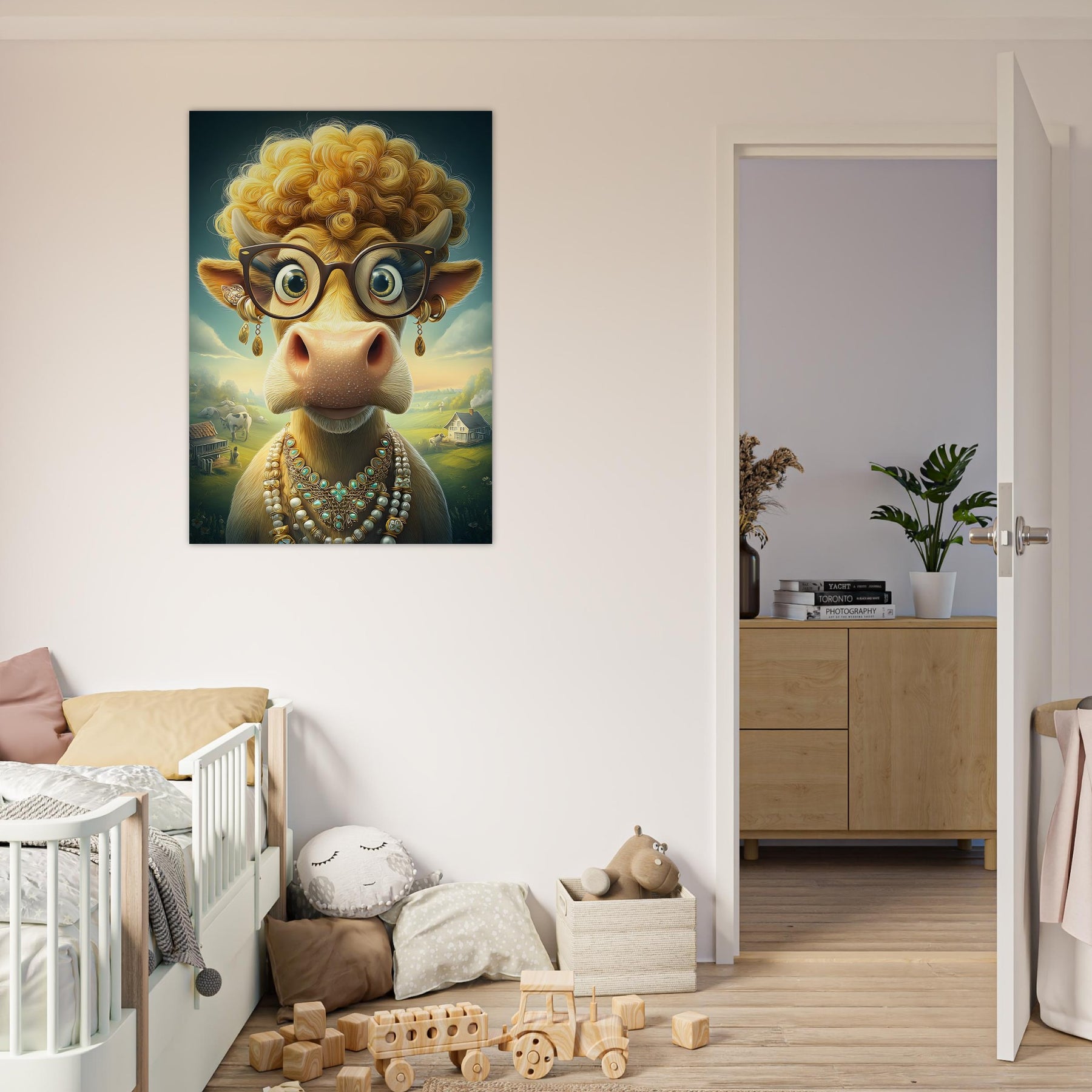 Add a dash of humor and high style to your child’s room with the Pasture Chic Aluminum Wall Art. This delightful and whimsical illustration features a fashionable cow with a curly golden hairstyle, oversized glasses, and sparkling jewelry, all set against a serene pastoral backdrop. Bursting with personality and playful sophistication, this artwork blends countryside charm with modern flair — a true conversation piece for young art lovers.
