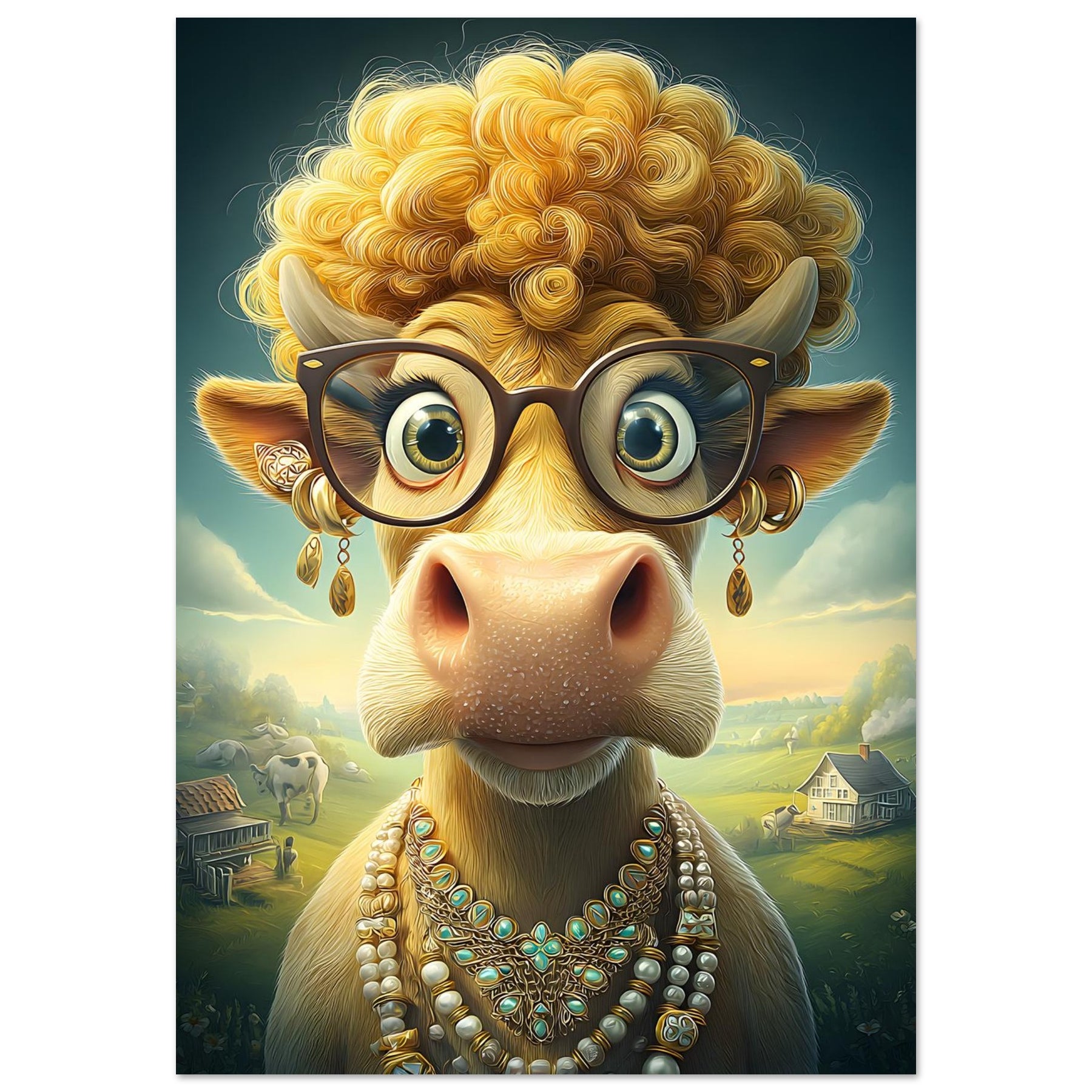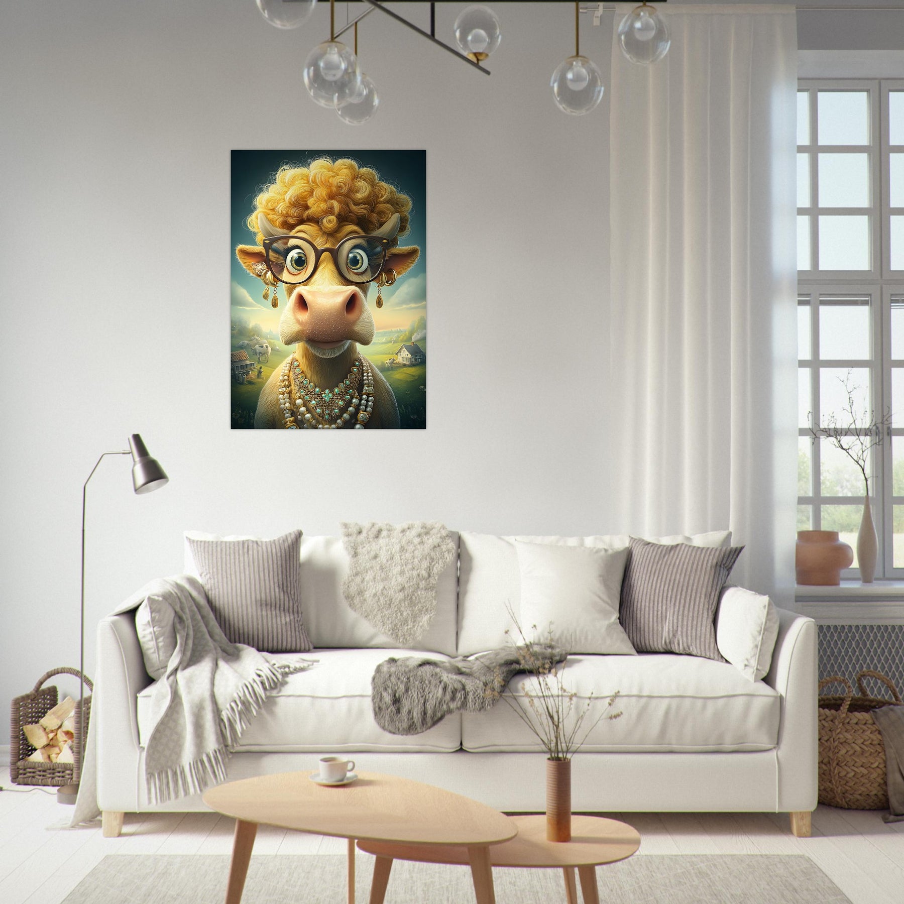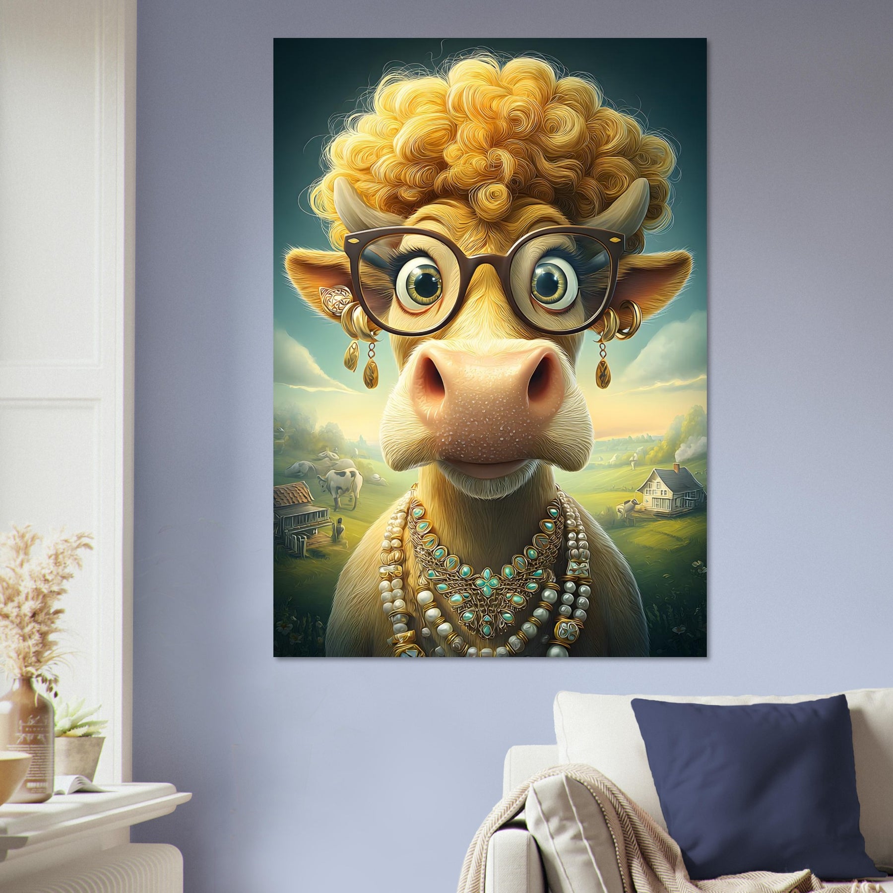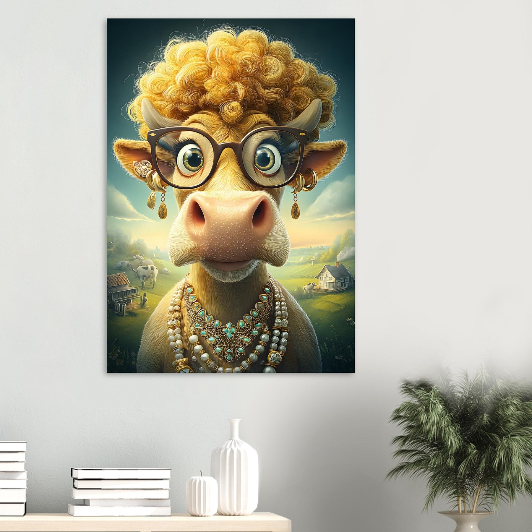 Add a dash of humor and high style to your child’s room with the Pasture Chic Aluminum Wall Art. This delightful and whimsical illustration features a fashionable cow with a curly golden hairstyle, oversized glasses, and sparkling jewelry, all set against a serene pastoral backdrop. Bursting with personality and playful sophistication, this artwork blends countryside charm with modern flair — a true conversation piece for young art lovers.