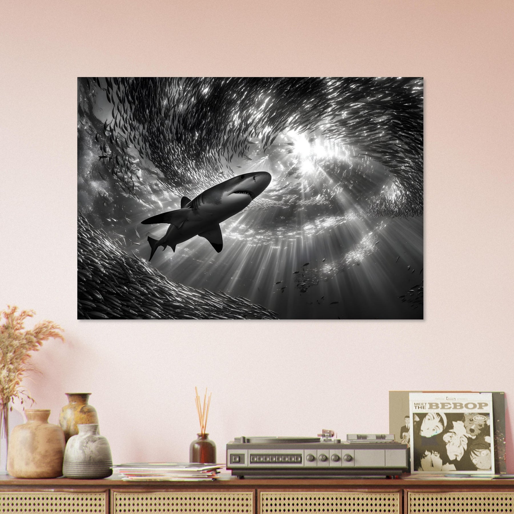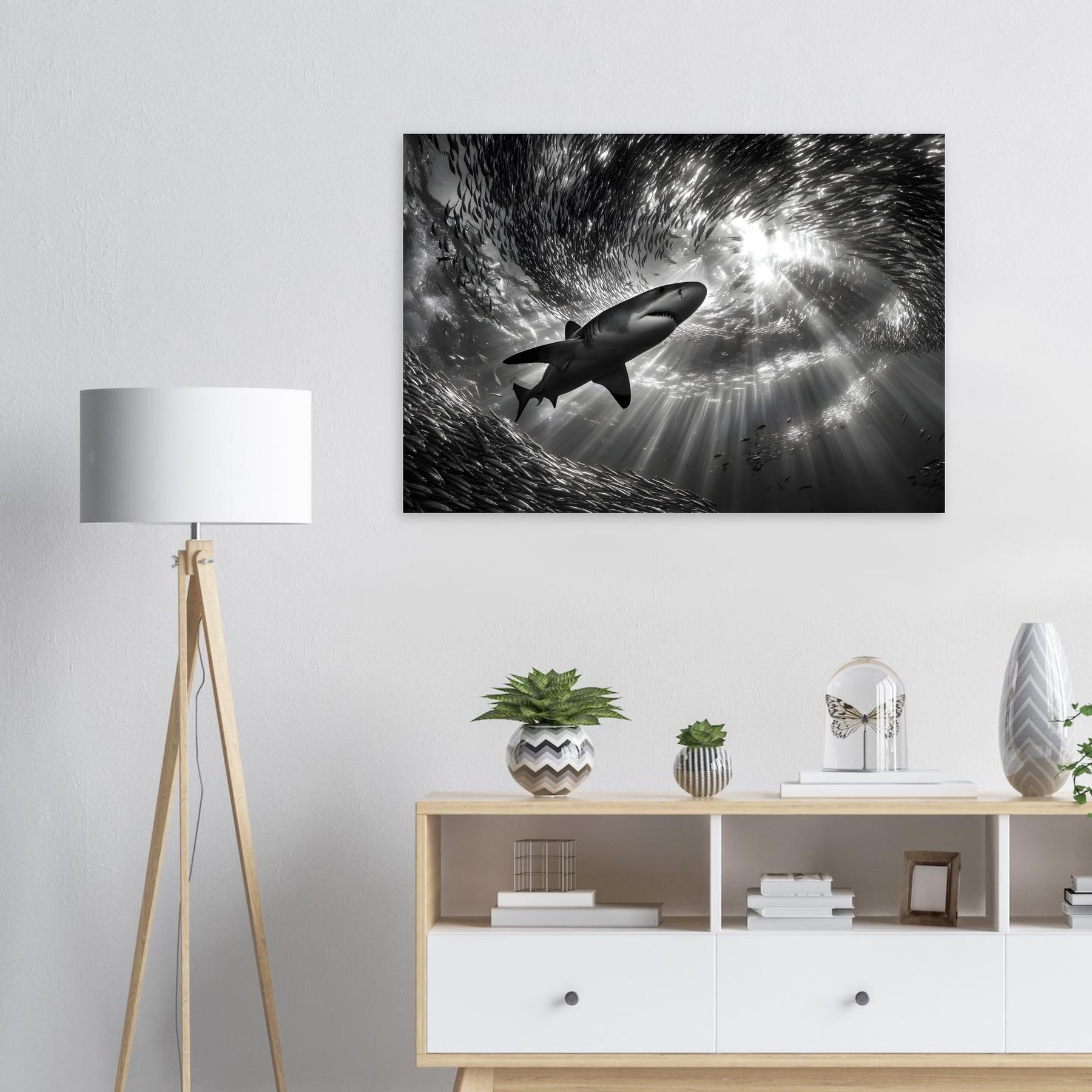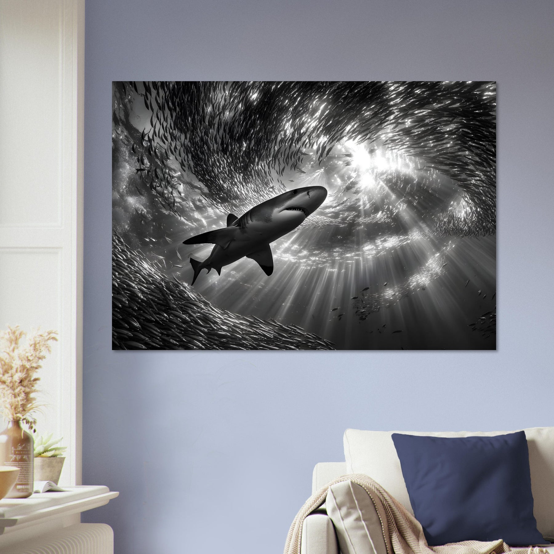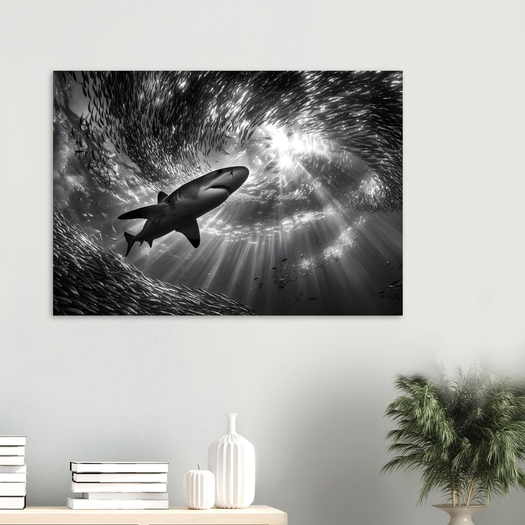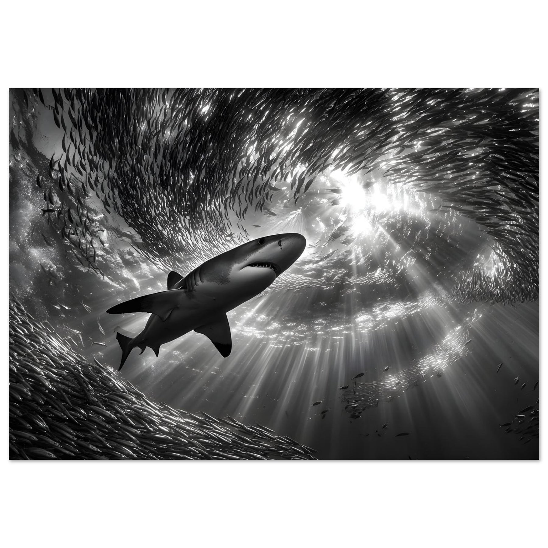 Bring the power and beauty of the ocean into your space with Ocean Predator Ballet, a striking aluminum wall art featuring a majestic shark gliding effortlessly through a swirling school of fish. Beams of sunlight pierce the ocean’s surface, illuminating the deep blue waters and creating a dramatic underwater atmosphere full of motion and life.