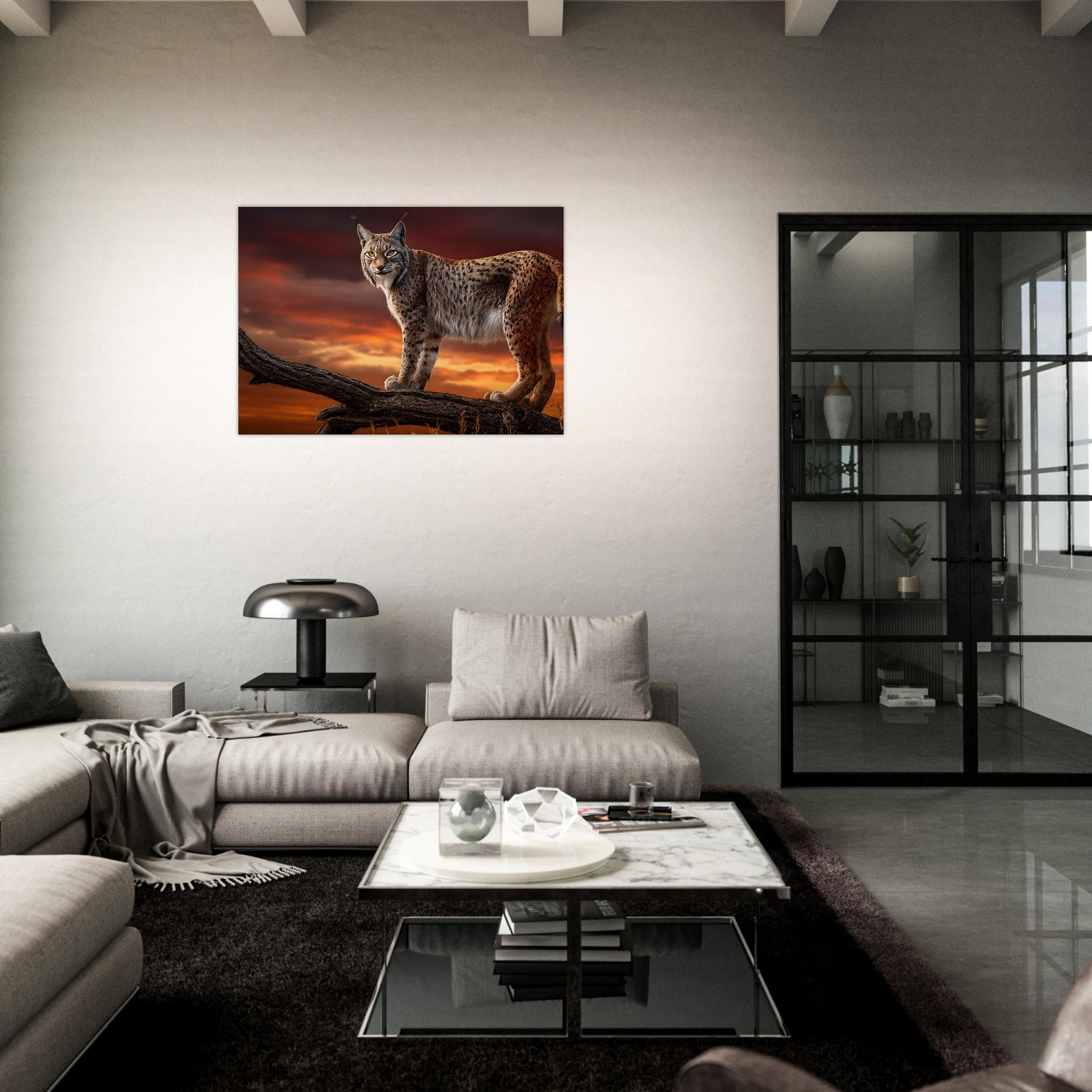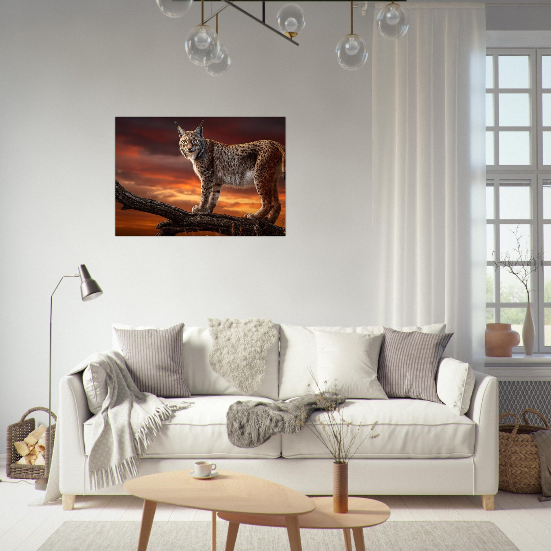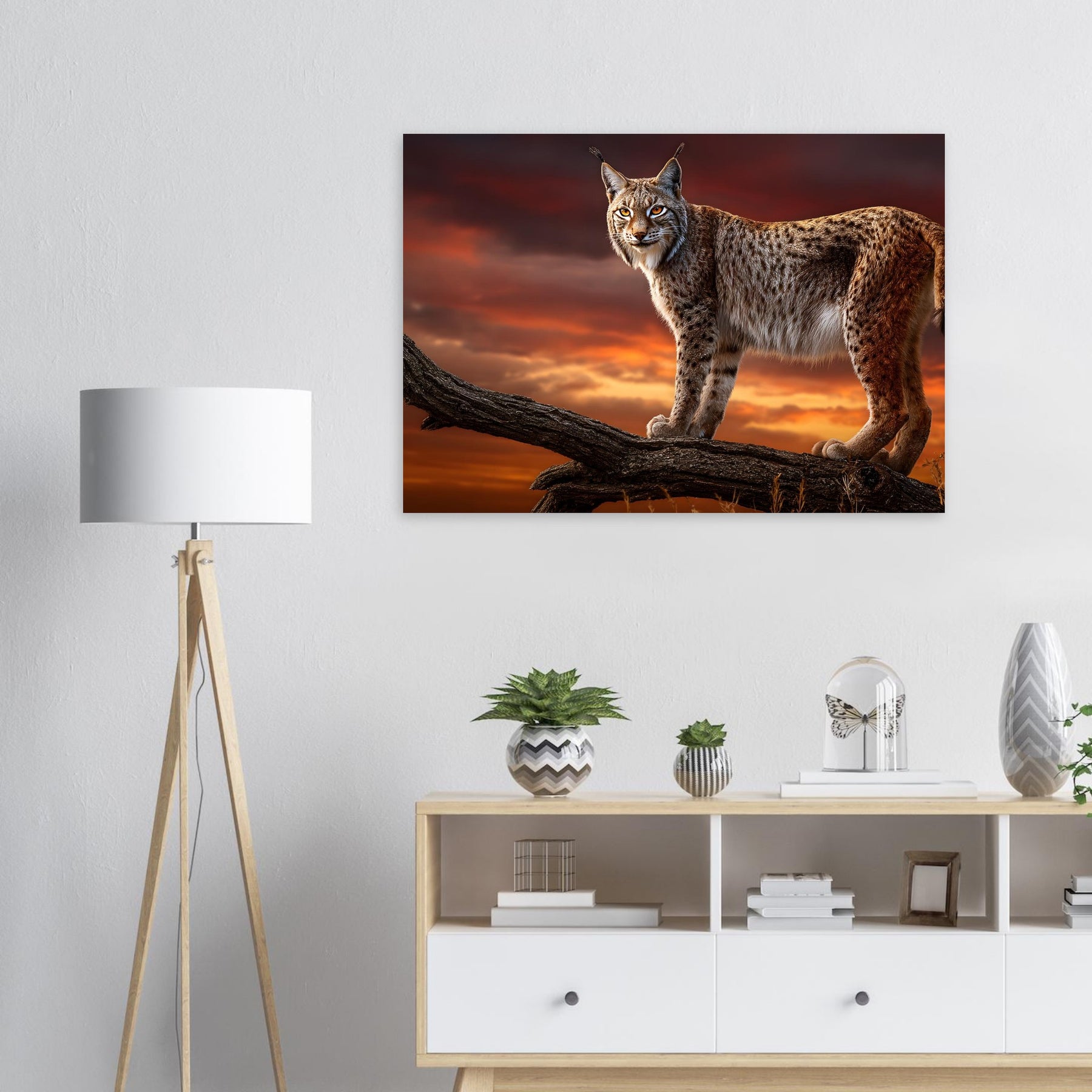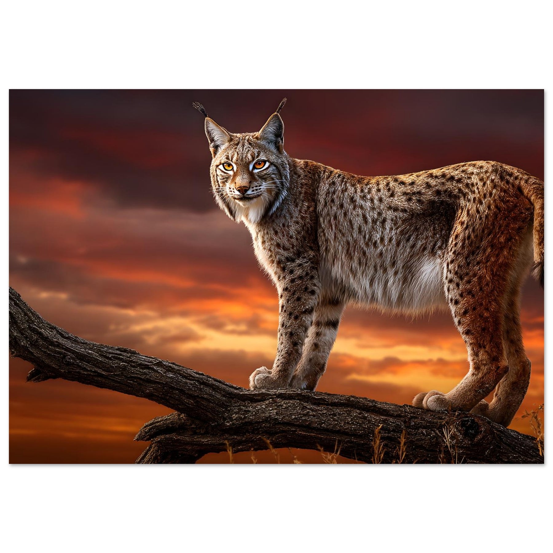 Bring the untamed beauty of the wilderness into your space with Sunset Sentinel Lynx, a striking aluminum wall art featuring a majestic lynx perched atop a branch against a dramatic sunset sky. Its piercing eyes and beautifully detailed fur capture the essence of this elusive wild predator, while the glowing horizon creates a powerful and atmospheric scene.