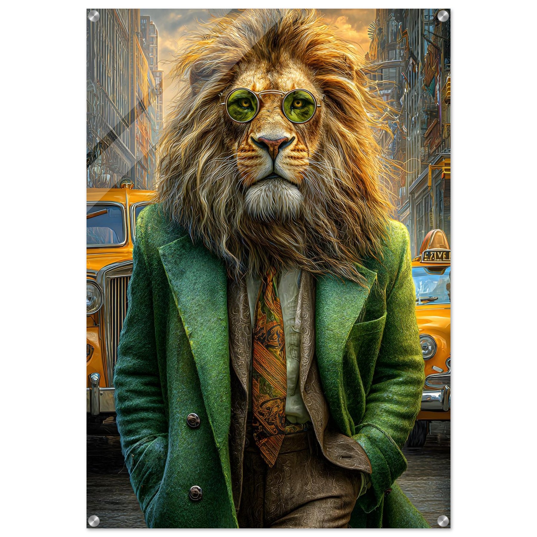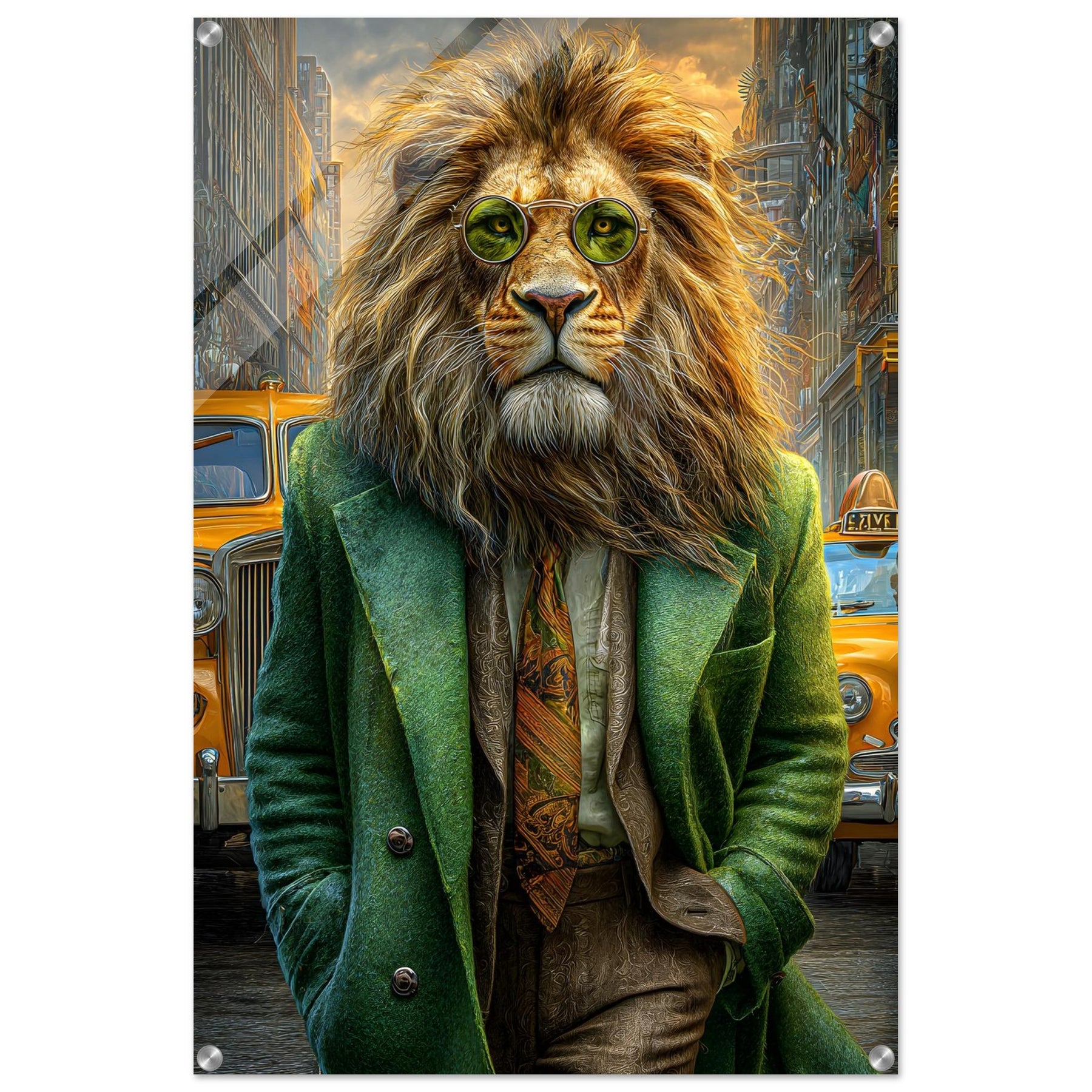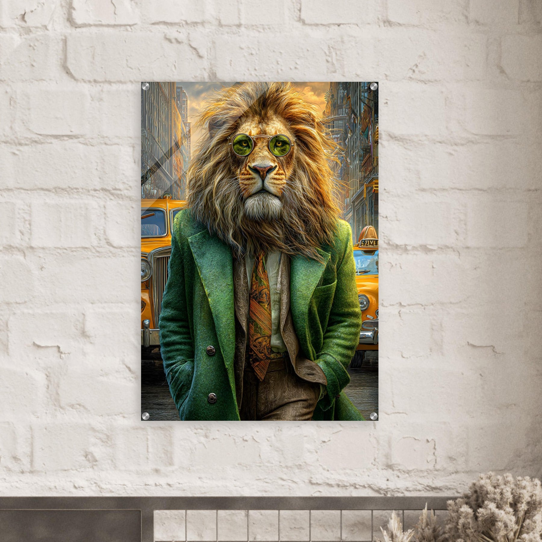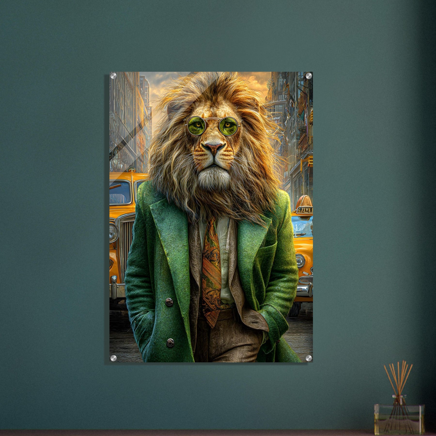 Transform your space with Urban Lion Swagger, a bold and imaginative acrylic wall art piece that blends wildlife majesty with sleek modern design. Featuring a vibrant lion strolling through a bustling cityscape in a stylish green suit and sunglasses, this artwork delivers a stunning mix of high-gloss elegance and wild personality.