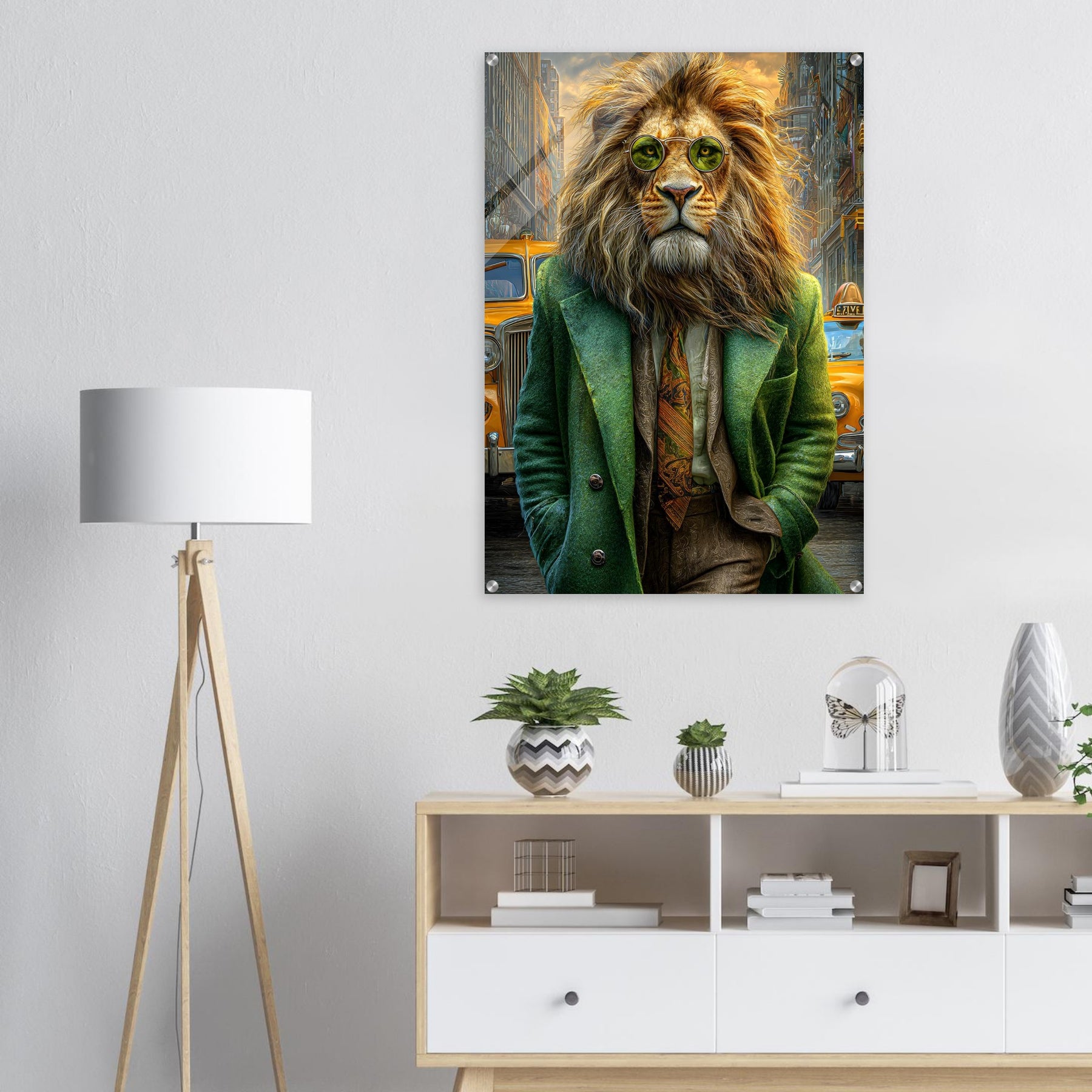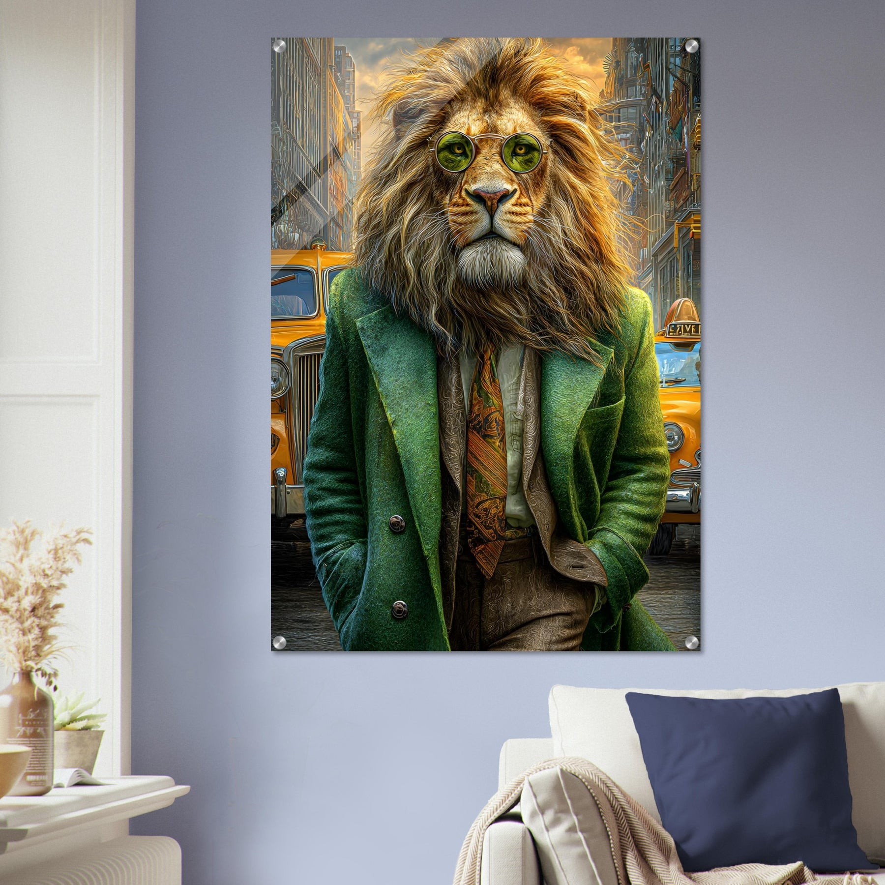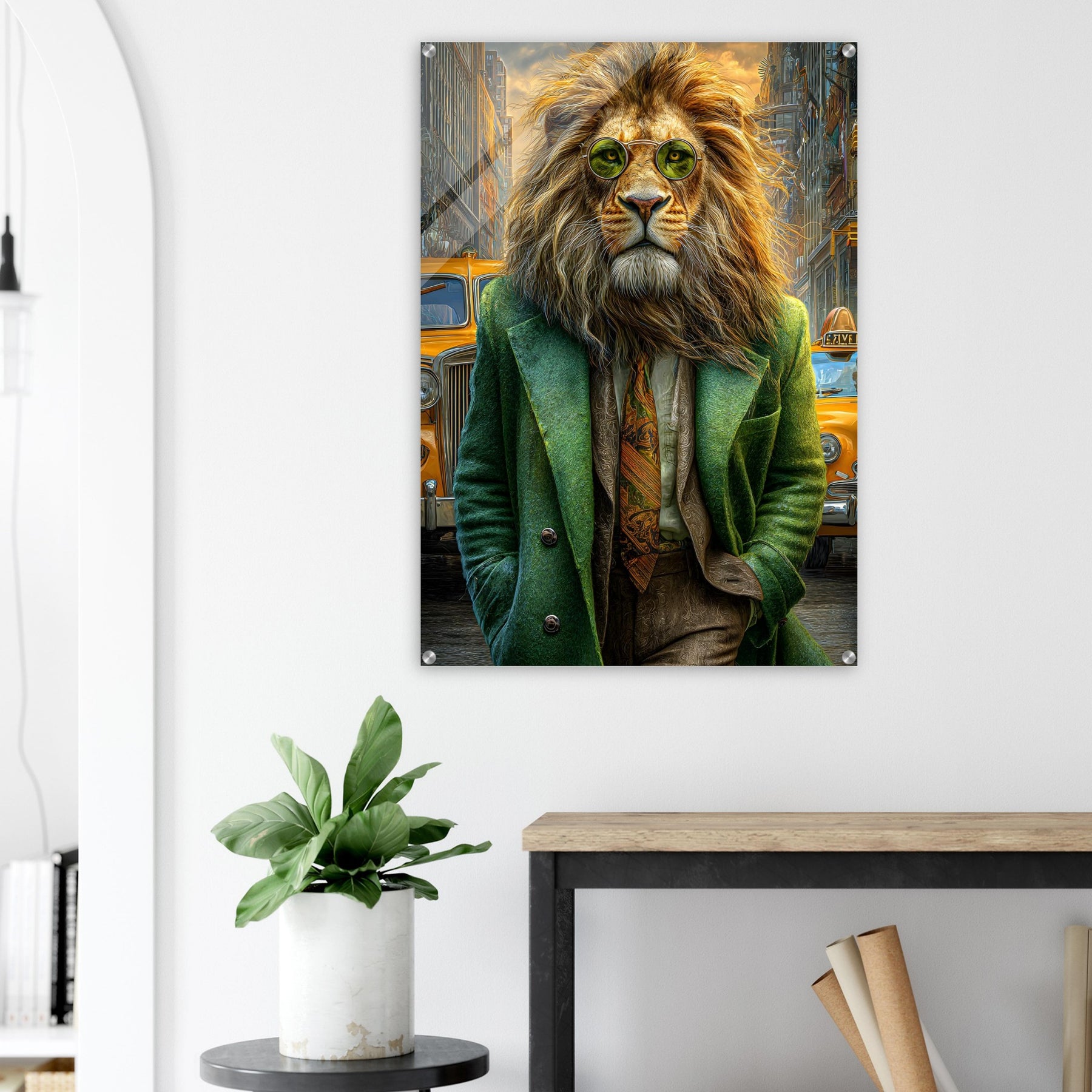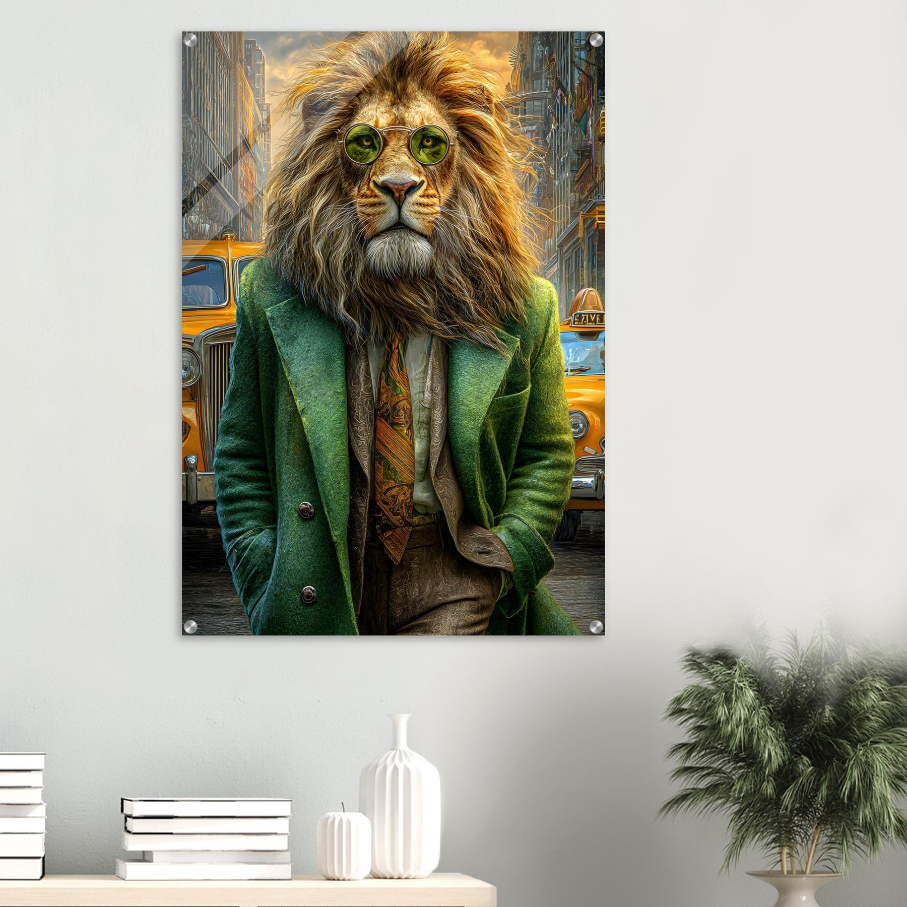 Transform your space with Urban Lion Swagger, a bold and imaginative acrylic wall art piece that blends wildlife majesty with sleek modern design. Featuring a vibrant lion strolling through a bustling cityscape in a stylish green suit and sunglasses, this artwork delivers a stunning mix of high-gloss elegance and wild personality.