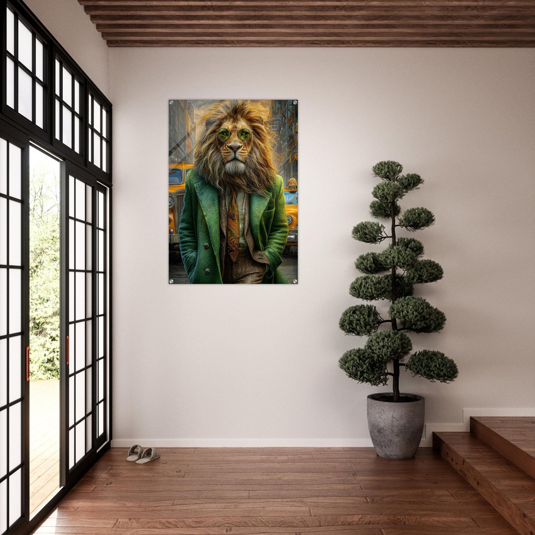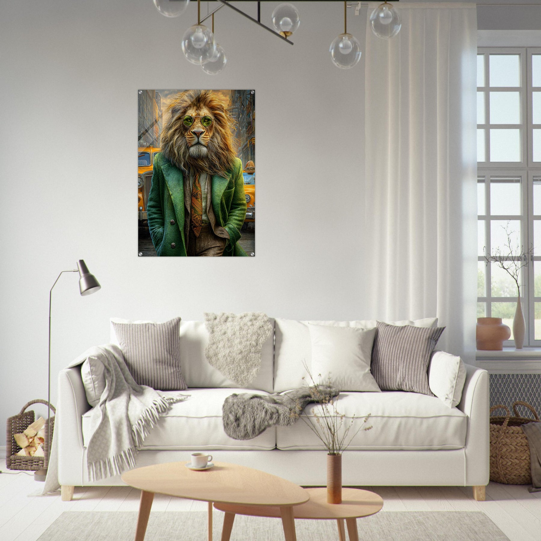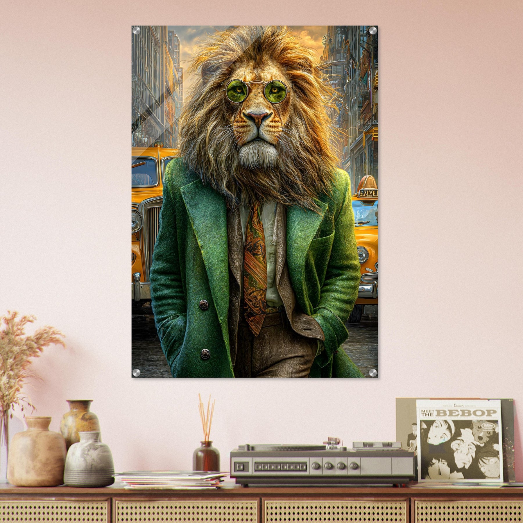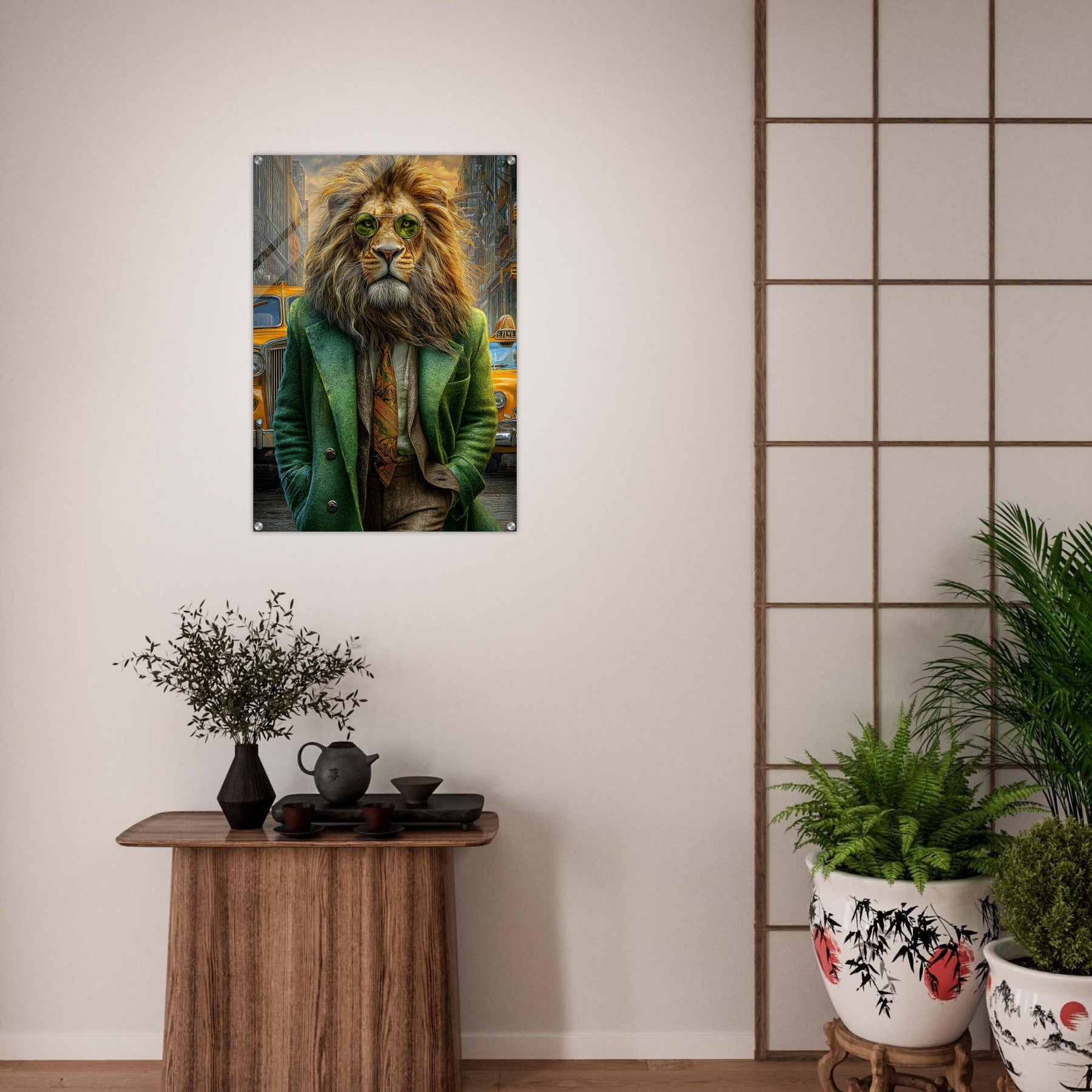 Transform your space with Urban Lion Swagger, a bold and imaginative acrylic wall art piece that blends wildlife majesty with sleek modern design. Featuring a vibrant lion strolling through a bustling cityscape in a stylish green suit and sunglasses, this artwork delivers a stunning mix of high-gloss elegance and wild personality.