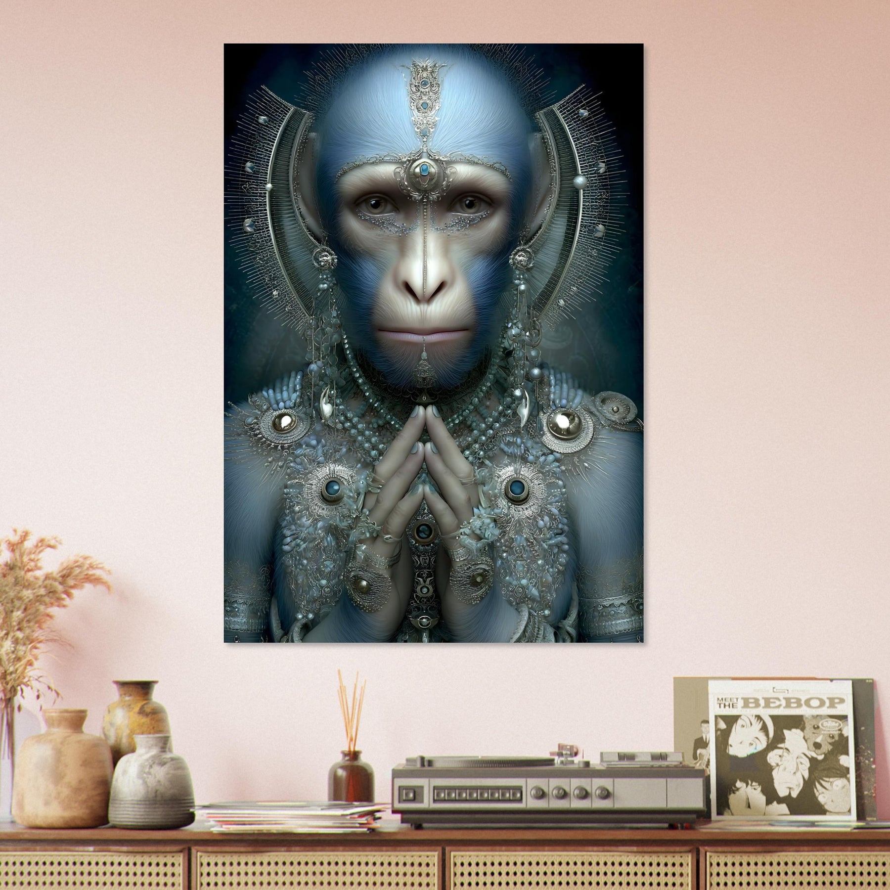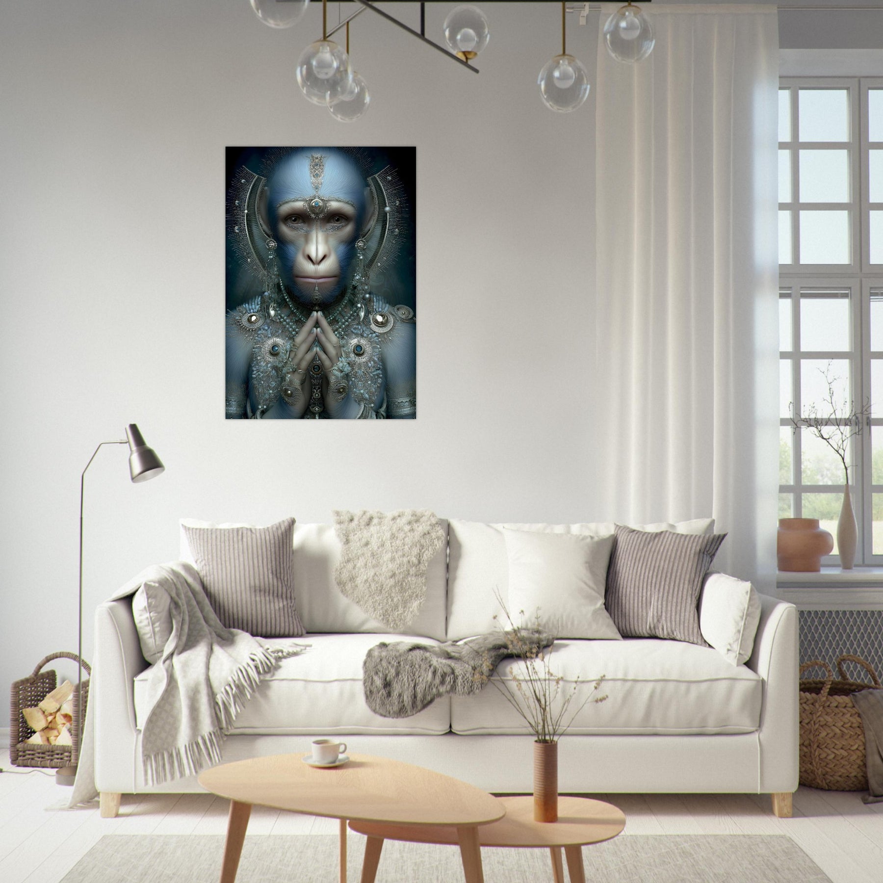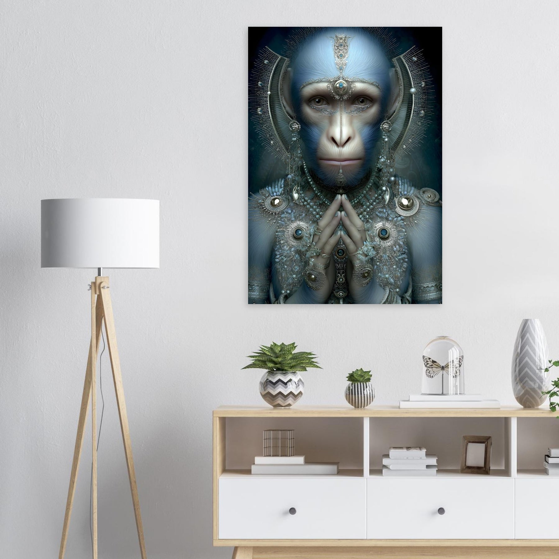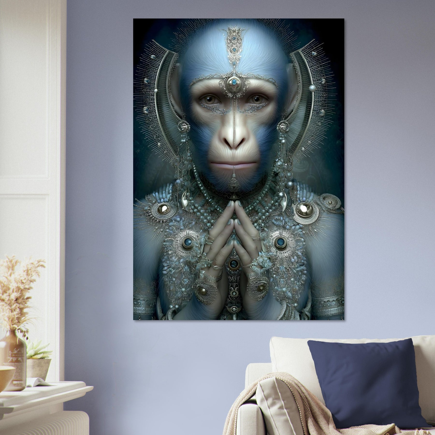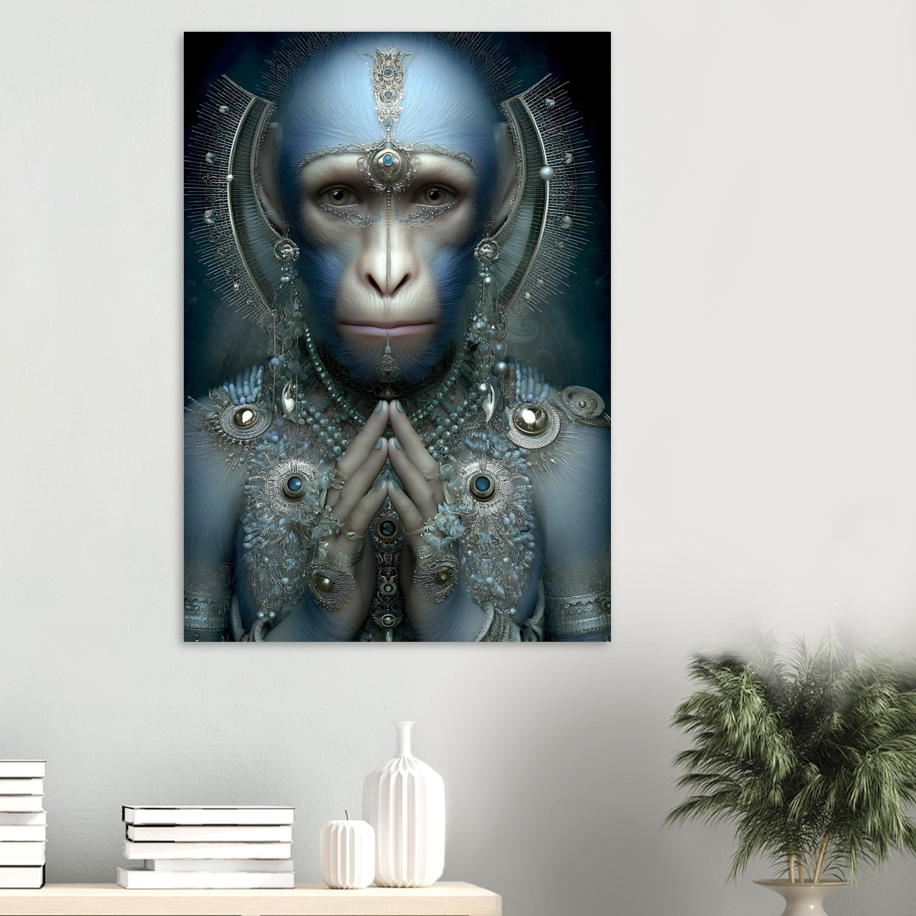Transform your space with Sapphire Guardian, a captivating aluminum wall art piece featuring a blue-hued monkey adorned with intricate jewelry. Blending elements of nature with artistic elegance, this surreal portrait creates a powerful visual statement filled with symbolism, mystery, and refined creativity.