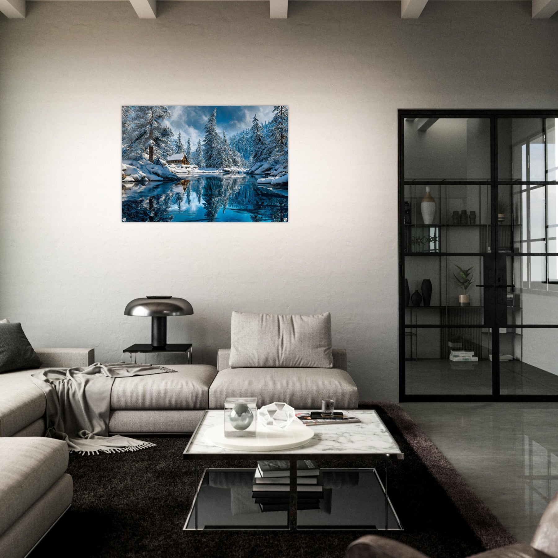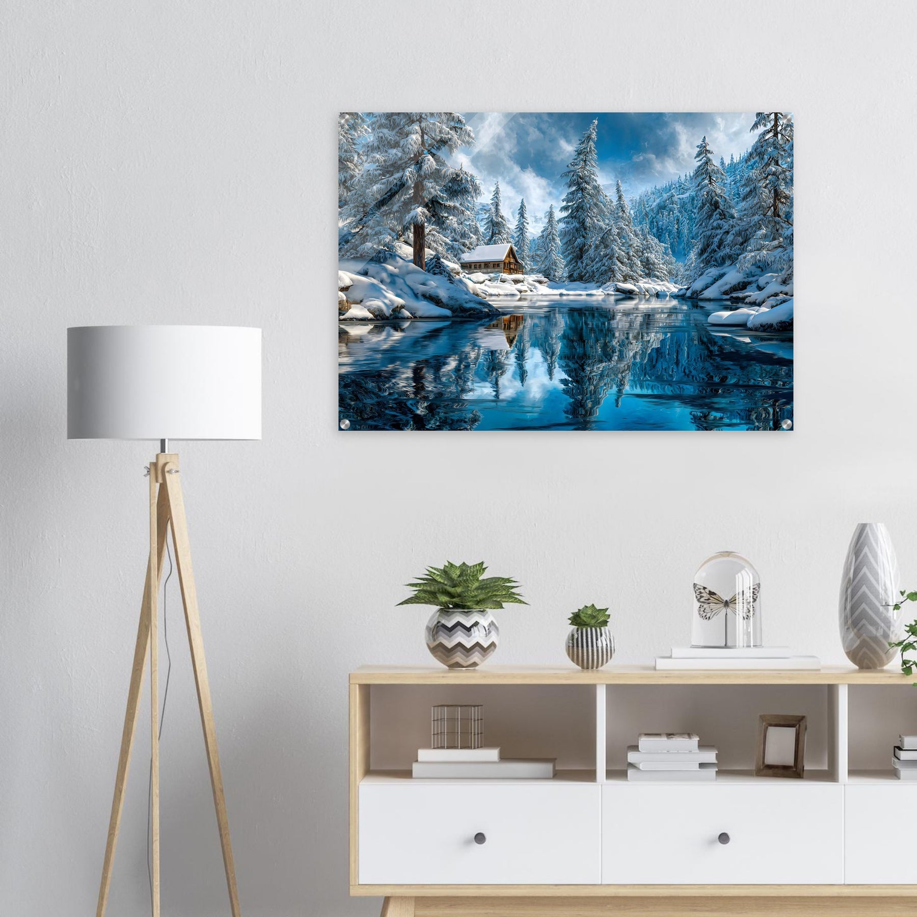 Printed behind glossy acrylic glass, this artwork enhances depth, brilliance, and clarity—making the winter reflections and crisp details truly shine. Ideal for high-end interiors, statement walls, and modern luxury spaces.