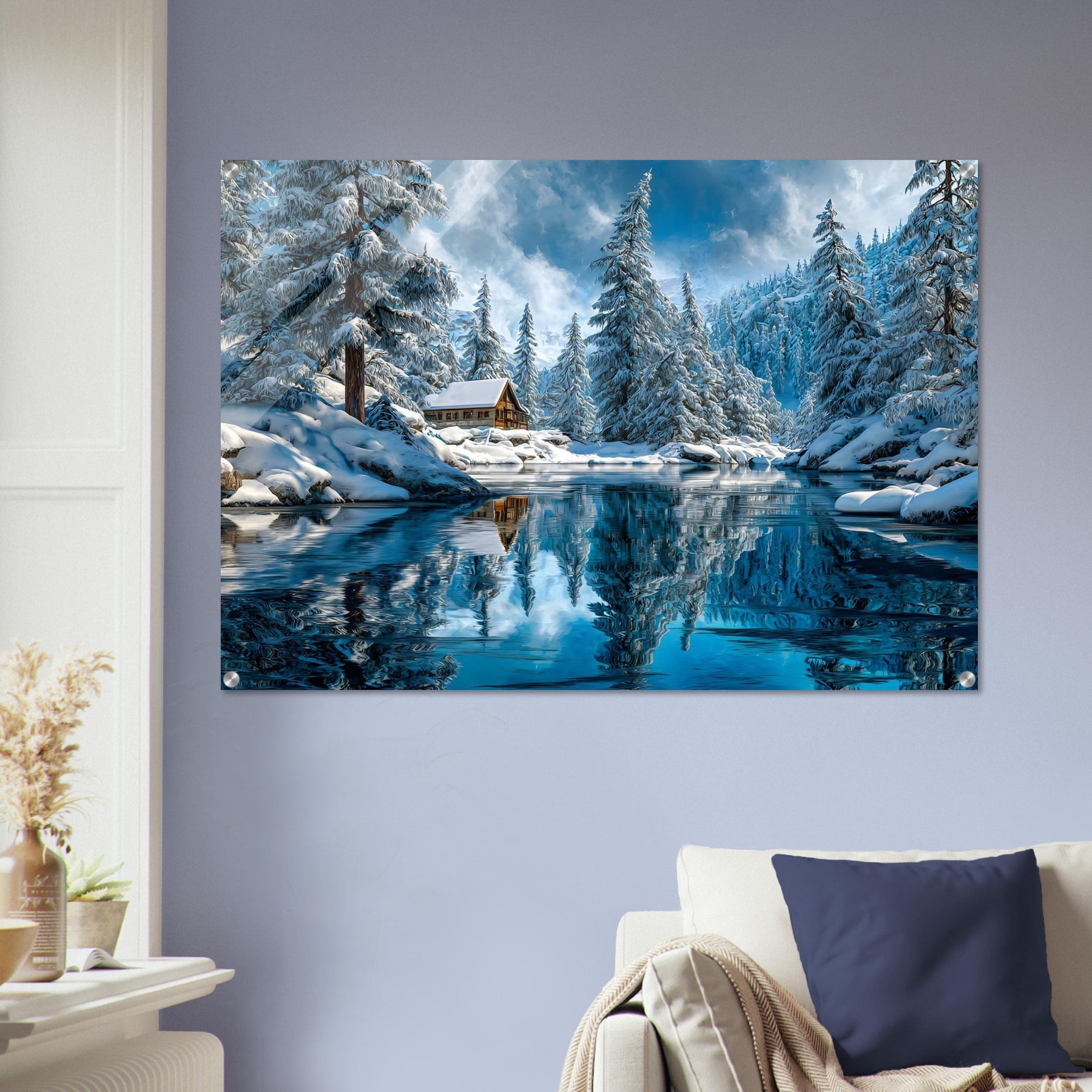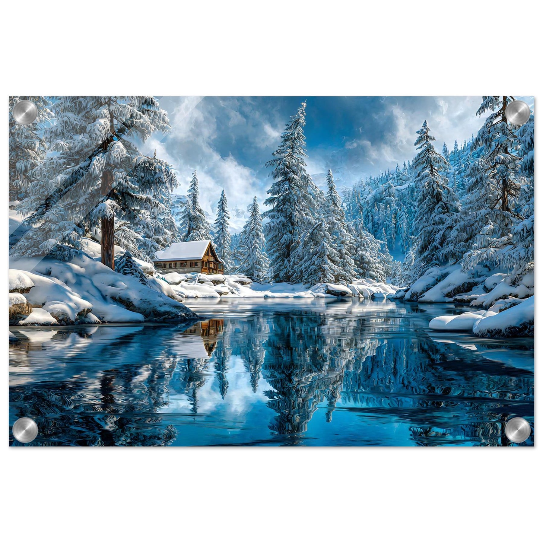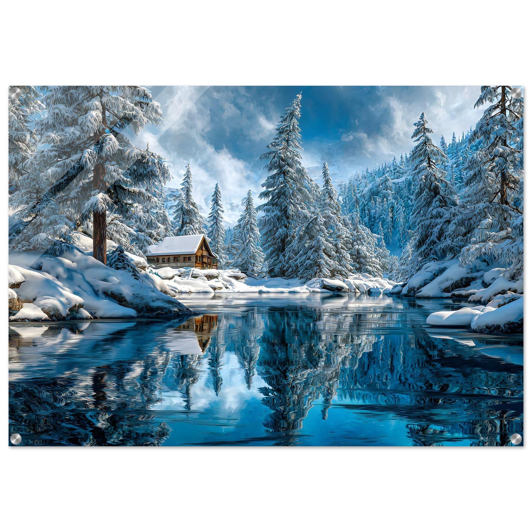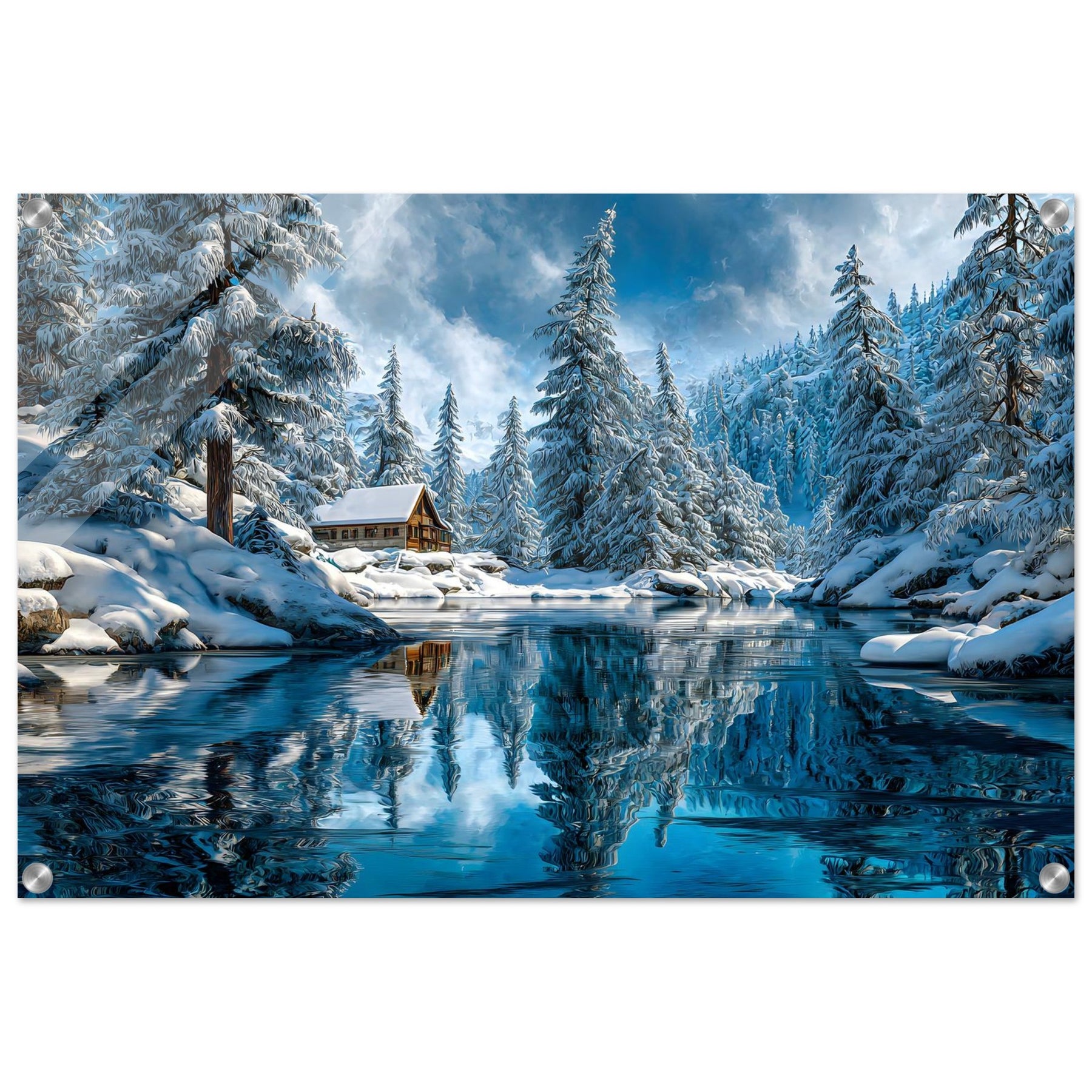 Transform your space with Winter Cabin Serenity, a striking acrylic wall art featuring a cozy cabin nestled among snow-covered pine trees, with a glassy river reflecting the radiant winter sky. The scene feels immersive, luminous, and luxurious.