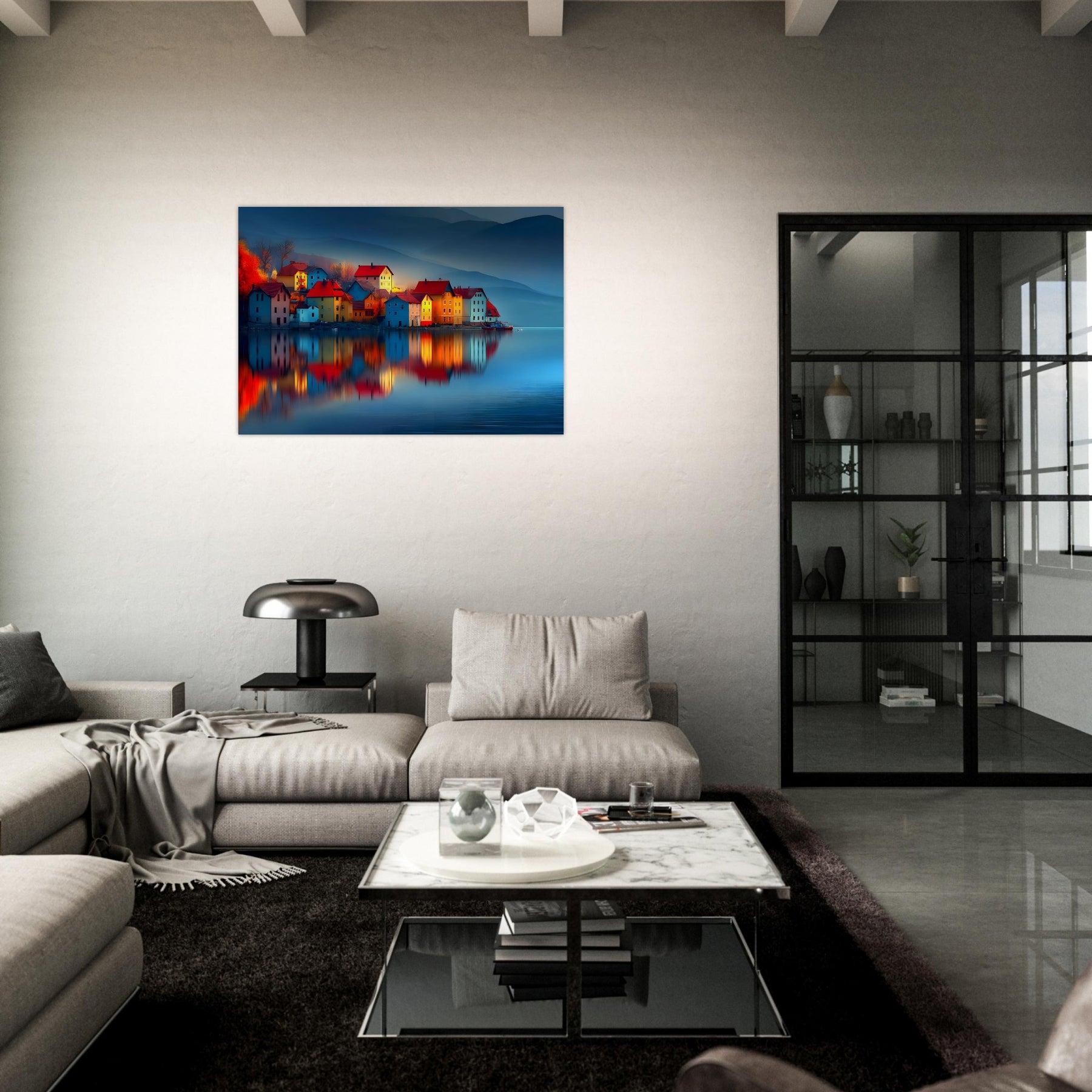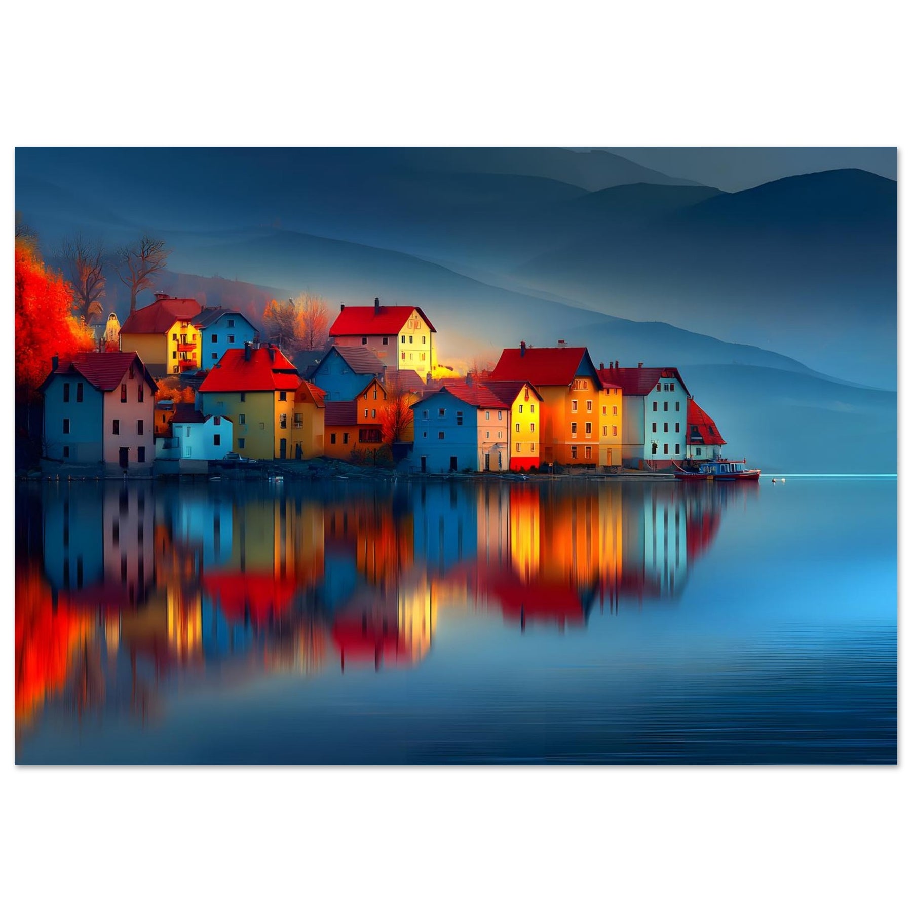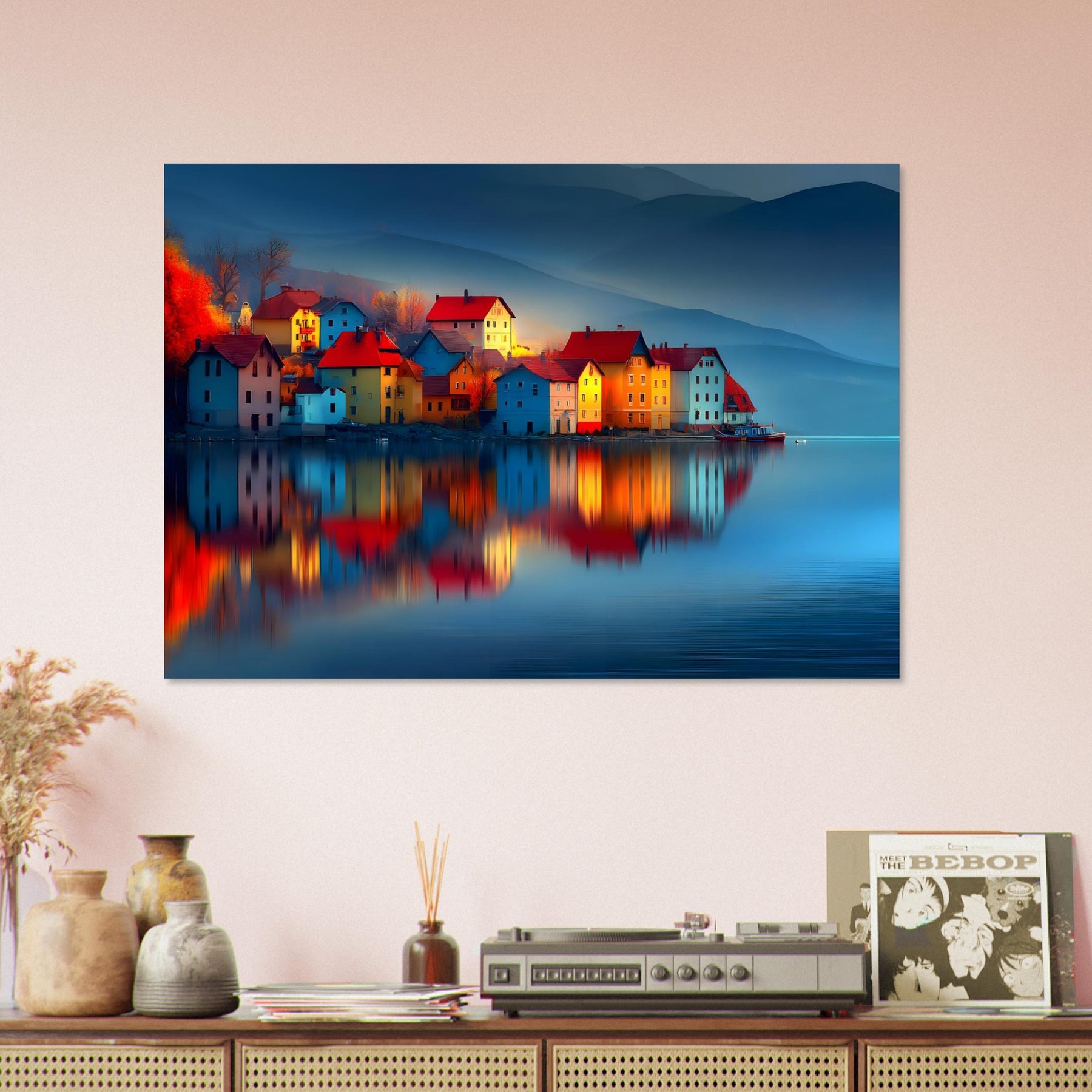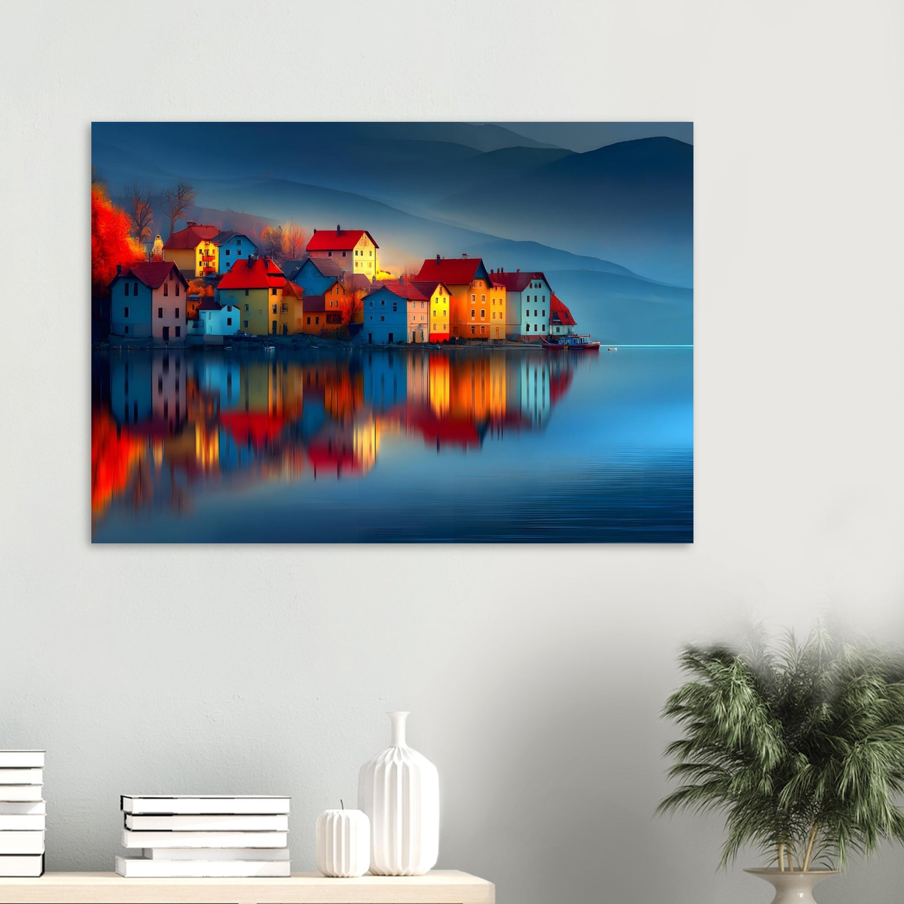 Bring serene evening beauty into your space with Twilight Lakeside Village, a stunning aluminum wall art showcasing a picturesque lakeside village at twilight. Vibrant houses line the shore, their colorful facades reflecting beautifully on calm waters beneath a soft, glowing evening sky, creating a peaceful and romantic atmosphere.