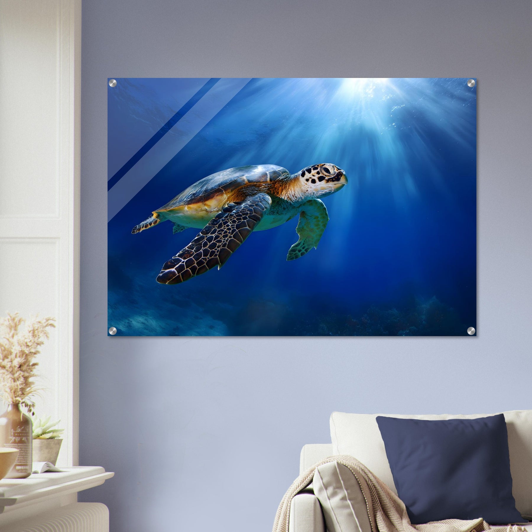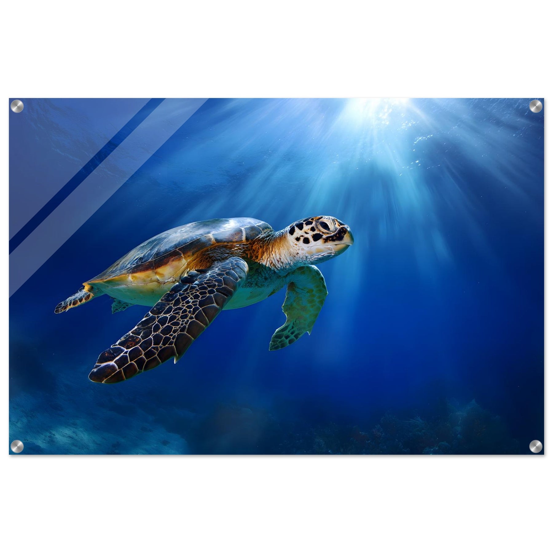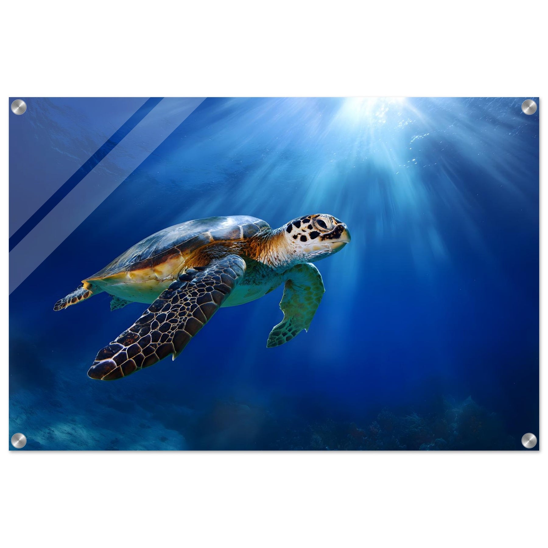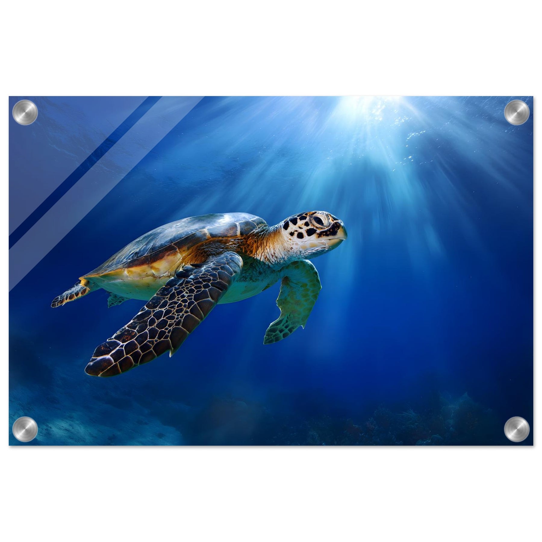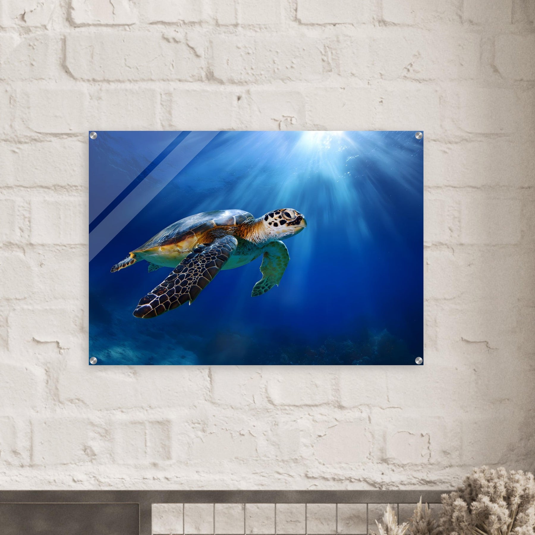 Transform your space with Ocean Light Guardian, a premium acrylic wall art piece that brings this underwater scene to life with luminous depth and clarity. The radiant blue waters and graceful sea turtle glow beneath a glossy acrylic surface, creating a striking and contemporary visual statement.