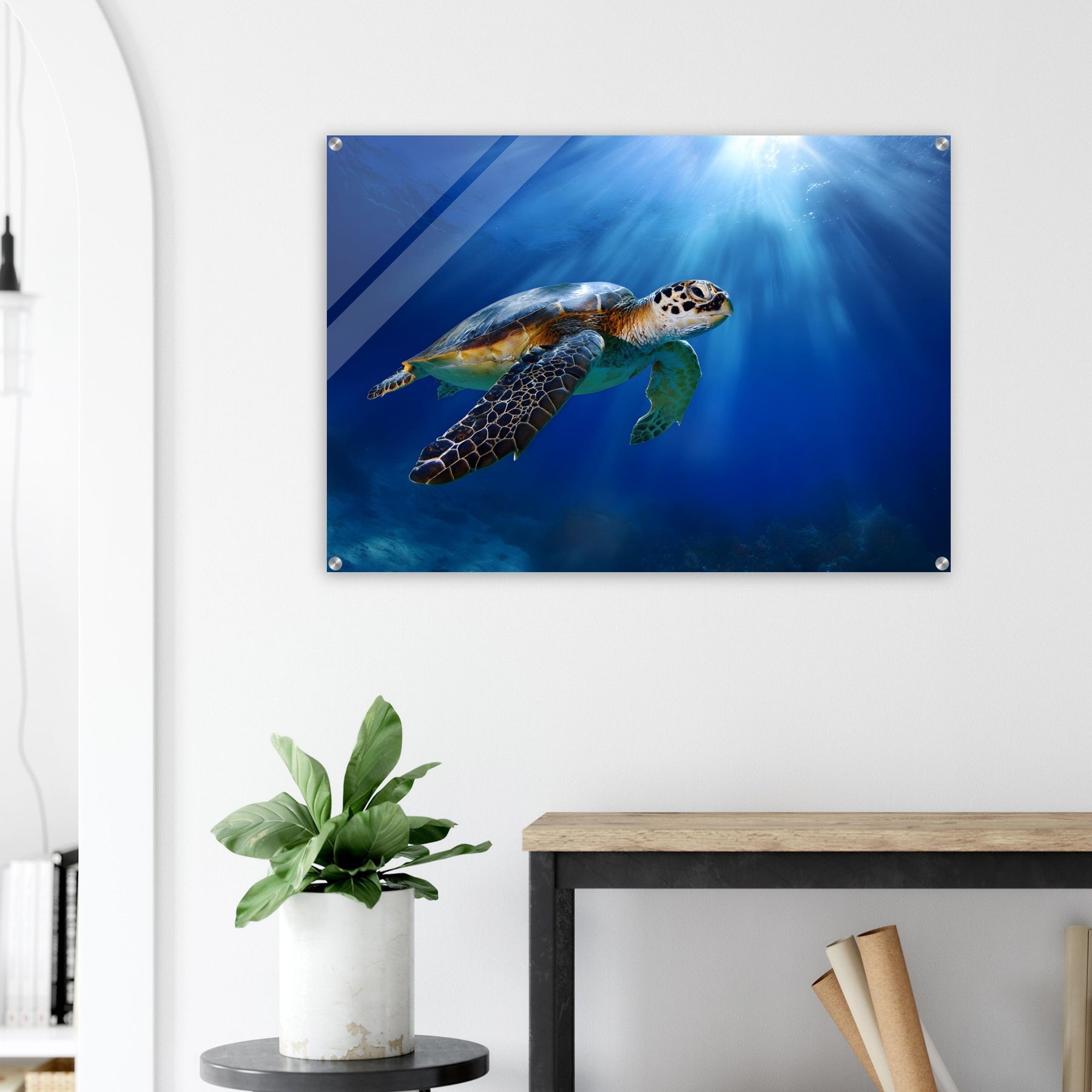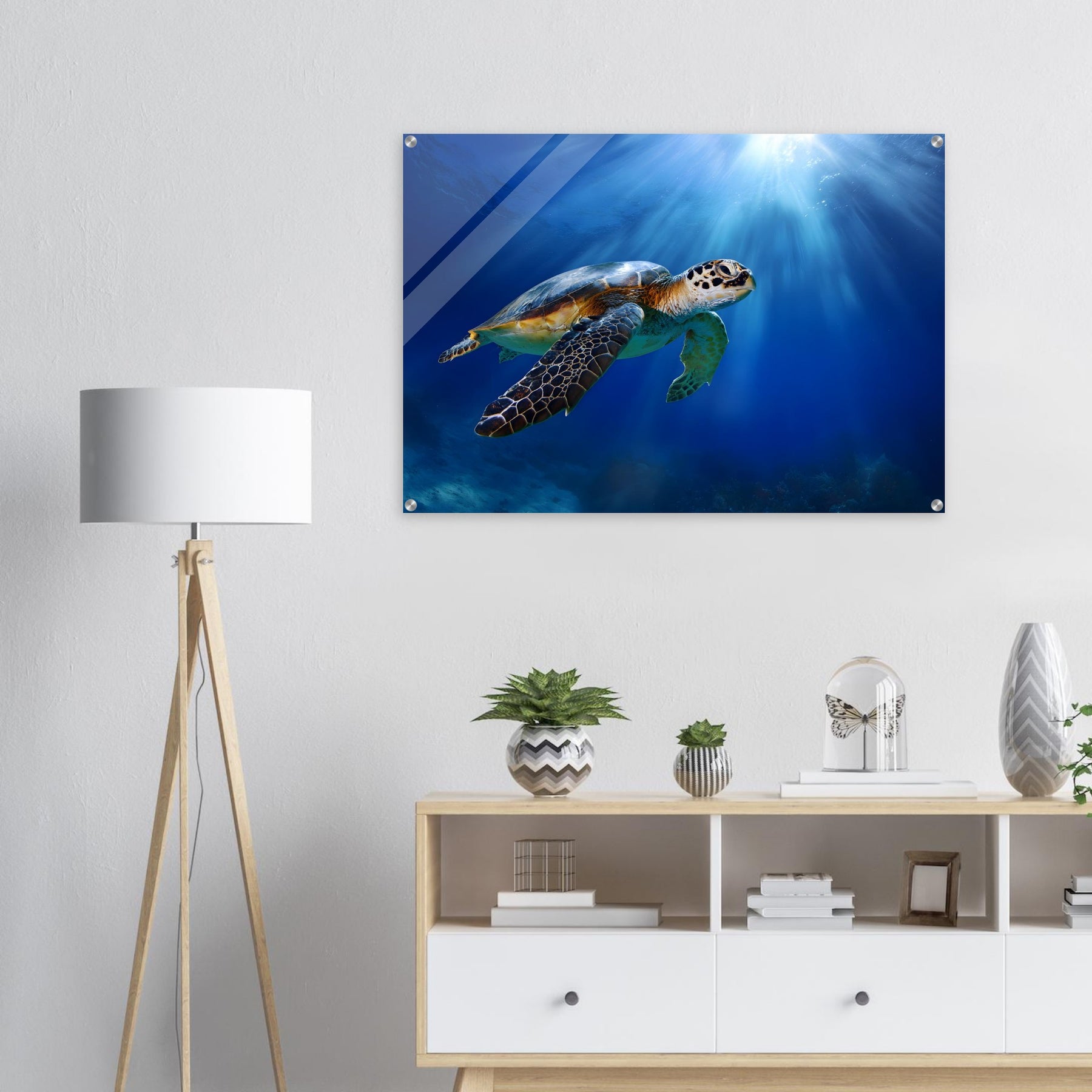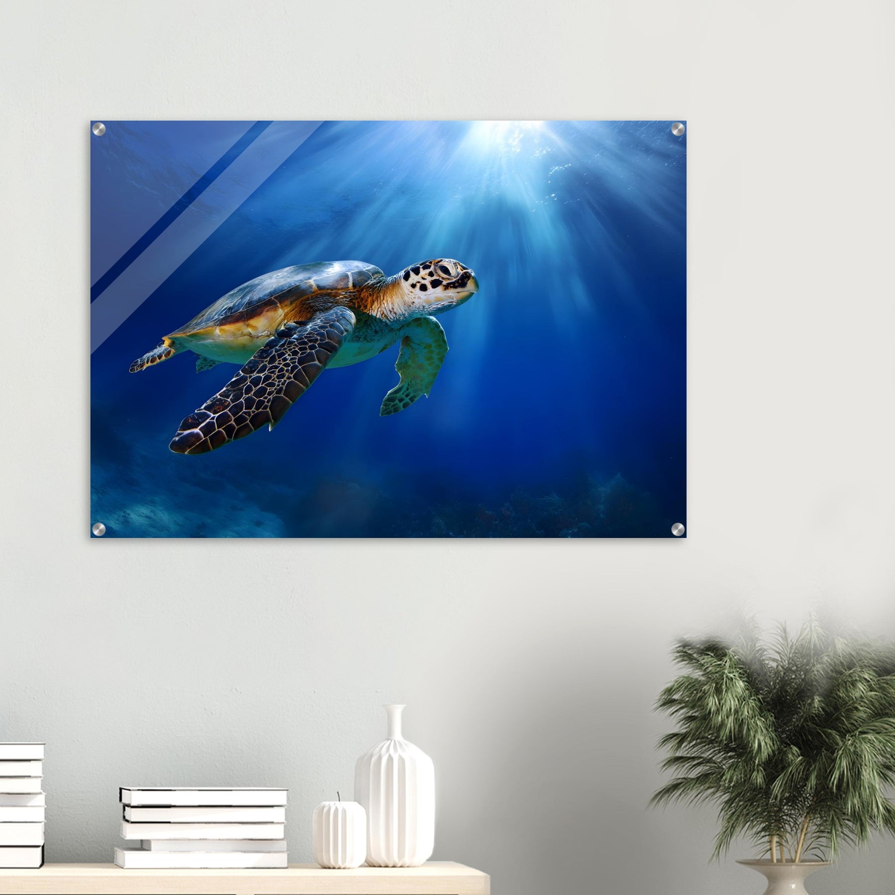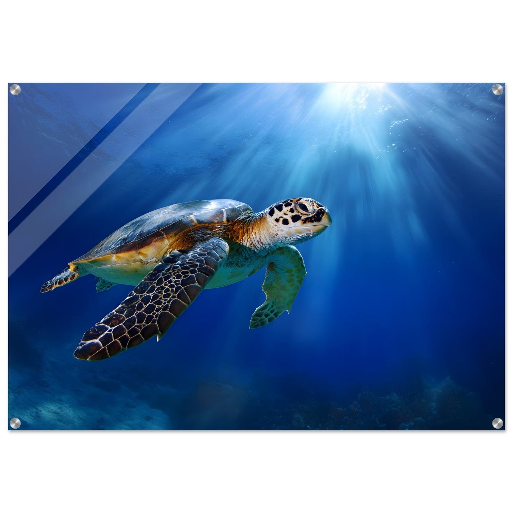 Transform your space with Ocean Light Guardian, a premium acrylic wall art piece that brings this underwater scene to life with luminous depth and clarity. The radiant blue waters and graceful sea turtle glow beneath a glossy acrylic surface, creating a striking and contemporary visual statement.