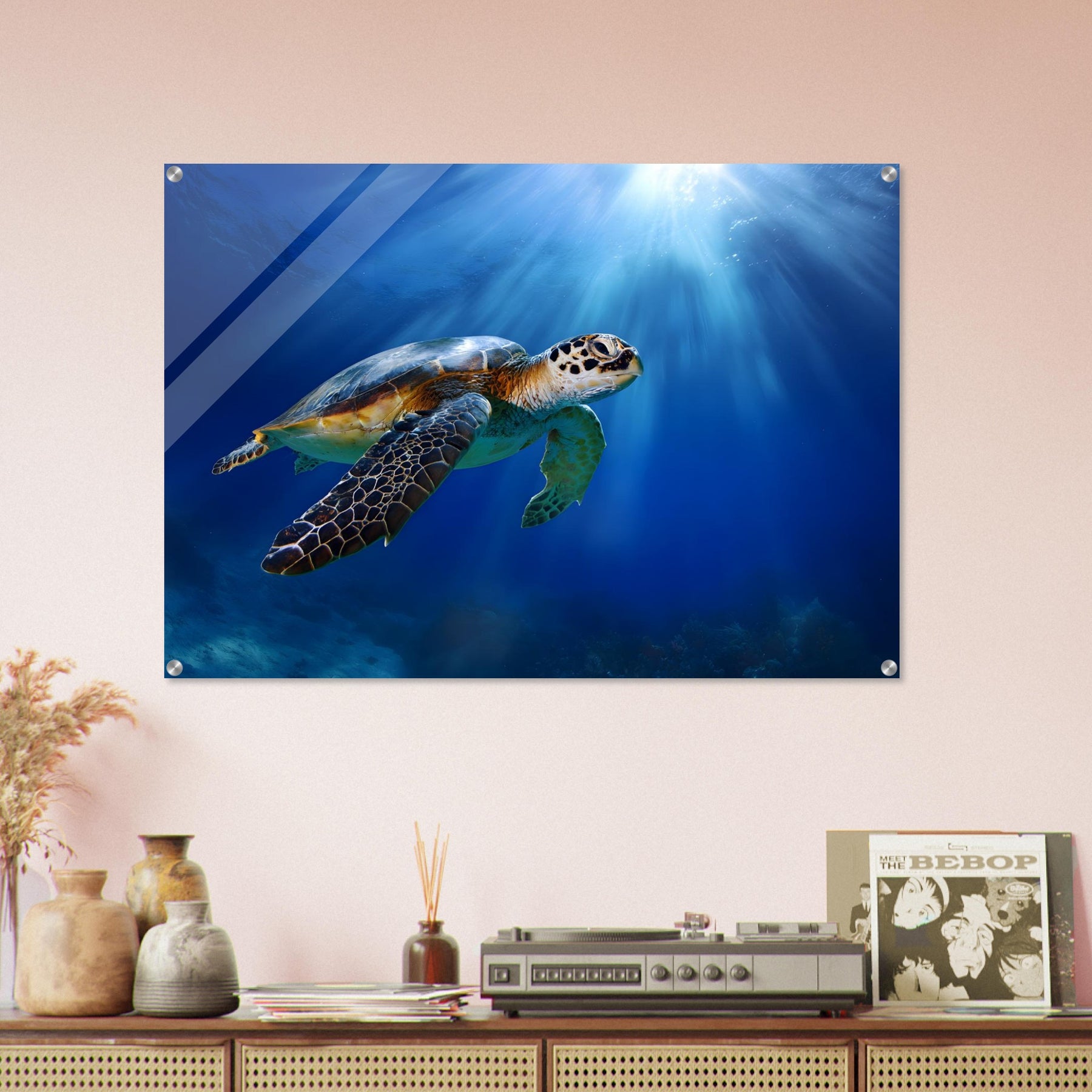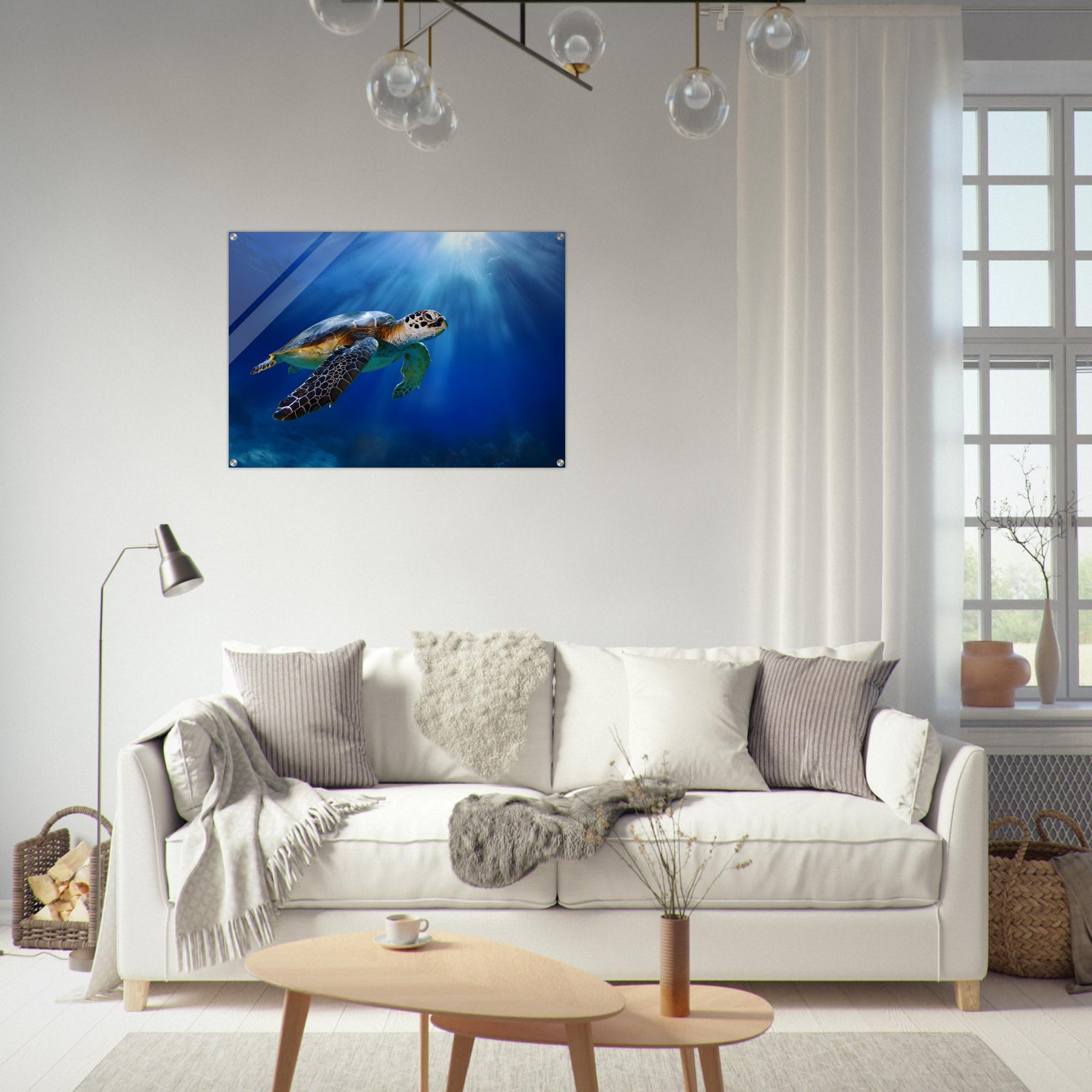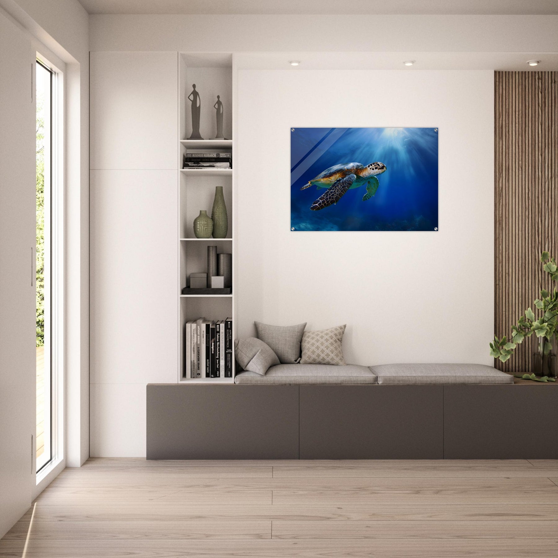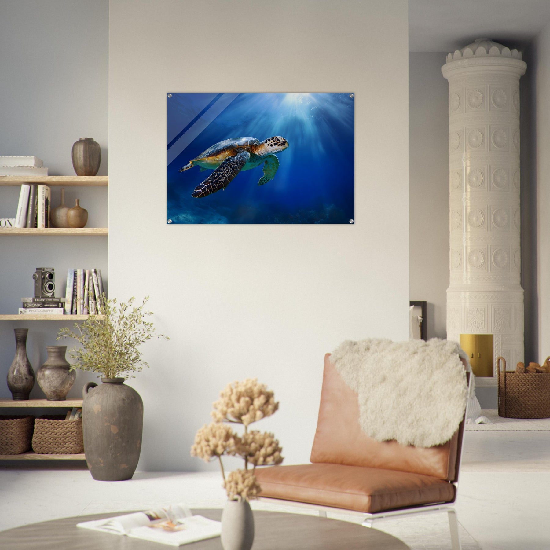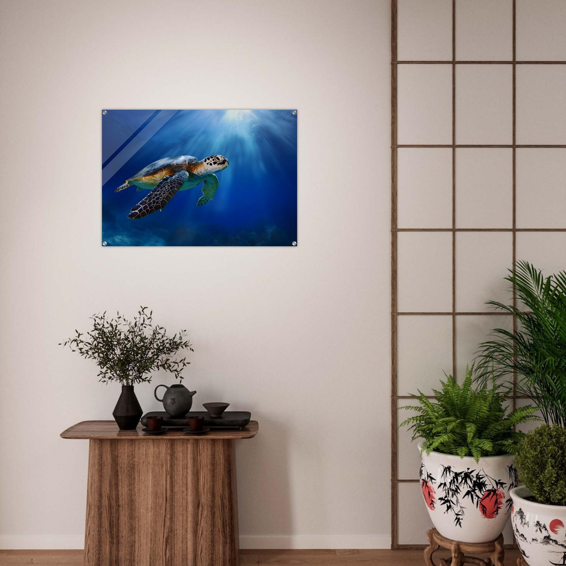Transform your space with Ocean Light Guardian, a premium acrylic wall art piece that brings this underwater scene to life with luminous depth and clarity. The radiant blue waters and graceful sea turtle glow beneath a glossy acrylic surface, creating a striking and contemporary visual statement.