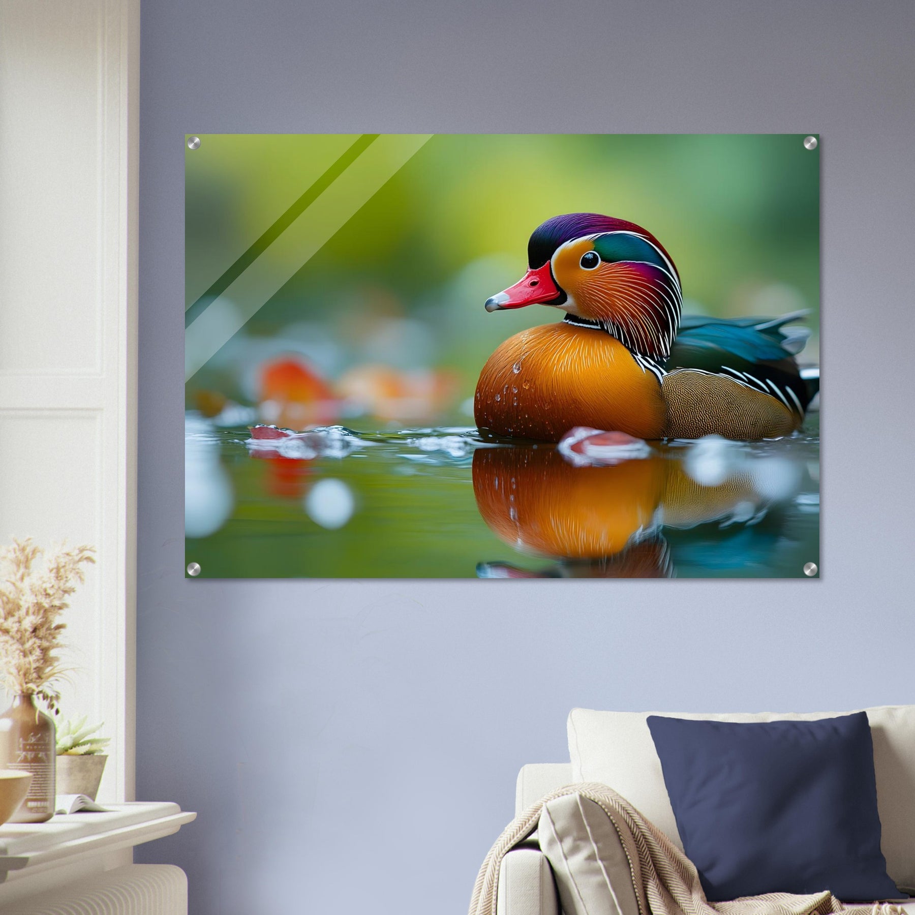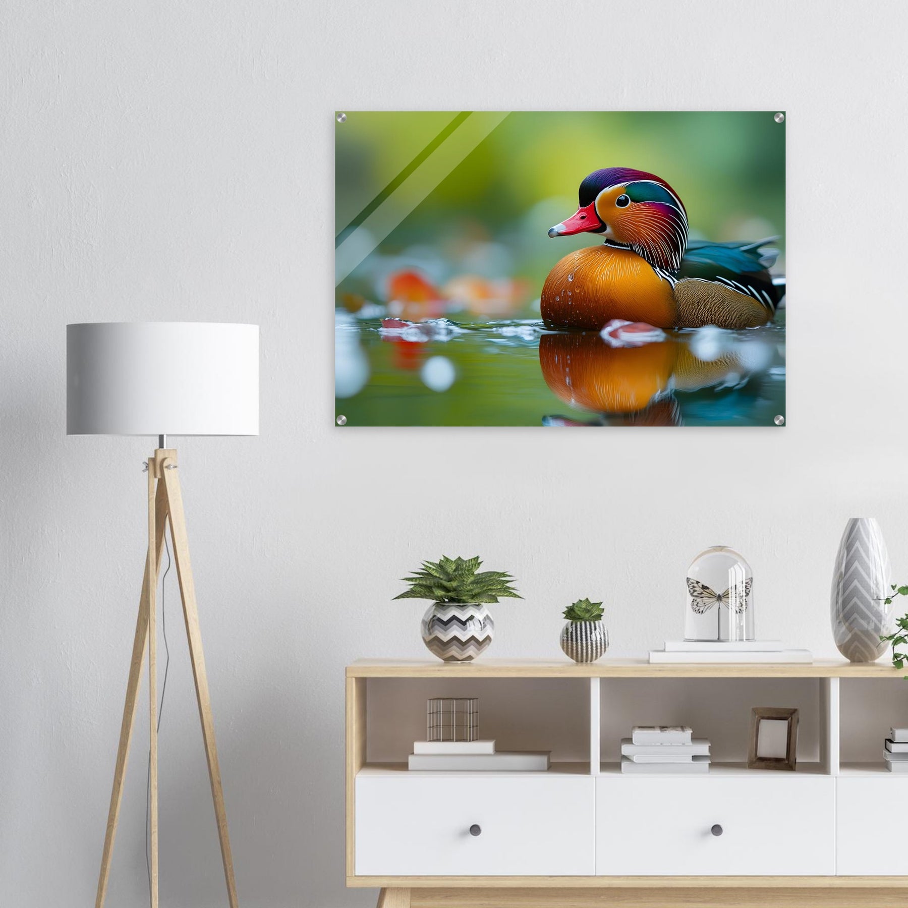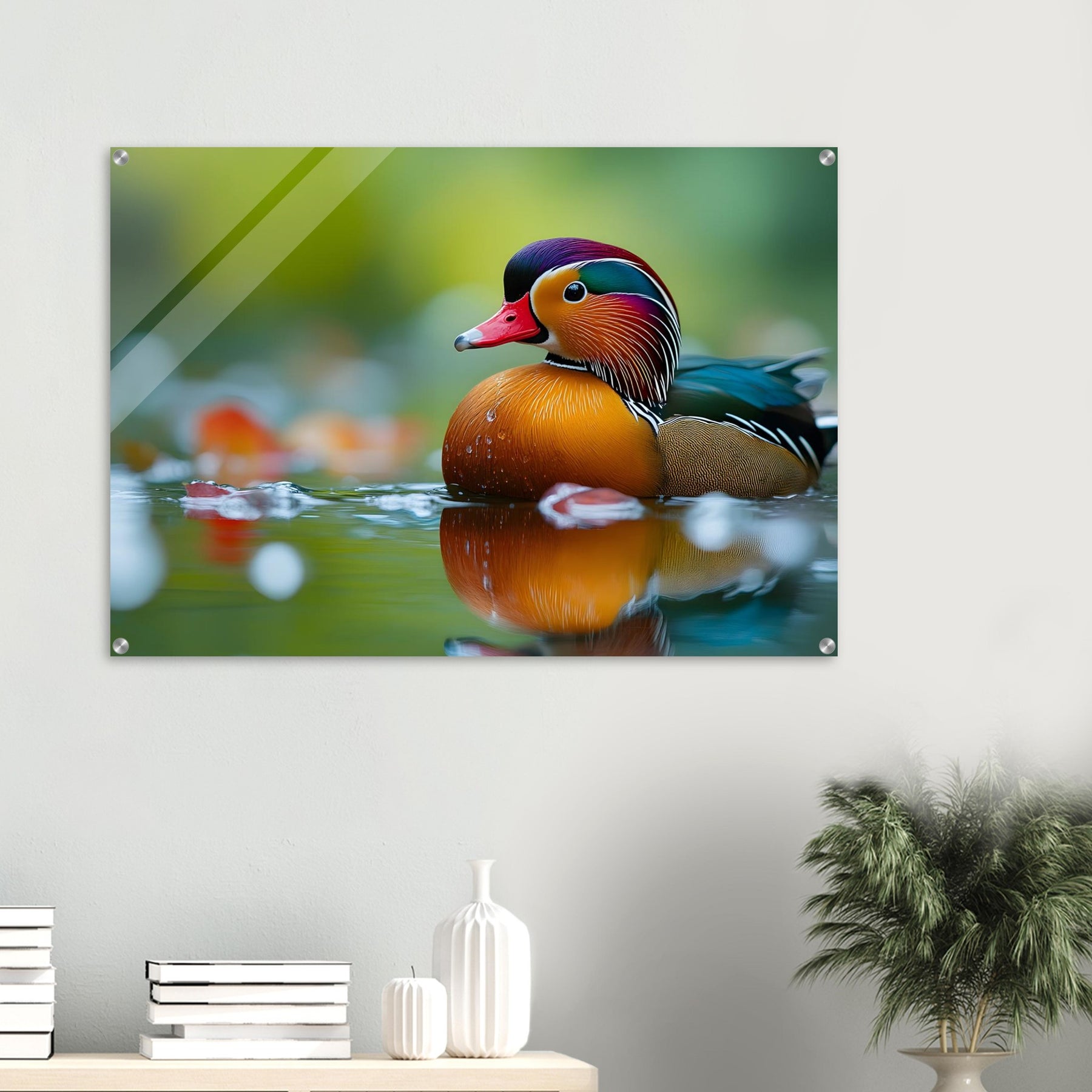 Make a luminous statement with Radiant Waters, a stunning acrylic wall art piece that enhances the brilliance of the mandarin duck’s colors and water reflections. The glossy, glass-like finish adds depth, clarity, and refined elegance.