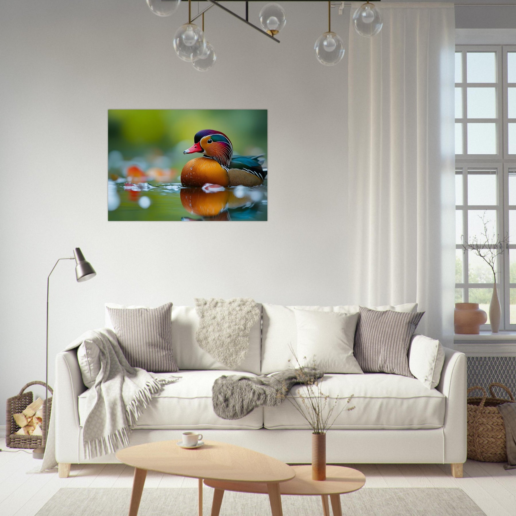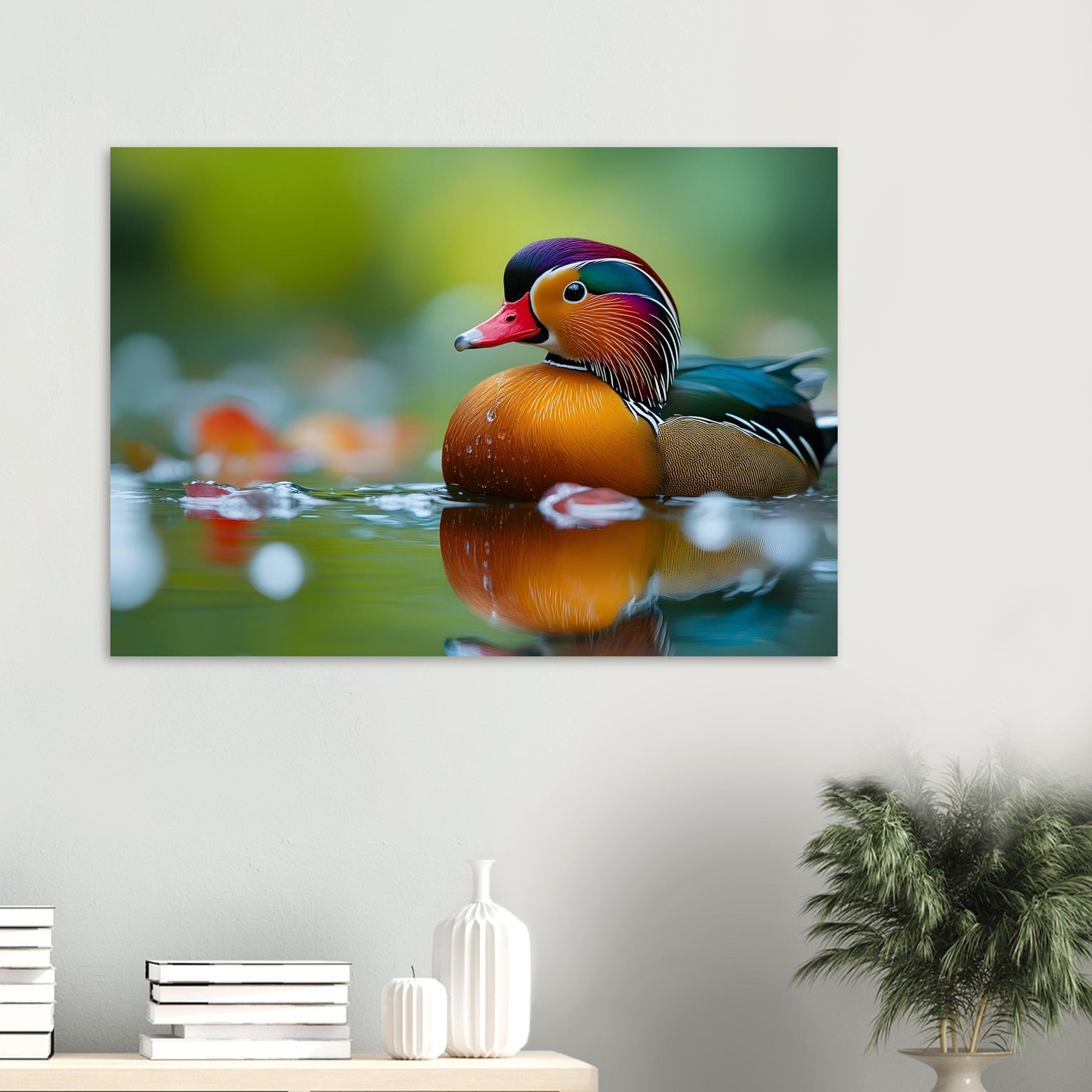 Transform your space with Radiant Waters, a captivating aluminum wall art piece featuring a vibrant mandarin duck gliding across a calm water surface. Its brilliant colors and intricate feather patterns are beautifully reflected in the water, capturing the serenity and natural elegance of this stunning moment.