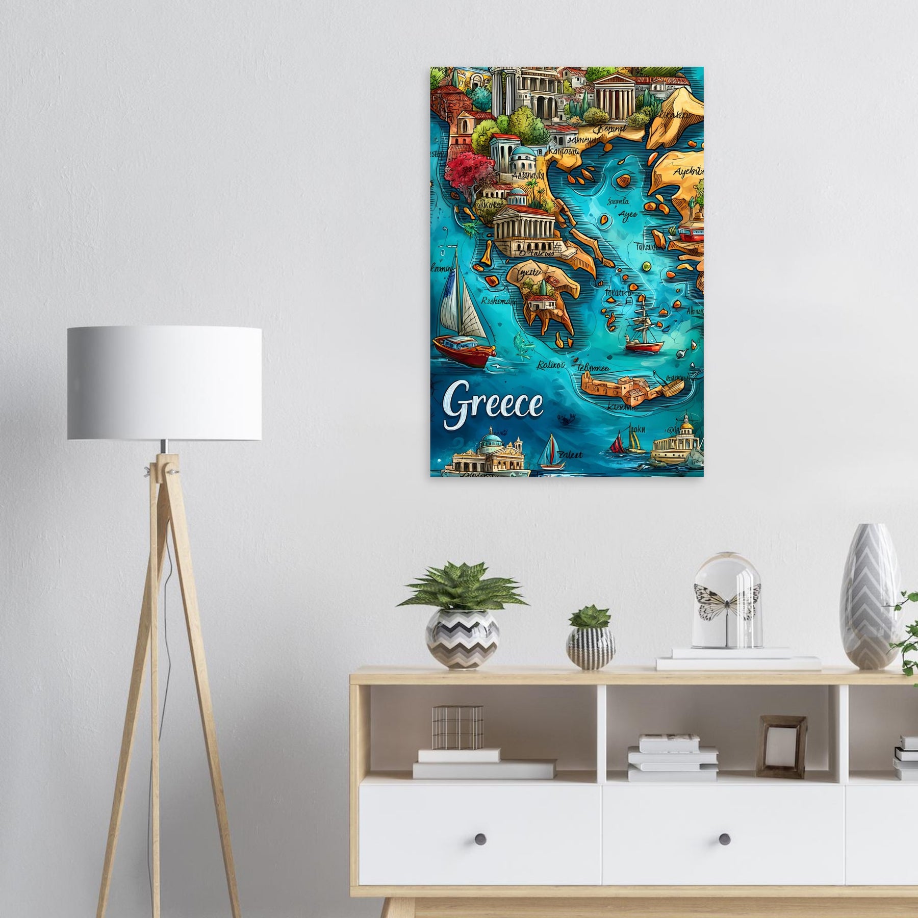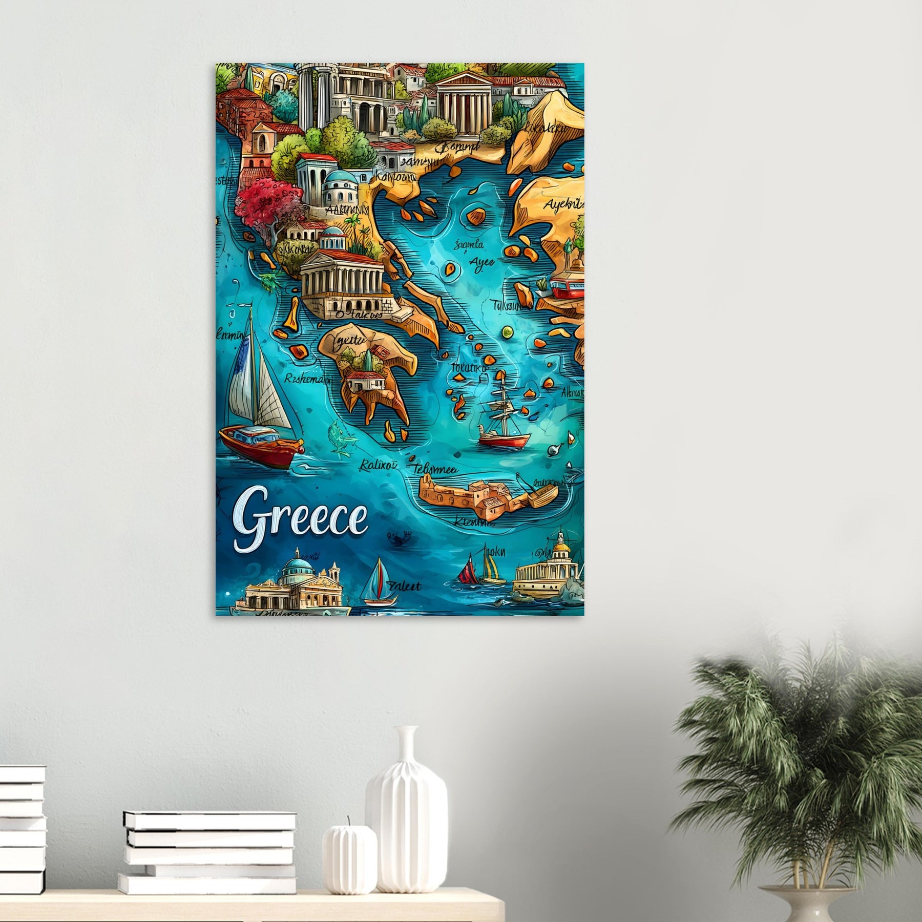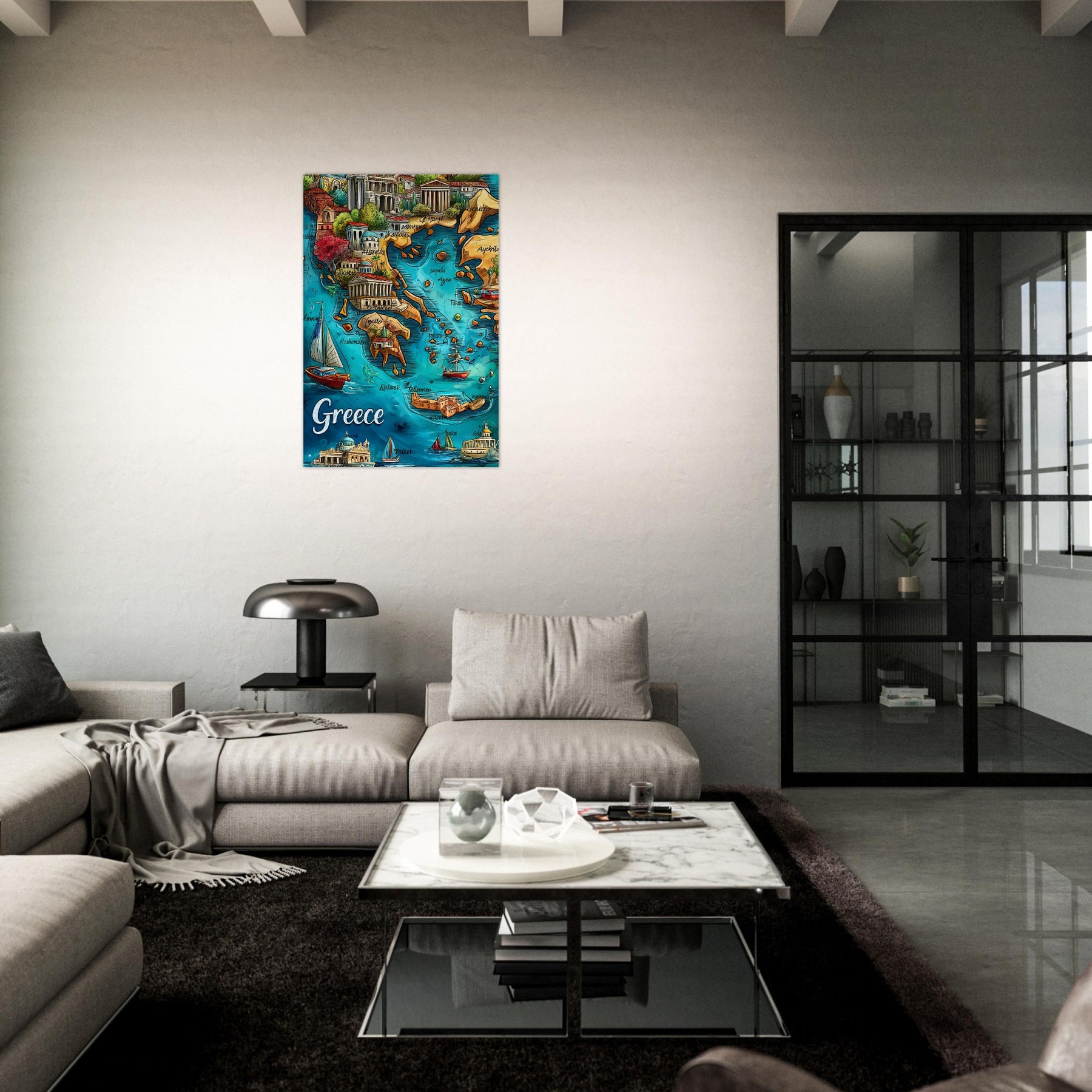 Bring the spirit, culture, and scenic beauty of Greece into your home with this captivating illustrated map aluminum wall art.
