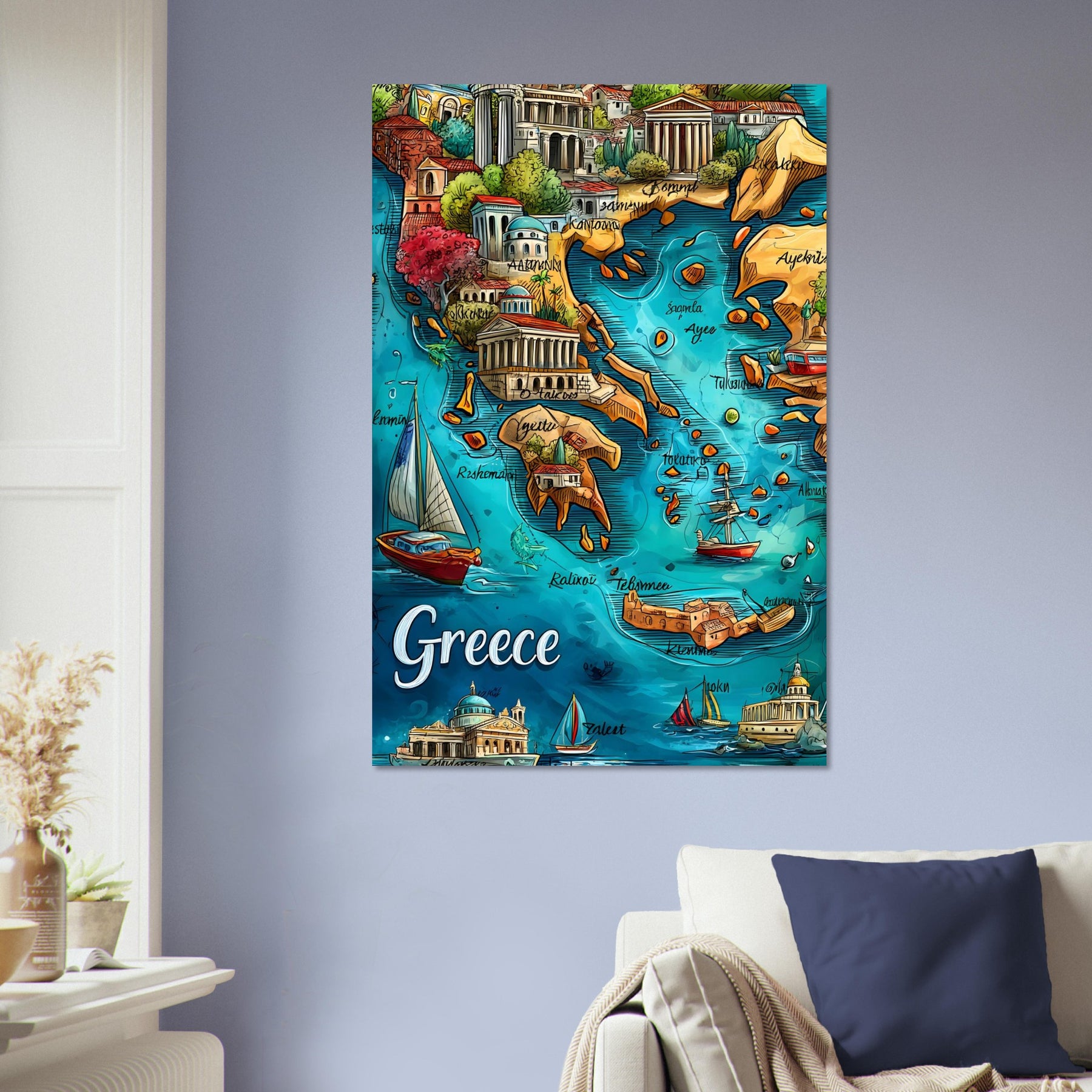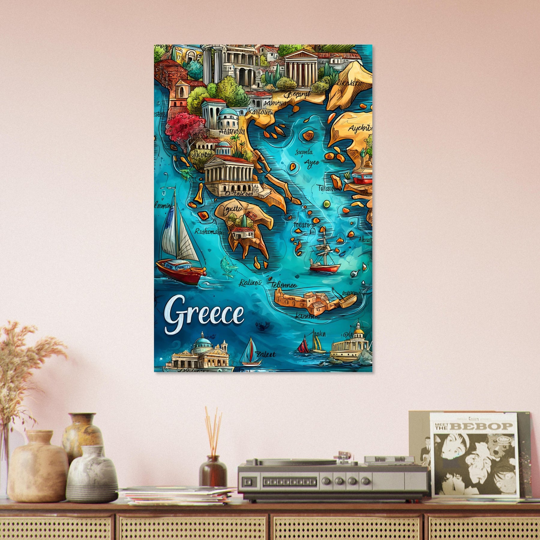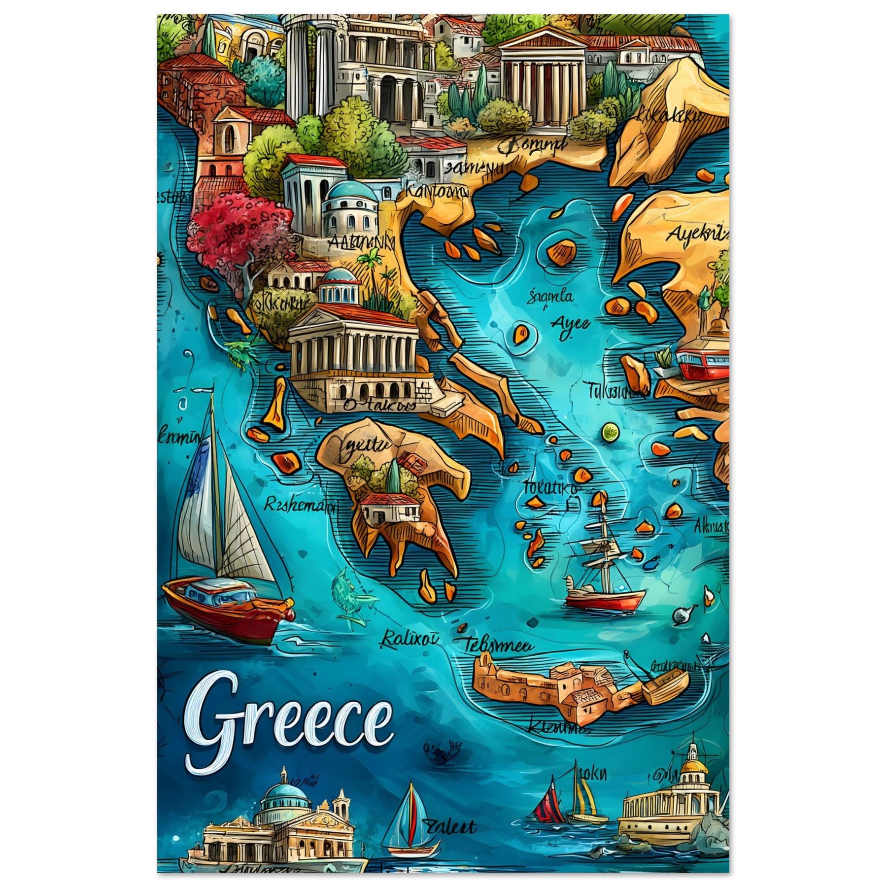 Bring the spirit, culture, and scenic beauty of Greece into your home with this captivating illustrated map aluminum wall art.