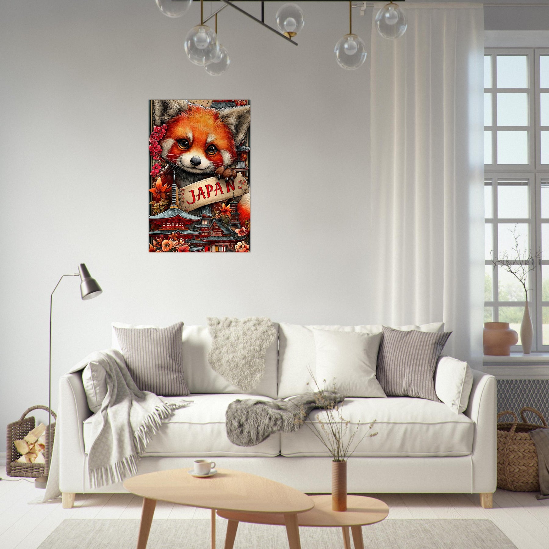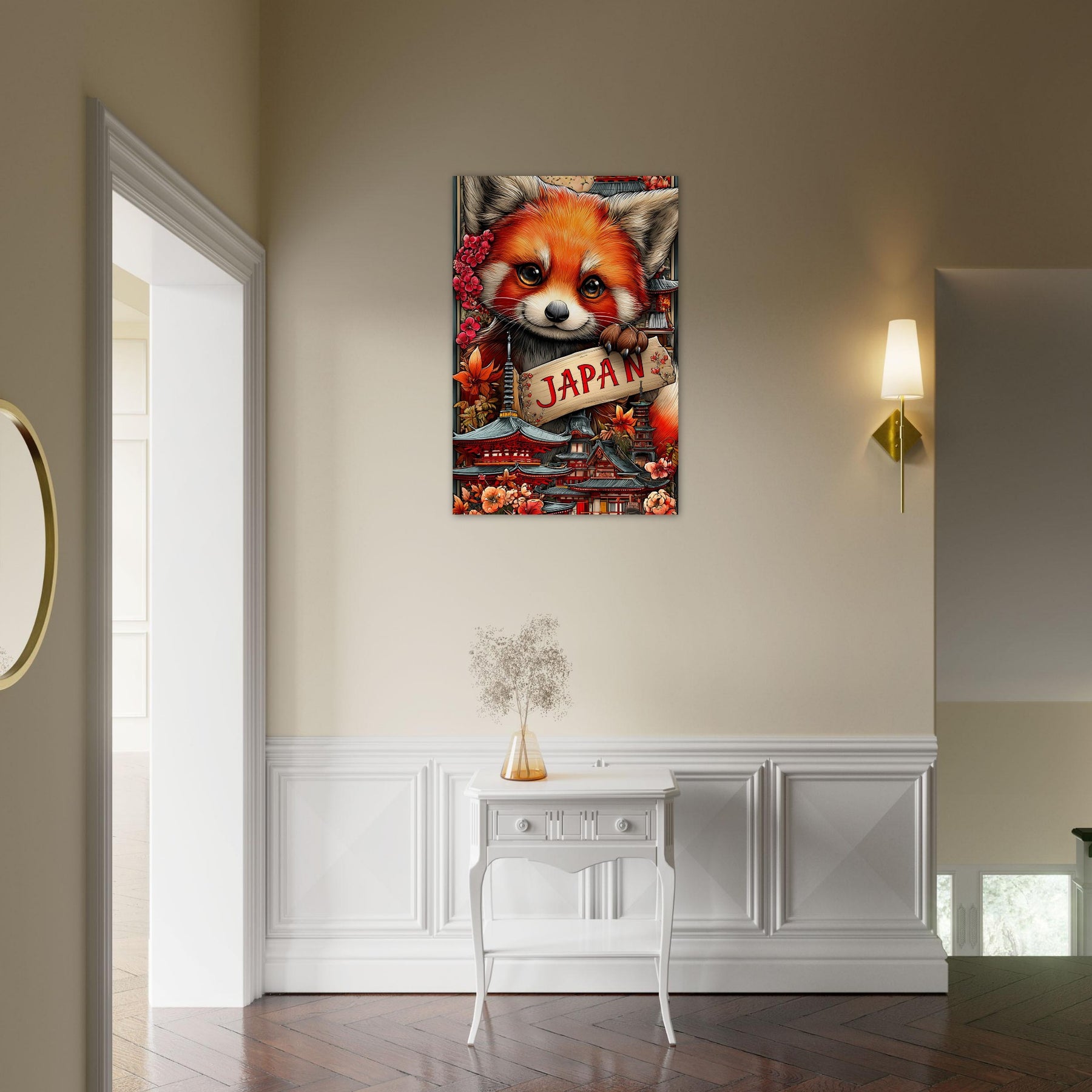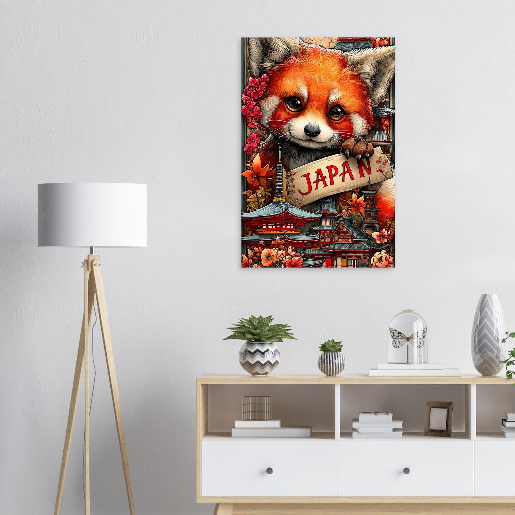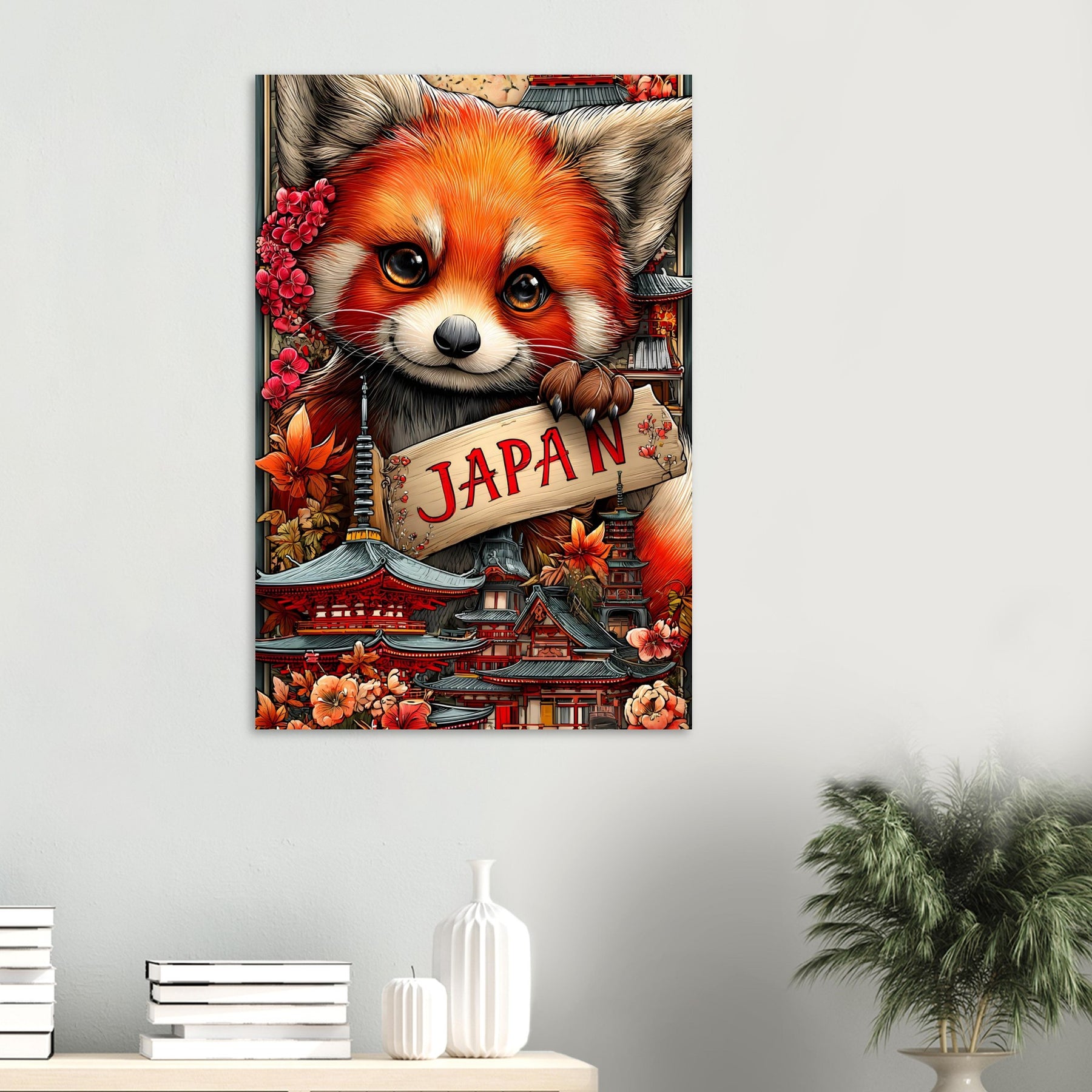 Transform your space with Red Panda Dreams of Japan, a striking aluminum travel wall art piece that blends playful charm with cultural beauty. A delightful red panda stands at the heart of the scene, surrounded by iconic Japanese architecture and vibrant cherry blossoms, symbolizing the harmony between nature and tradition.