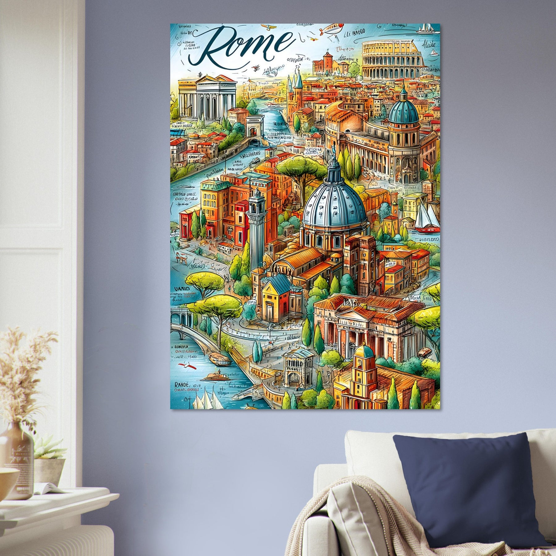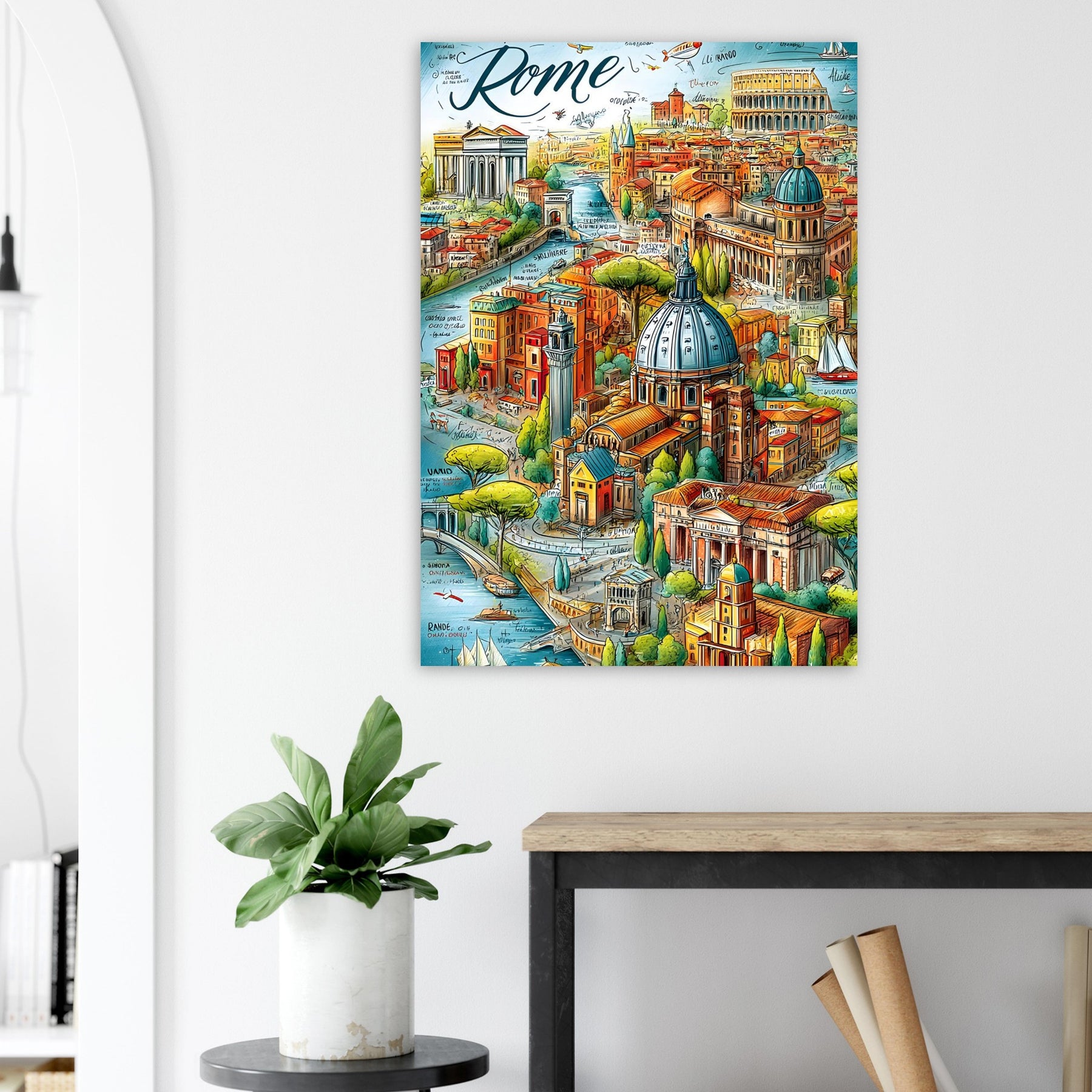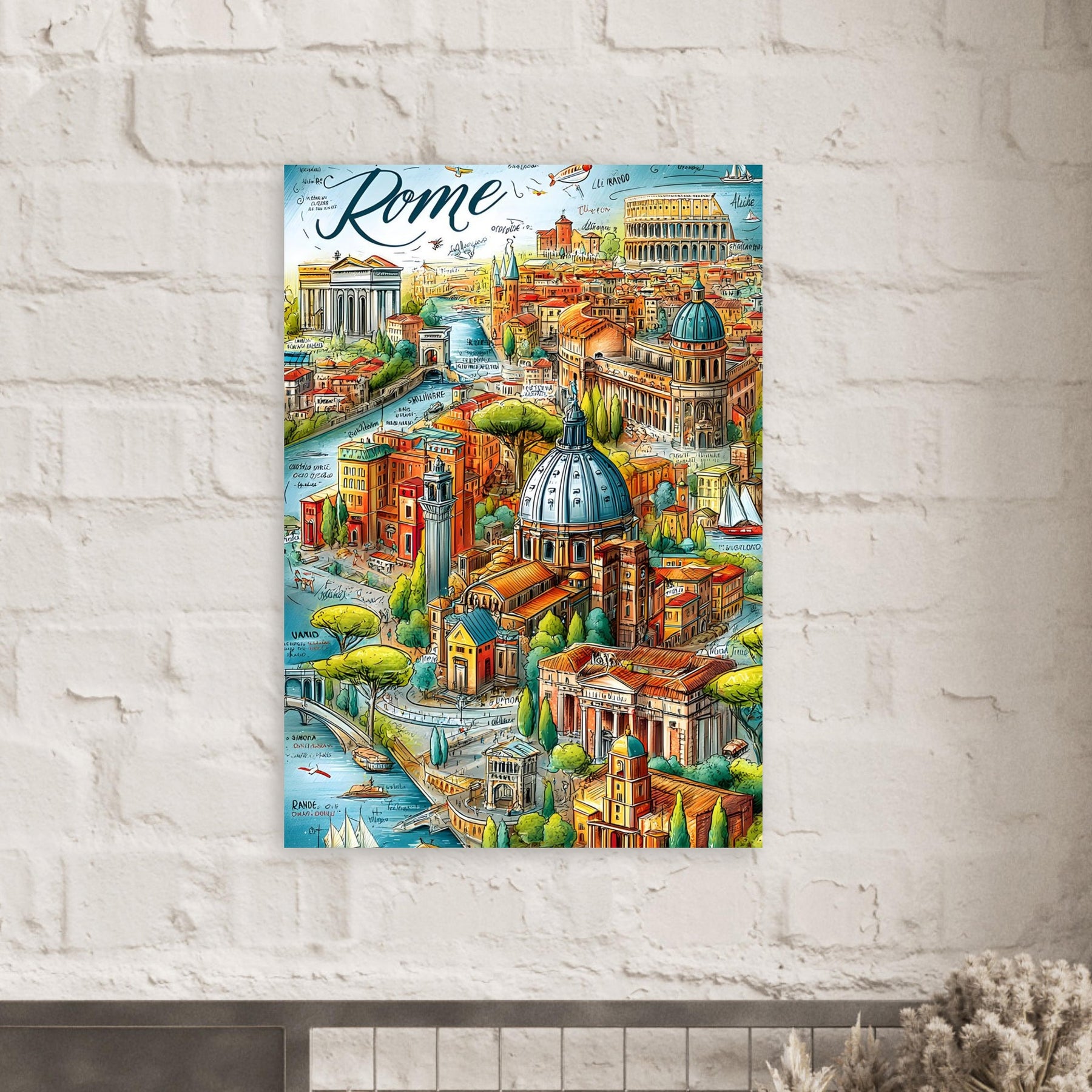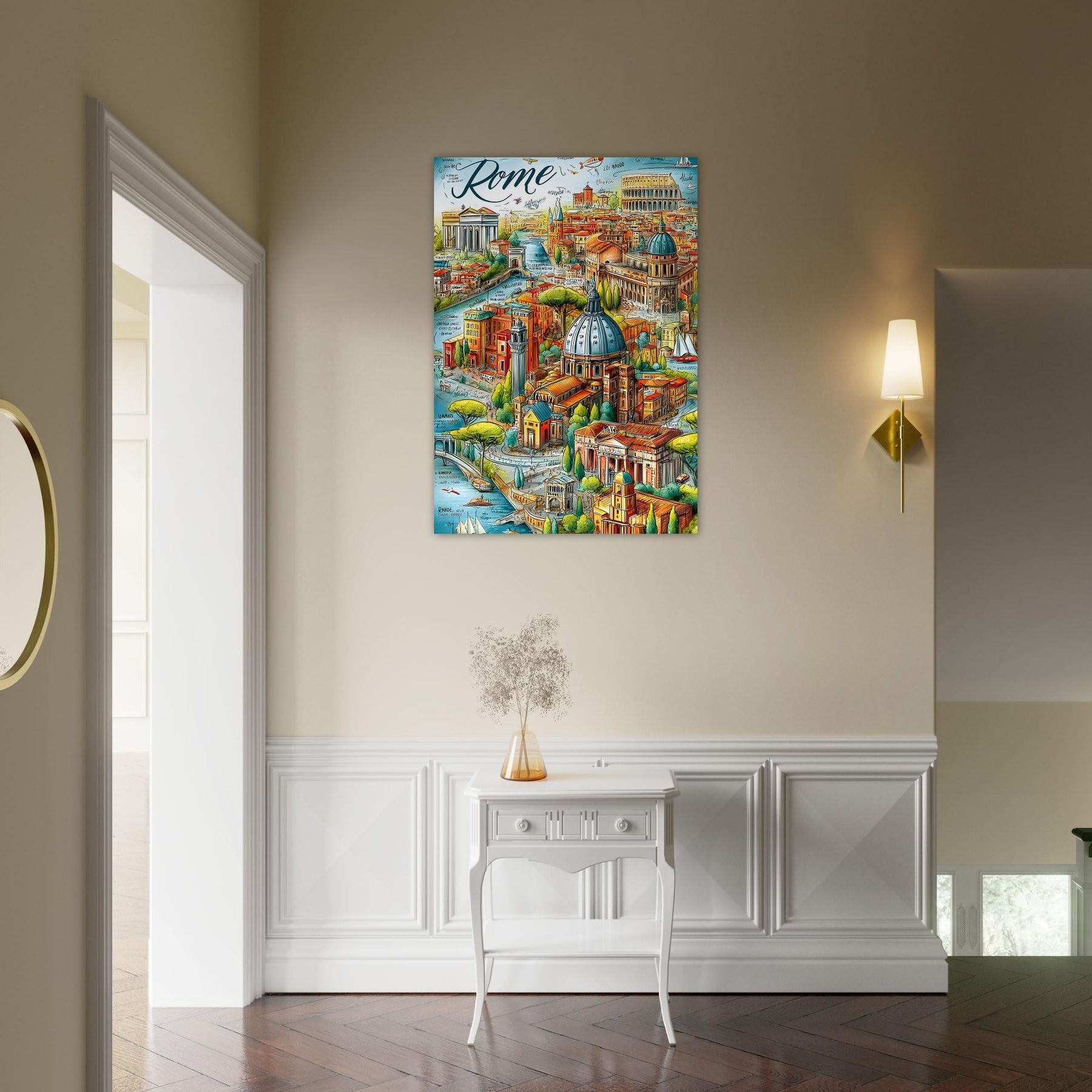 Transform your space with Rome Illustrated Wonders, a vibrant aluminum travel wall art piece that brings the Eternal City to life. This colorful illustrated map highlights Rome’s iconic landmarks, including the Colosseum and majestic flowing rivers, symbolizing the city’s rich history, culture, and timeless grandeur.